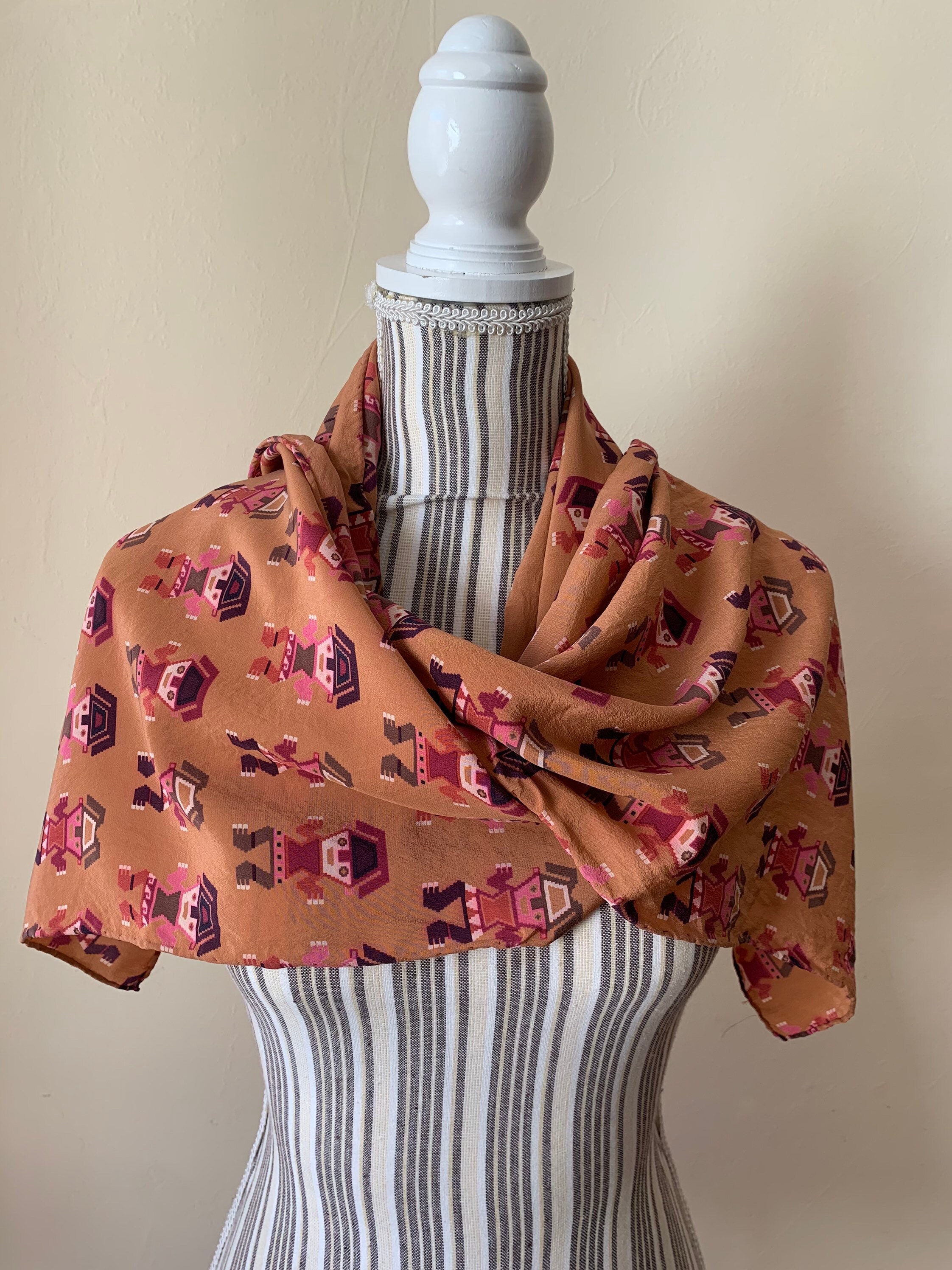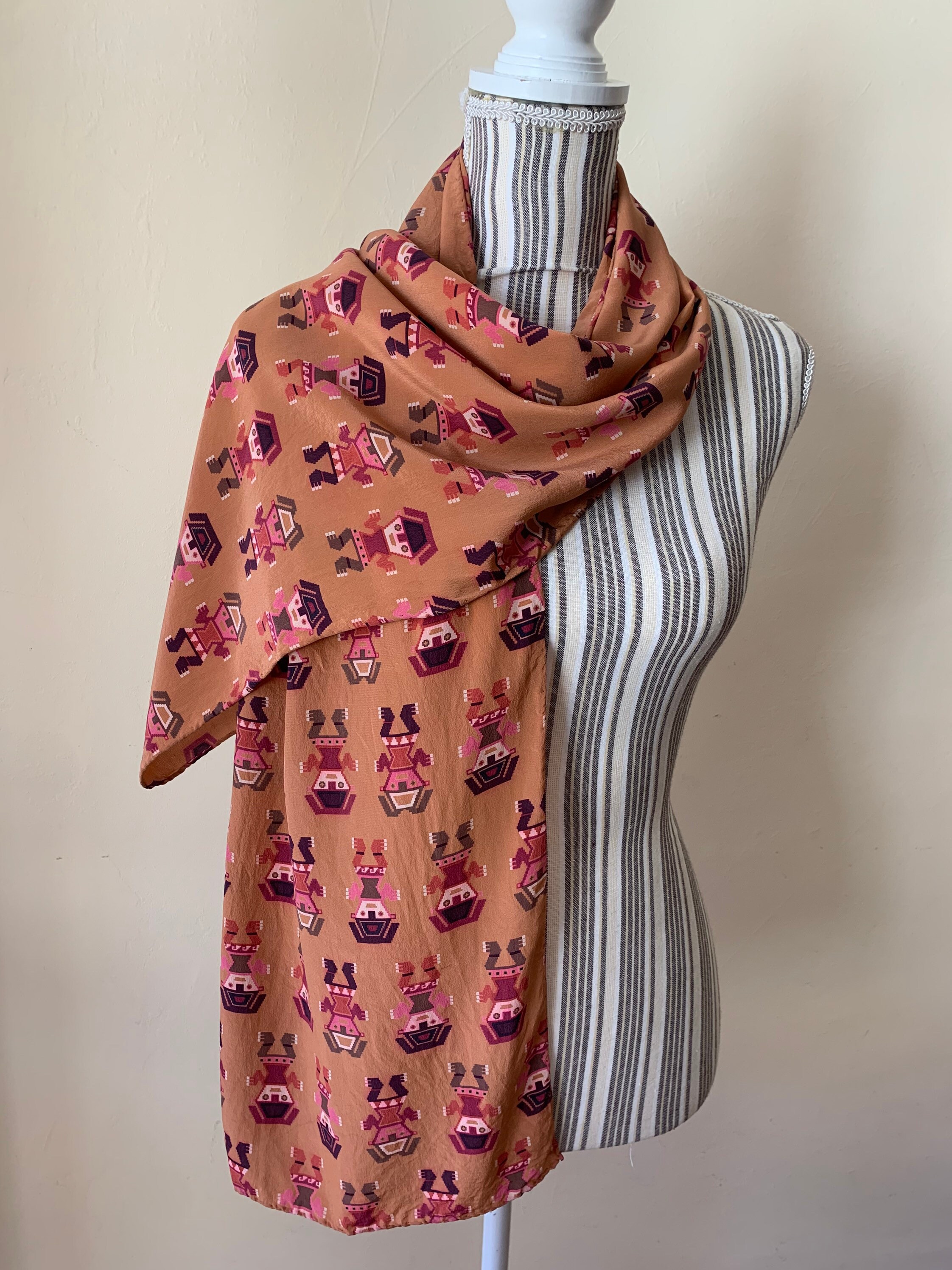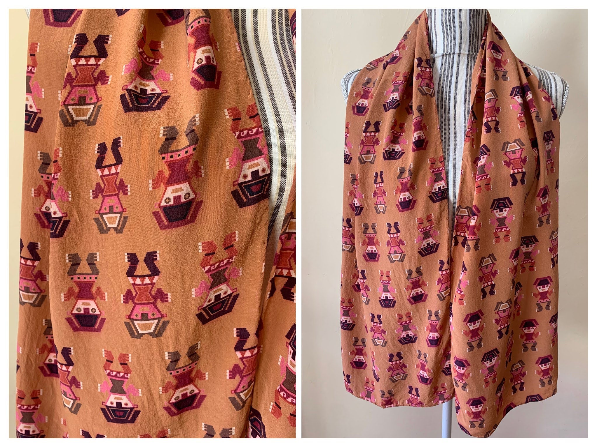 This is a unique vintage neck scarf with tribal print. This long head scarf is made of thin lightweight fabric, which feels like silk. There is no label to show the materials. This aztec oblong scarf has an abstract print. This ethnic scarf has hand rolled edges. Beautiul statement neck accessory.