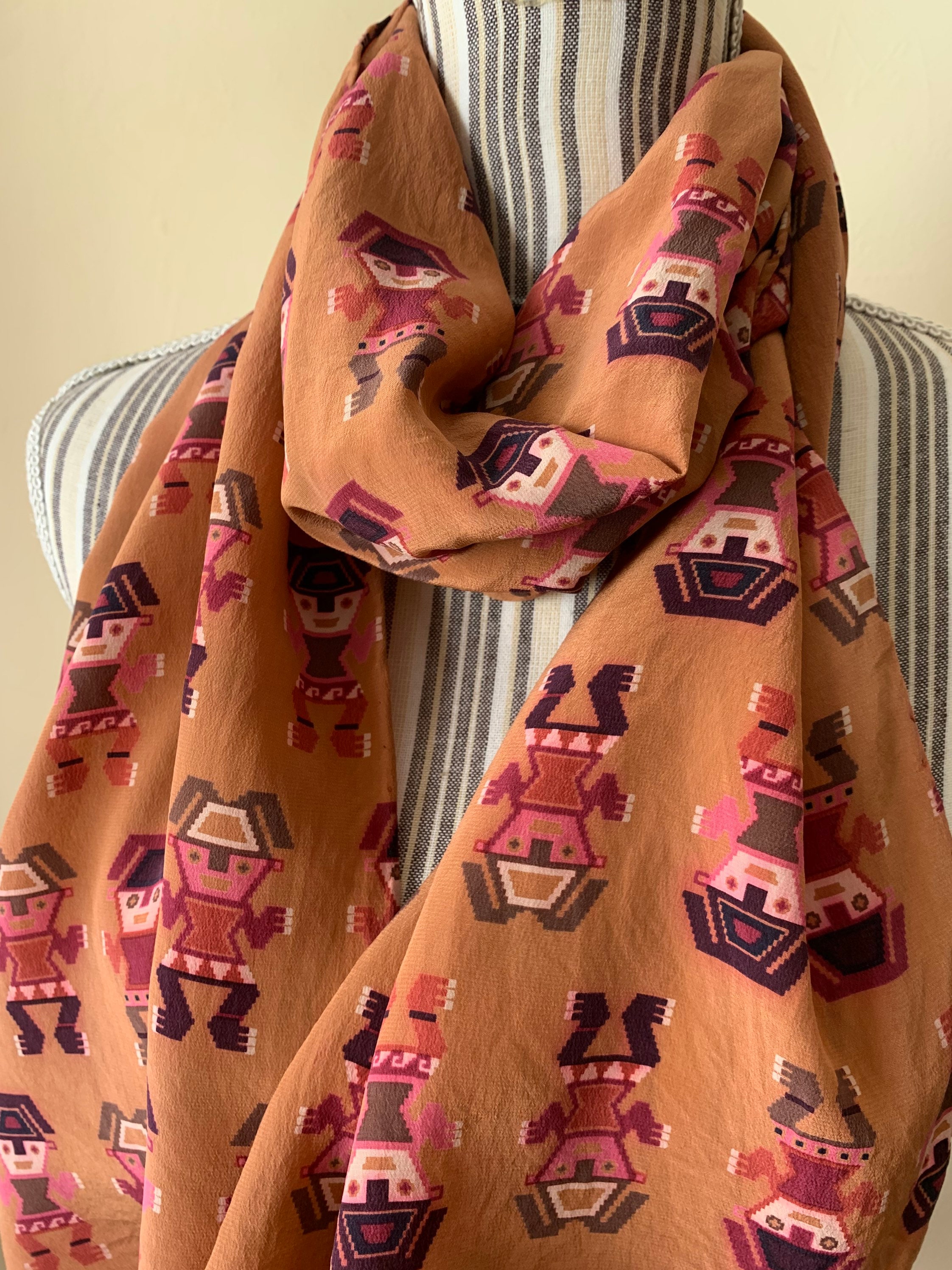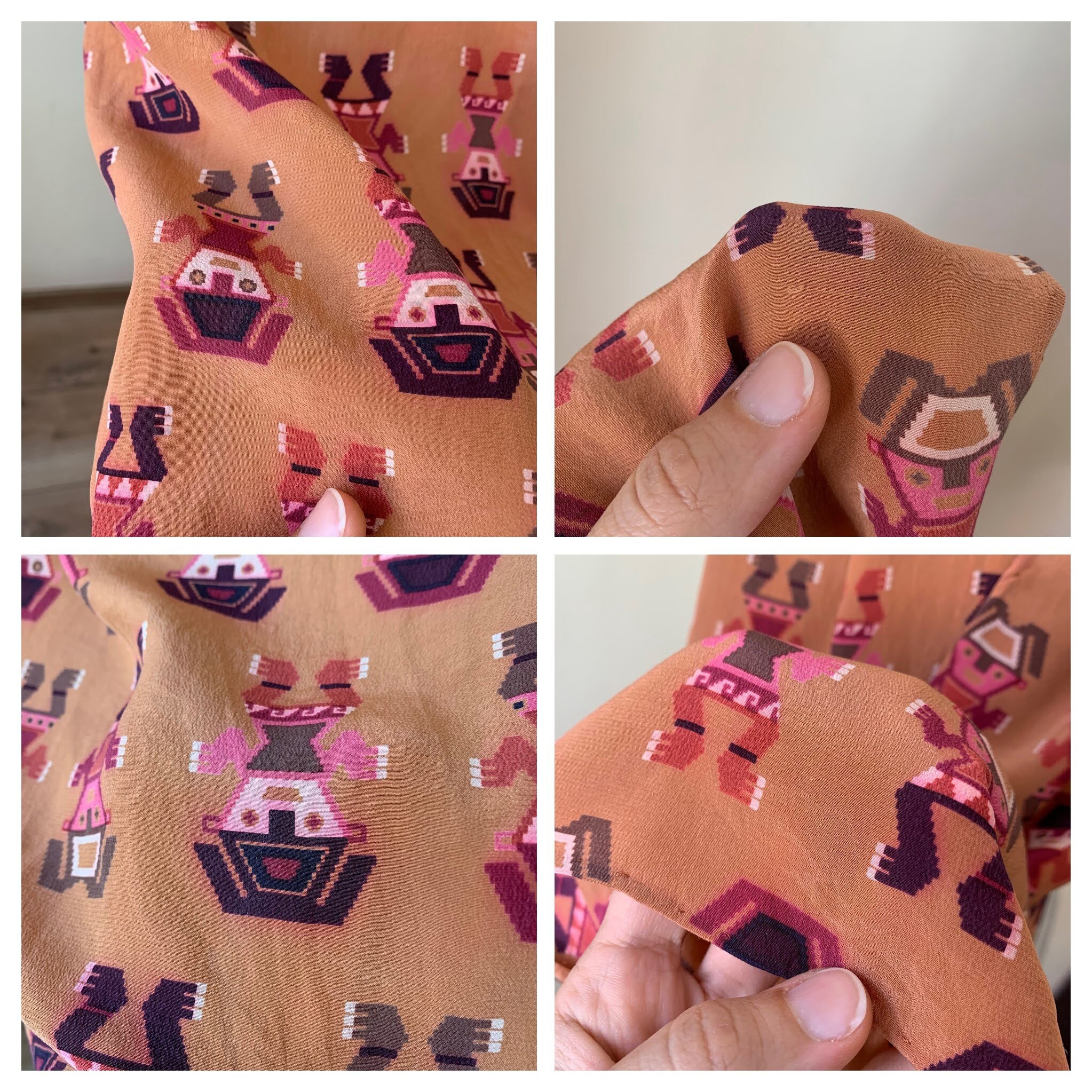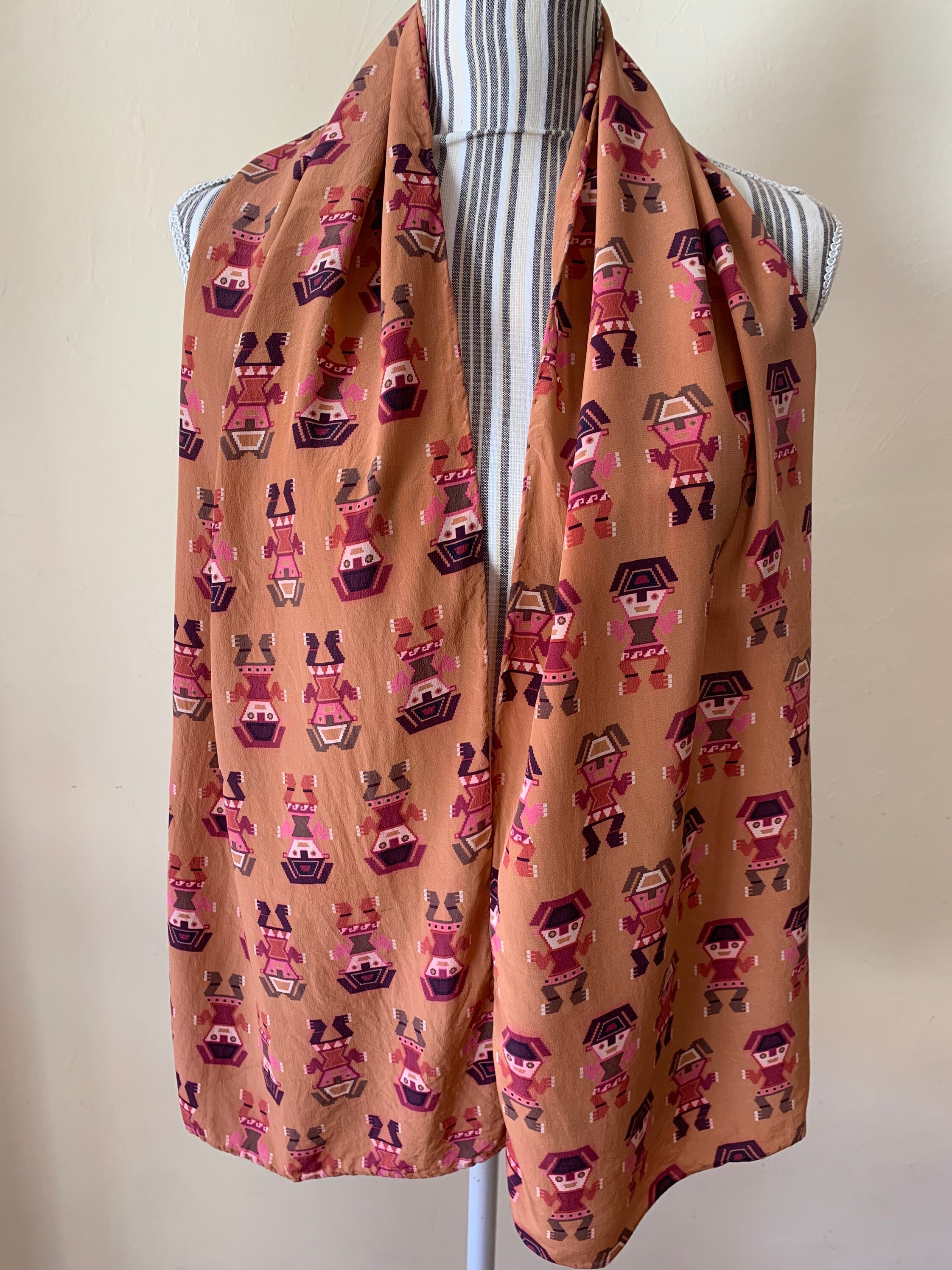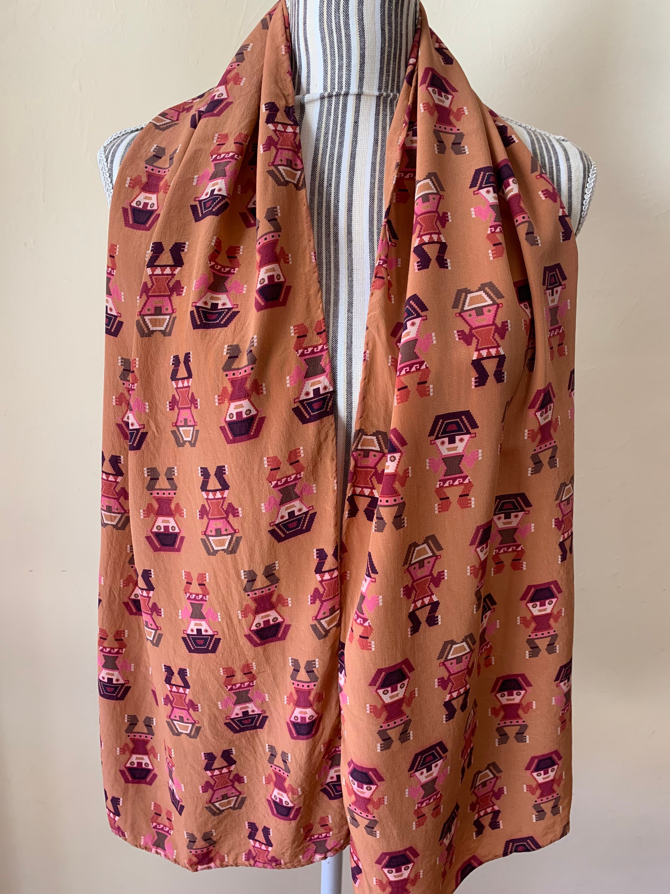 This is a unique vintage neck scarf with tribal print. This long head scarf is made of thin lightweight fabric, which feels like silk. There is no label to show the materials. This aztec oblong scarf has an abstract print. This ethnic scarf has hand rolled edges. Beautiul statement neck accessory.
