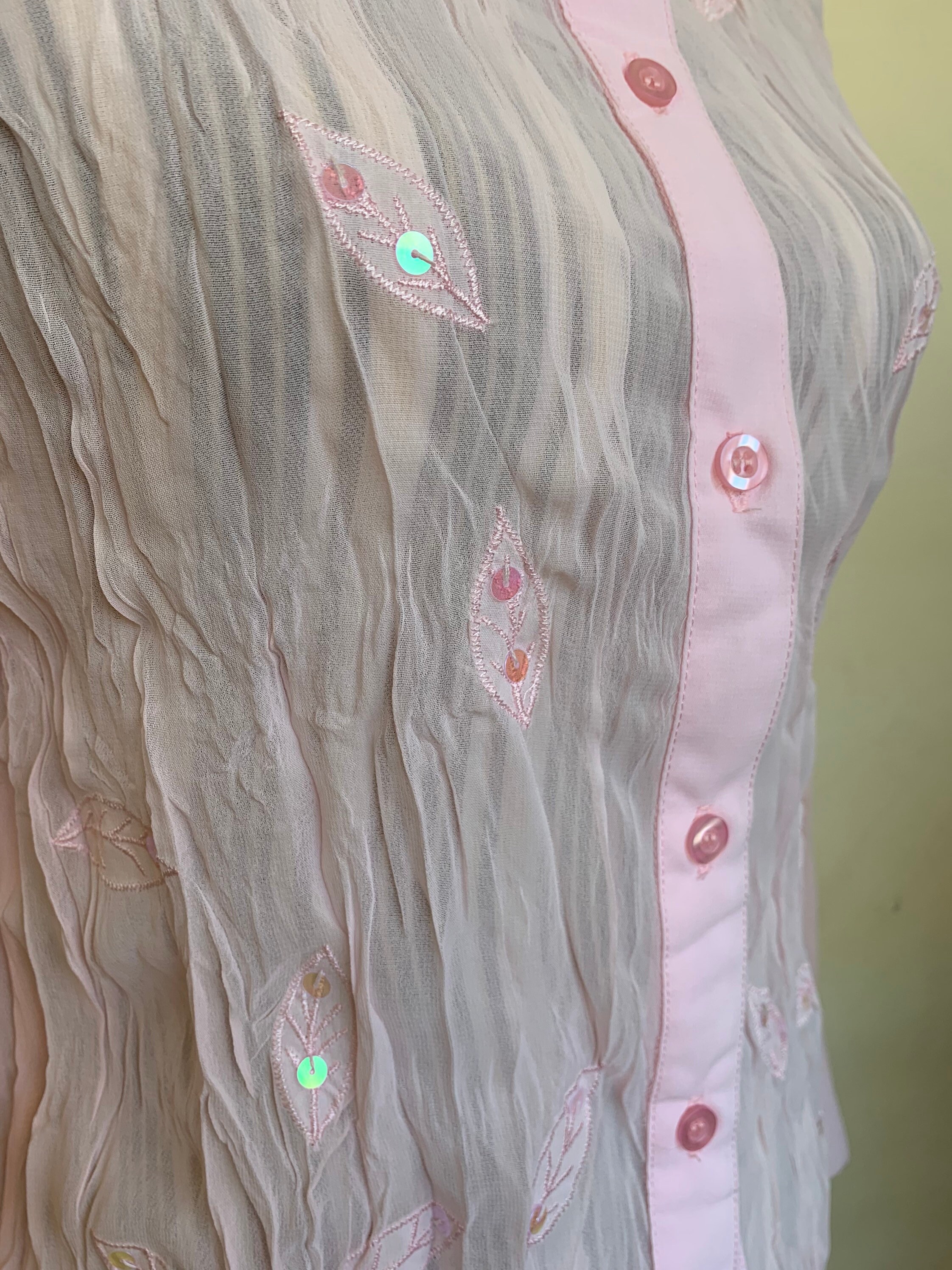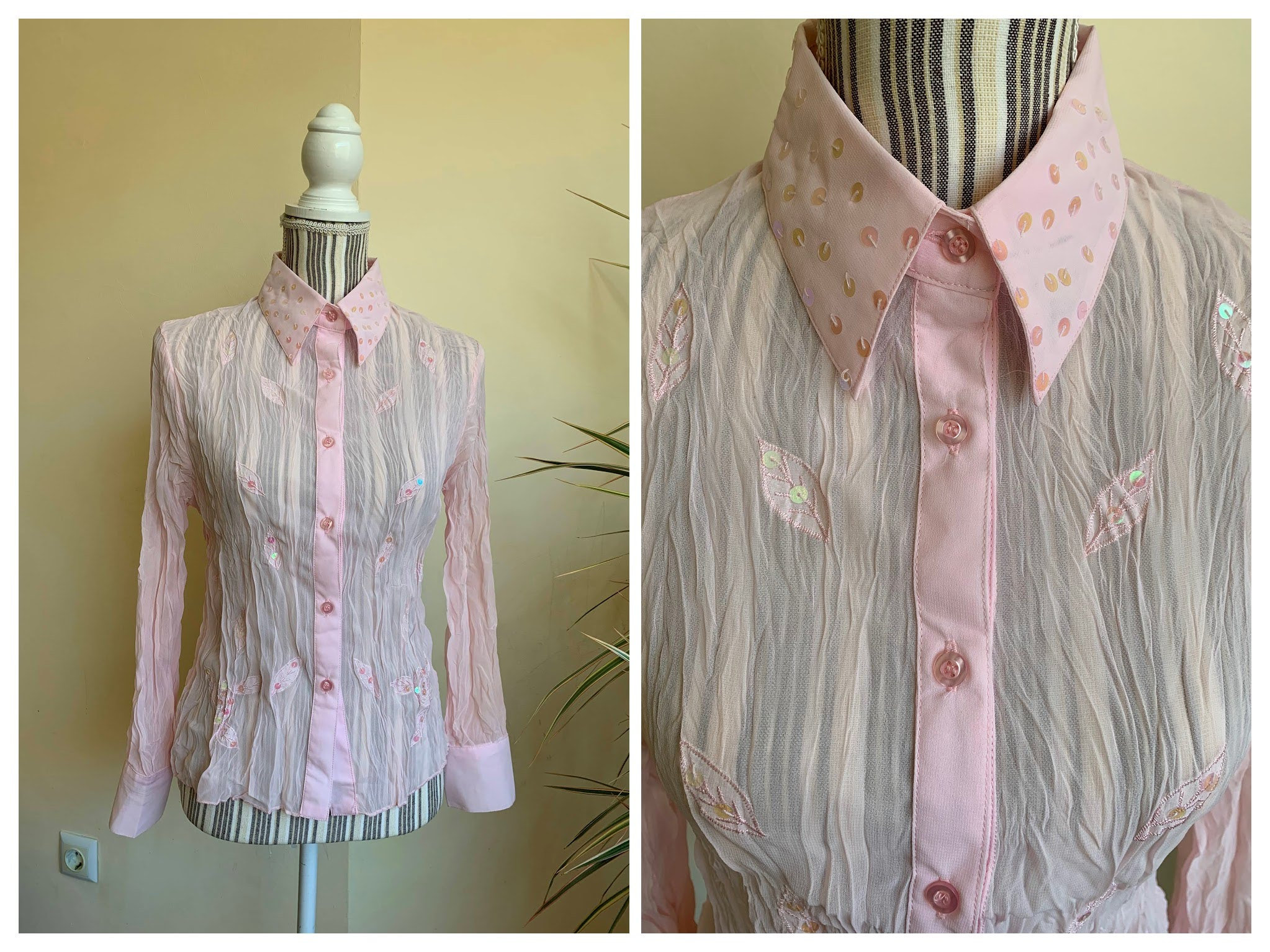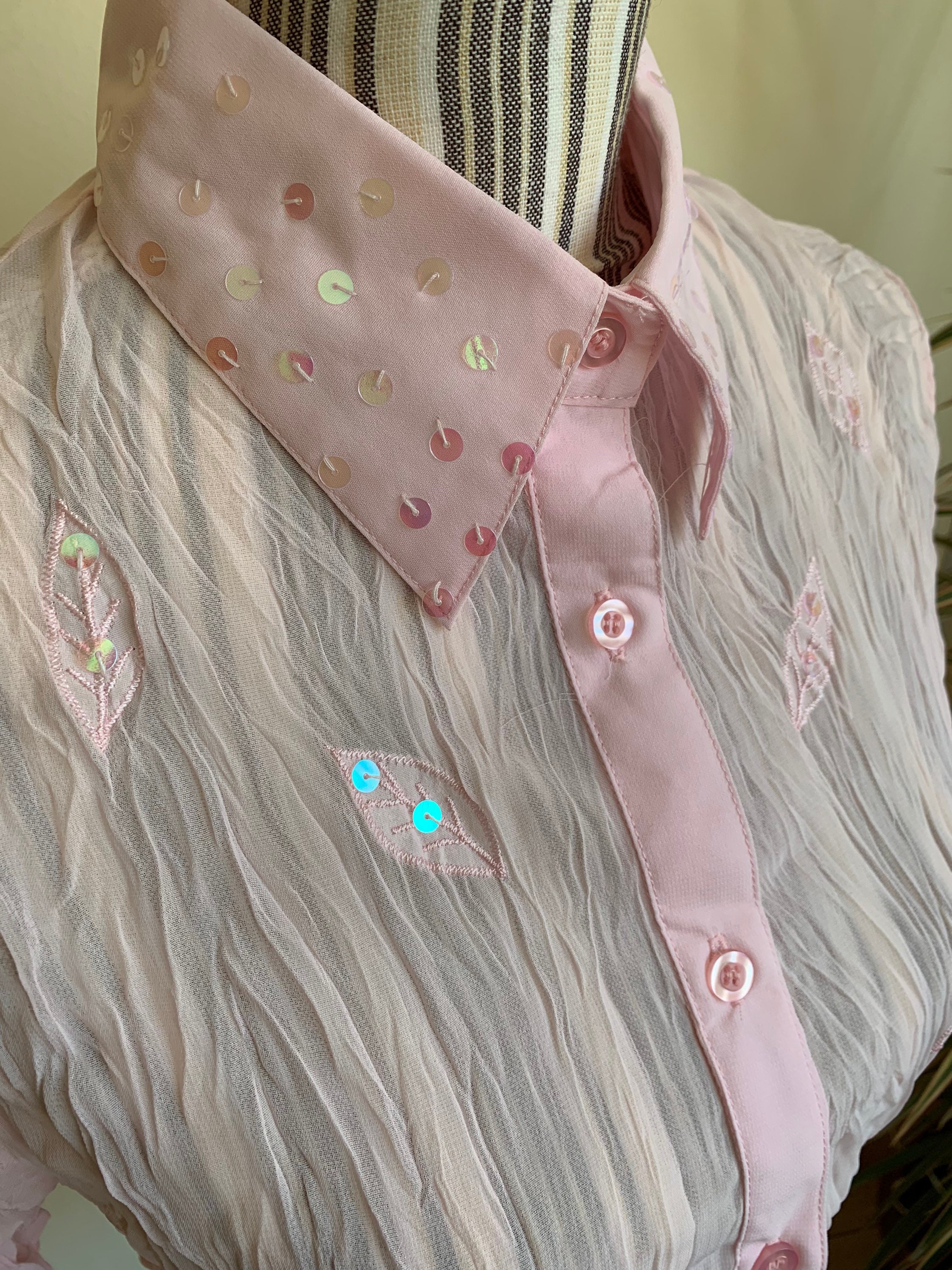 This is a lovely vintage 90s sheer blouse for women. It is made of scrunchy lightweight fabric which beautifully embraces your body. This tulle top is in pale pink color. It has beautiful sequin embellishment.T his pale pink top can be worn as an elegant overlay top that you can put over a camisole. You can also wear it as a beach cover up. This see through collared shirt has button front closure and long sleeves. This mesh overlay top best fits like size S or M. Size M is marked on this transparent top. The fabric feels like light polyester fabric. It has a good bit of stretch. Beautiful vintage blouse that will add some feminine look to your closet.