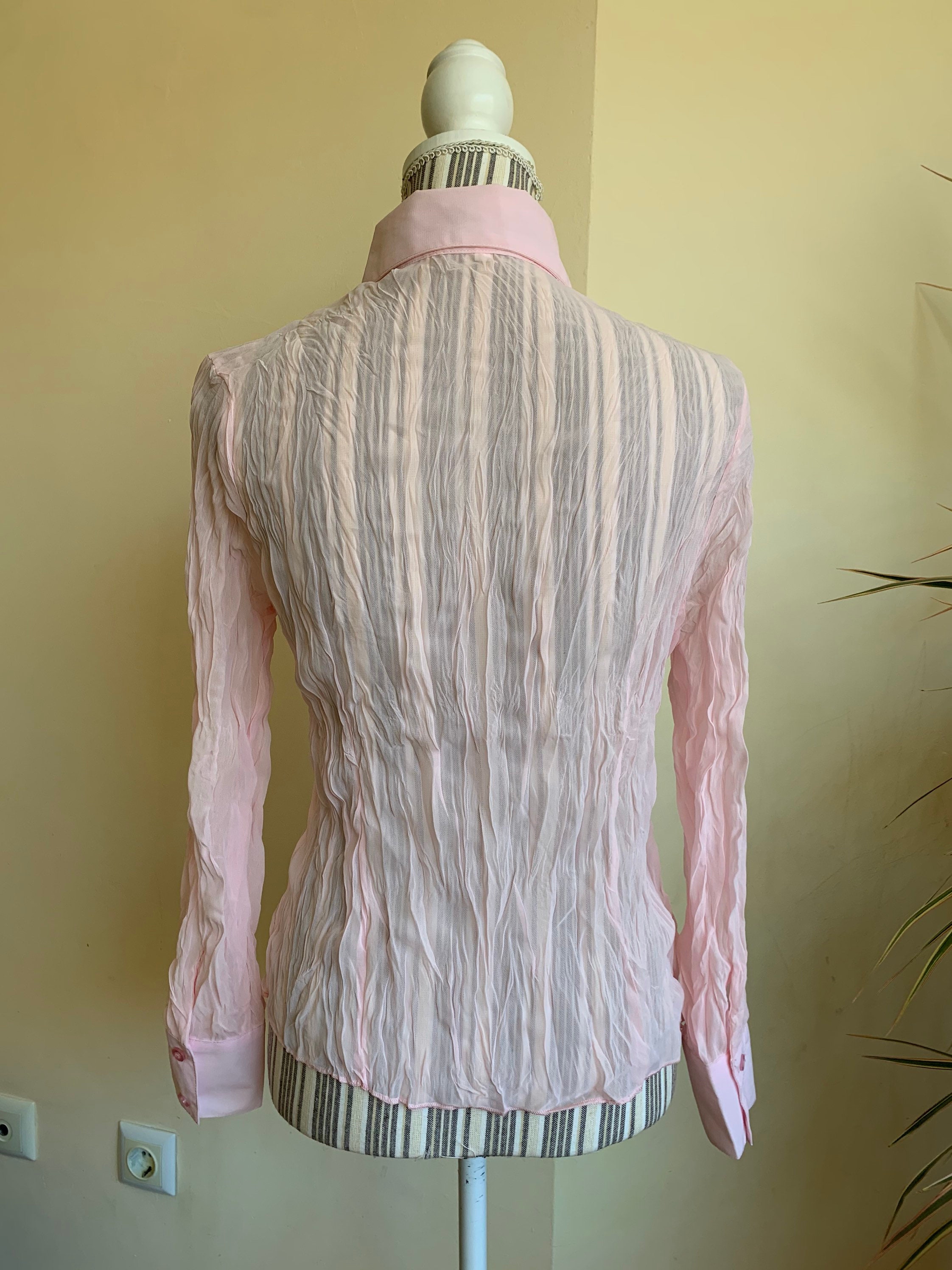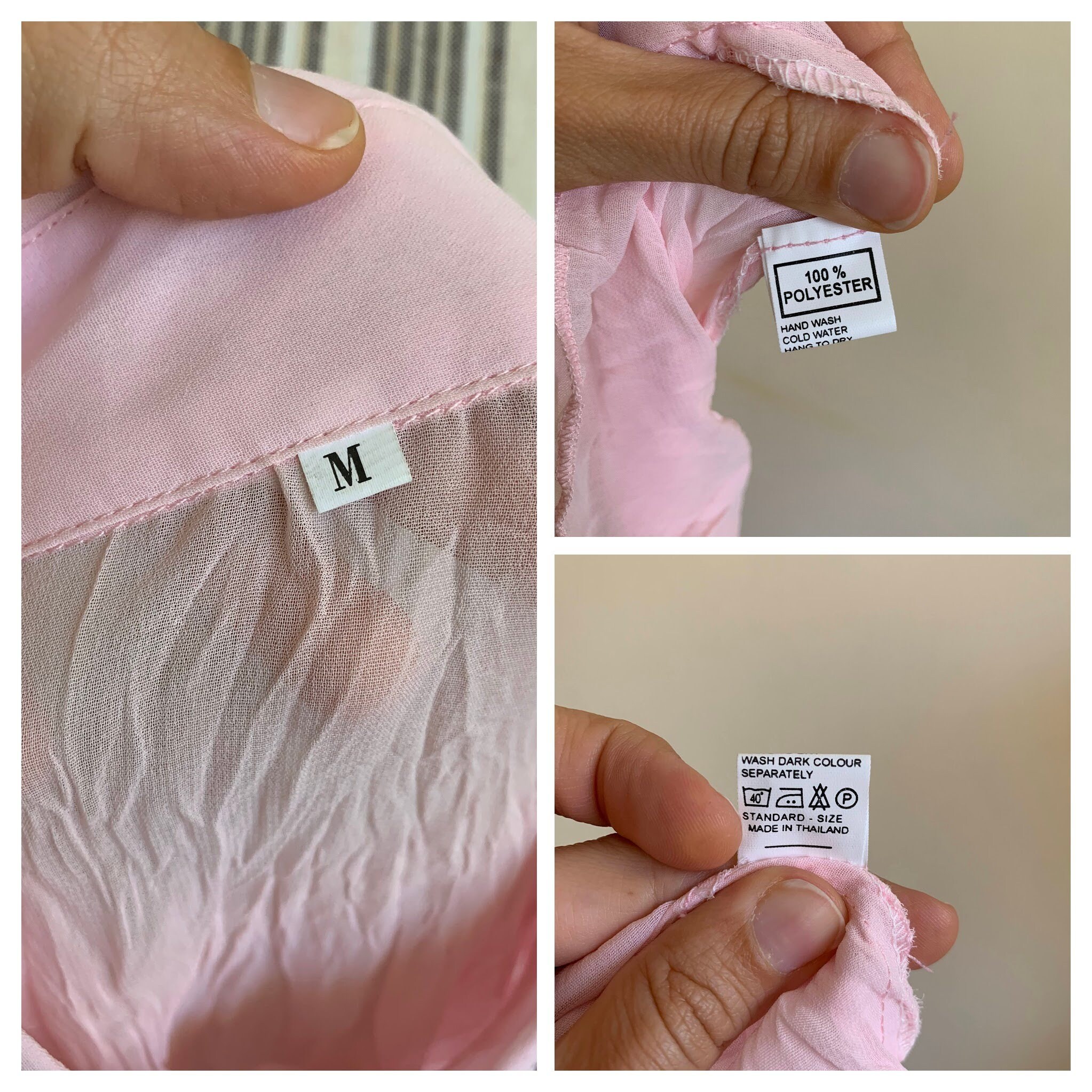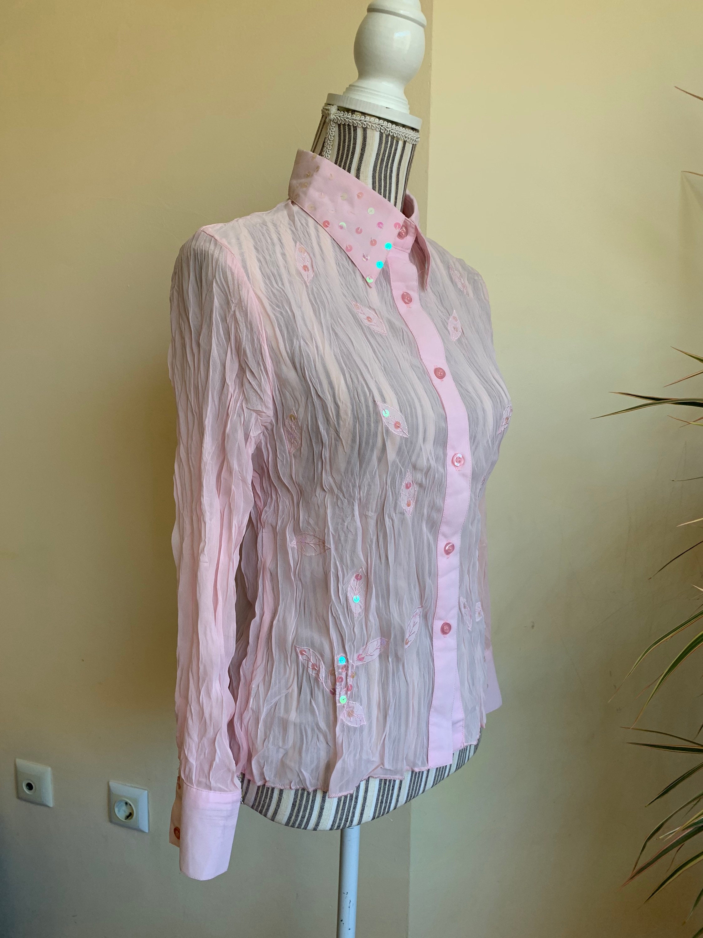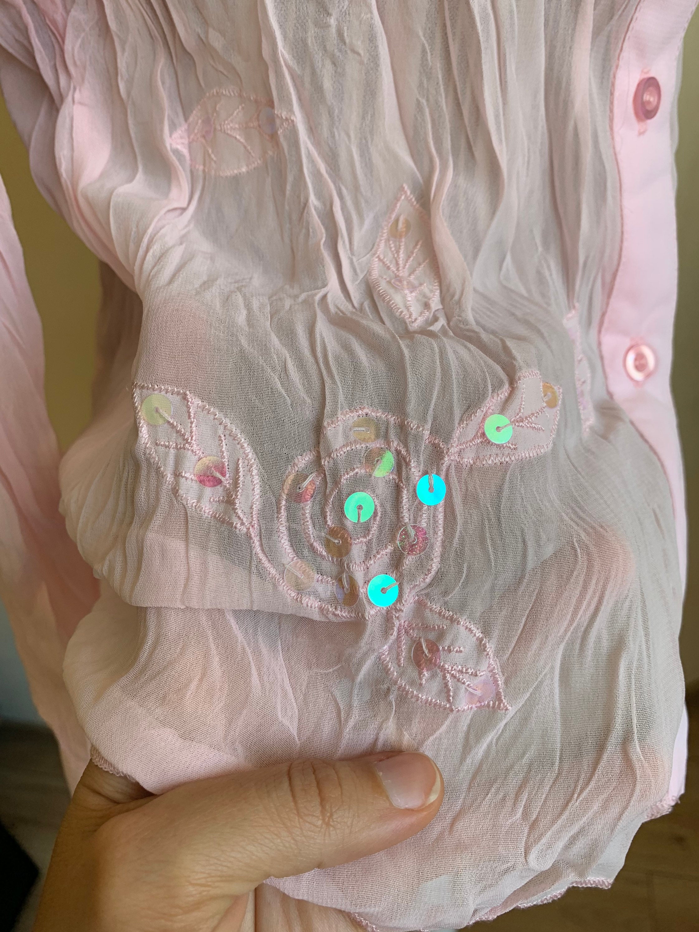 This is a lovely vintage 90s sheer blouse for women. It is made of scrunchy lightweight fabric which beautifully embraces your body. This tulle top is in pale pink color. It has beautiful sequin embellishment.T his pale pink top can be worn as an elegant overlay top that you can put over a camisole. You can also wear it as a beach cover up. This see through collared shirt has button front closure and long sleeves. This mesh overlay top best fits like size S or M. Size M is marked on this transparent top. The fabric feels like light polyester fabric. It has a good bit of stretch. Beautiful vintage blouse that will add some feminine look to your closet.
