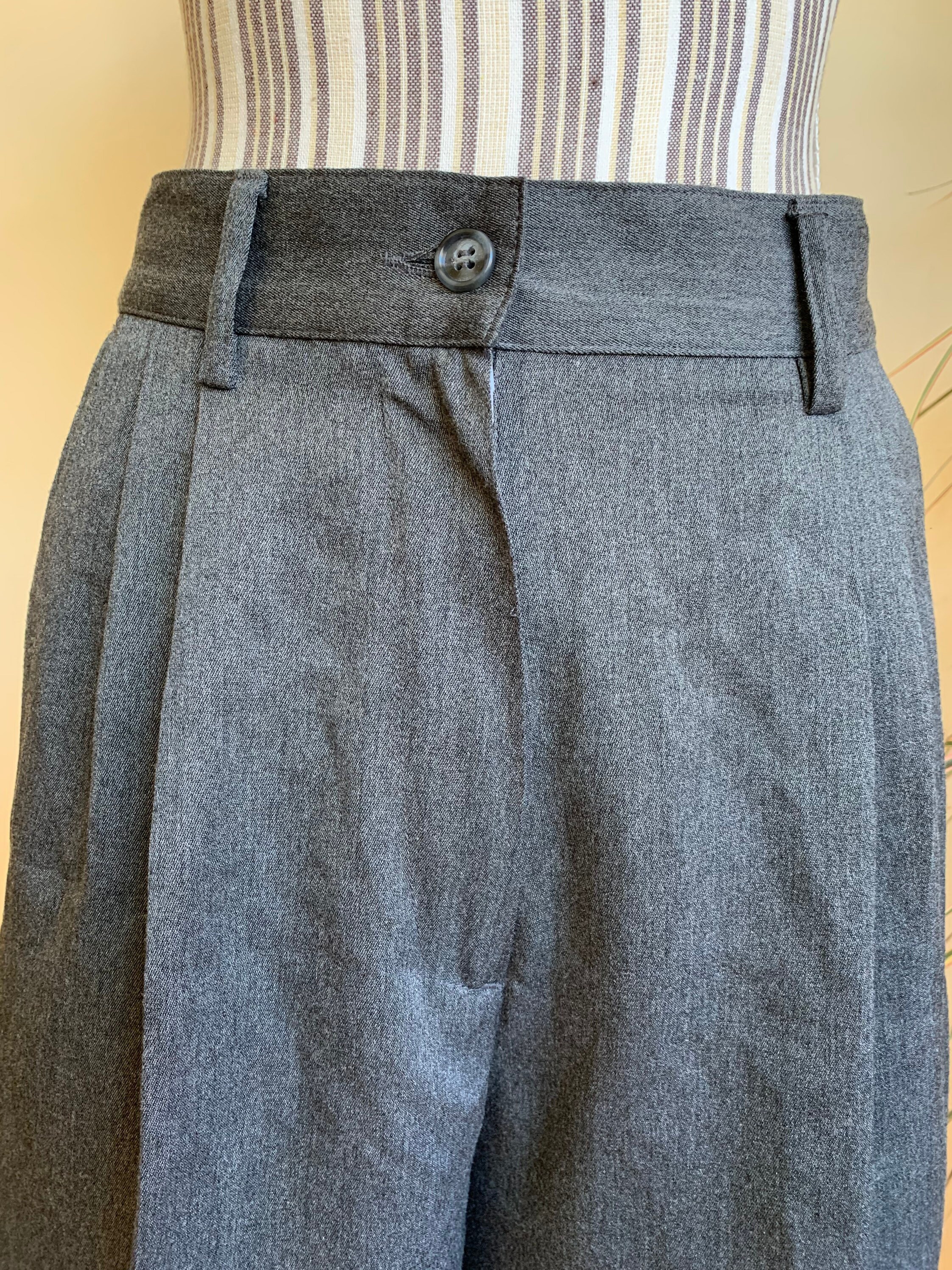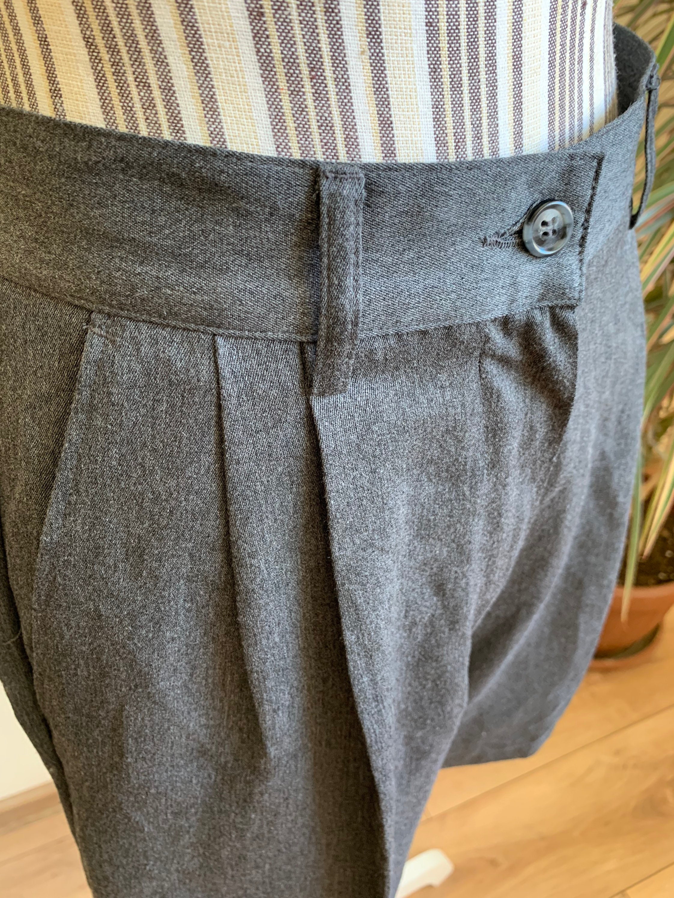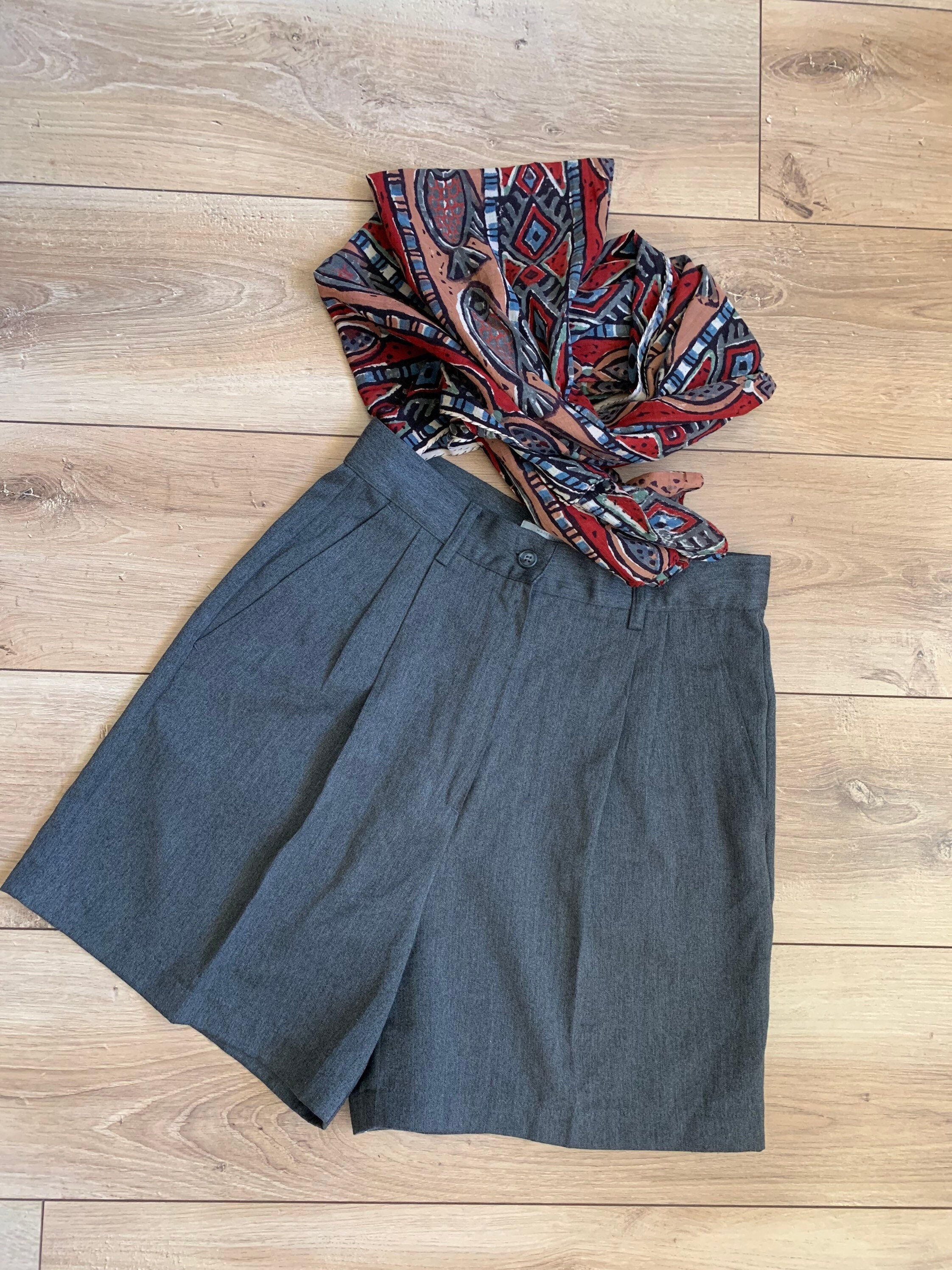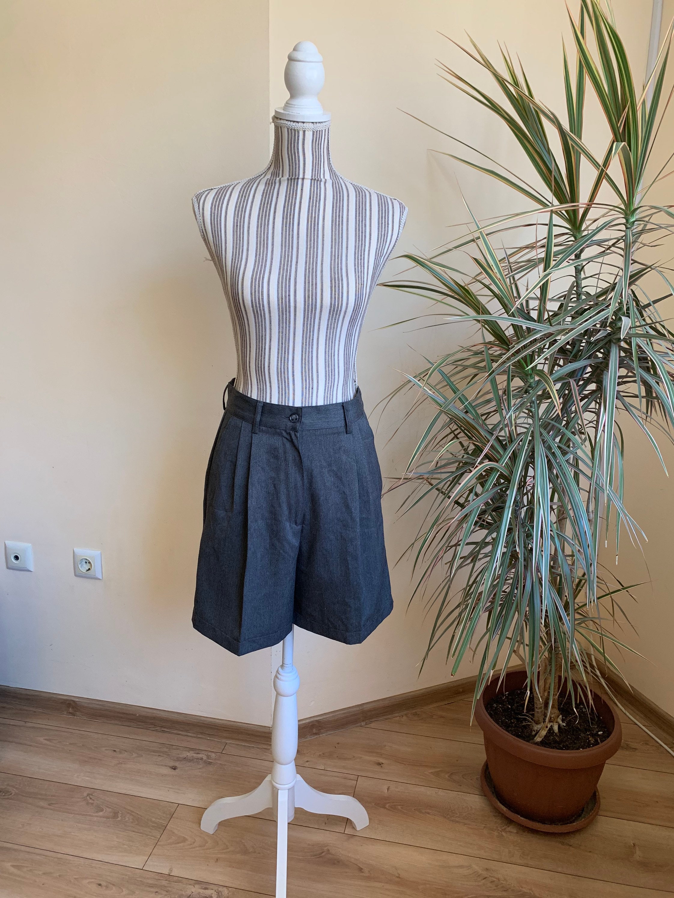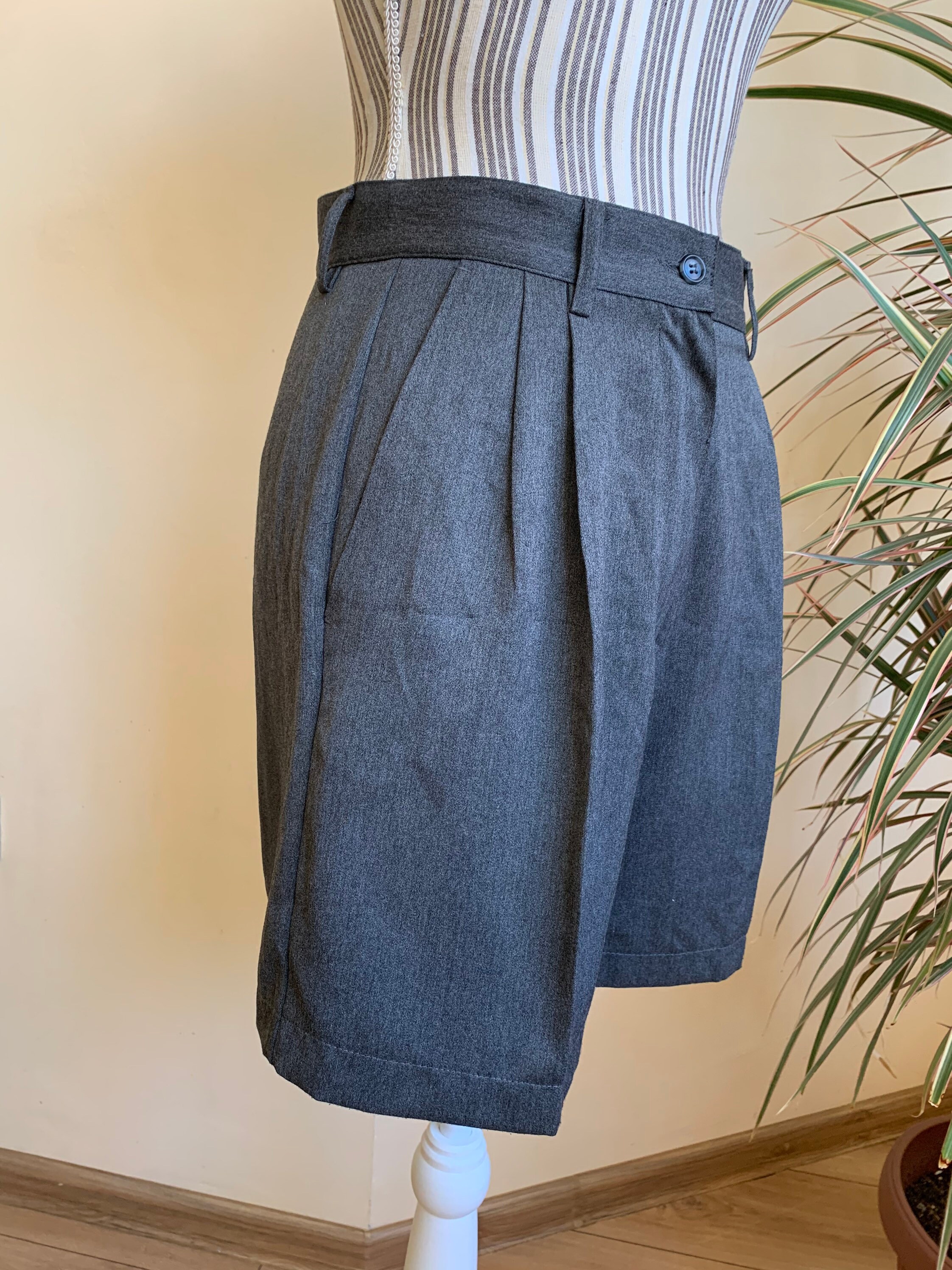 These are stylish vintage classic shorts for women, made of solid grey color fabric (67% polyester and 33% viscose). These timeless dress shorts have front zipper and button closure. They are unlined. They have two front pockets . These short pants were made in Italy by United Colors of Benetton. The size marked on the label is 44 Italy, they fit like size M. Please check the measurements below.