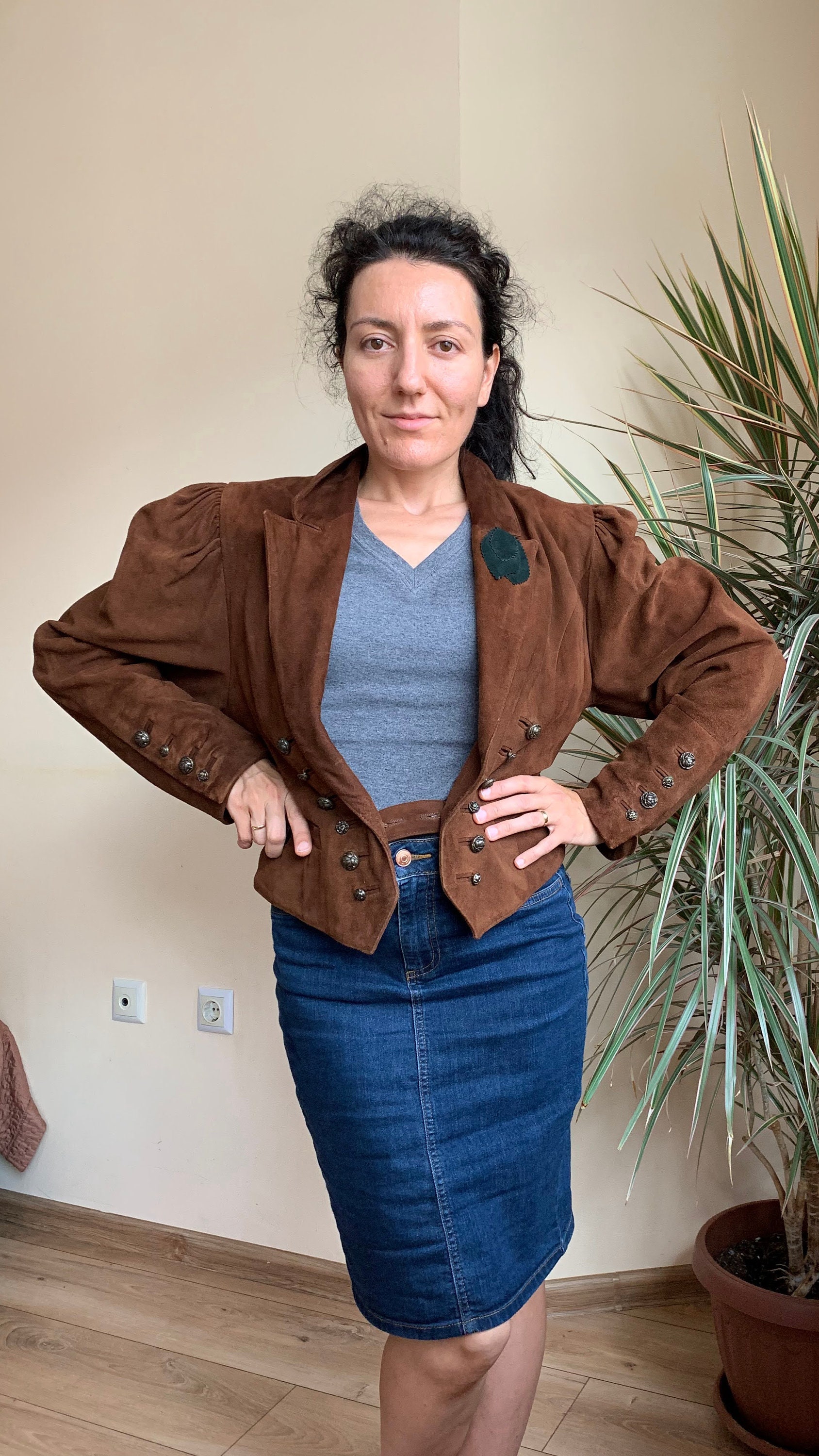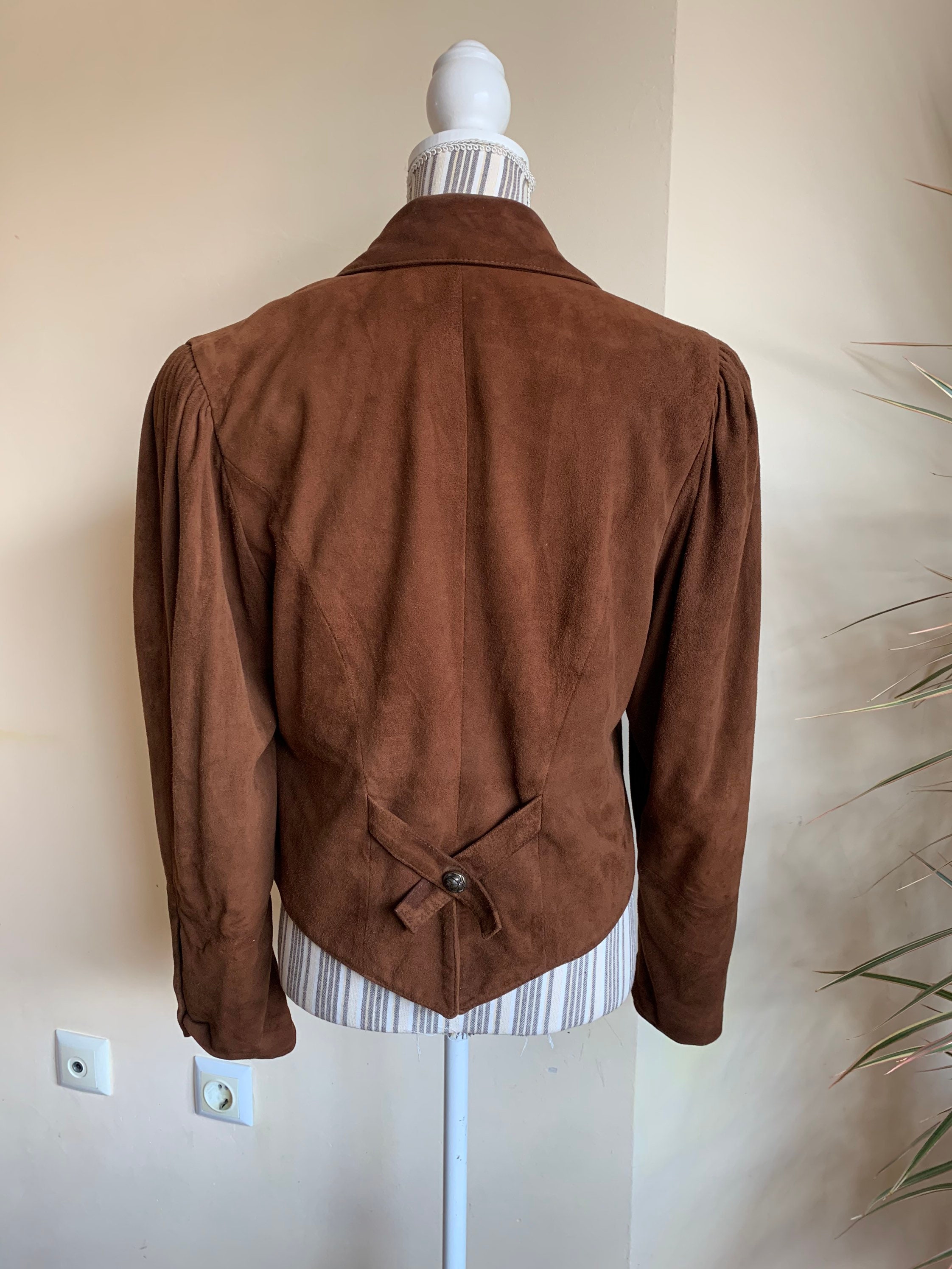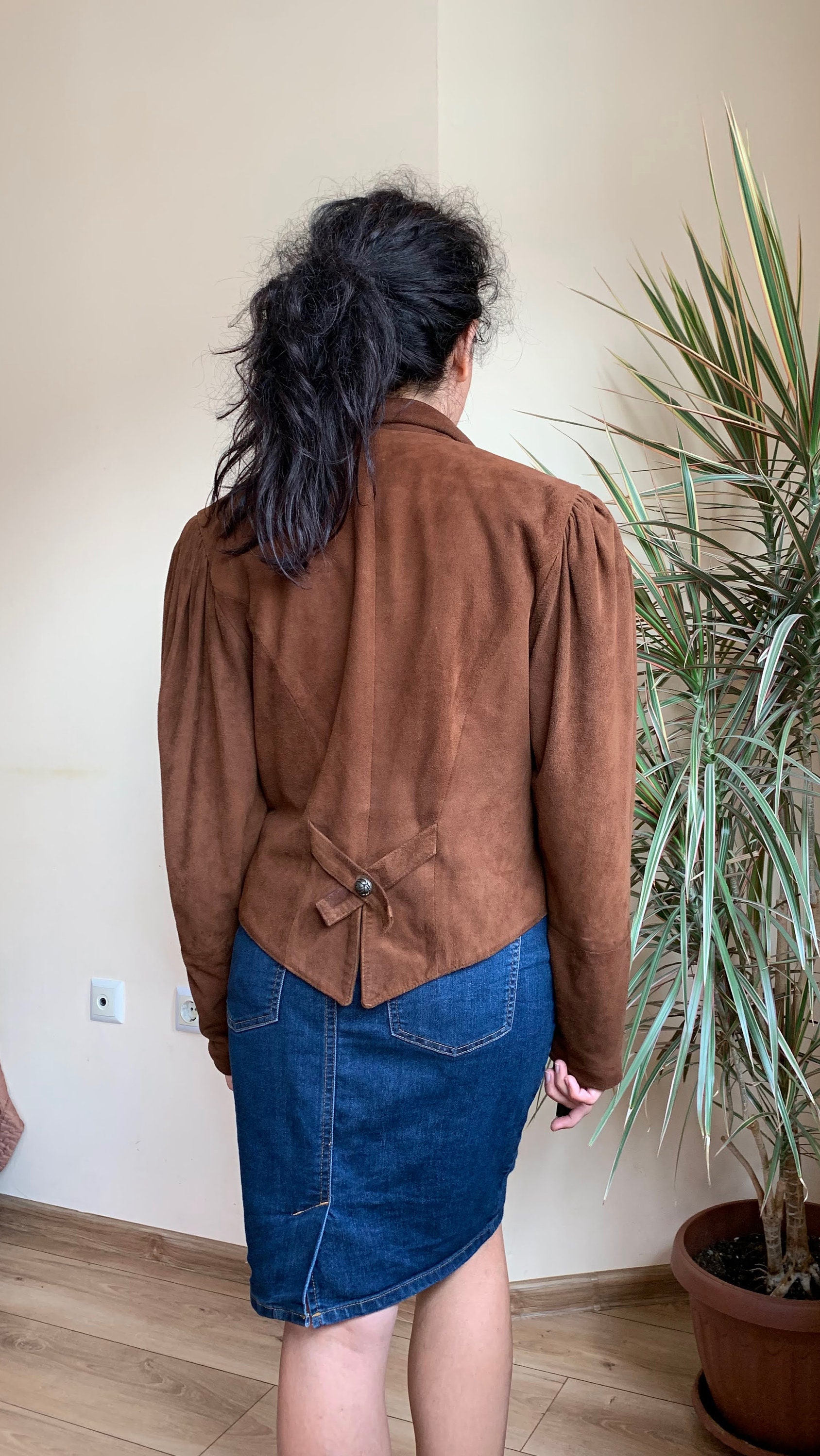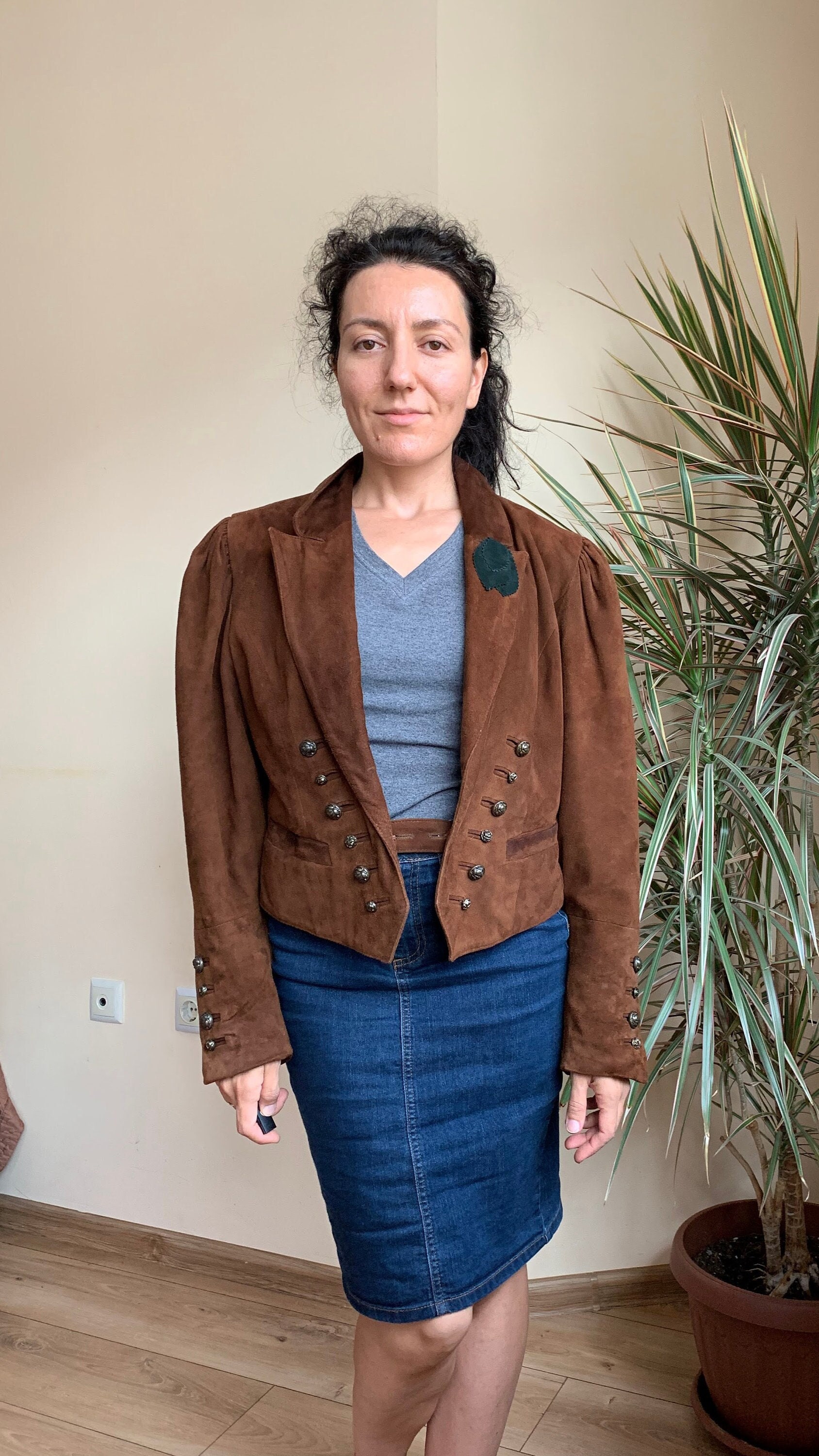 This is vintage 80s suede leather jacket for women in cognac brown color. This brown leather jacket is made of soft goat suede leather with polyester lining. This oversized bomber jacket has a single button closure and deep v neck front. It has two pockets. This boxy waistcoat has big puff sleeves with decorative buttons. The size marked on this sued leather blazer is 38. It fits like size M. I am modelling the blazer and I wear size S, EUR 36, US 6, UK 10. I am 5'3" tall. It fits me a bit oversized. Please check the measurements below.