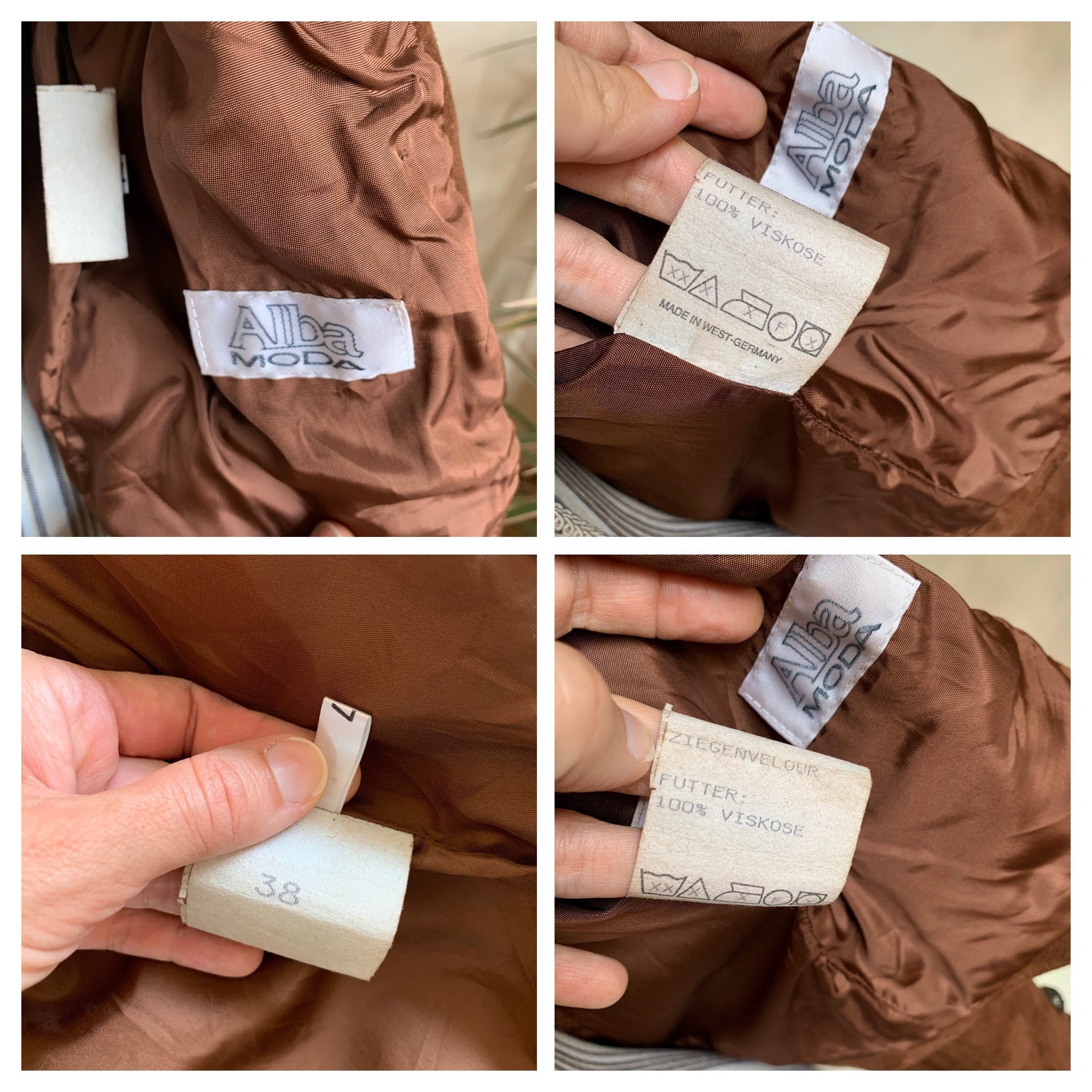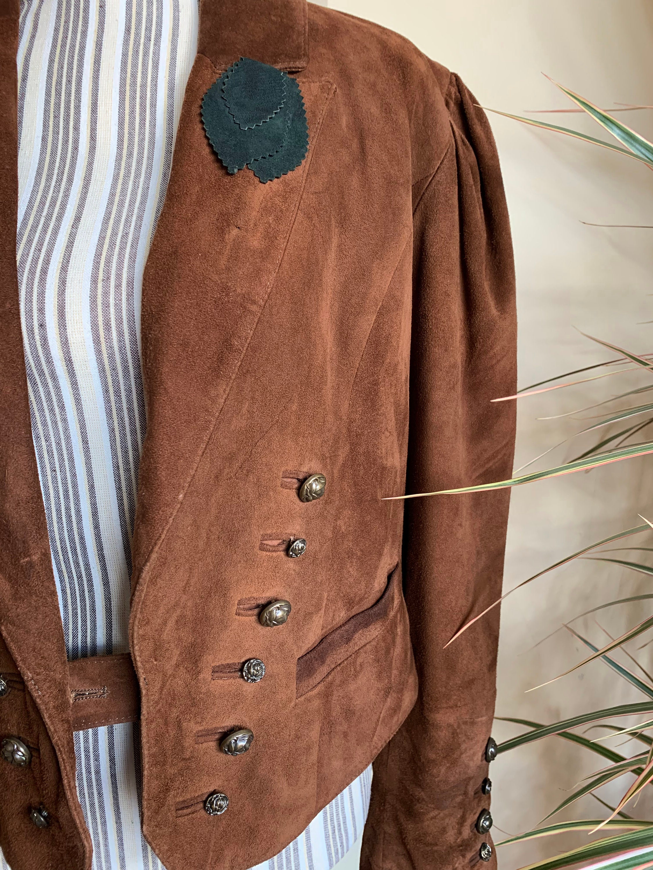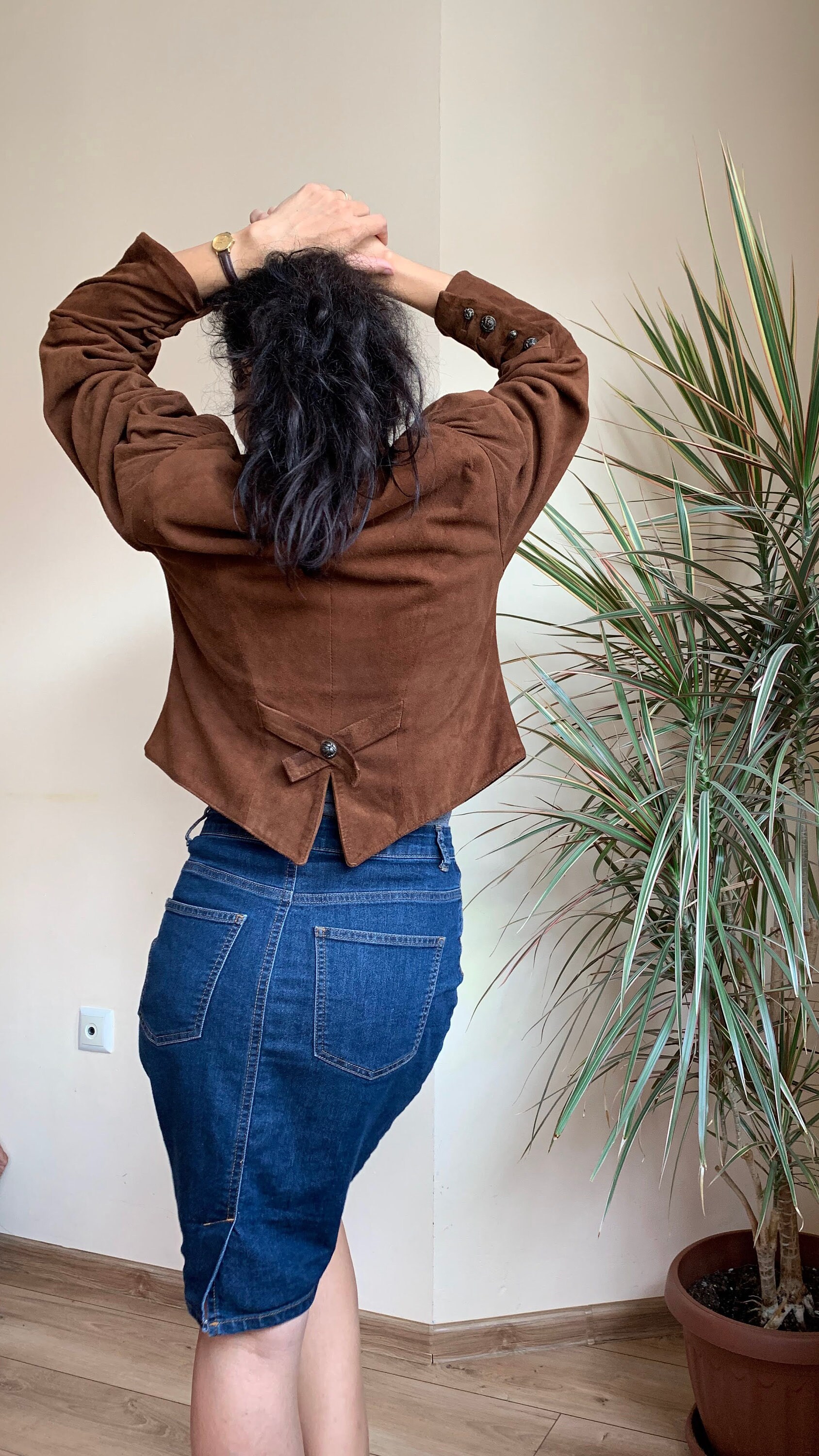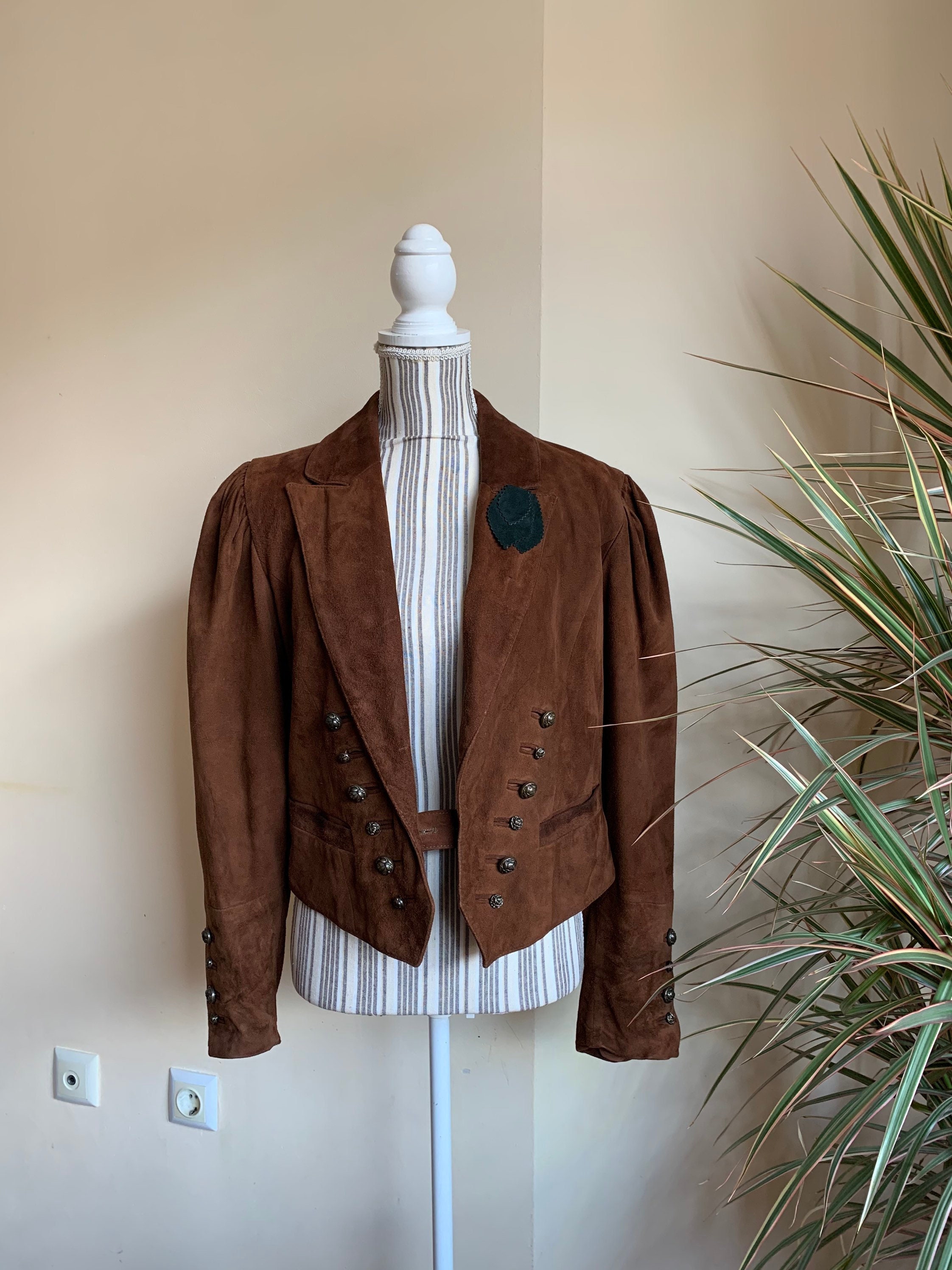 This is vintage 80s suede leather jacket for women in cognac brown color. This brown leather jacket is made of soft goat suede leather with polyester lining. This oversized bomber jacket has a single button closure and deep v neck front. It has two pockets. This boxy waistcoat has big puff sleeves with decorative buttons. The size marked on this sued leather blazer is 38. It fits like size M. I am modelling the blazer and I wear size S, EUR 36, US 6, UK 10. I am 5'3" tall. It fits me a bit oversized. Please check the measurements below.