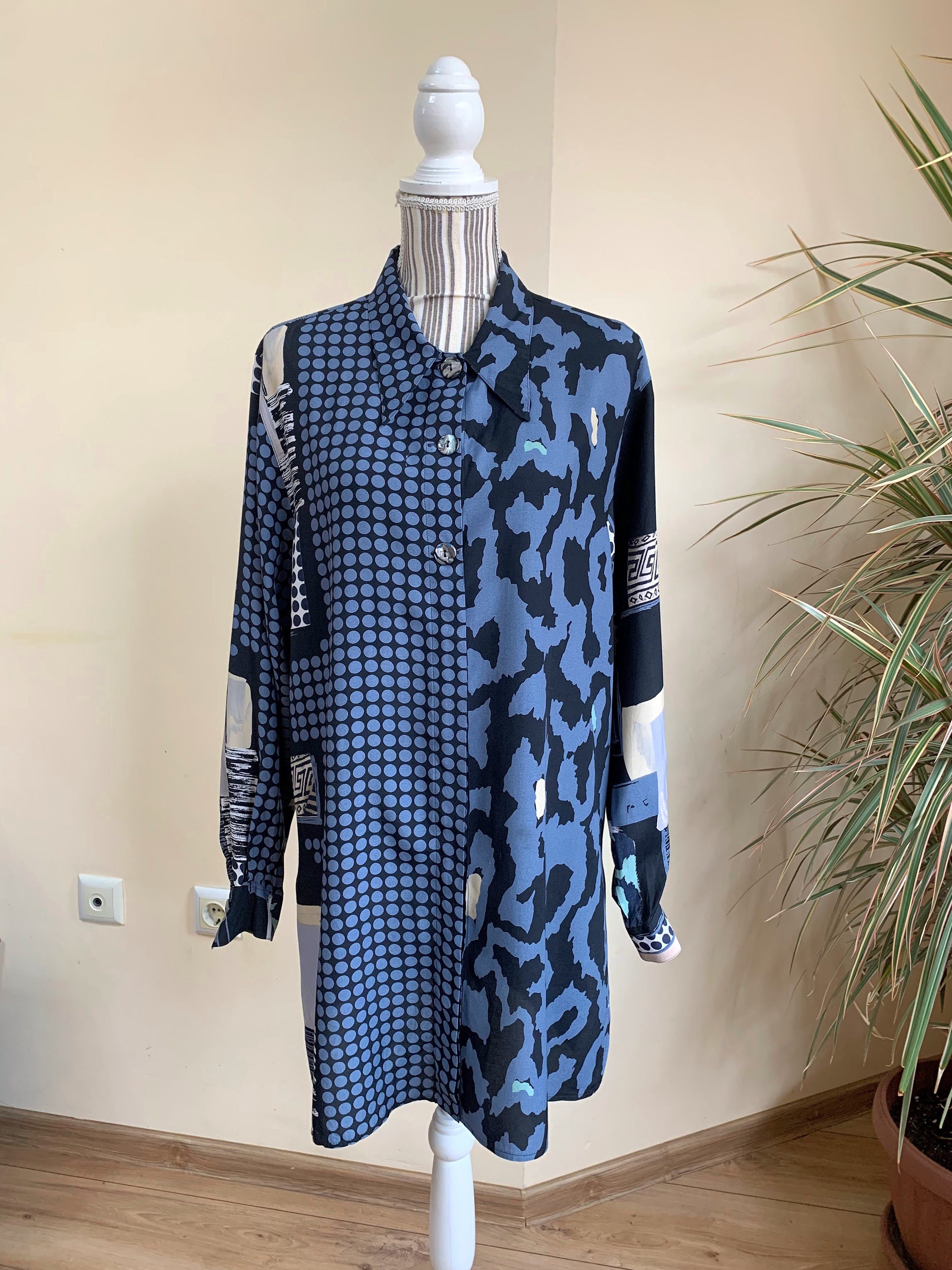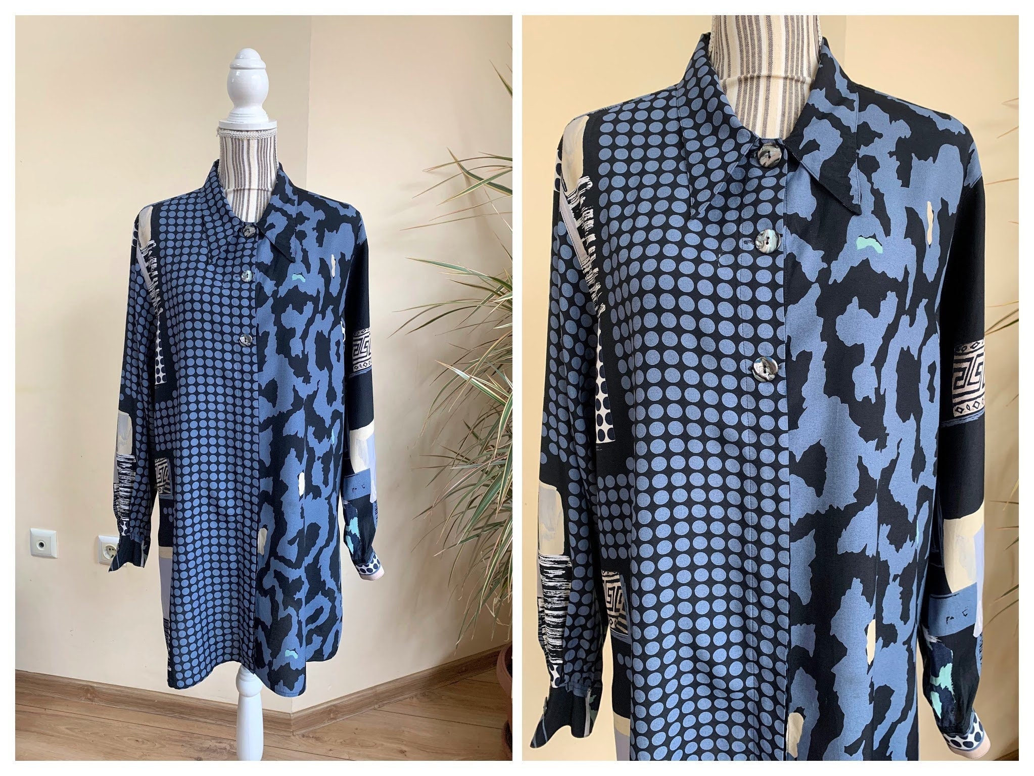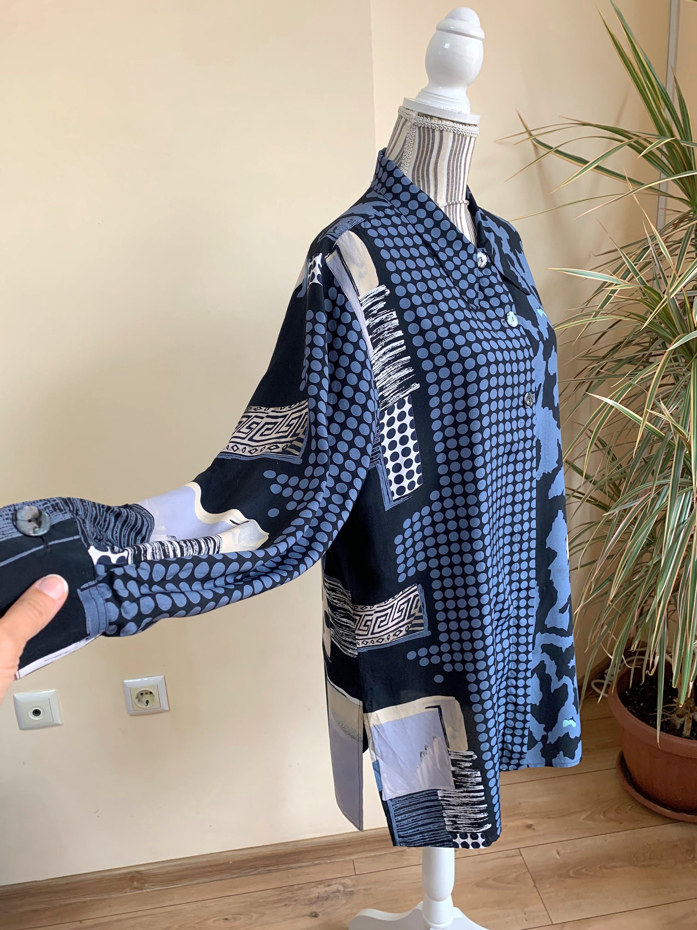 This is a vintage 80s collared button down shirt for women. It is made of 100% viscose fabric. This long sleeve retro shirt is in shades in blue and black. This button up shirt has an abstract asymmetrical print which makes this button down shirt even more unique. This loose fit shirt has a relaxed boxy silhouette. It is wide and baggy. It has side slits and plastic buttons which look like mother of pearl. This funky retro shirt is by the brand Luigi Lambertino. Size 42 is marked on the label. It fits like M or L.