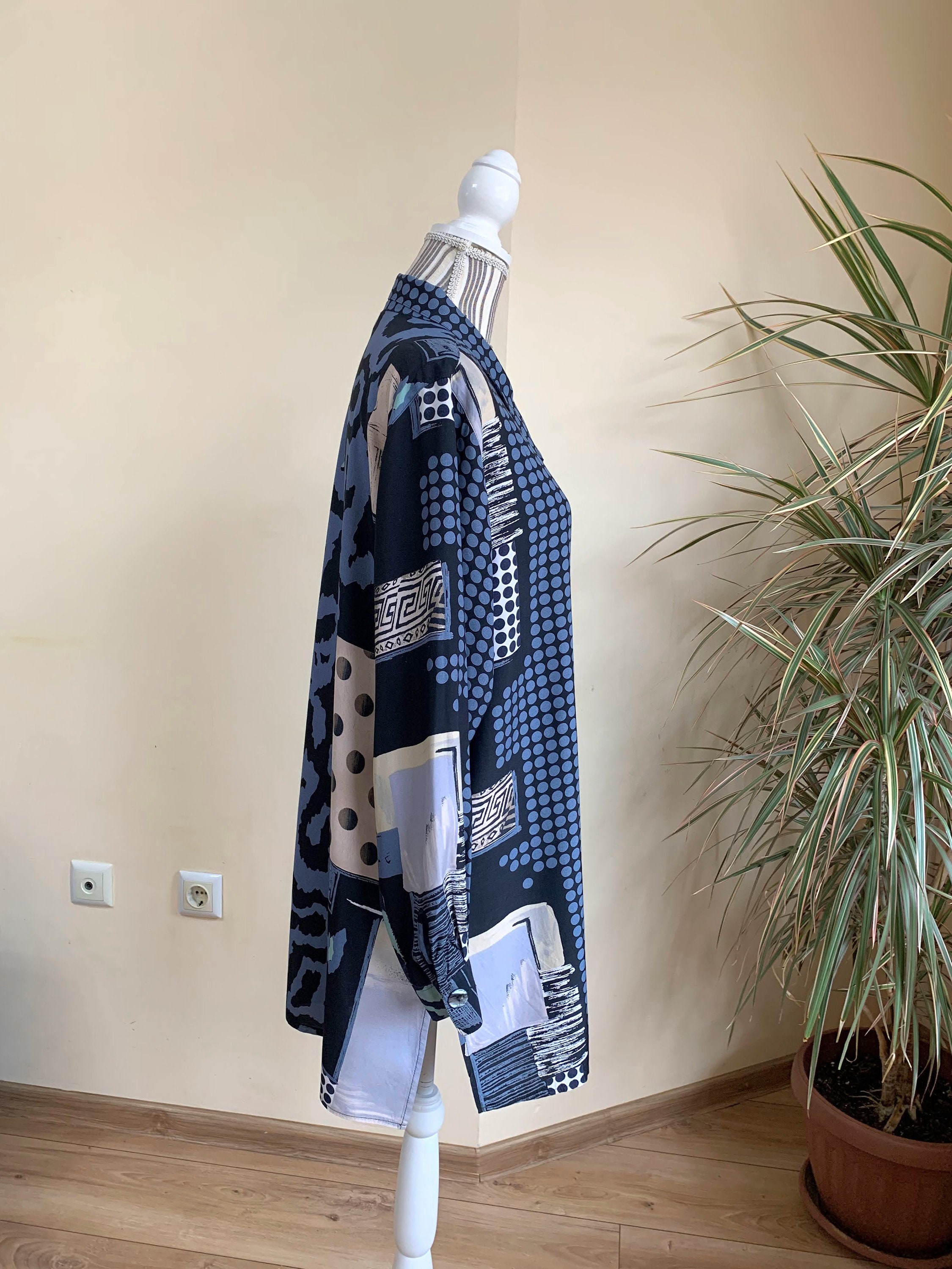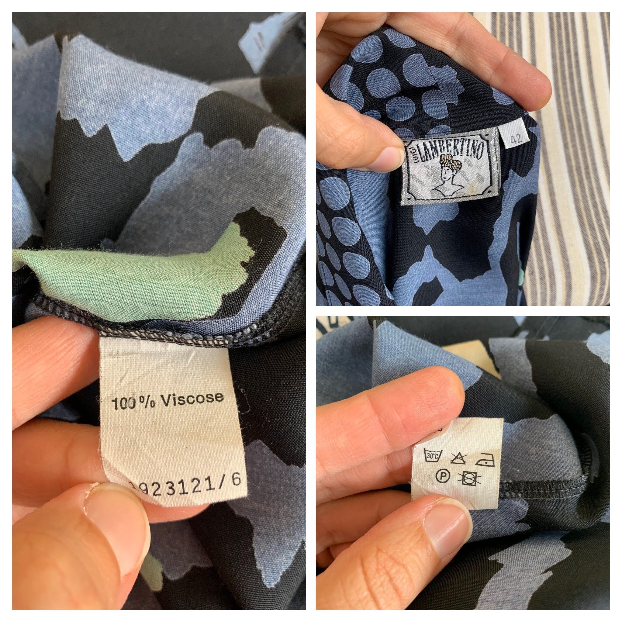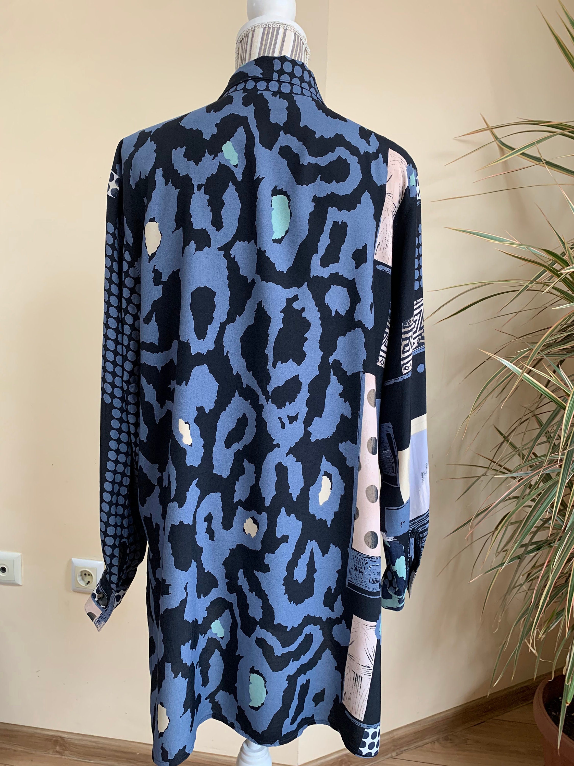 This is a vintage 80s collared button down shirt for women. It is made of 100% viscose fabric. This long sleeve retro shirt is in shades in blue and black. This button up shirt has an abstract asymmetrical print which makes this button down shirt even more unique. This loose fit shirt has a relaxed boxy silhouette. It is wide and baggy. It has side slits and plastic buttons which look like mother of pearl. This funky retro shirt is by the brand Luigi Lambertino. Size 42 is marked on the label. It fits like M or L.