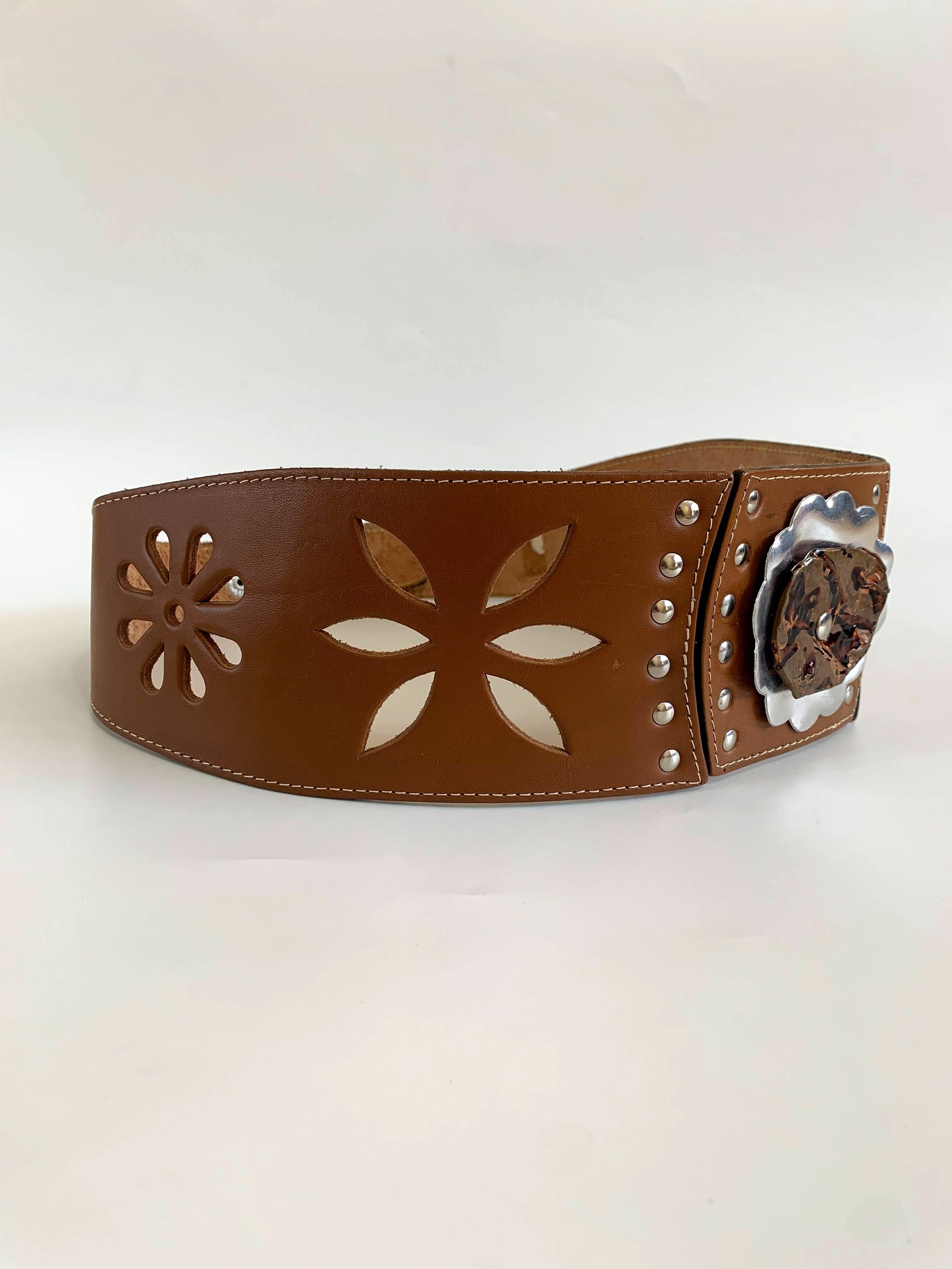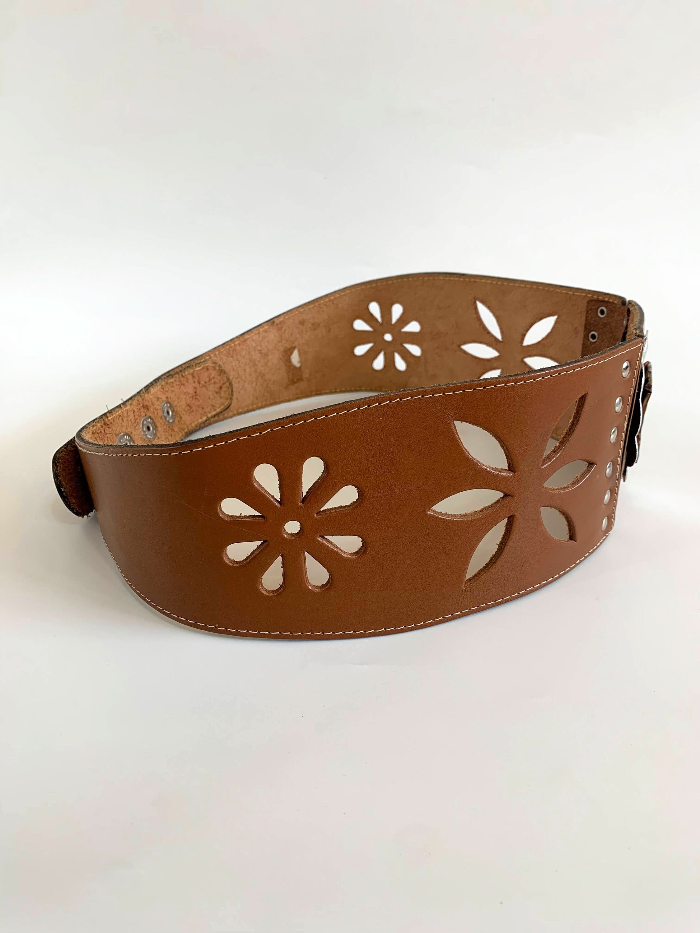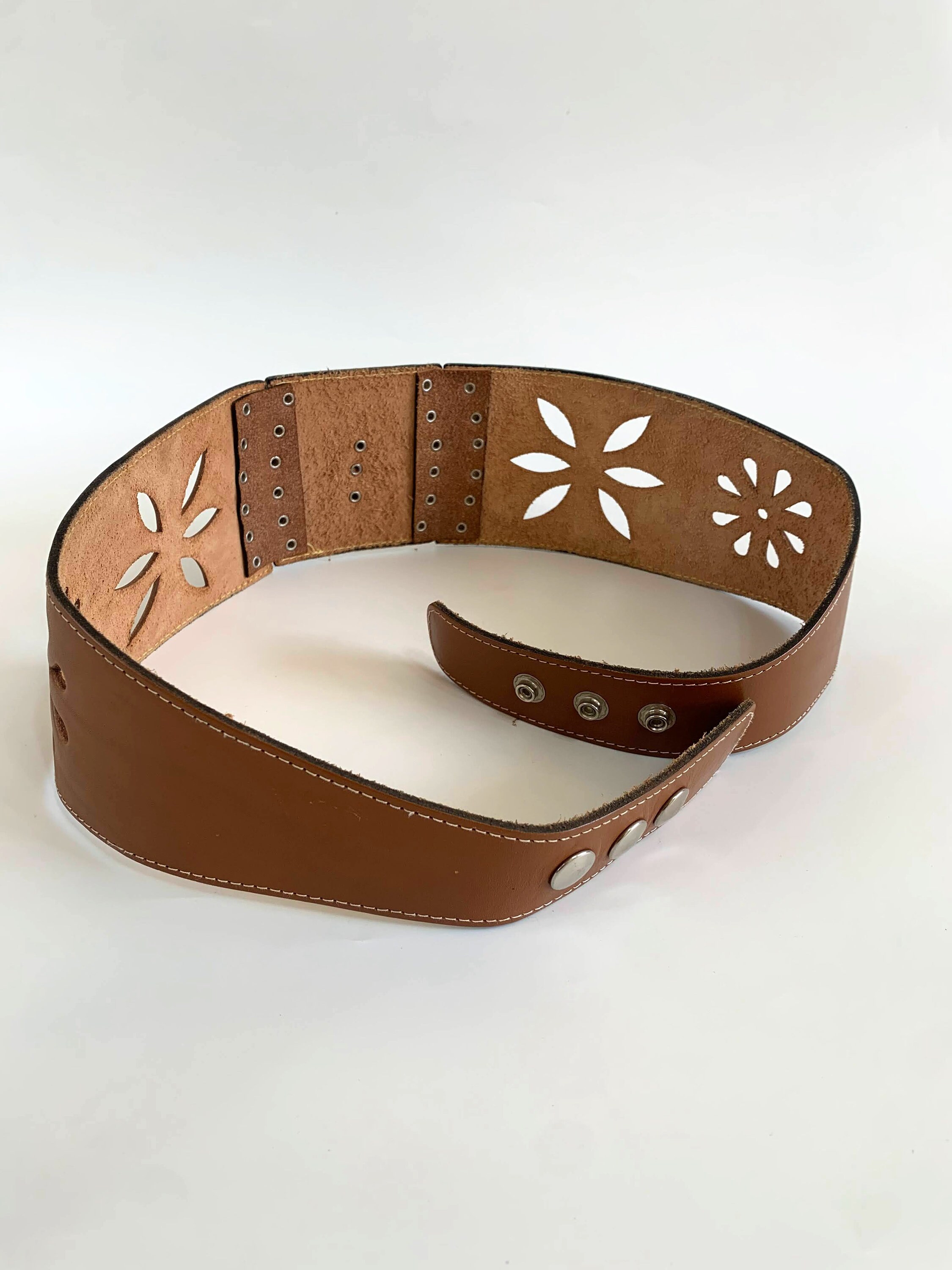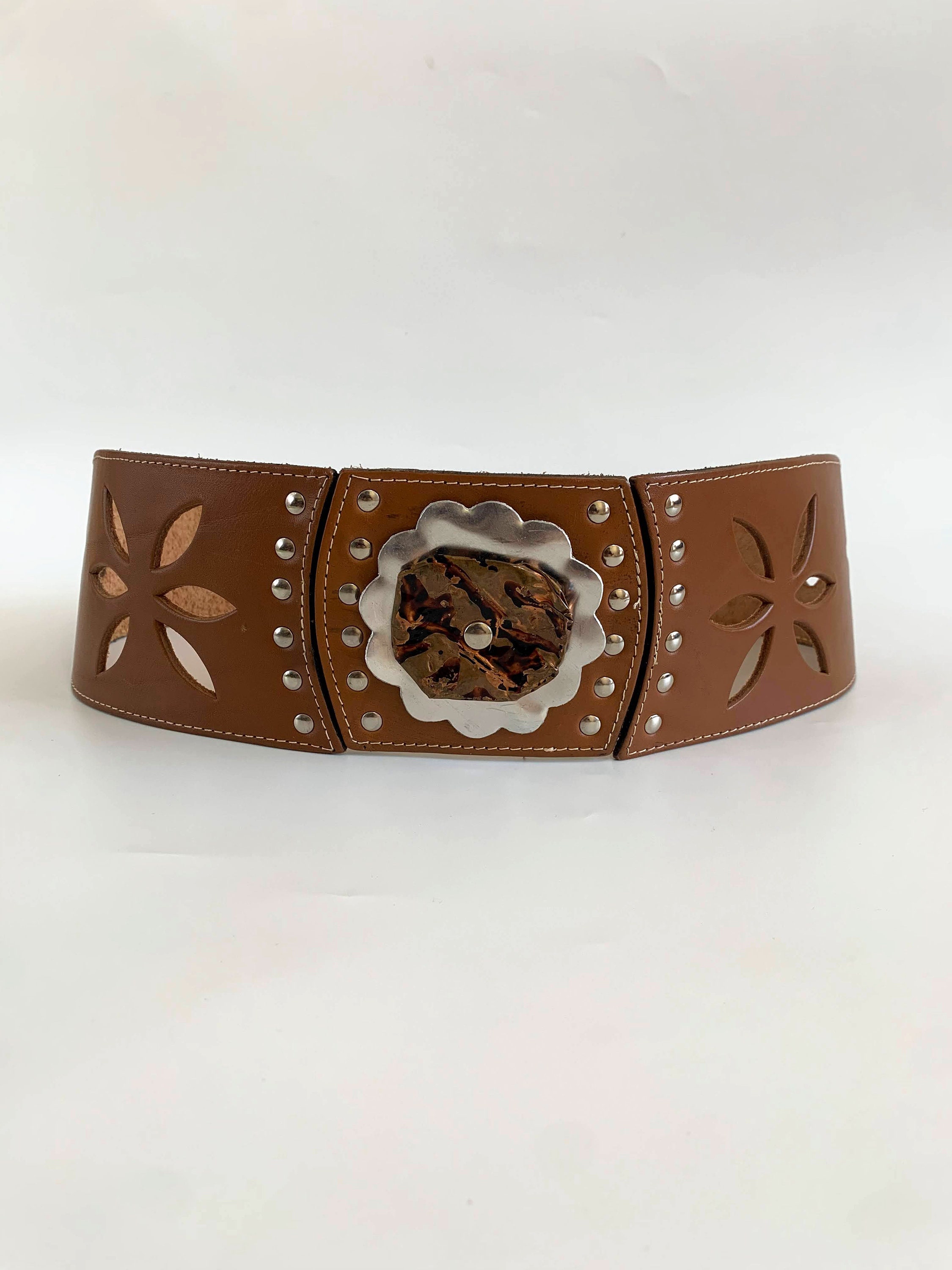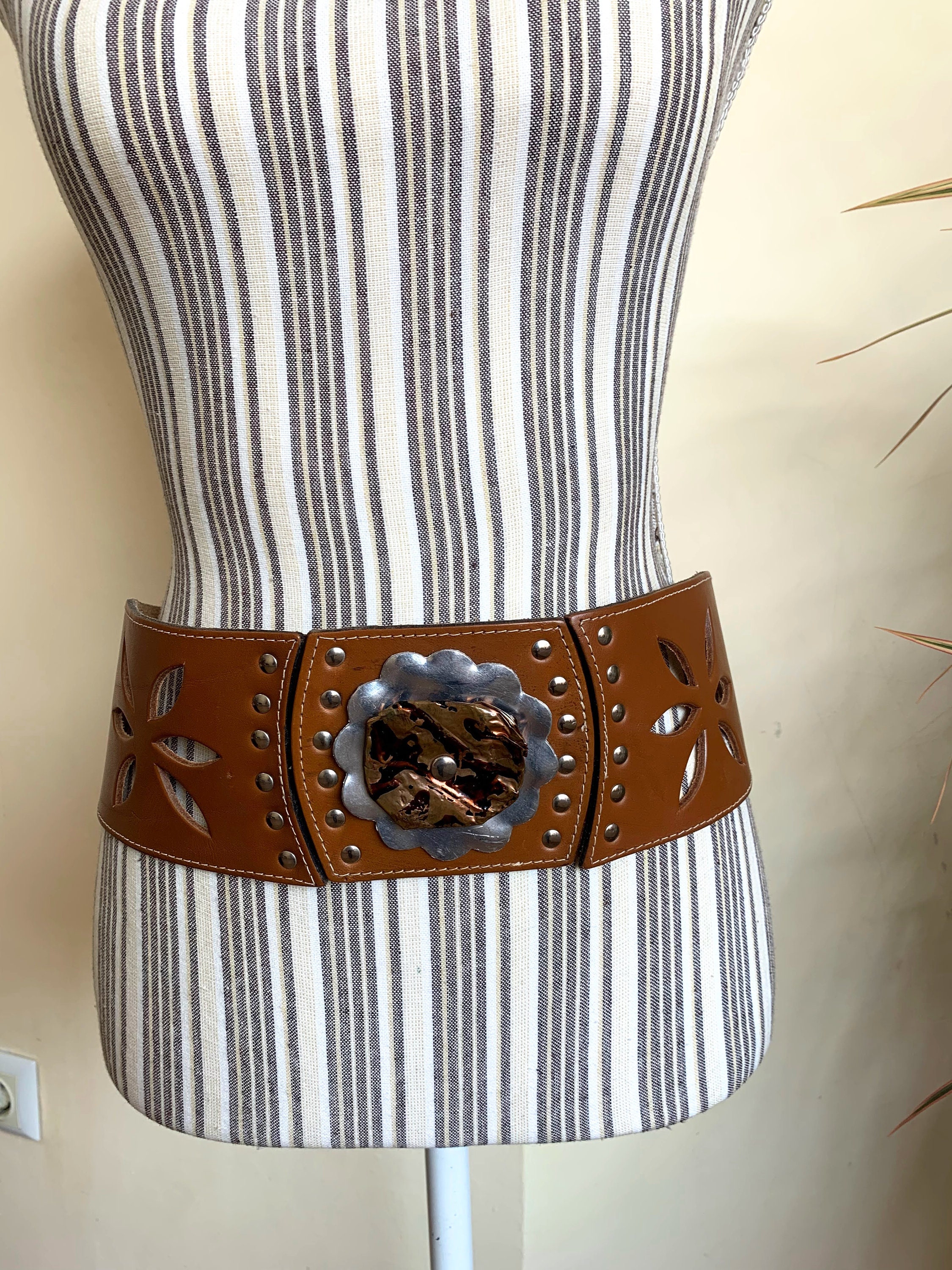 This is vintage wide waist belt made of genuine leather in cognac brown color and silver tone studs. This boho cut out leather belt has beautiful floral cut out leather decoration. The central metal plates represent a lovely flower. This real leather belt will make a wonderful accessory to your simple outfit. This beautiful bohemian belt has snap buttons at the back. This festival belt has no size marked. It can adjust from 24.4" / 62 cm to 28.3"/ 72 cm. It is 2.8"/ 7 cm wide at its widest front part and 1.6"/ 4 cm wide at the back.