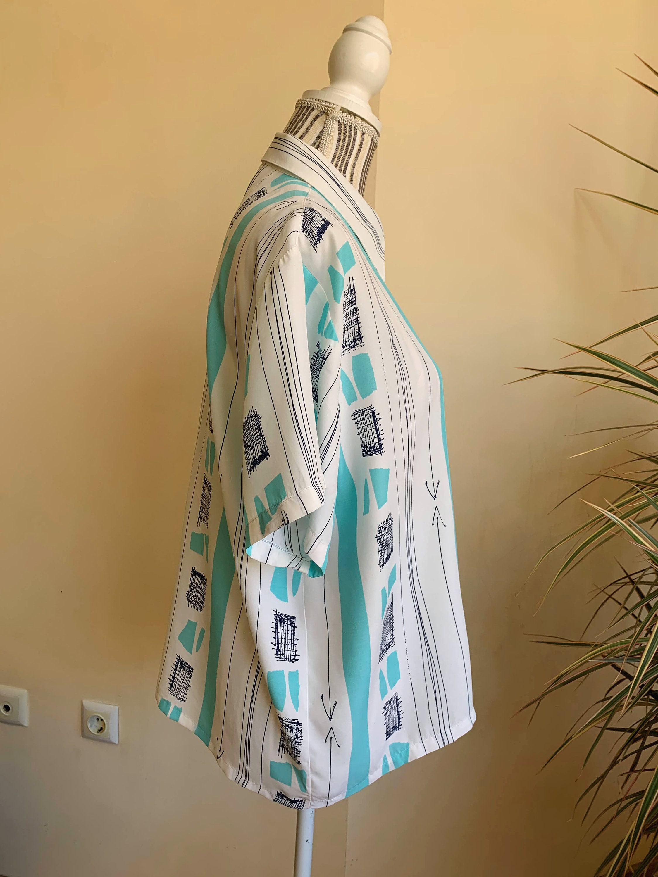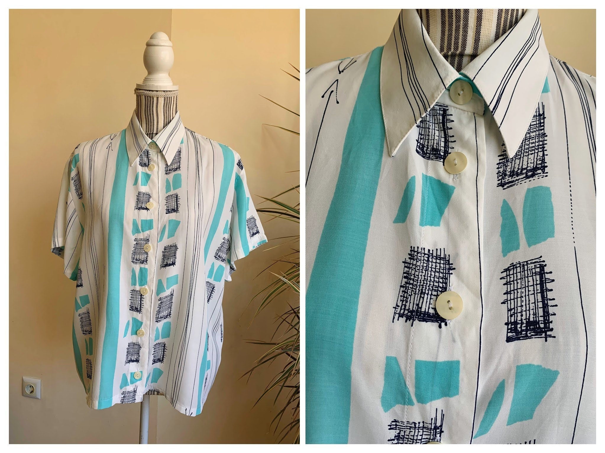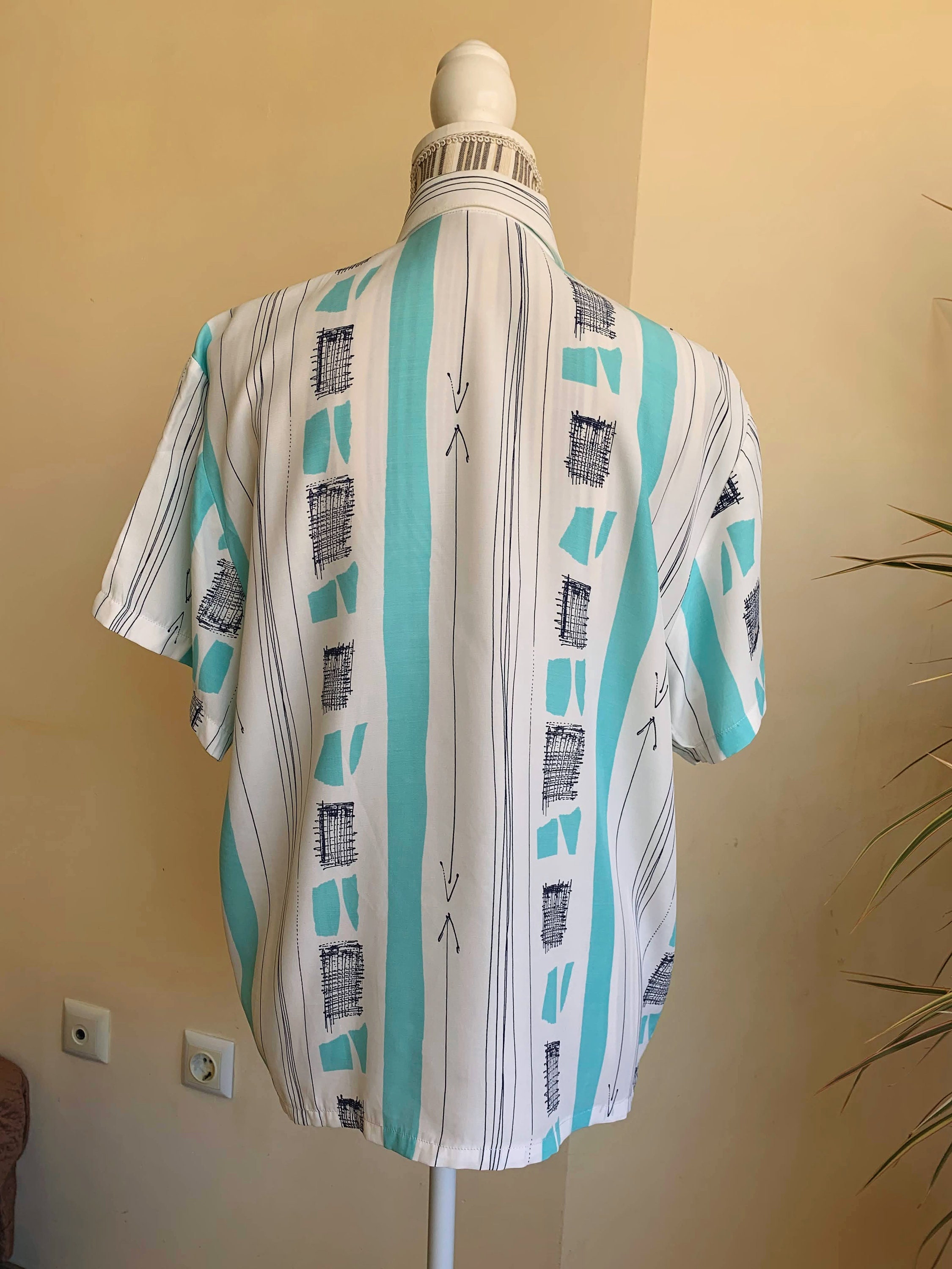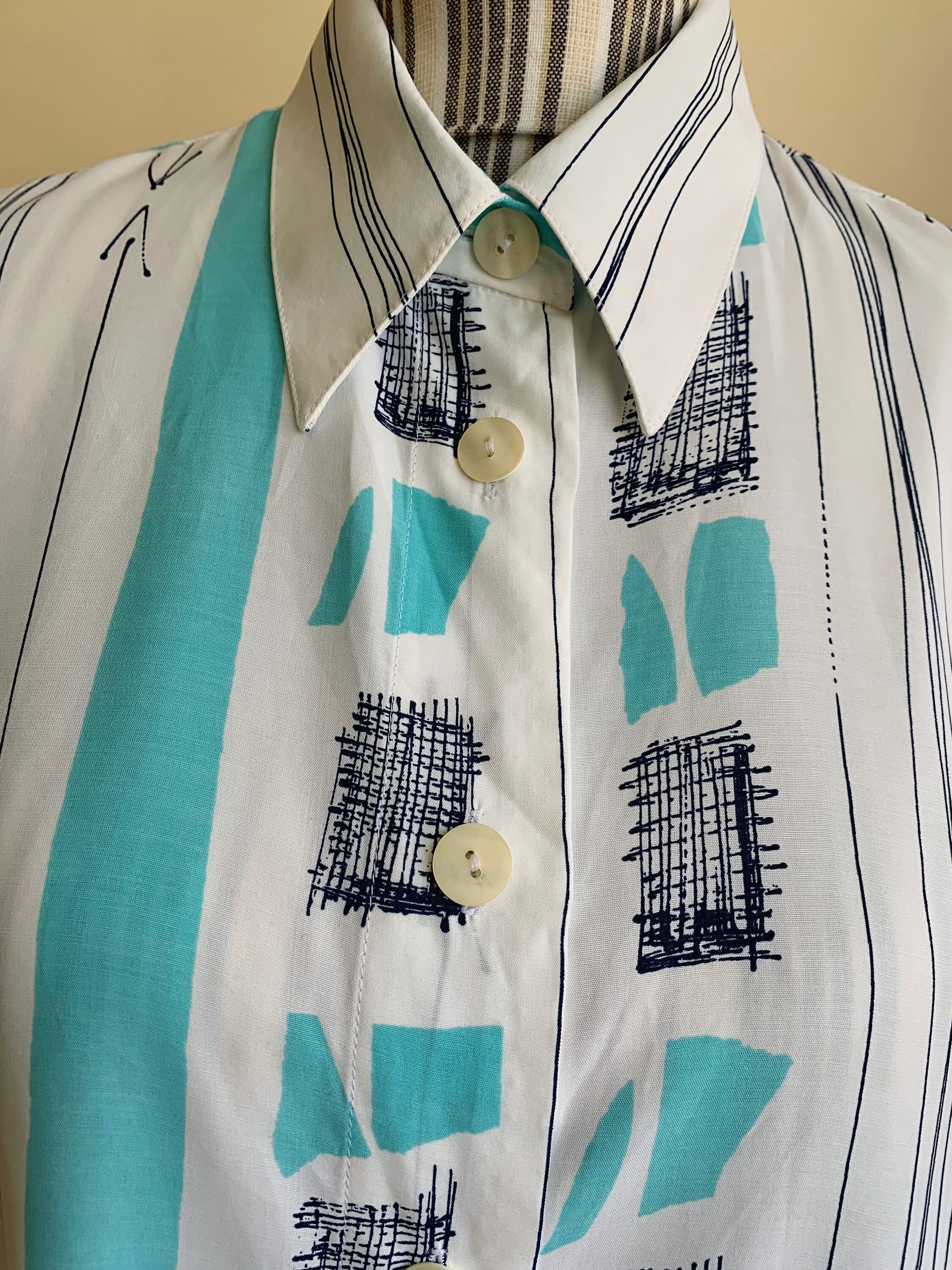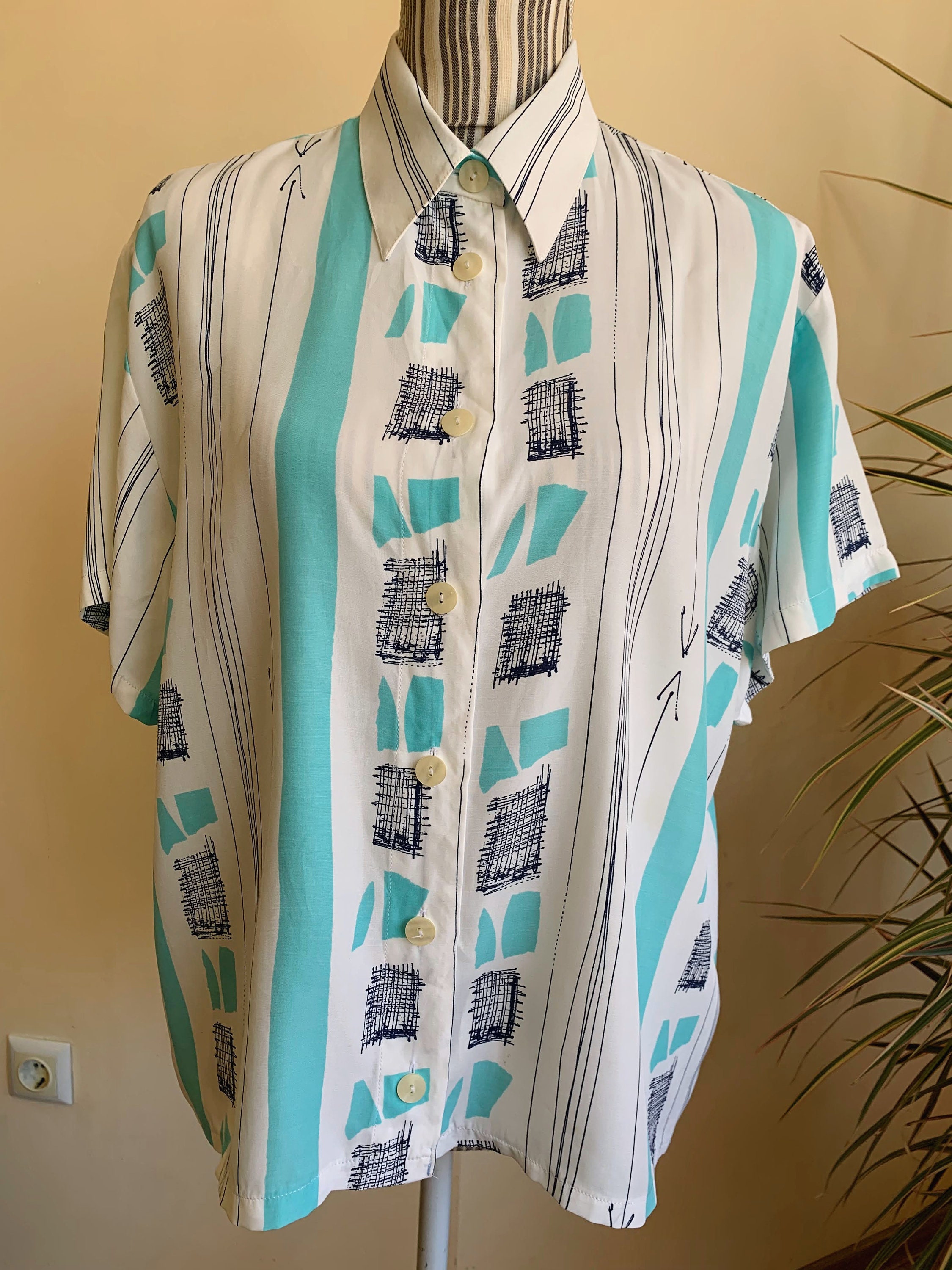 This is a vintage 80s collared button down shirt for women. It is made of lightweight viscose fabric in white with light and dark blue pattern. This button up shirt has an abstract print with stripes and arrows. This loose shirt has a boxy look with wide and baggy fit. It has wide short sleeves. This retro secretary shirt is by the brand Leardini. Size 42 is marked on the label. It fits like M or L.