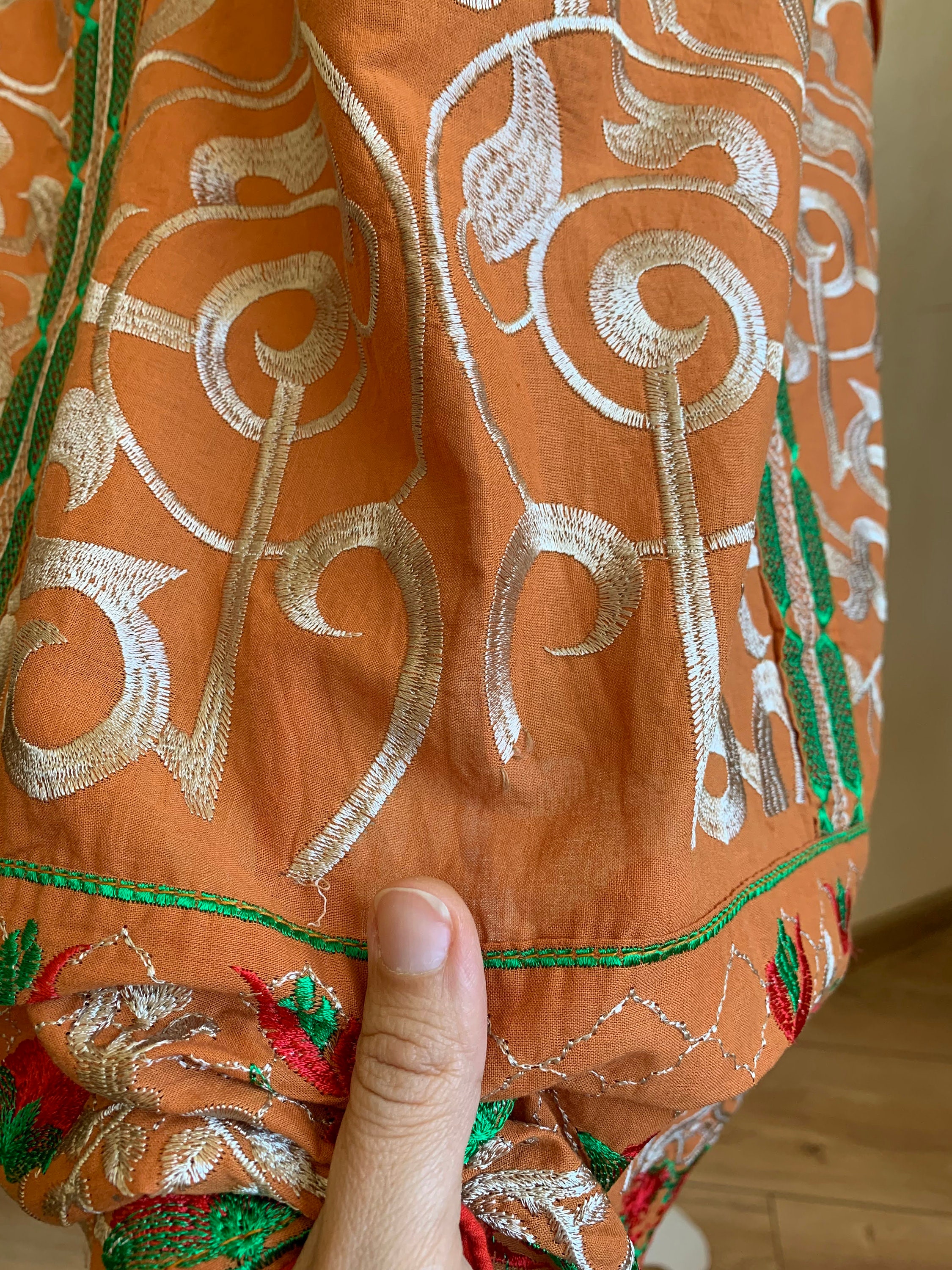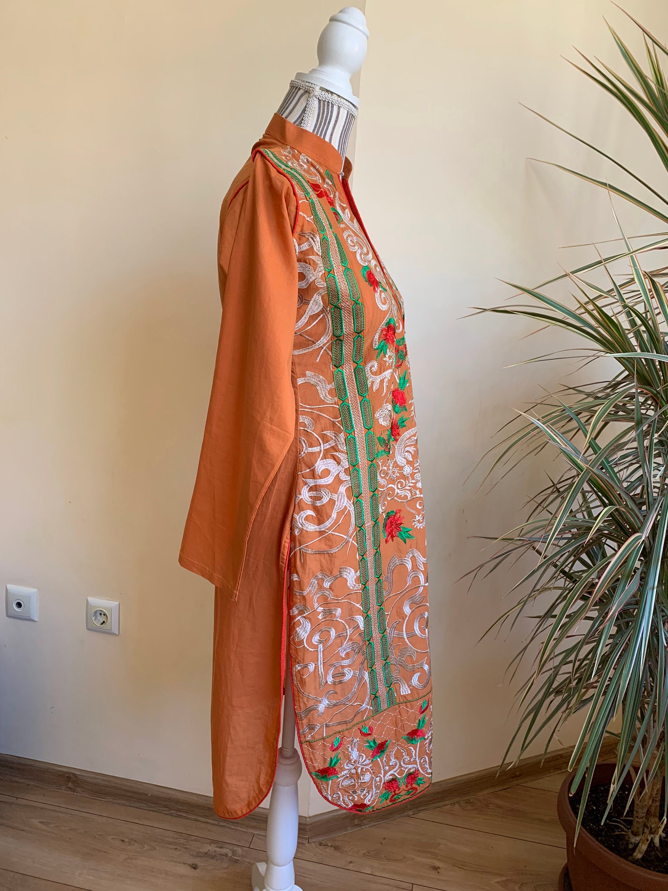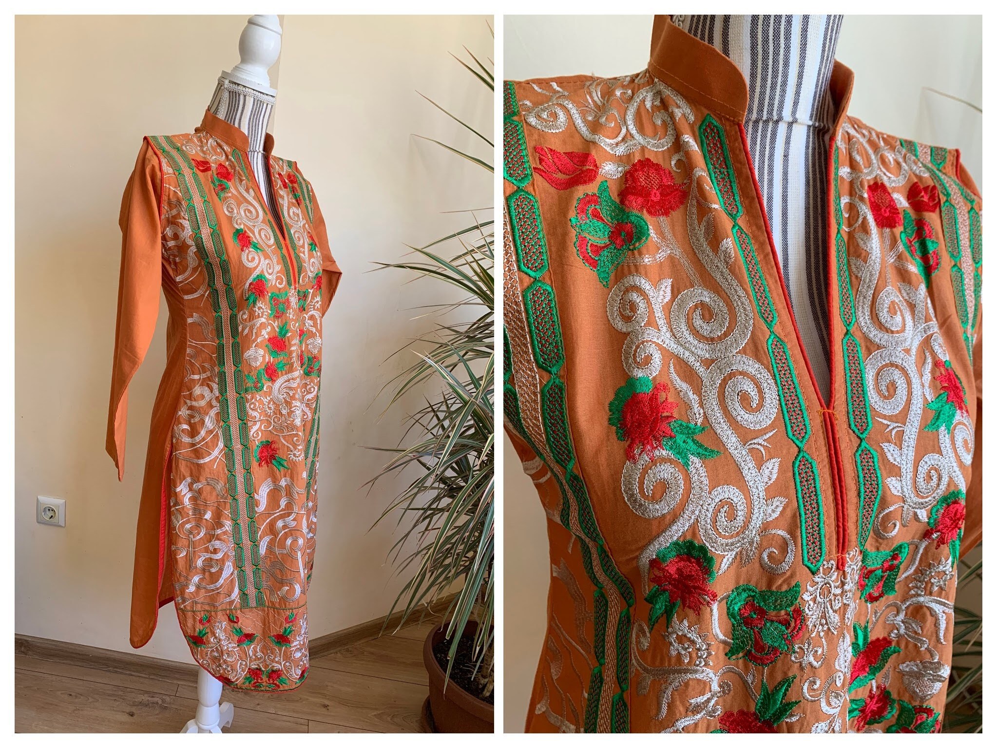 This is a vintage orange kaftan midi dress with deep side slits. This boho cotton dress has a v neck front and long sleeves. This bohemian tunic dress has beautiful embroidery front in red, green and white. The back is simple and clean. You can wear this long tunic as a boho shirt or as a beach cover up. You can pair it with relaxed pants underneath or throw it over your swimming suit. This mid calf dress has no size marked - it fits like size XS/ S. Please check the measurements below.