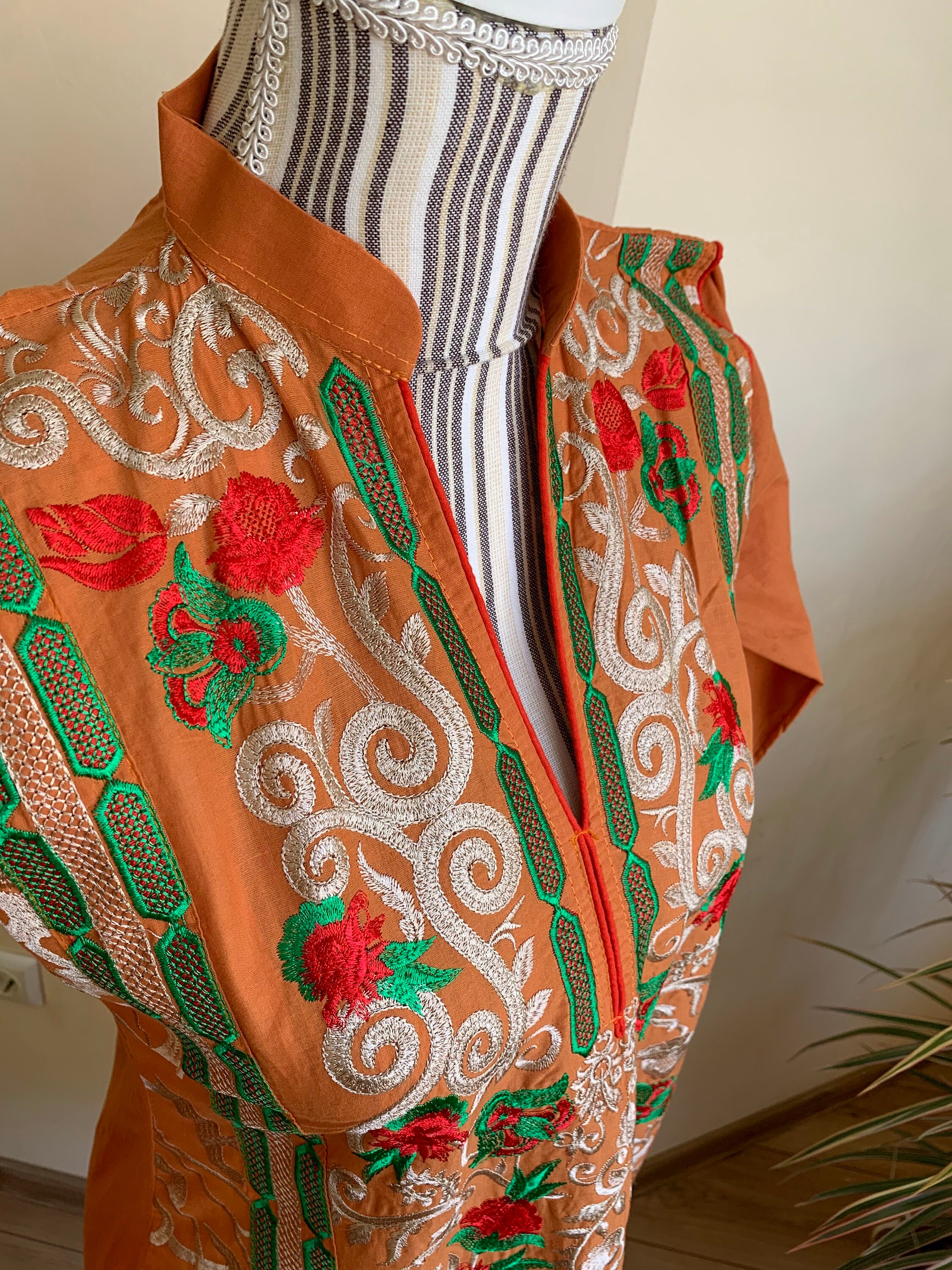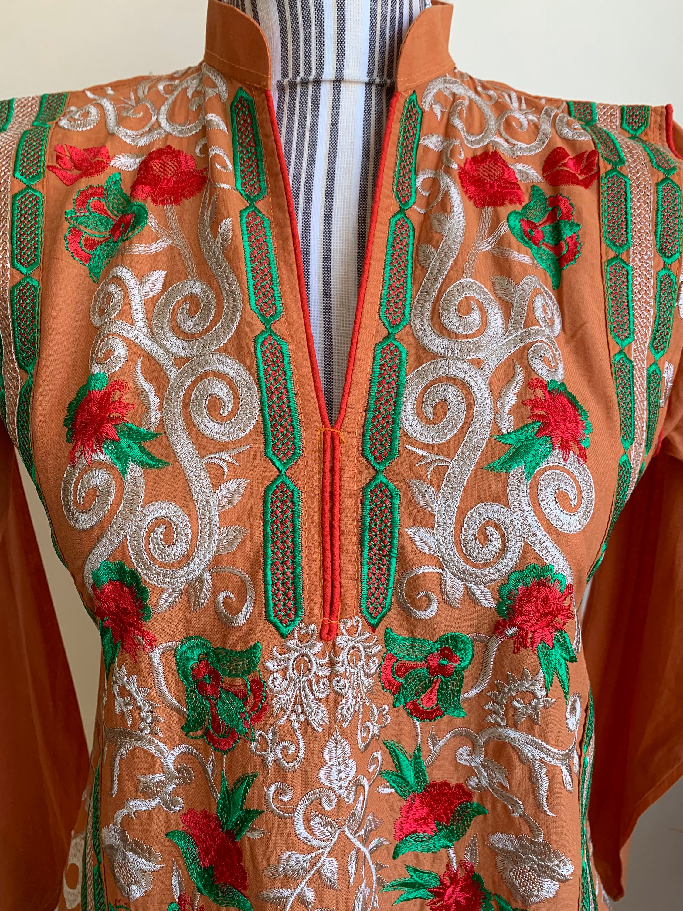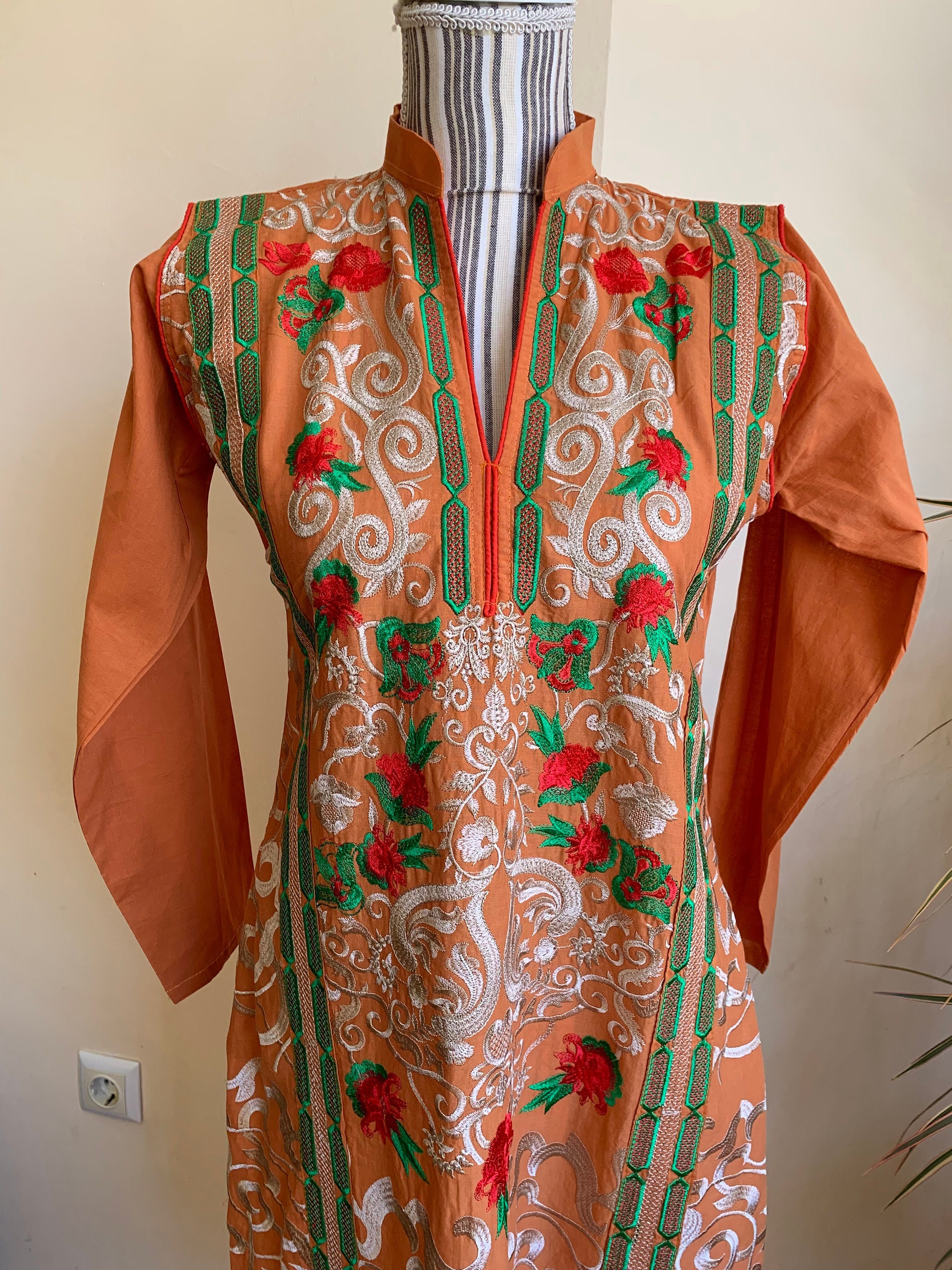 This is a vintage orange kaftan midi dress with deep side slits. This boho cotton dress has a v neck front and long sleeves. This bohemian tunic dress has beautiful embroidery front in red, green and white. The back is simple and clean. You can wear this long tunic as a boho shirt or as a beach cover up. You can pair it with relaxed pants underneath or throw it over your swimming suit. This mid calf dress has no size marked - it fits like size XS/ S. Please check the measurements below.
