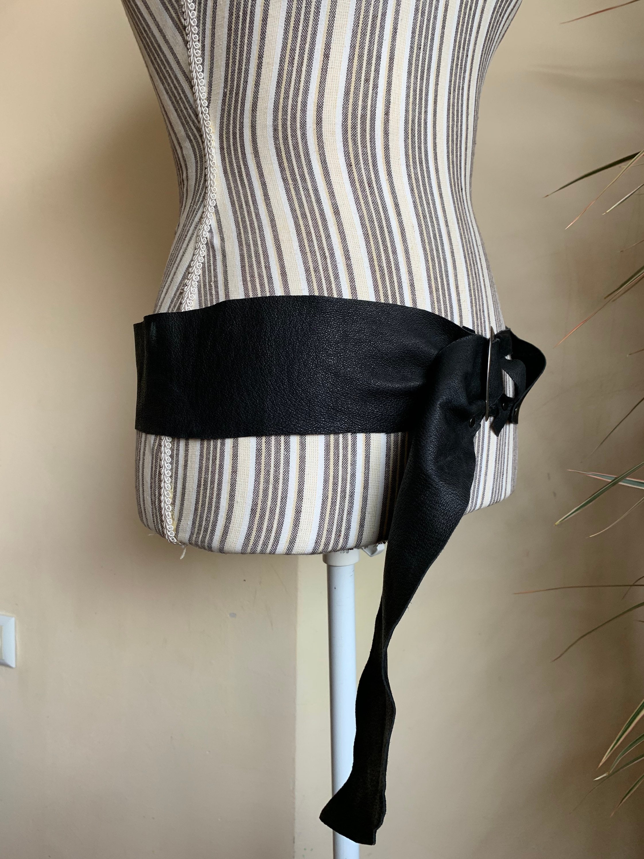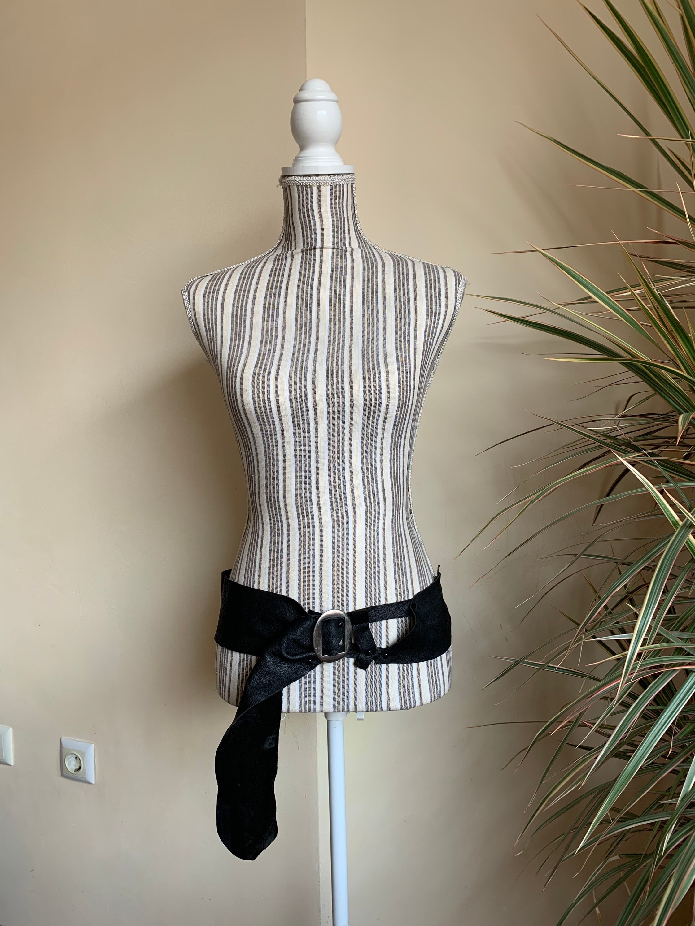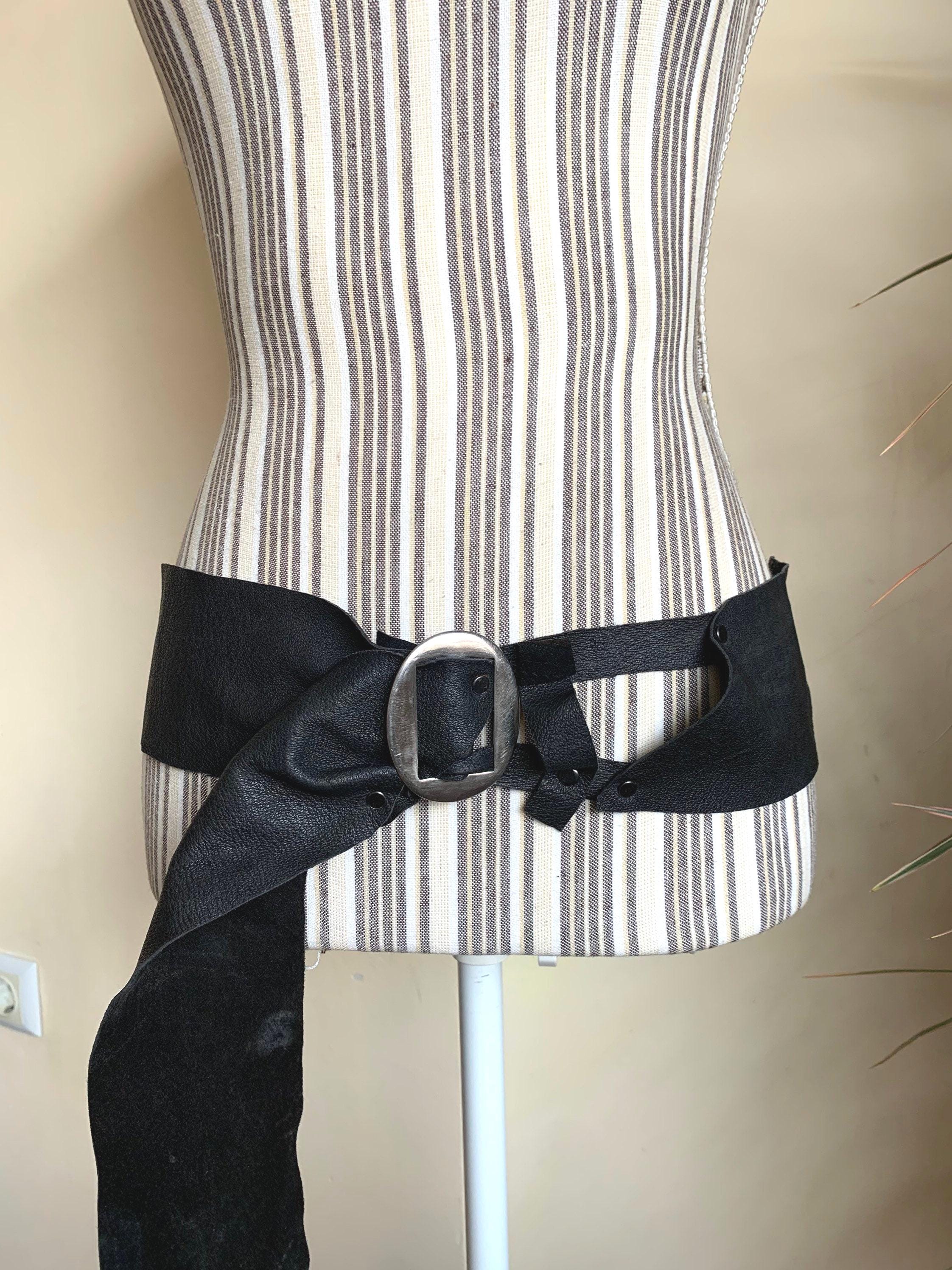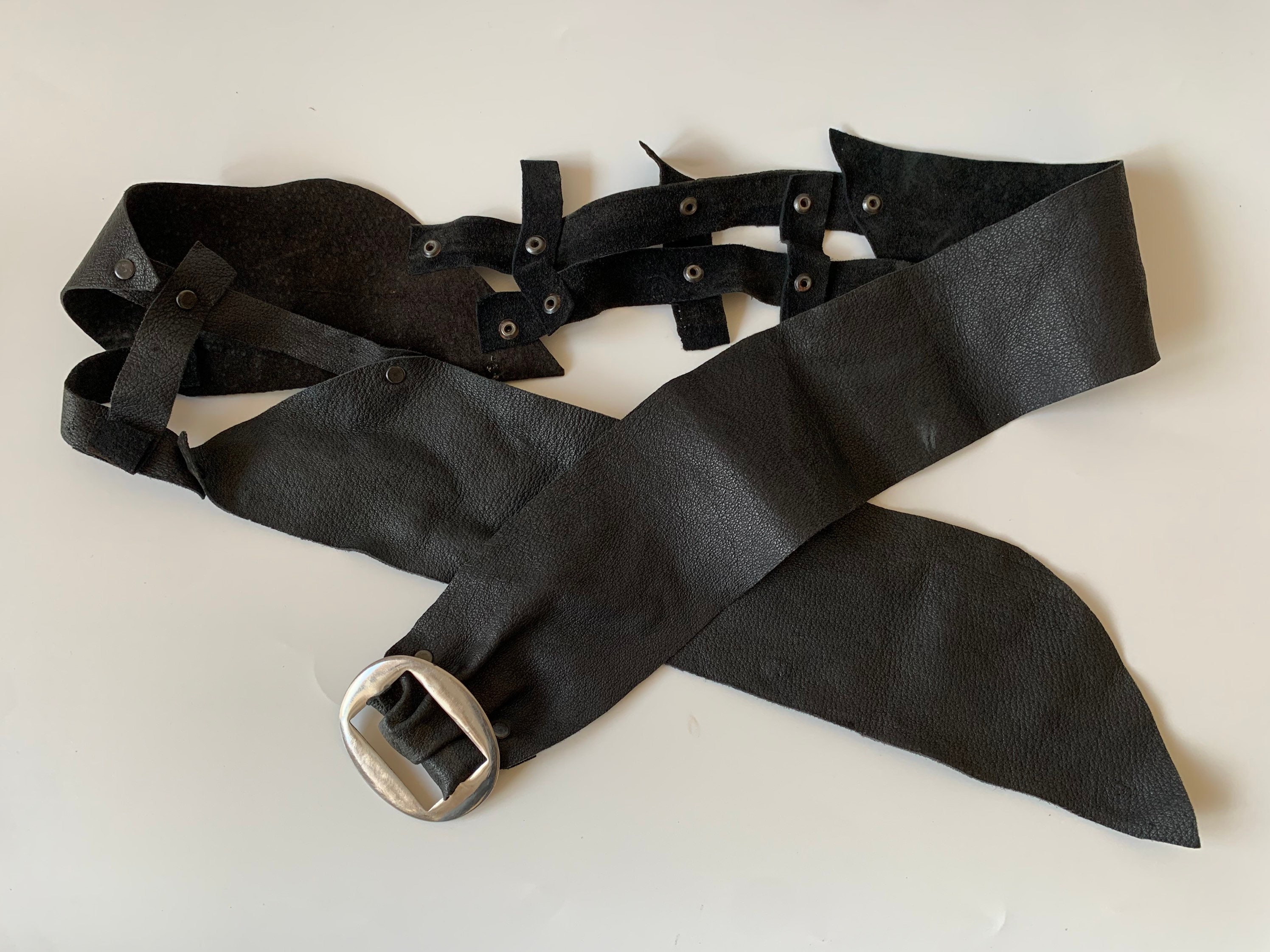 This is super soft black leather belt with silver tone oval buckle. This vintage handmade belt is made of genuine leather which is super soft. This asymmetrical belt adjusts up to approximately 43.3" /110 cm. It is 3" / 7.5 cm wide at its widest point. This wide hip belt is perfect to add a pop of tribal fusion look to your outfit.