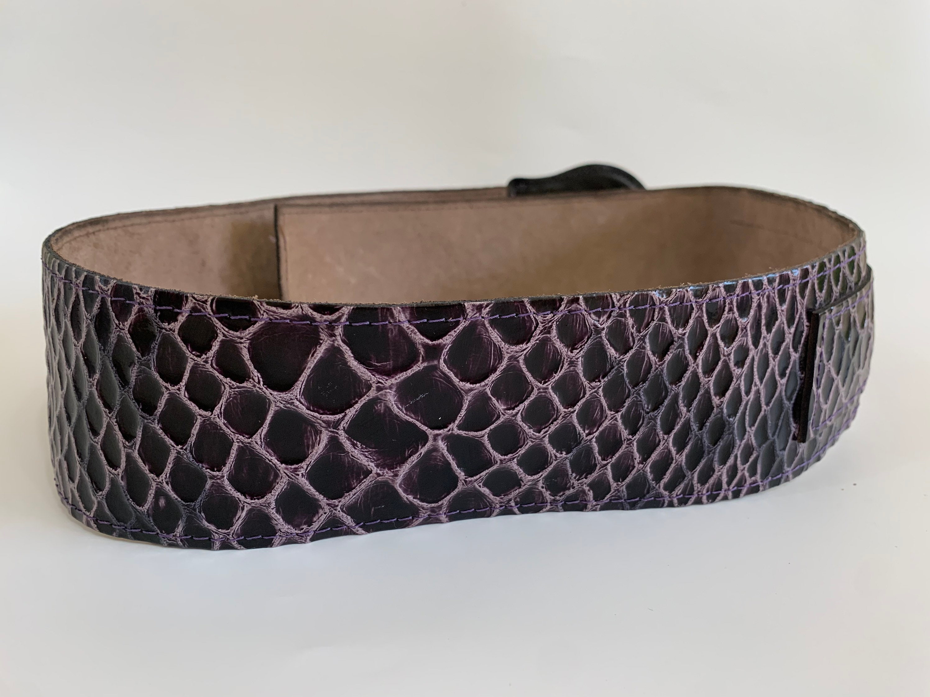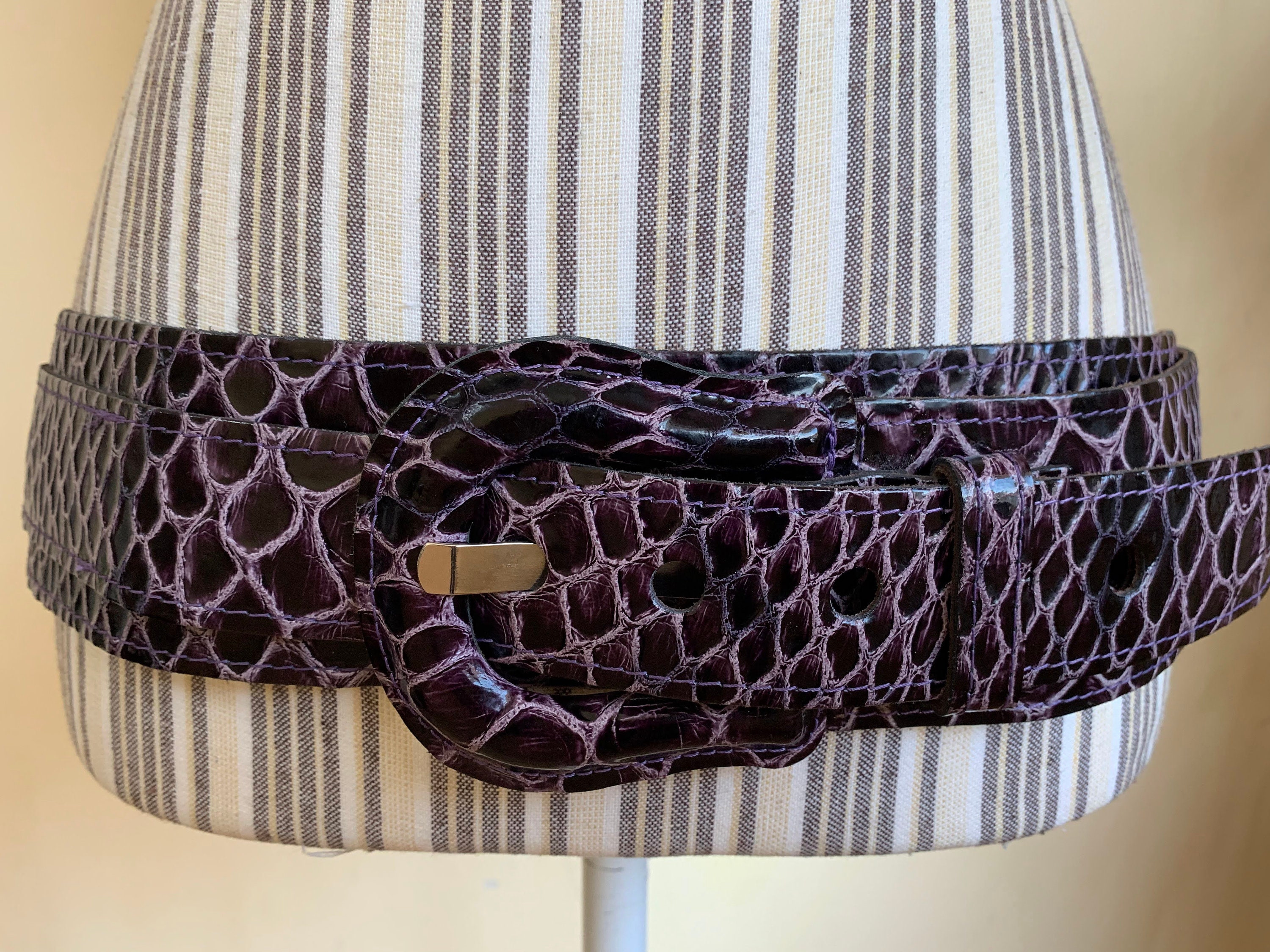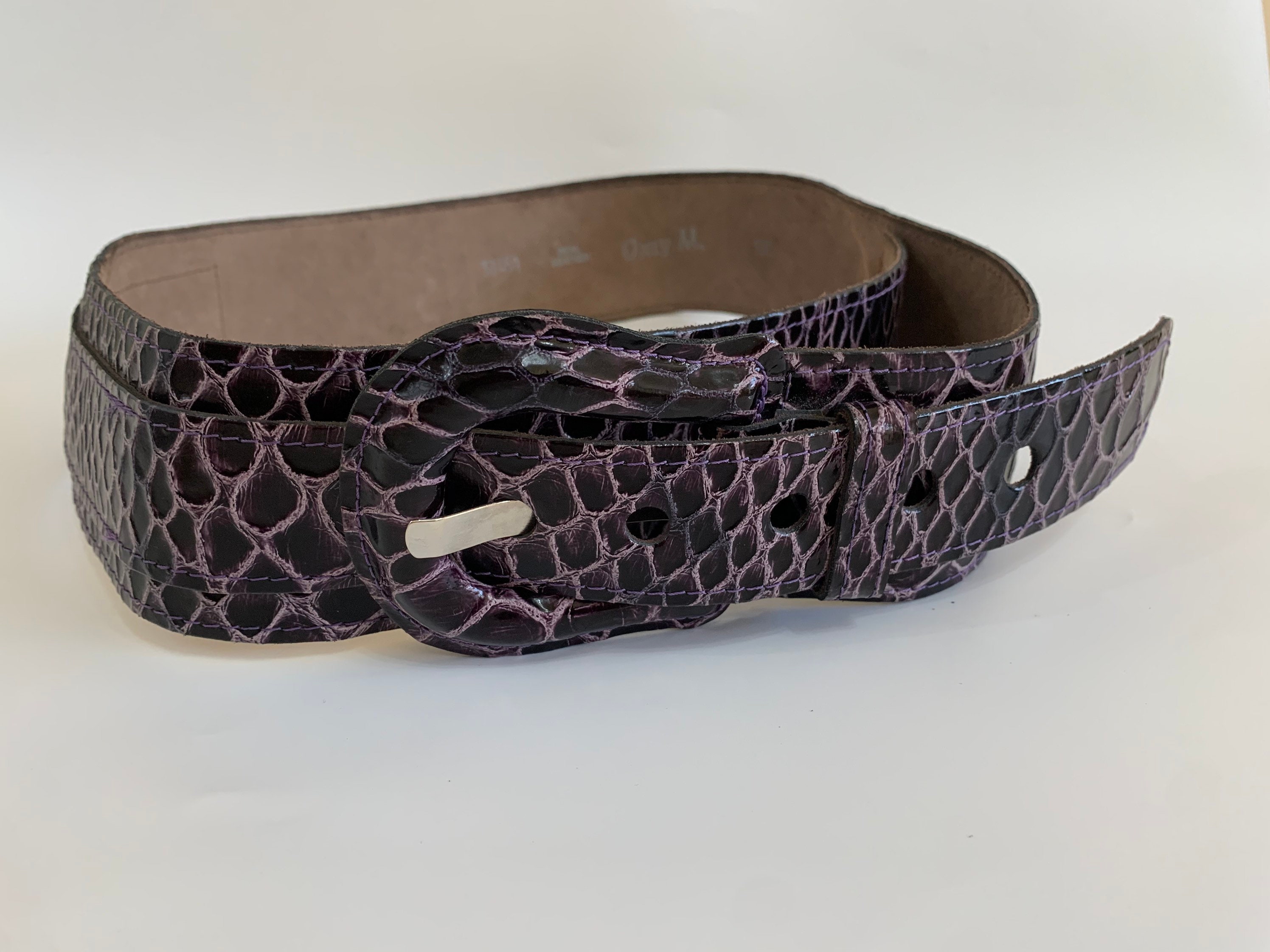This is a statement vintage 90s reptile embossed textured leather waist belt for women with leather covered statement buckle. This wide hip belt is made of genuine leather with mock crock print in purple and pink color. This real leather waist cincher can adjust from 34.6"/ 88 cm to 39.4" / 100 cm. It is 2.6" / 6 cm wide.