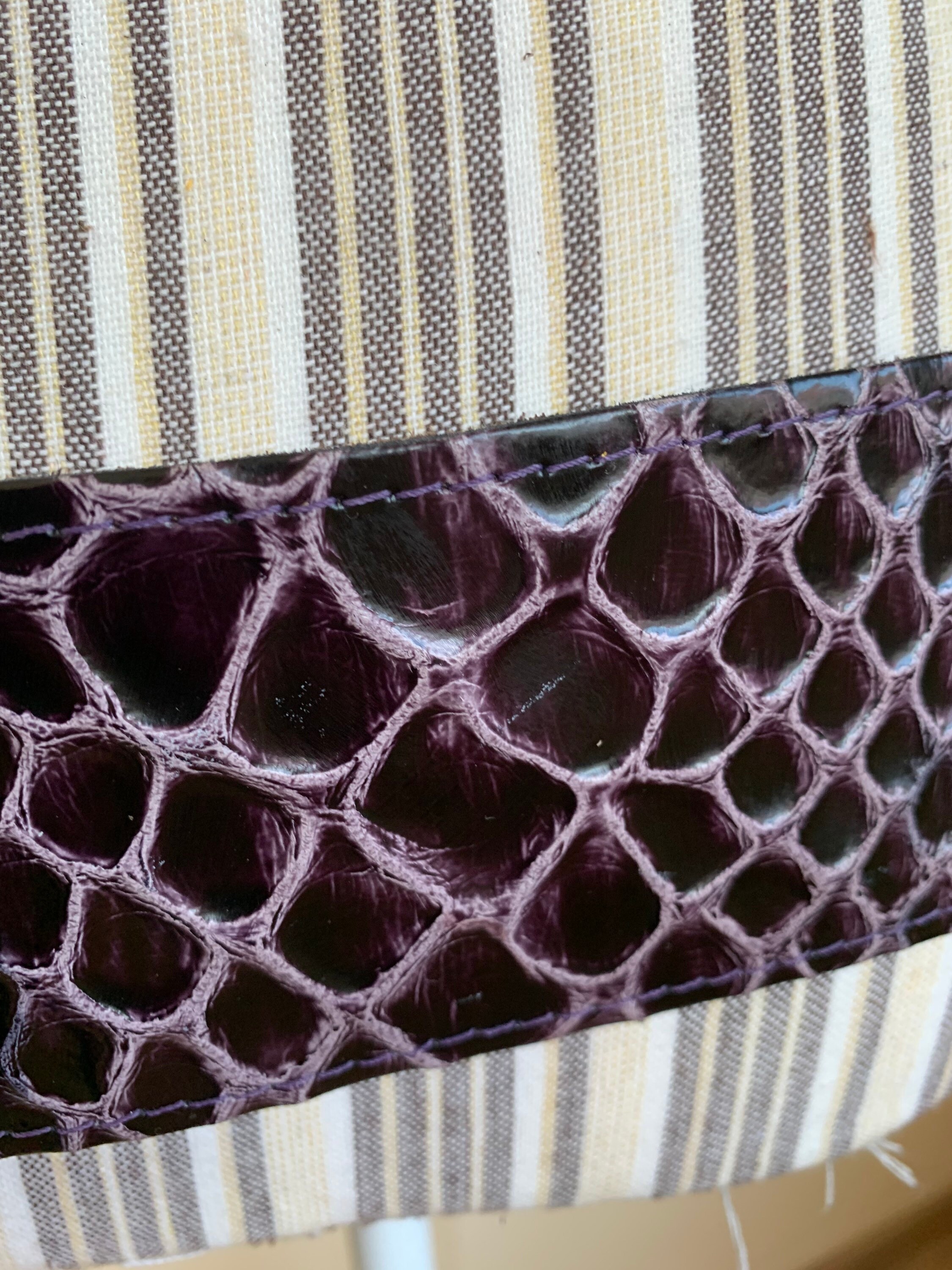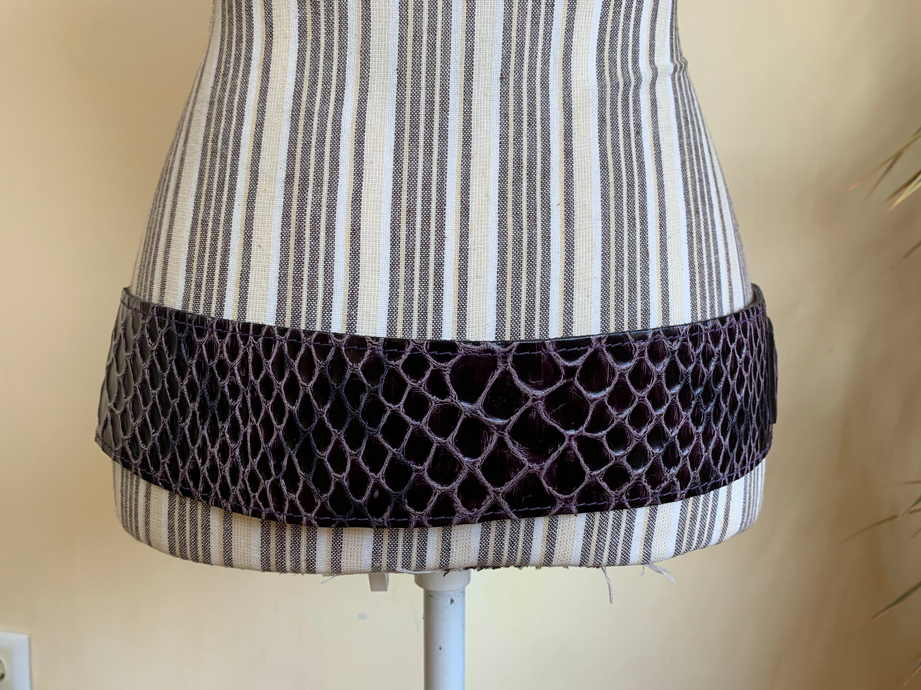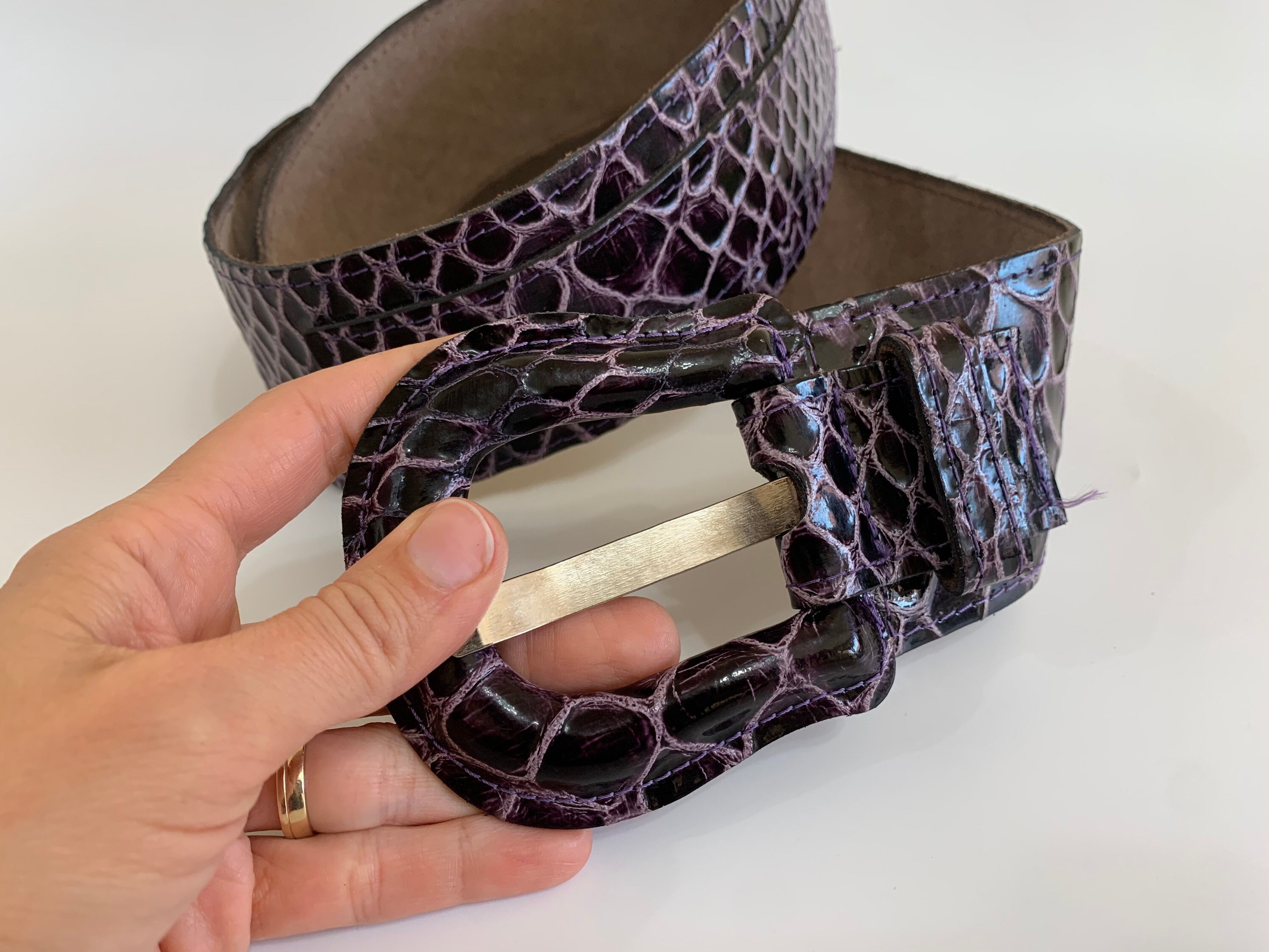 This is a statement vintage 90s reptile embossed textured leather waist belt for women with leather covered statement buckle. This wide hip belt is made of genuine leather with mock crock print in purple and pink color. This real leather waist cincher can adjust from 34.6"/ 88 cm to 39.4" / 100 cm. It is 2.6" / 6 cm wide.