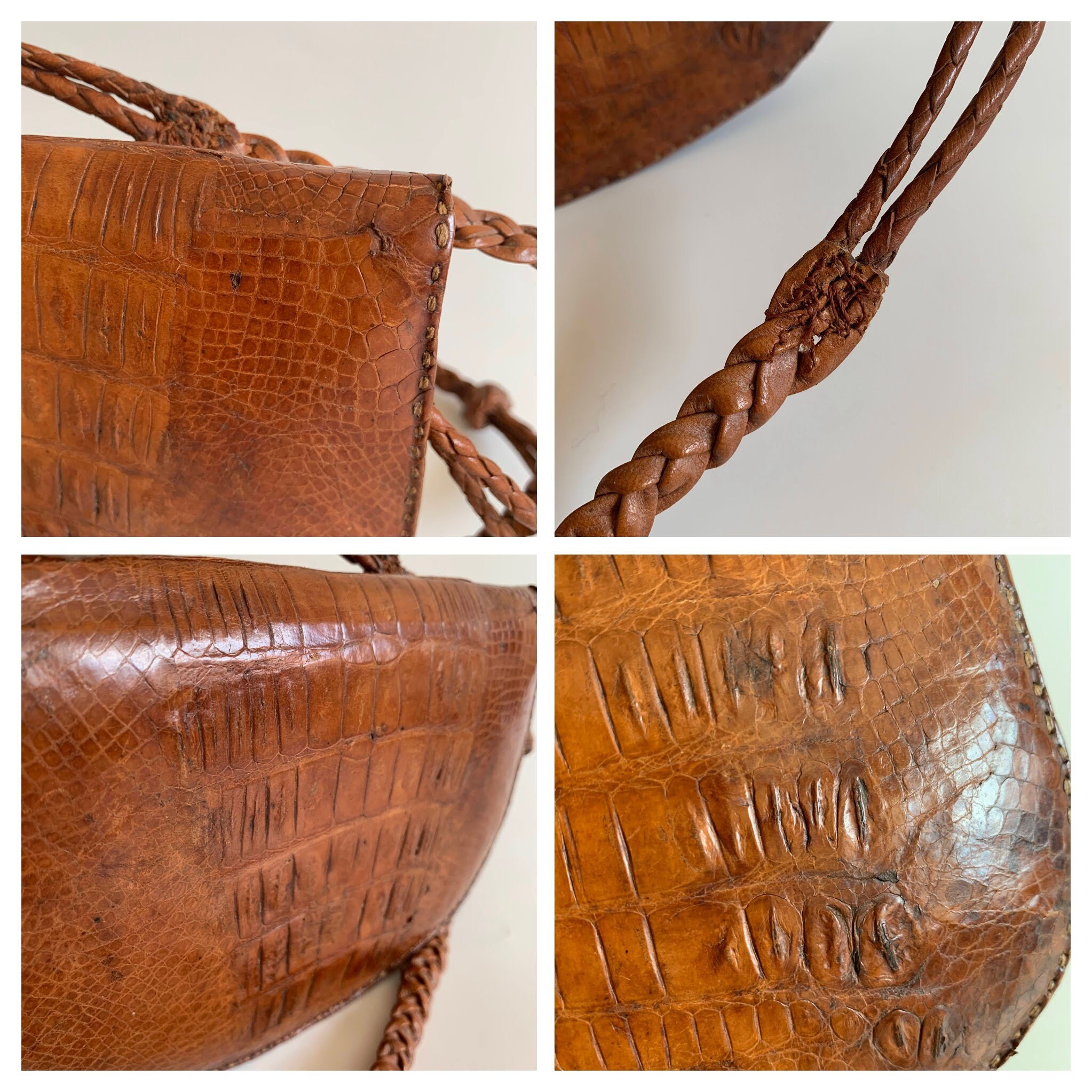 Condition: This vintage croc purse has a heavily distressed look. The reptile skin shows marks and scratches, as well as some creases. The strap has been torn and then sawn again. I have tried to capture these signs of wear in the close up photos.