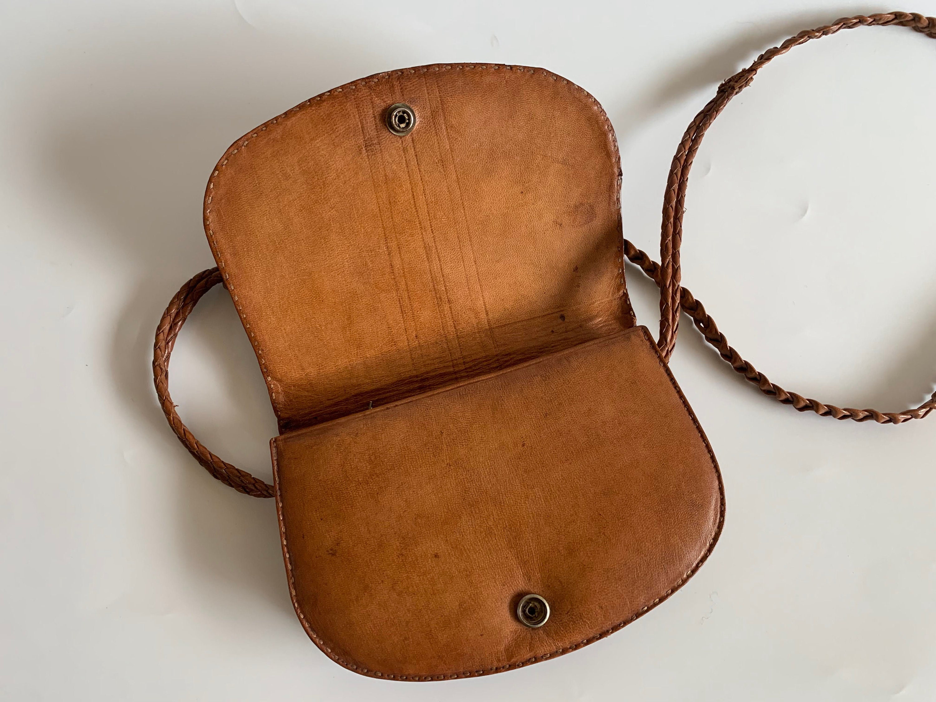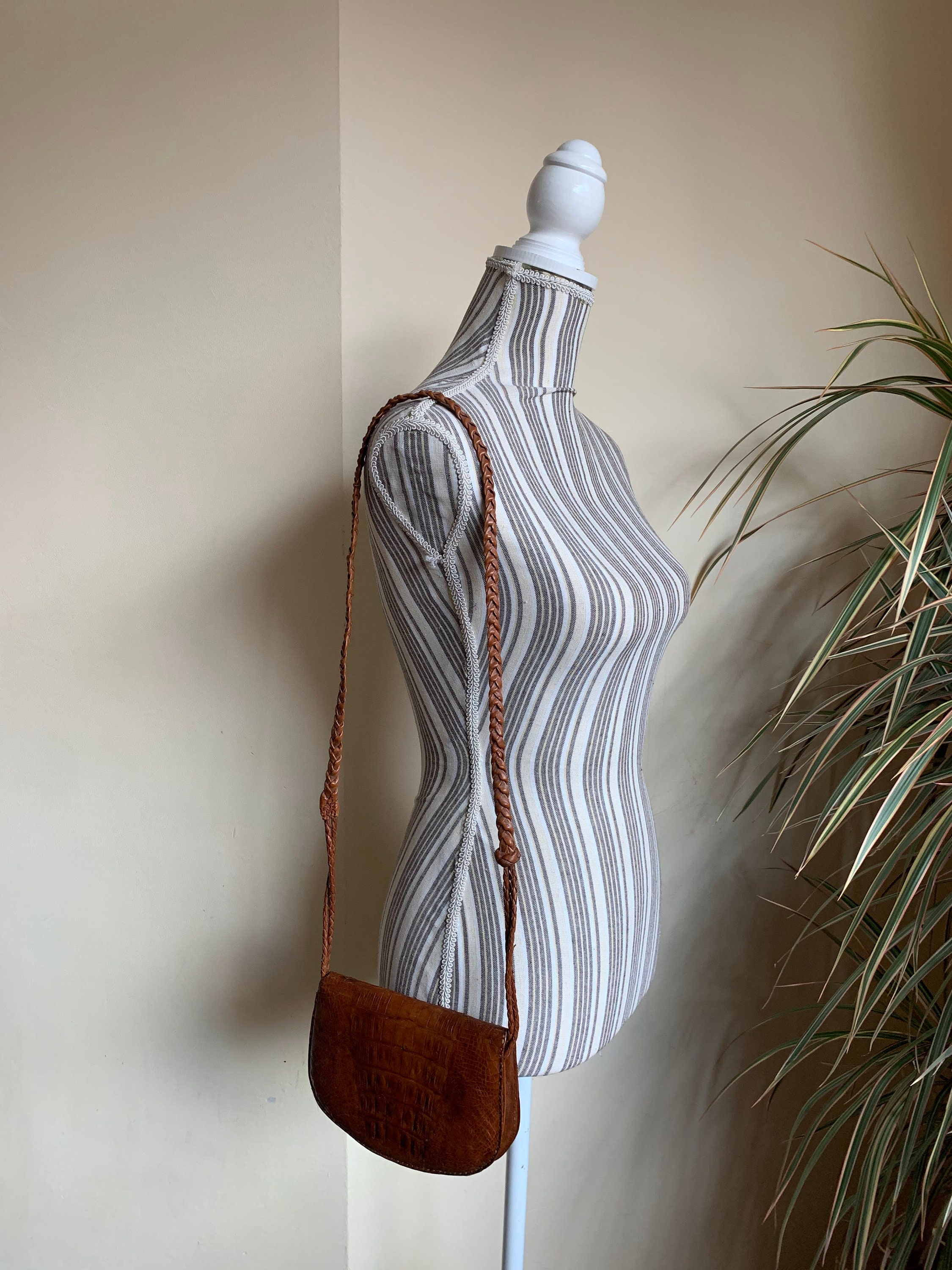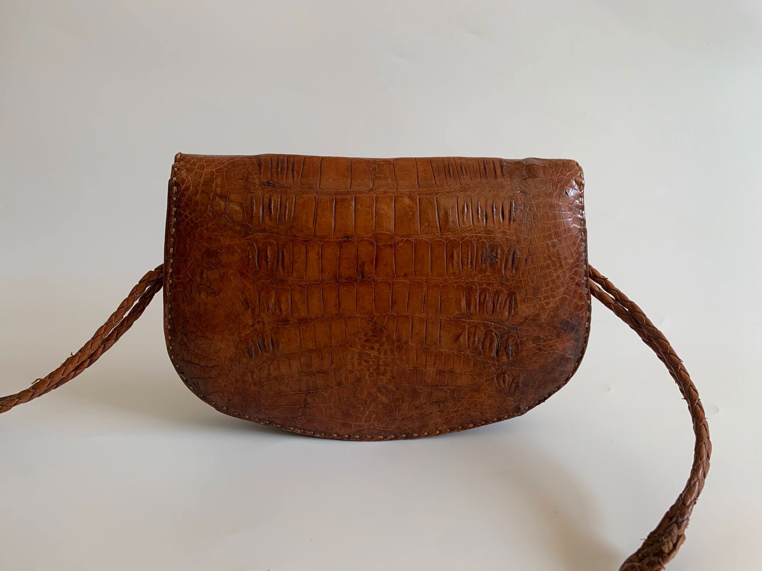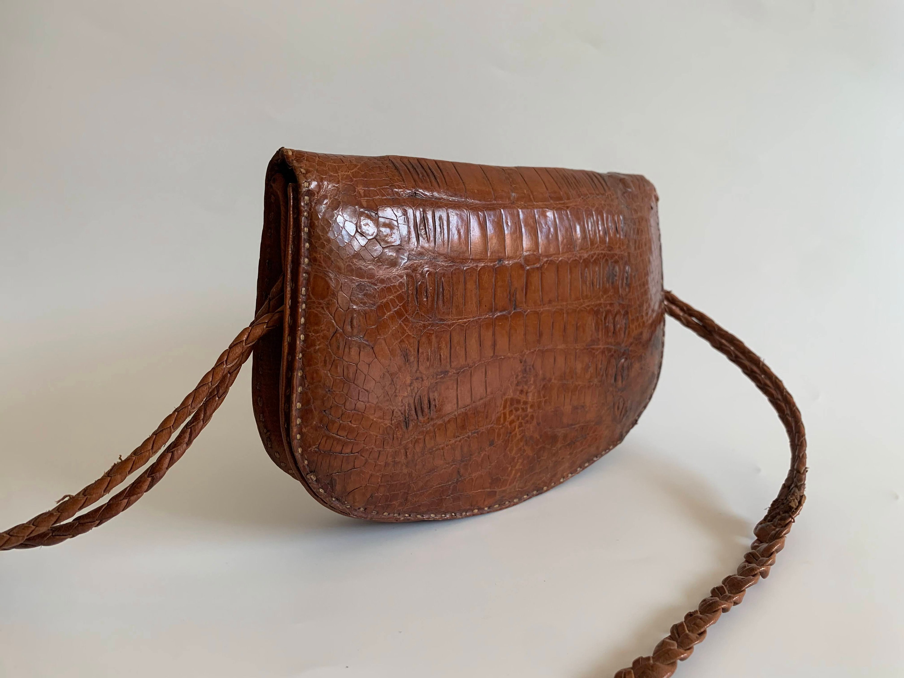 This is a vintage small shoulder bag, made of genuine leather with genuine leather lining. This genuine reptile skin purse was much loved and has a distressed leather look. This mini handbag has a braided slim shoulder strap which was torn and sawn again. The interior is lined in genuine leather in tan brown color, just like the purse. It has two compartments, two slip pockets and one zipper pocket. with embossed faux crocodile reptile print.