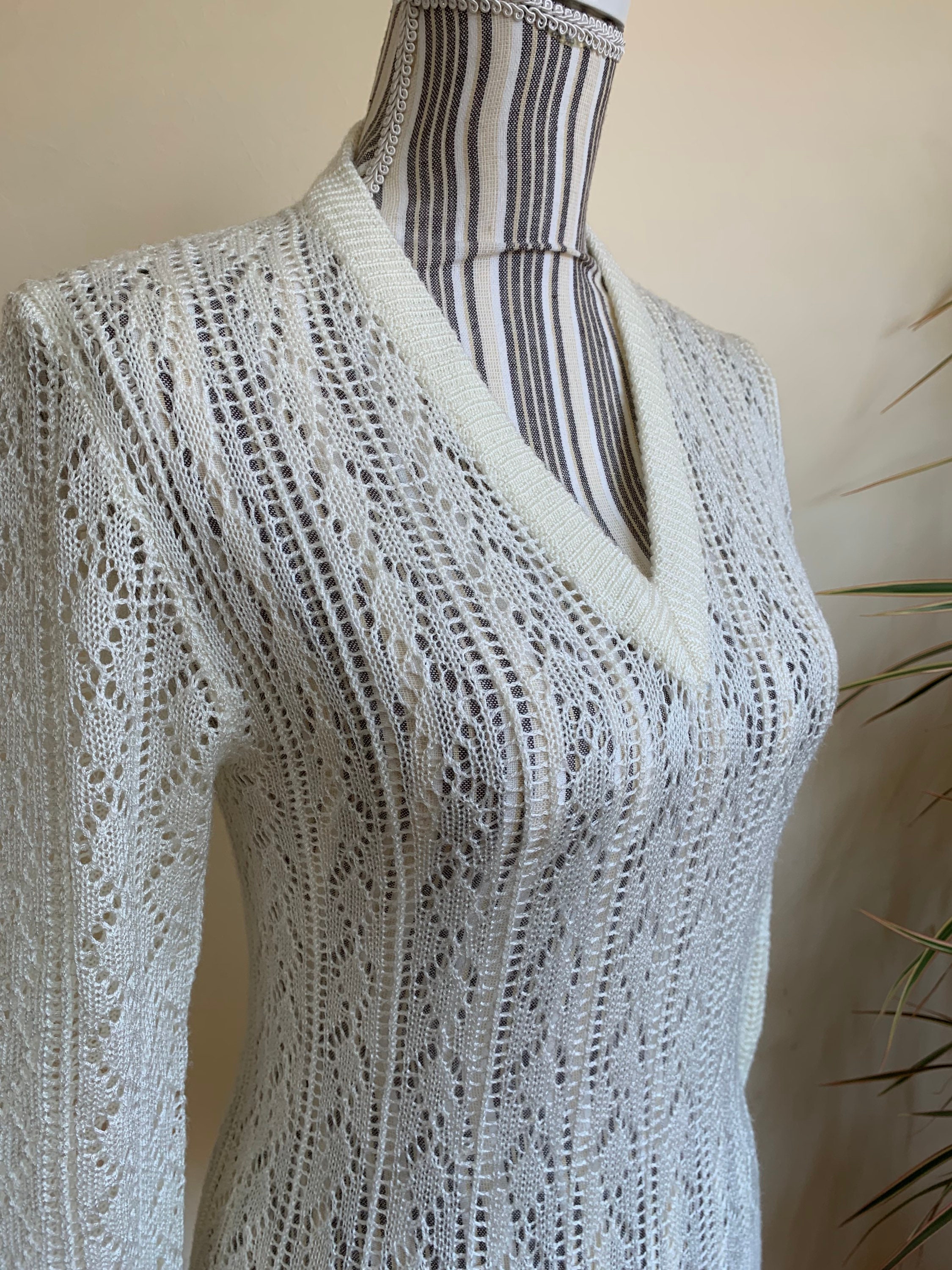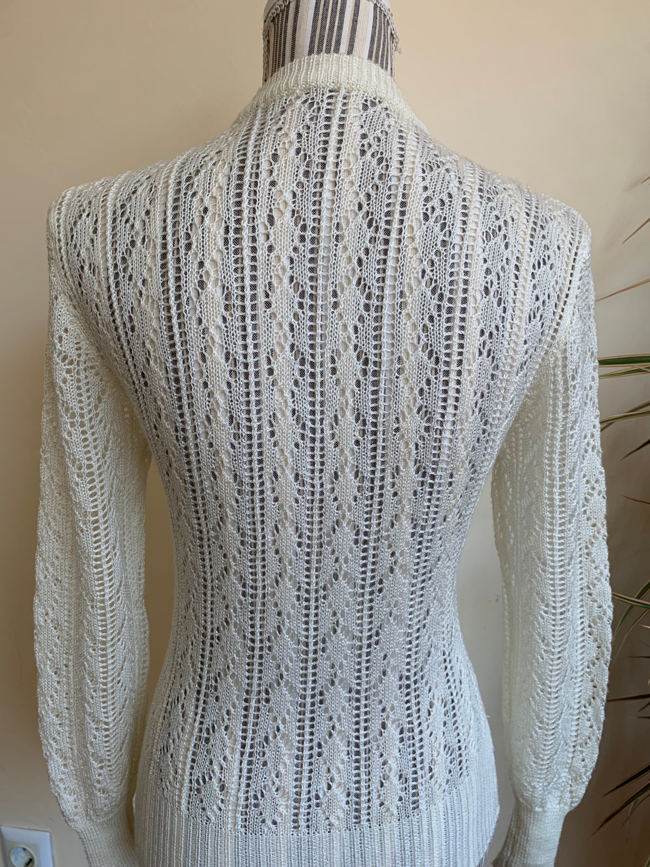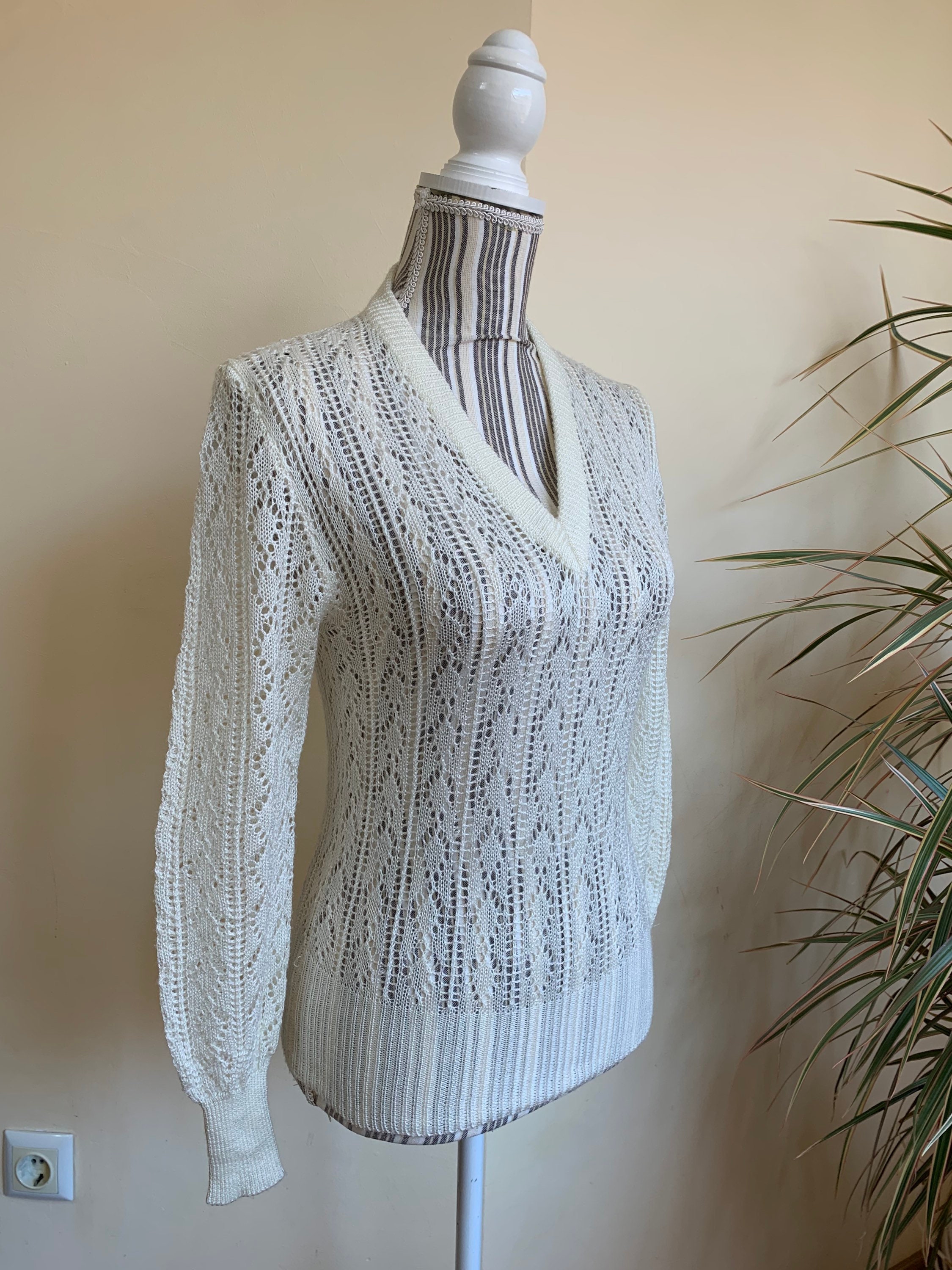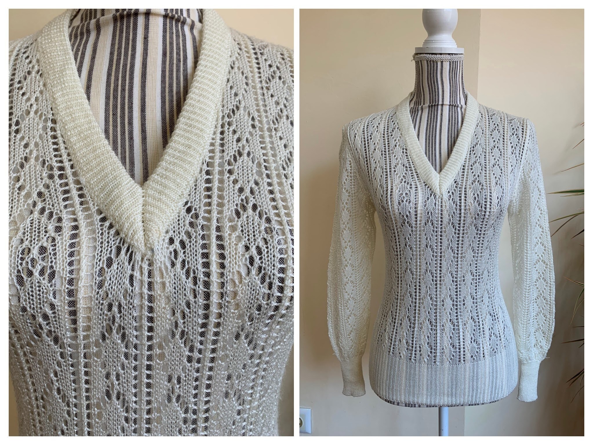 This is a beautiful vintage v neck sweater made of soft yarn in cream beige color. This women pullover sweater is made of fine lightweight yarn, perfect for the spring summer season.This see through sweater is perfect to wear with trousers or skirts, it would make a wonderful office outfit or a romantic date outfit. There are no tags or labels on this machine knit lace sweater. The yarn feels like soft acrylic or could be acrylic/ wool blend. This mesh pullover for women fits like size S or M, it has some stretch, please check the measurements below.