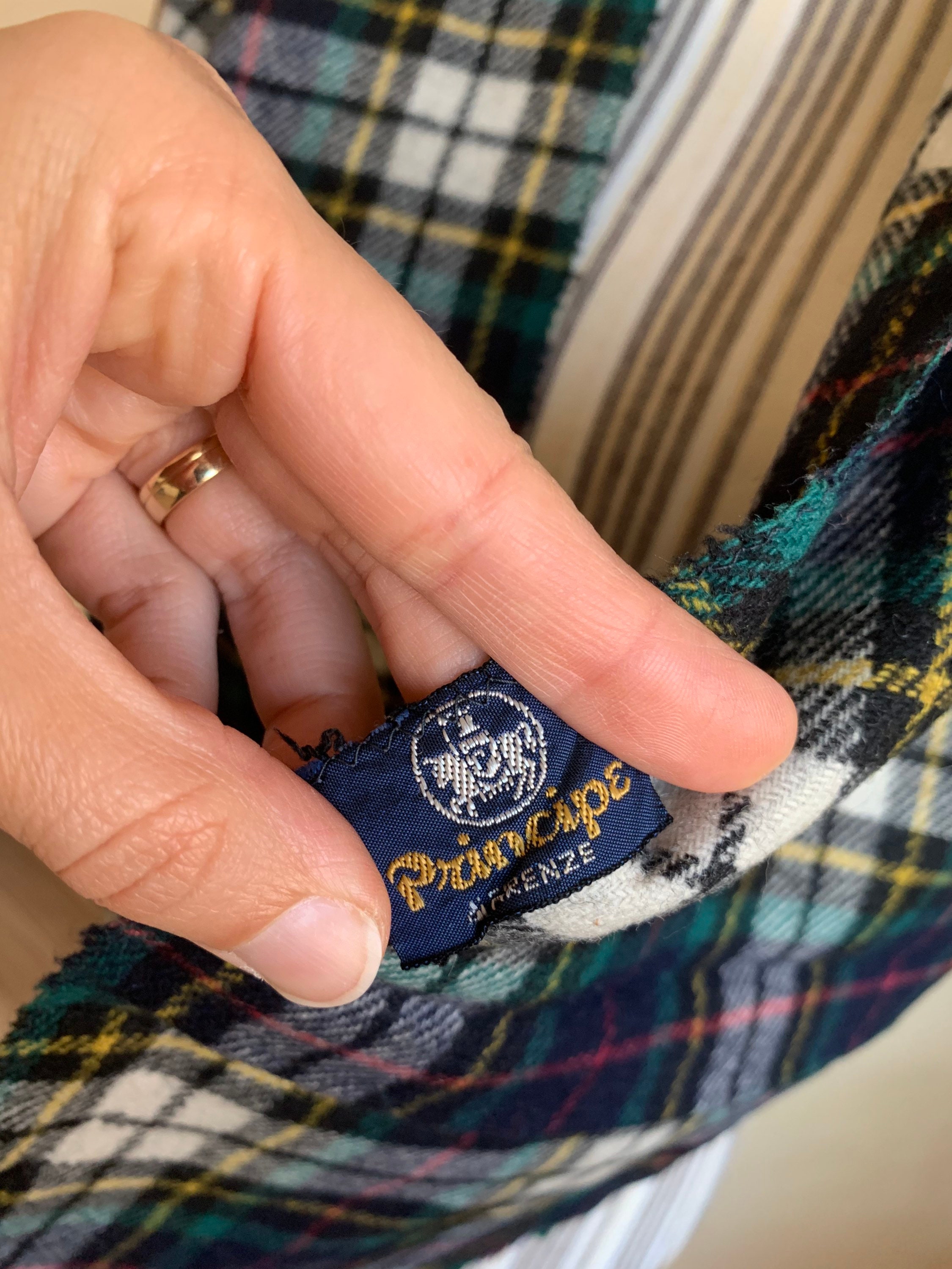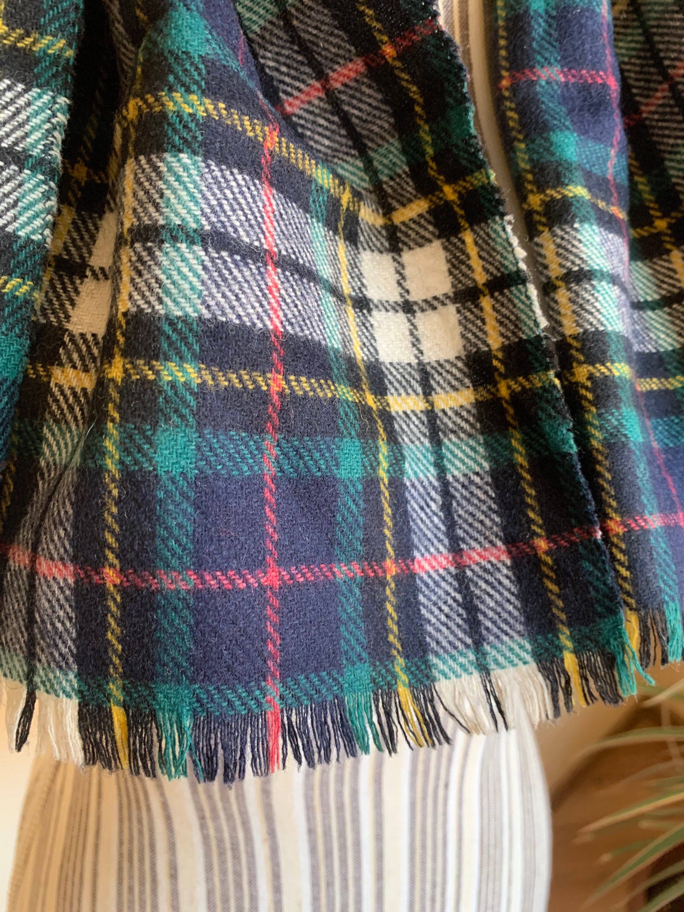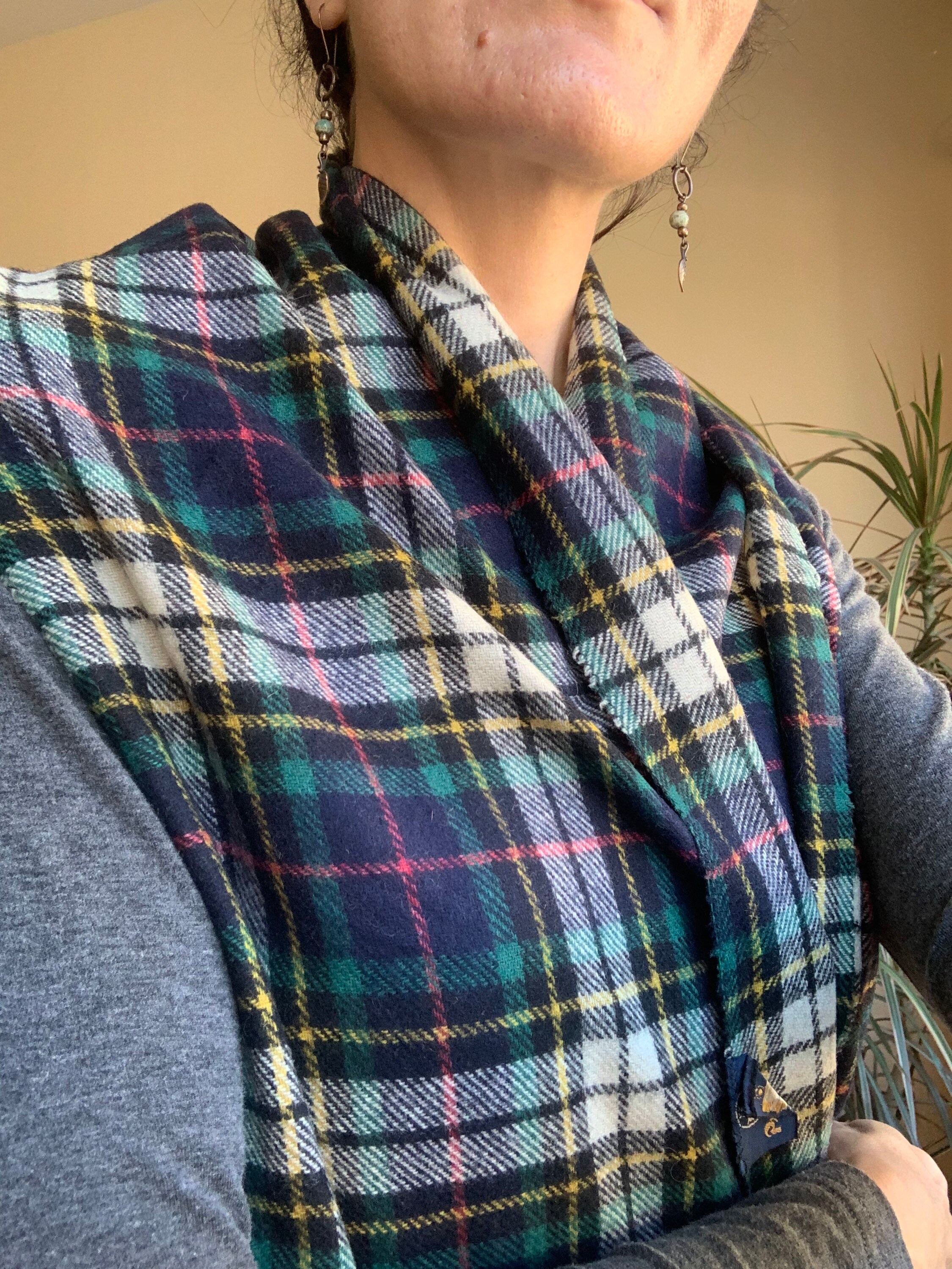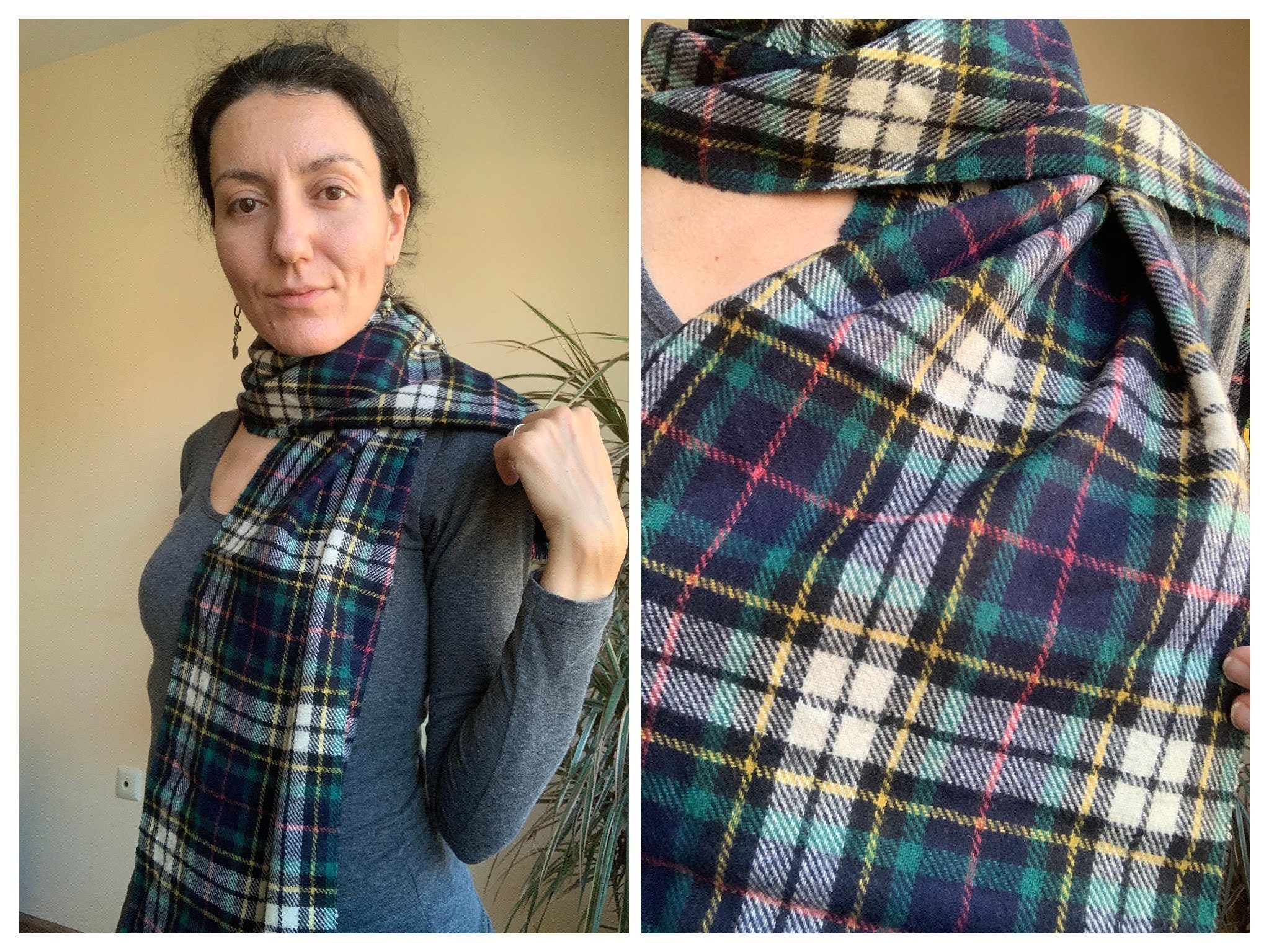 This is a vintage 80s tartan scarf which is perfect for both men and women. With its unisex design, this soft wool scarf will add just the right amount of classic 80s look to your outfit. This checkered pint scarf is made of warm fabric which feels like wool. The material is not listed on the label, but it's most likely made of wool. This is a beautiful sustainable vintage gift, amazing Christmas scarf for you or your wife/husband. This cozy blanket scarf will keep your neck warm in the fall/winter season. This holiday scarf measures 51'2" x 11' (130 cm x 28 cm).