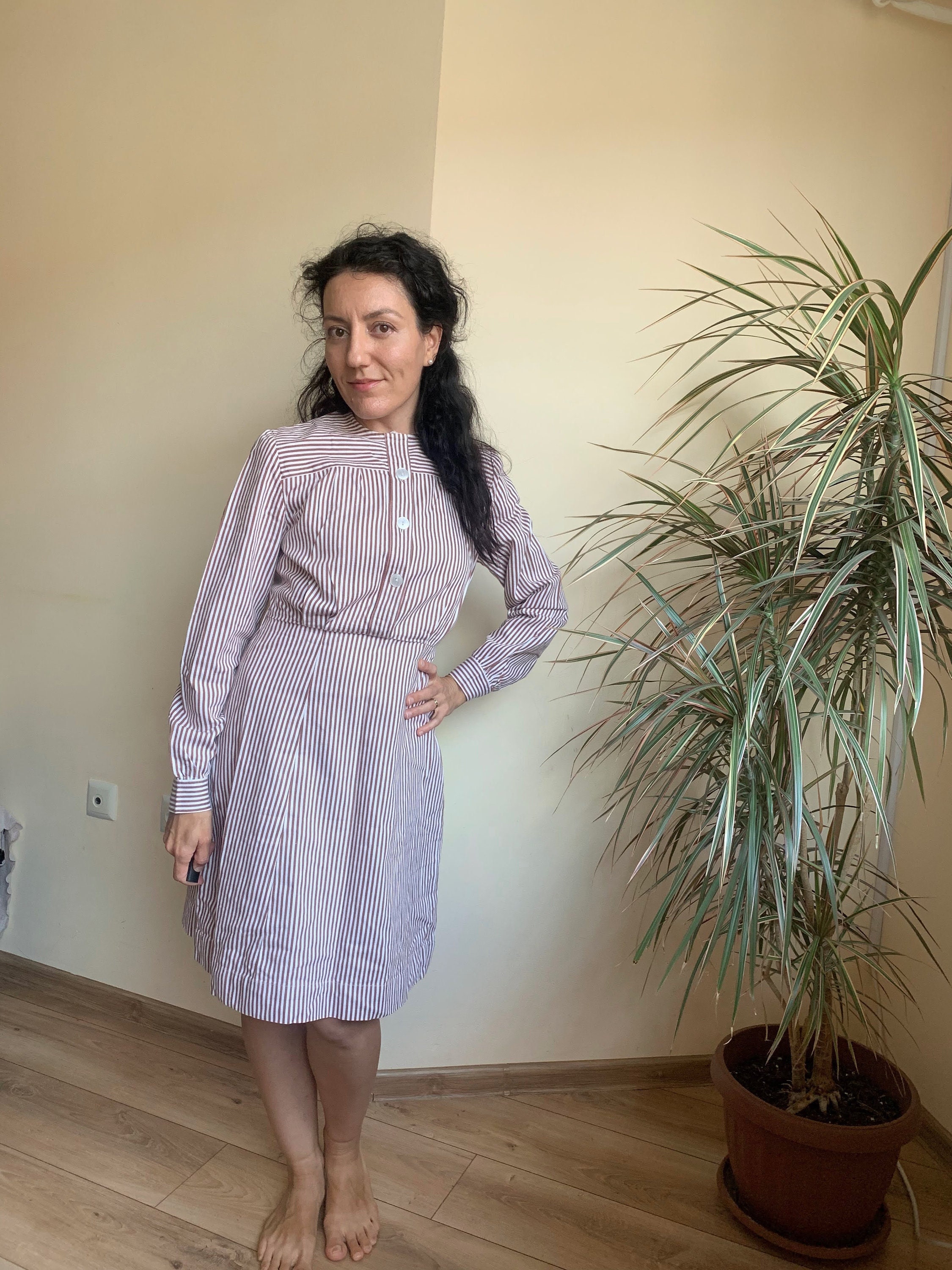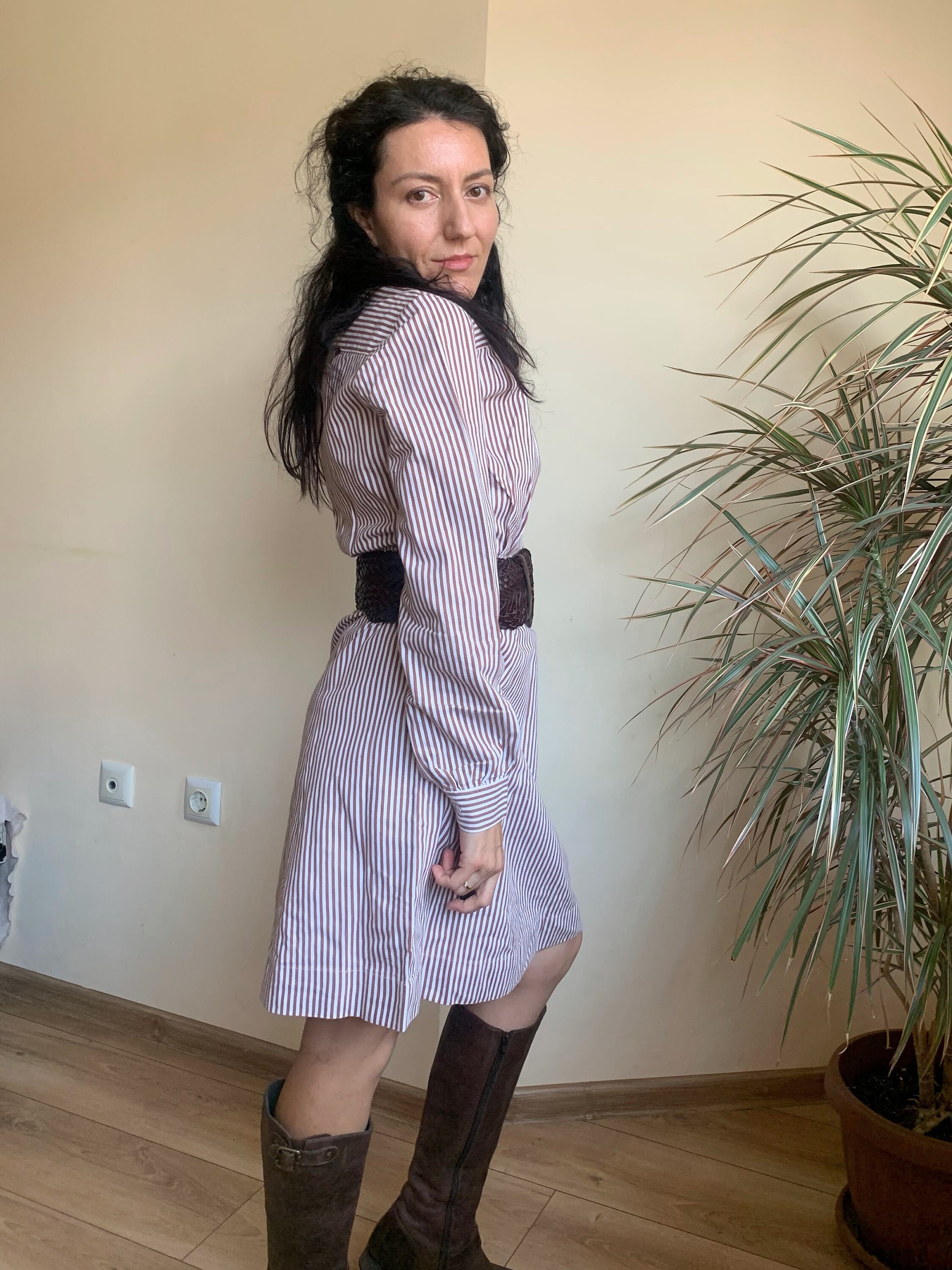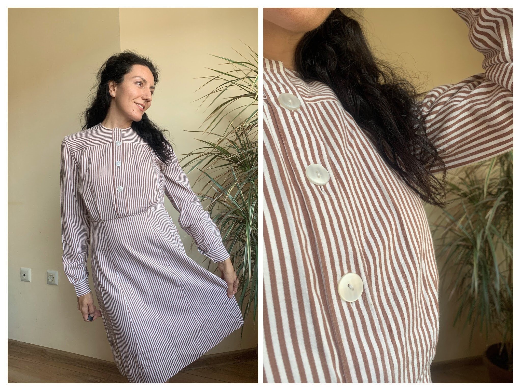 70s handmade, no size marked, missing collar and belt. This is a beautiful 70s crew neck shirt dress with front button closure and side zipper. This fall / winter dress is made of thick cotton fabric in white and brown. This vintage midi dress has no lining underneath. This vintage button up dress has striped pattern. It has a fit and flare shape and high waist. This boho dress has midi length and it falls at about the knees. As this retro modest dress was handmade there is no size marked. There is a button at the neckline and loops for belt. It could be the case that there was a collar/ belt with this shirt dress, however they were missing when I got this dress. It fits like size small. I am modelling this striped dress and I wear size S, EUR 36, US 6, UK 10. I am 5'3" (160 cm) tall please check the measurements below.