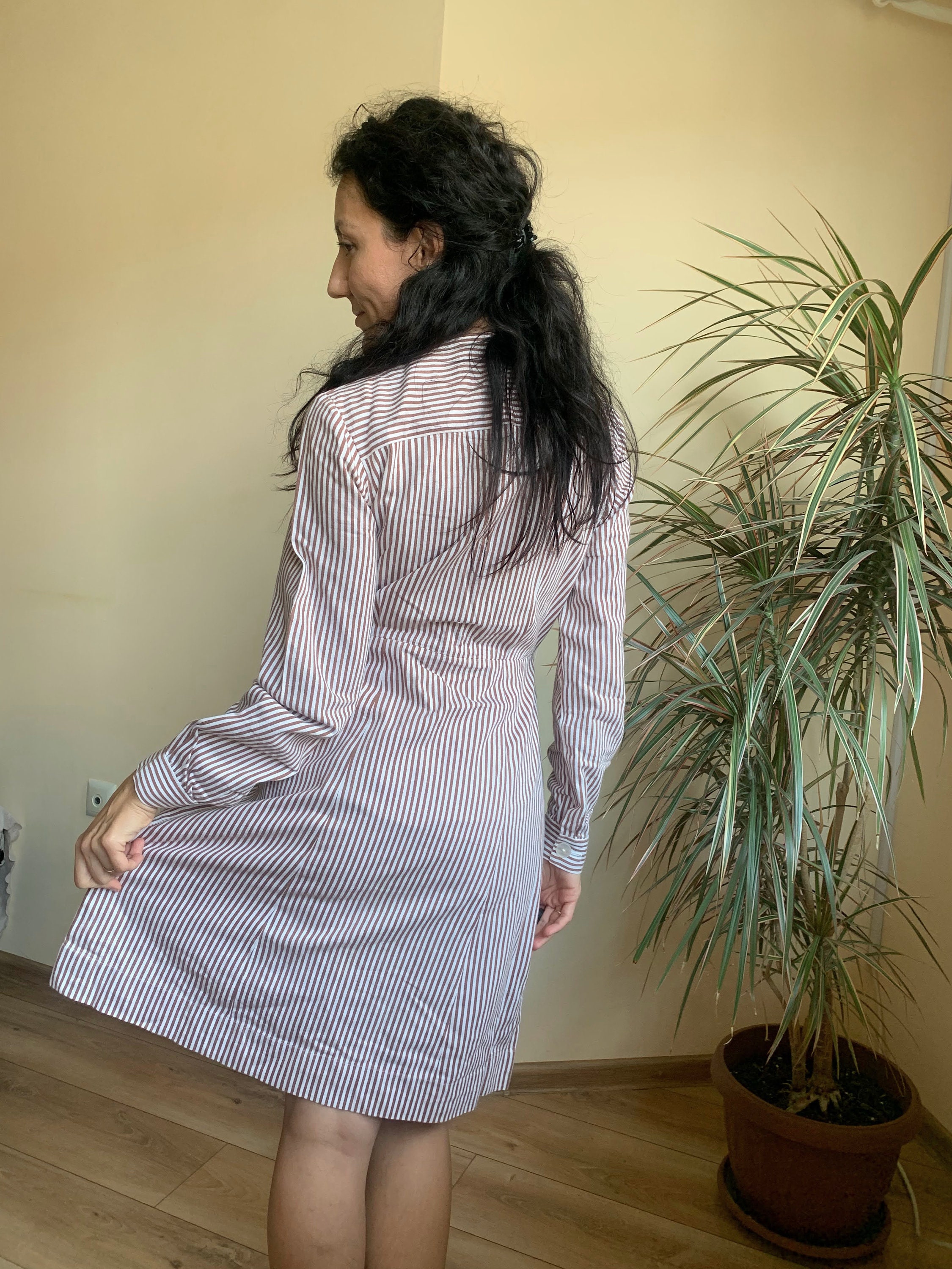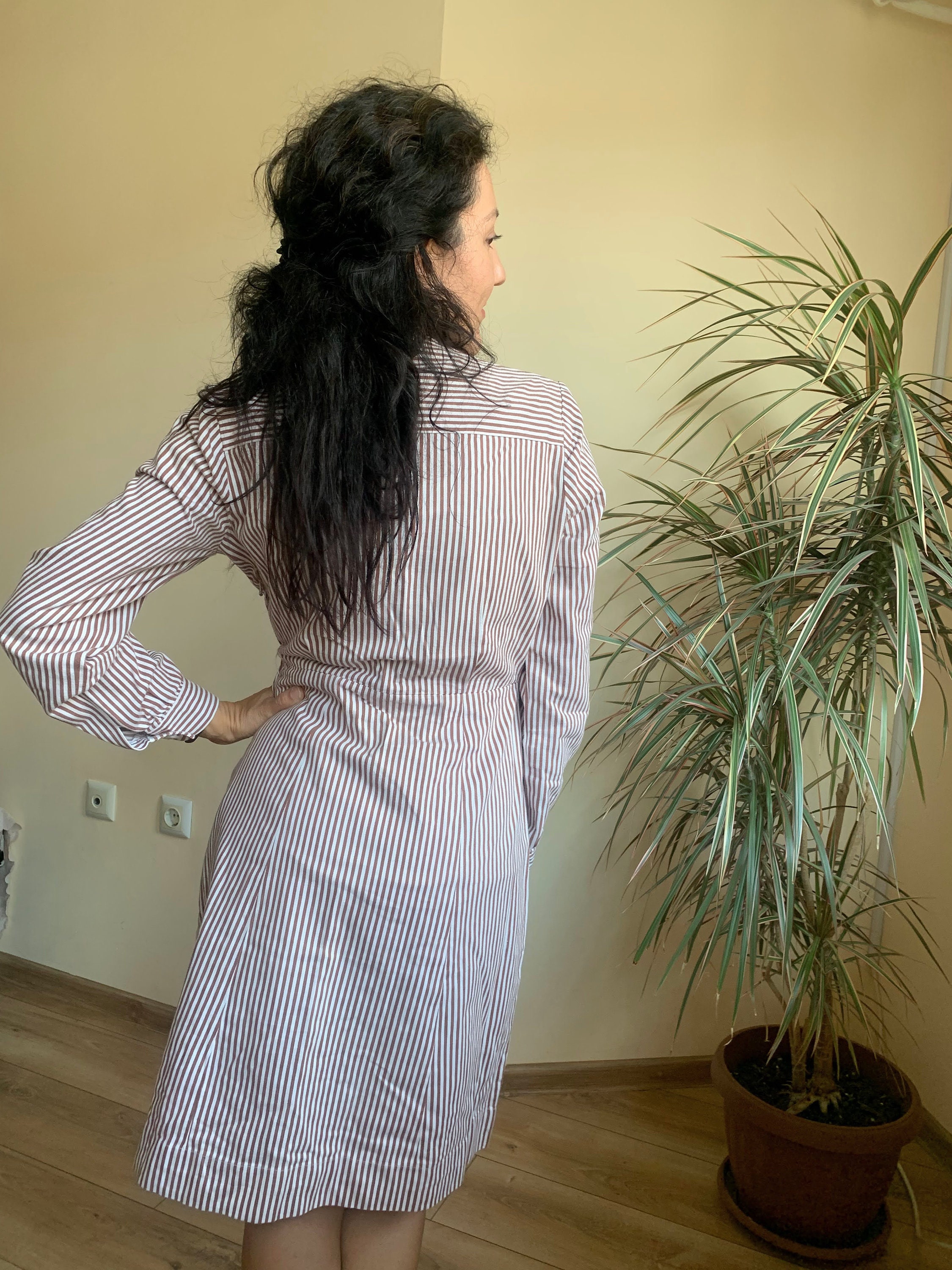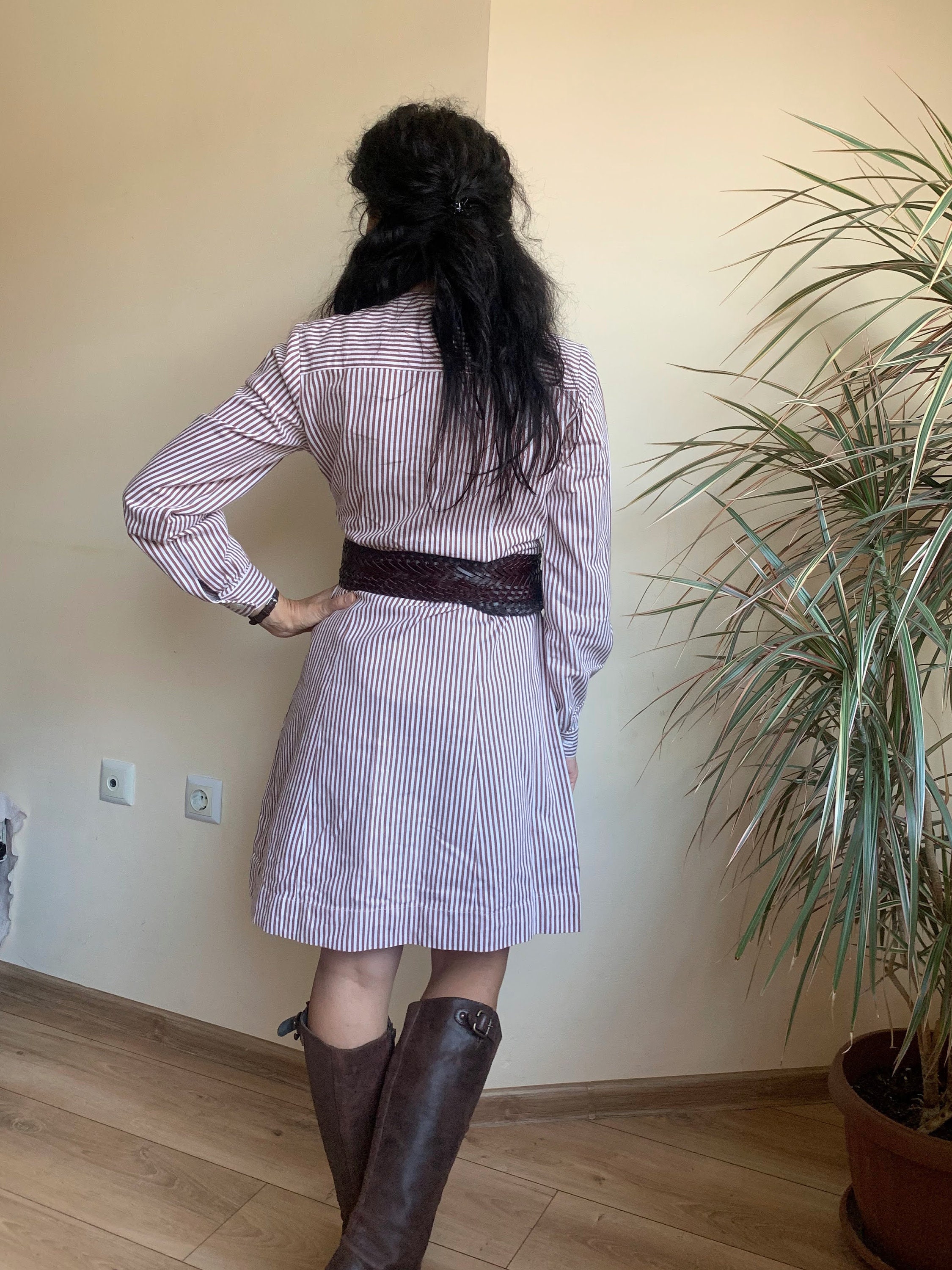 70s handmade, no size marked, missing collar and belt. This is a beautiful 70s crew neck shirt dress with front button closure and side zipper. This fall / winter dress is made of thick cotton fabric in white and brown. This vintage midi dress has no lining underneath. This vintage button up dress has striped pattern. It has a fit and flare shape and high waist. This boho dress has midi length and it falls at about the knees. As this retro modest dress was handmade there is no size marked. There is a button at the neckline and loops for belt. It could be the case that there was a collar/ belt with this shirt dress, however they were missing when I got this dress. It fits like size small. I am modelling this striped dress and I wear size S, EUR 36, US 6, UK 10. I am 5'3" (160 cm) tall please check the measurements below.