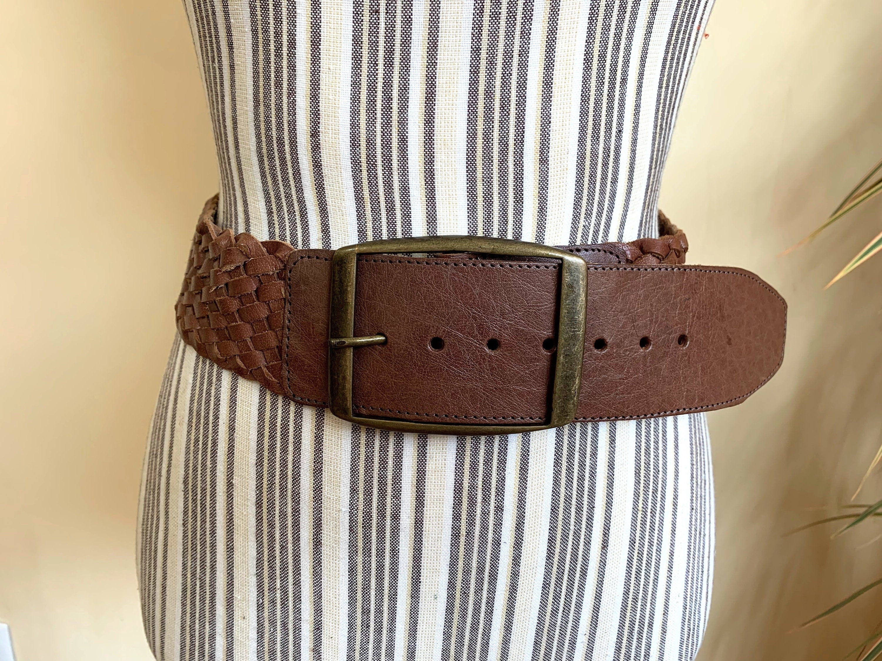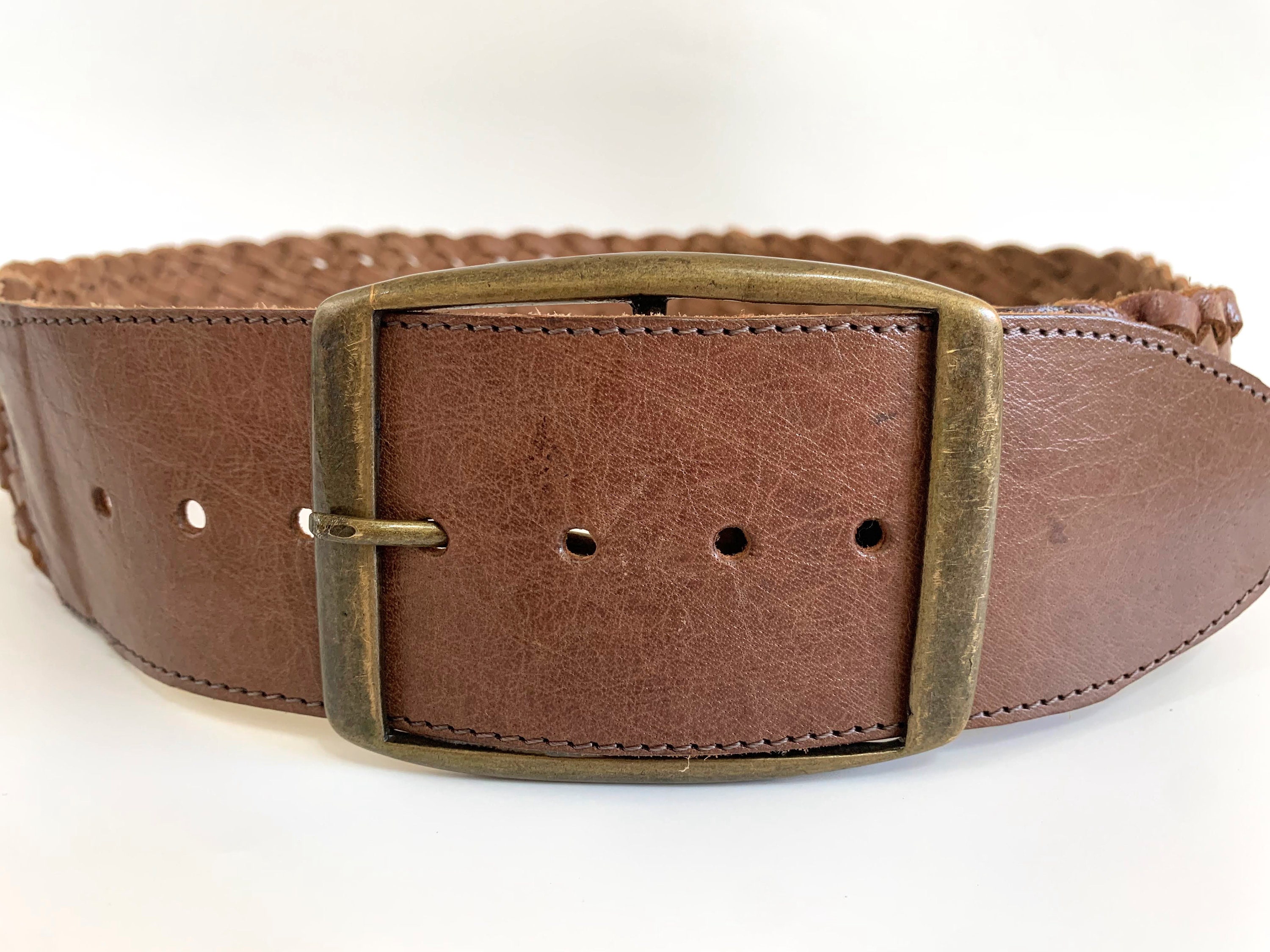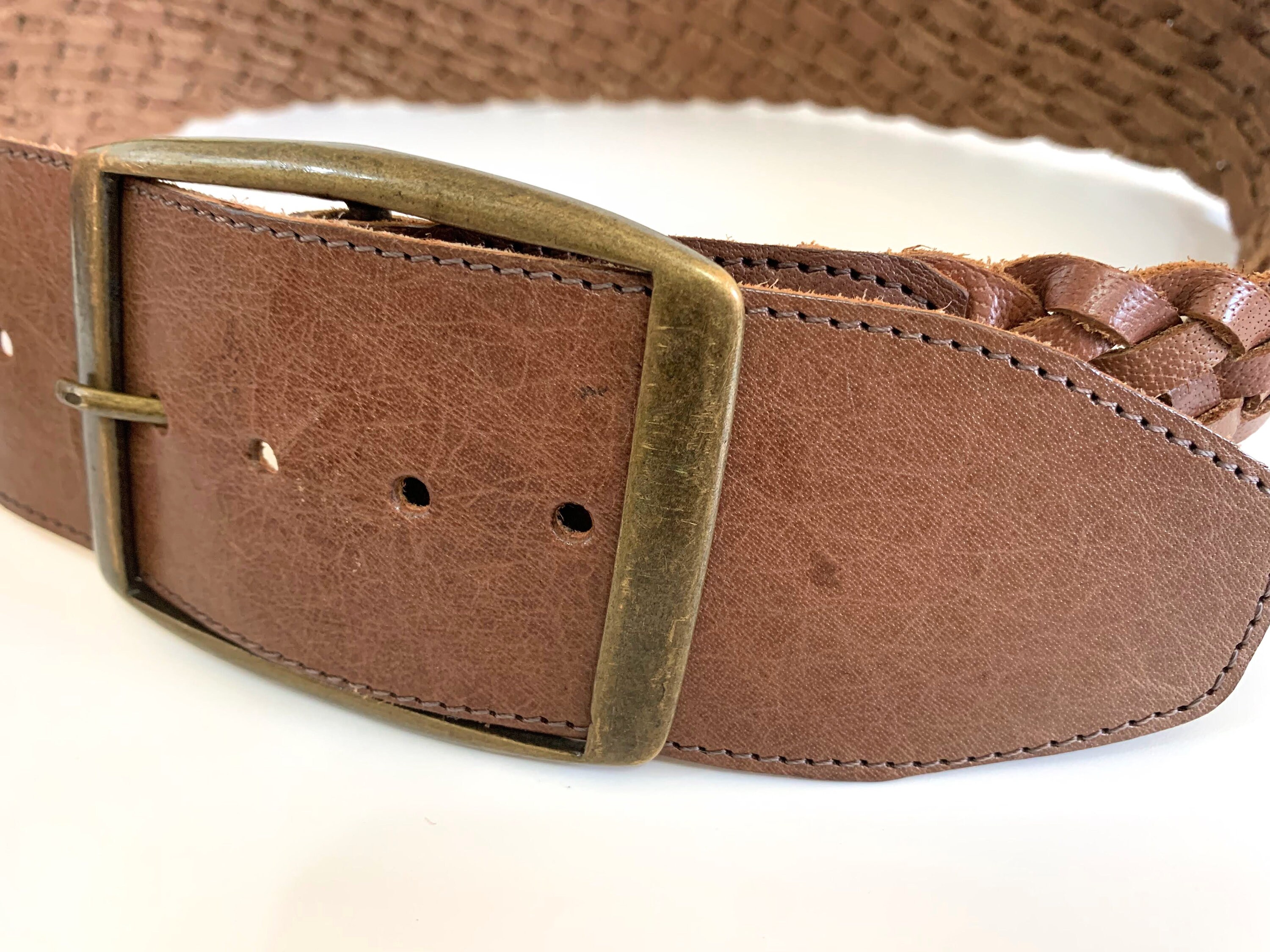 This is a vintage woven leather belt for women in tan brown color with large slim brass buckle. It is made of real leather in nude brown color and solid brass buckle. This bohemian belt is by the brand Friis Company. This wide hip or waist belt is size M. This festival belt can adjust up to approximately 41.3" / 105 cm and it is 2.4" / 6 cm wide.