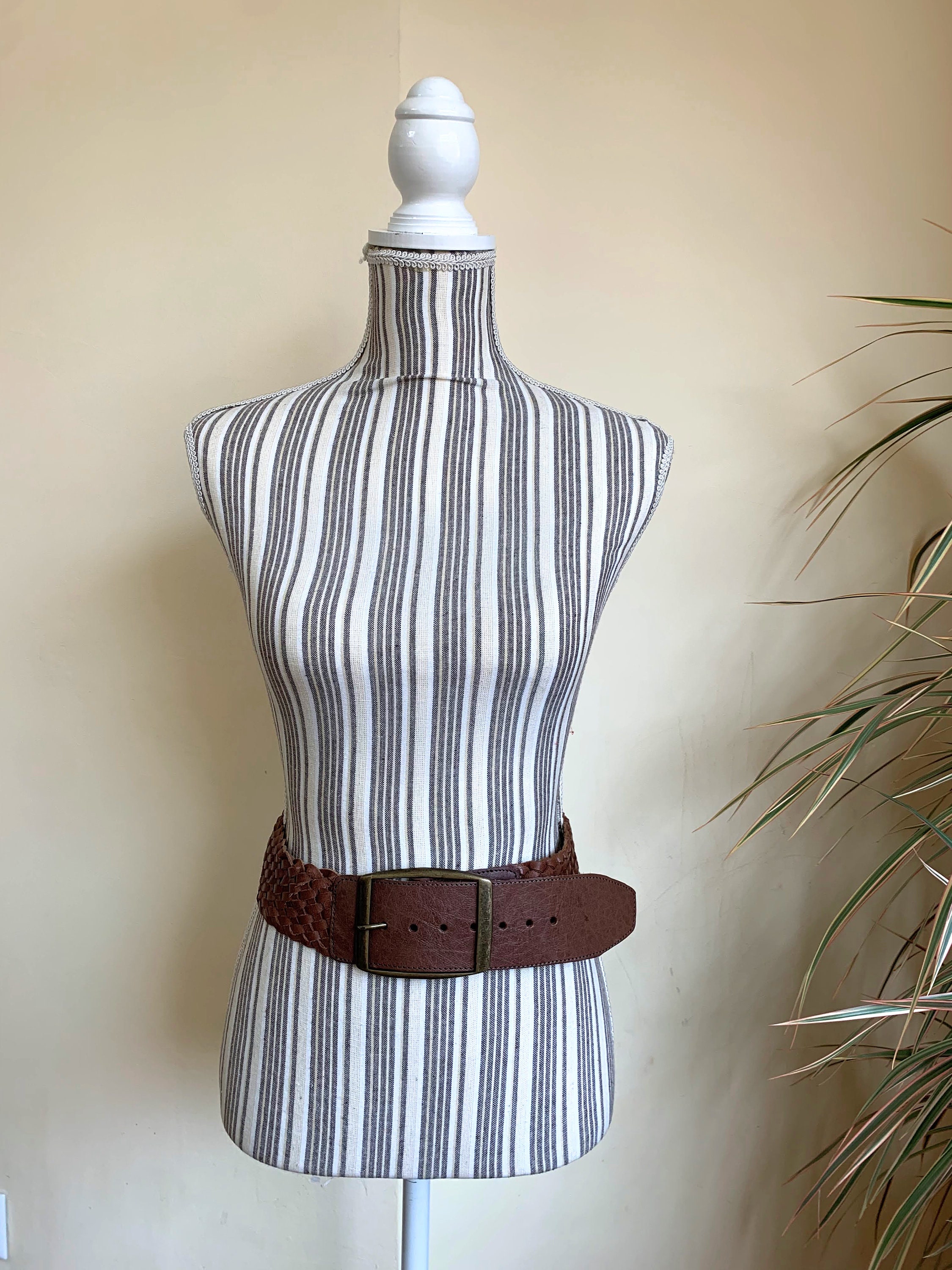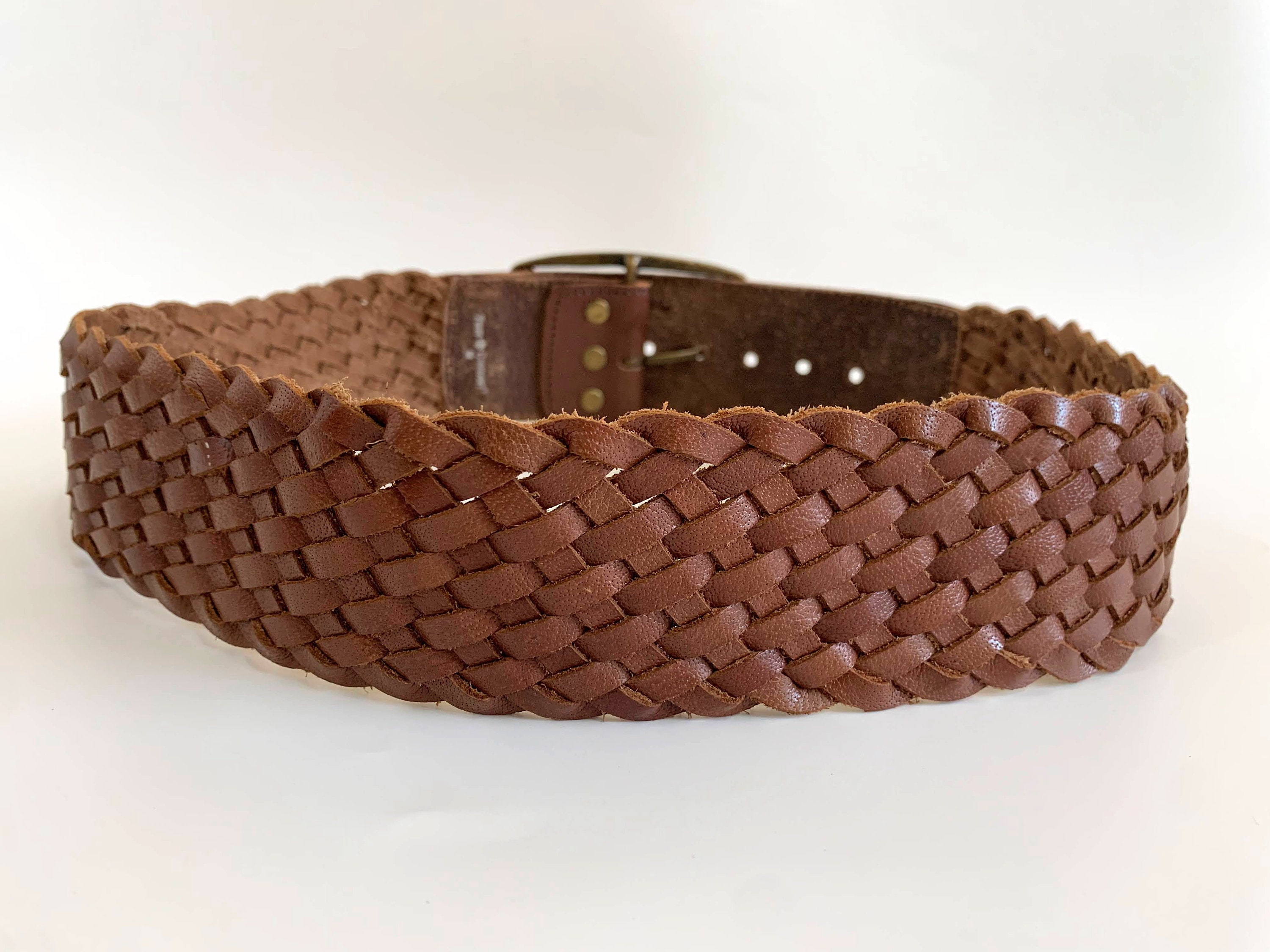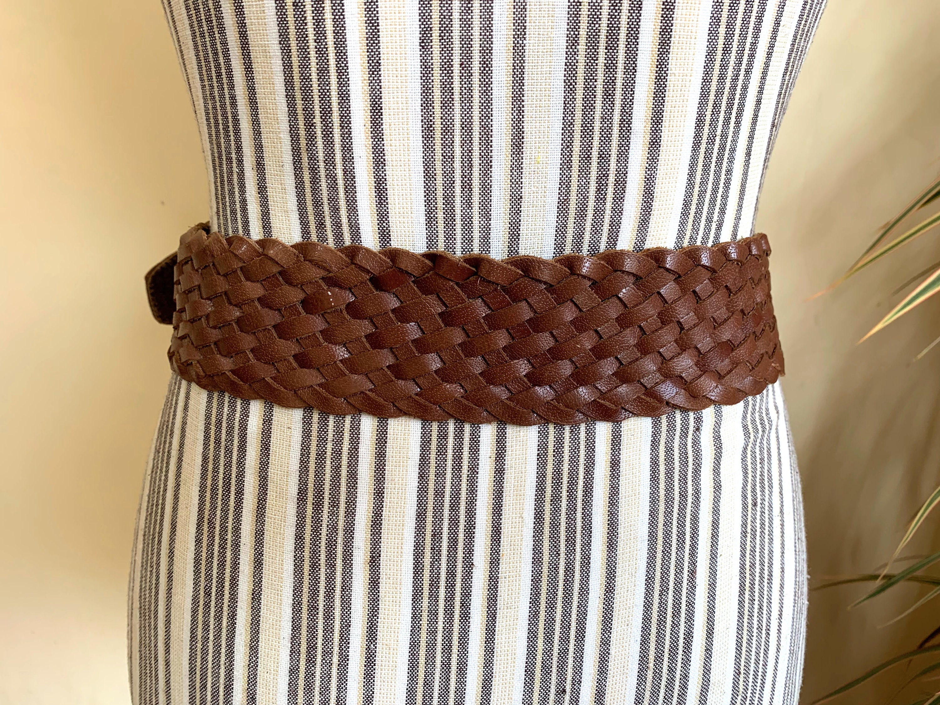 This is a vintage woven leather belt for women in tan brown color with large slim brass buckle. It is made of real leather in nude brown color and solid brass buckle. This bohemian belt is by the brand Friis Company. This wide hip or waist belt is size M. This festival belt can adjust up to approximately 41.3" / 105 cm and it is 2.4" / 6 cm wide.