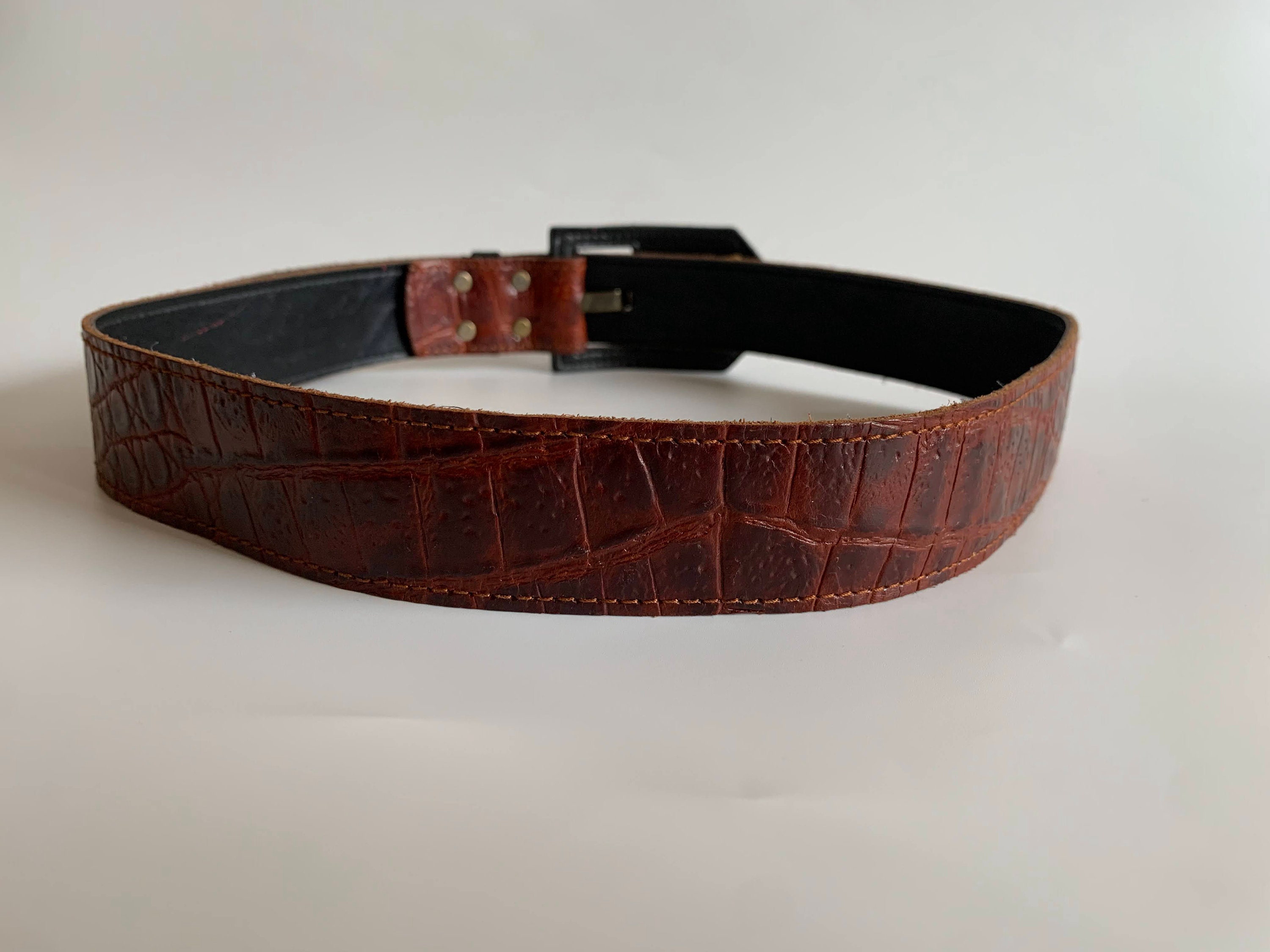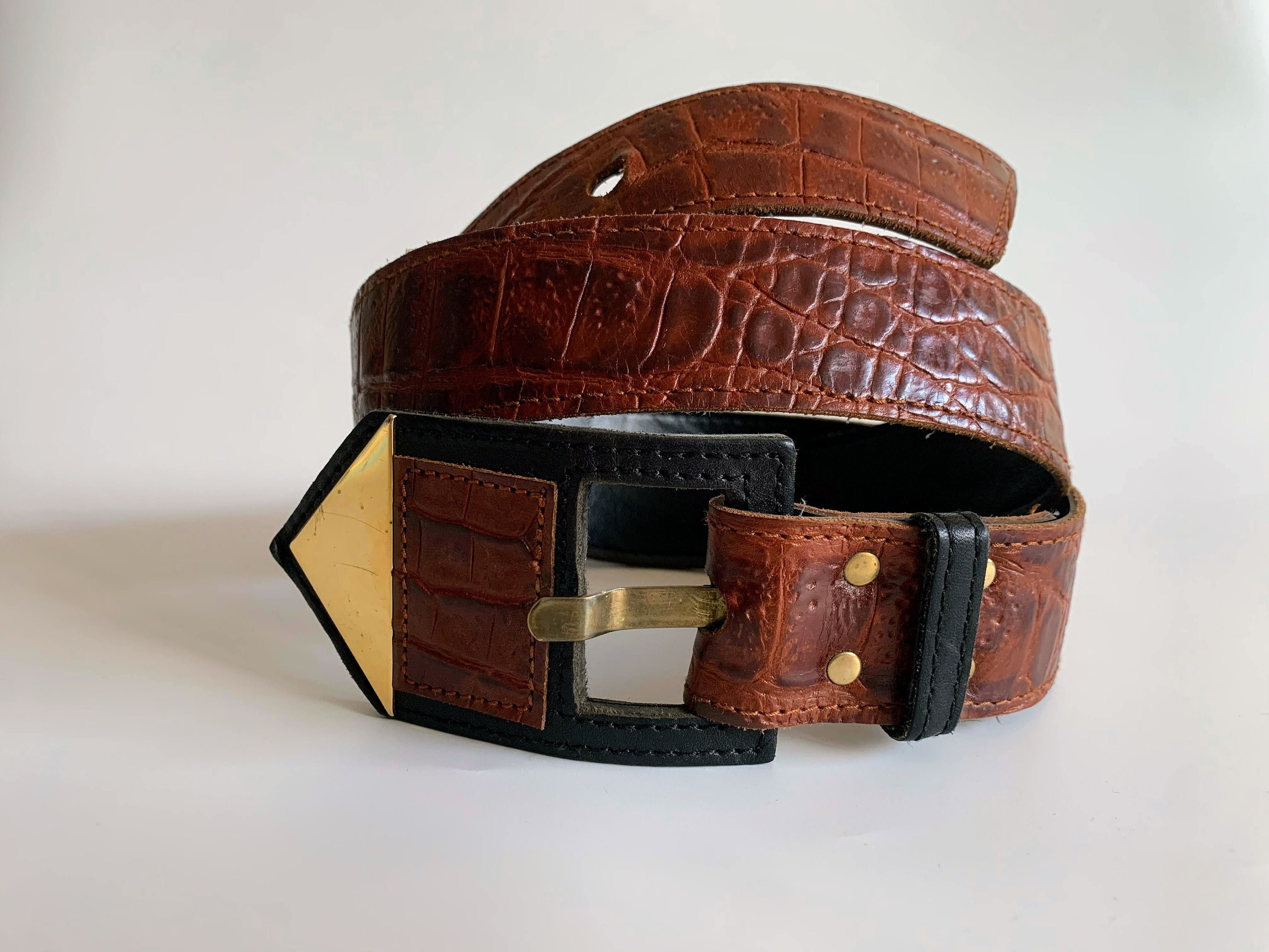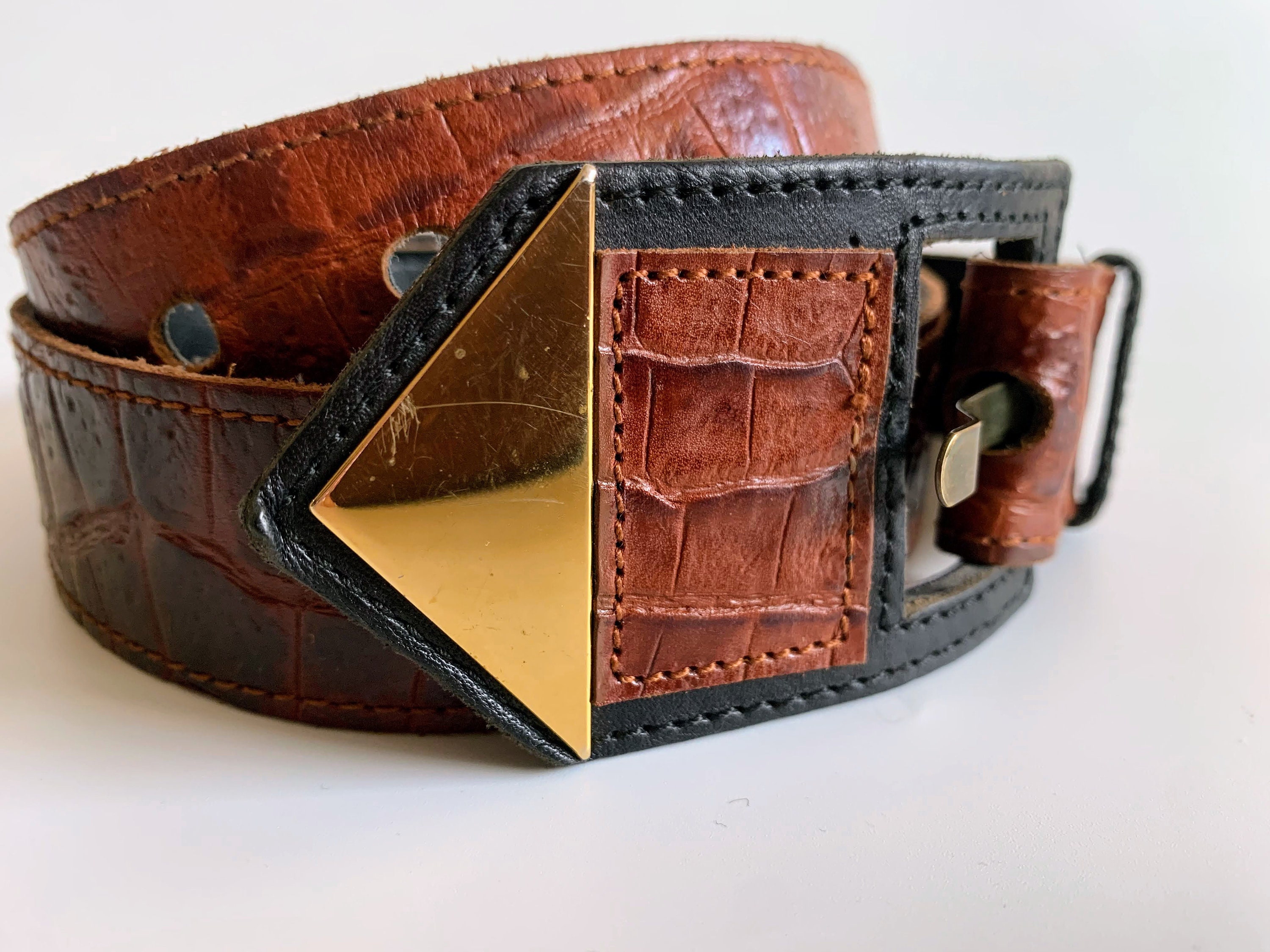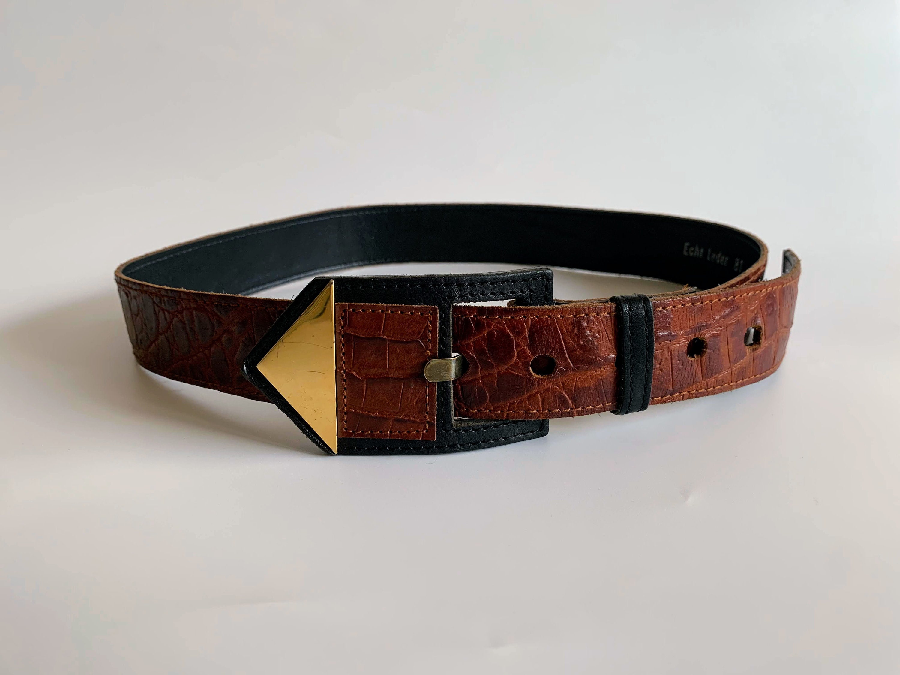 This is a vintage 80s brown leather waist belt for women with gold tone statement buckle. This retro waist belt is made of genuine leather with mock croc design. The real leather has a reptile embossed texture. This wide waist belt can adjust from 29.1" - 33.1" / 74 cm to 84 cm /. It is 1.4" / 3.5 cm wide. This art buckle belt was made in Germany. The size marked is 81 cm (31.9"). Ideal statement belt when you want to get all eyes on you.