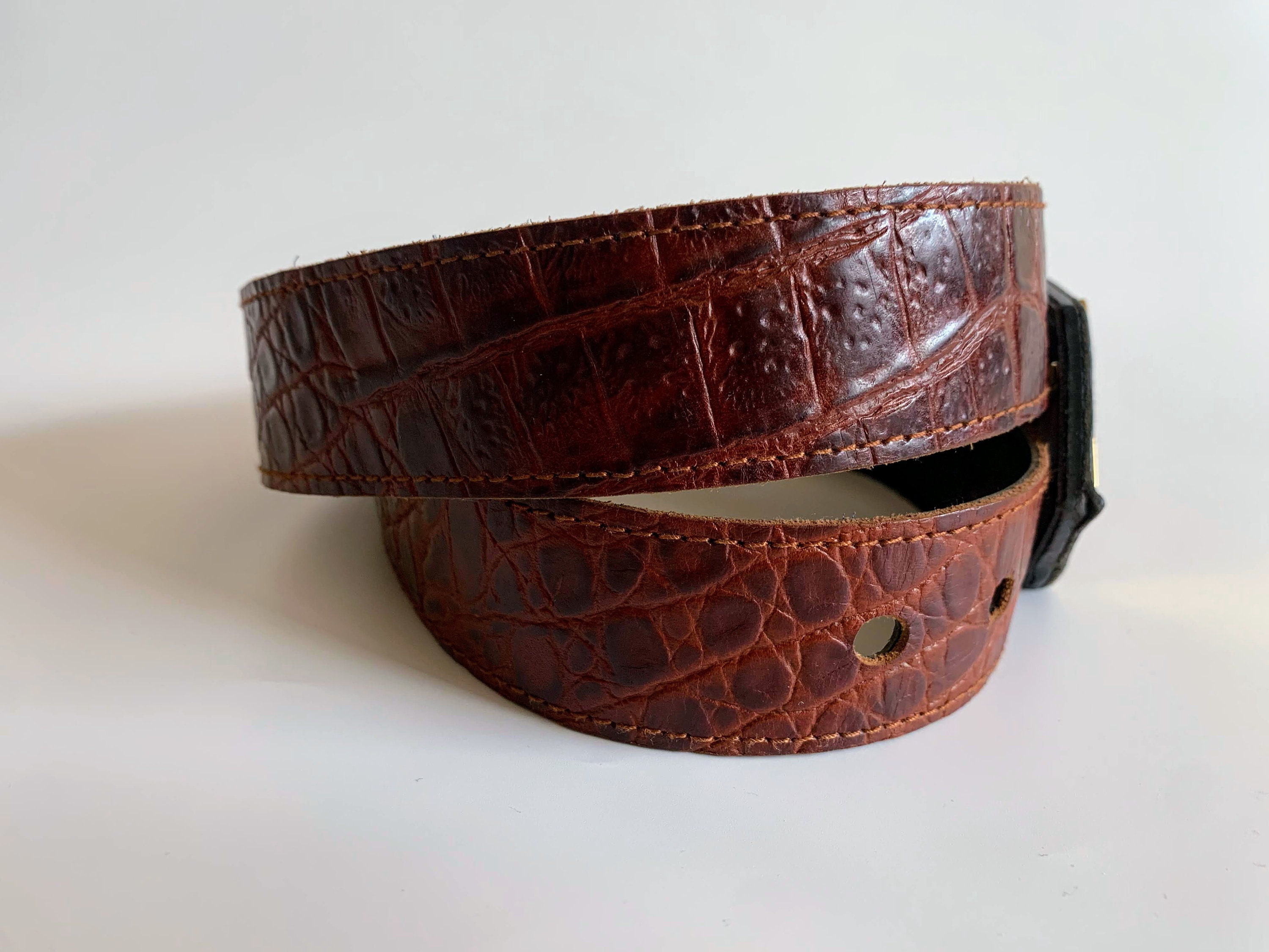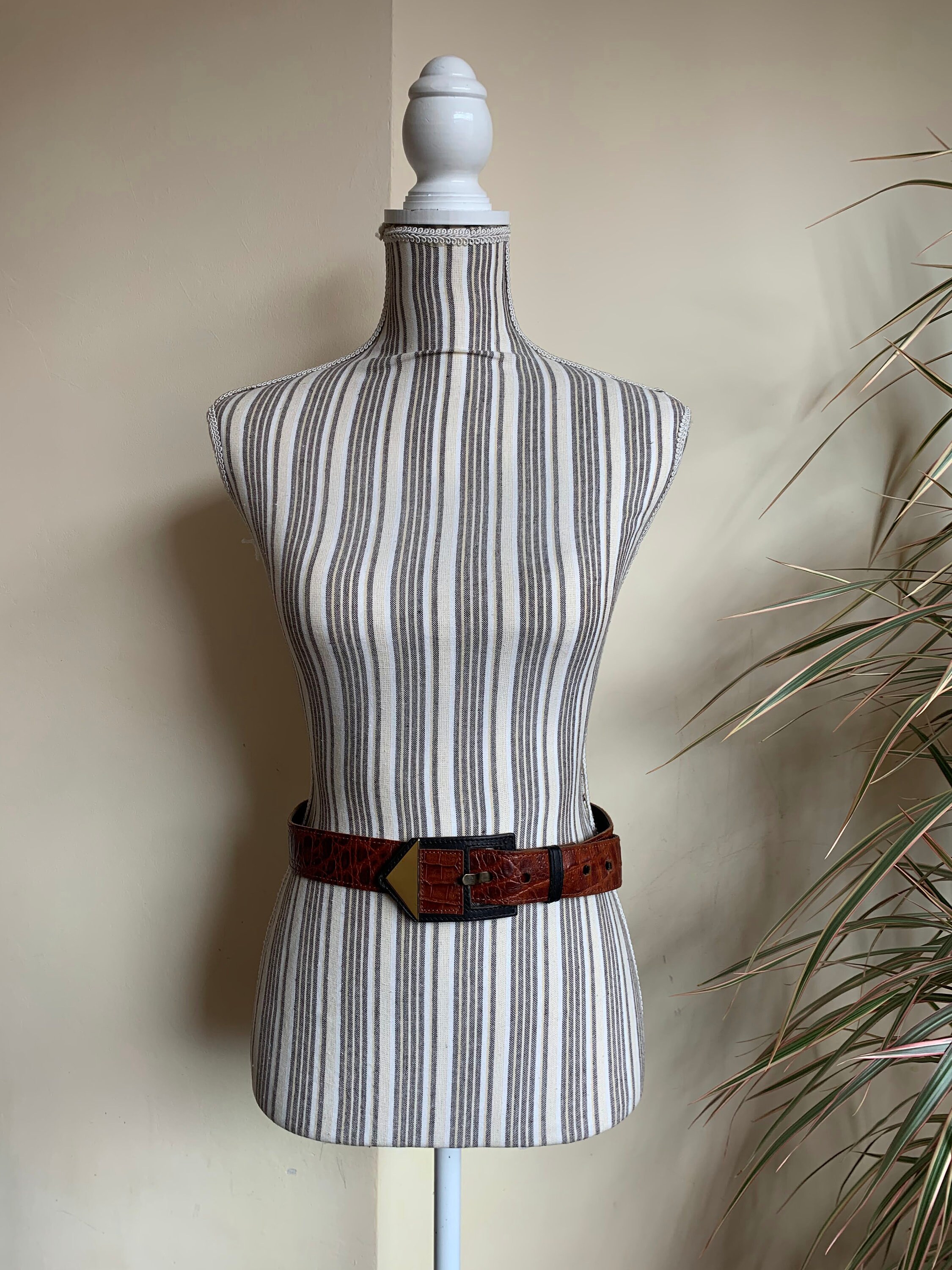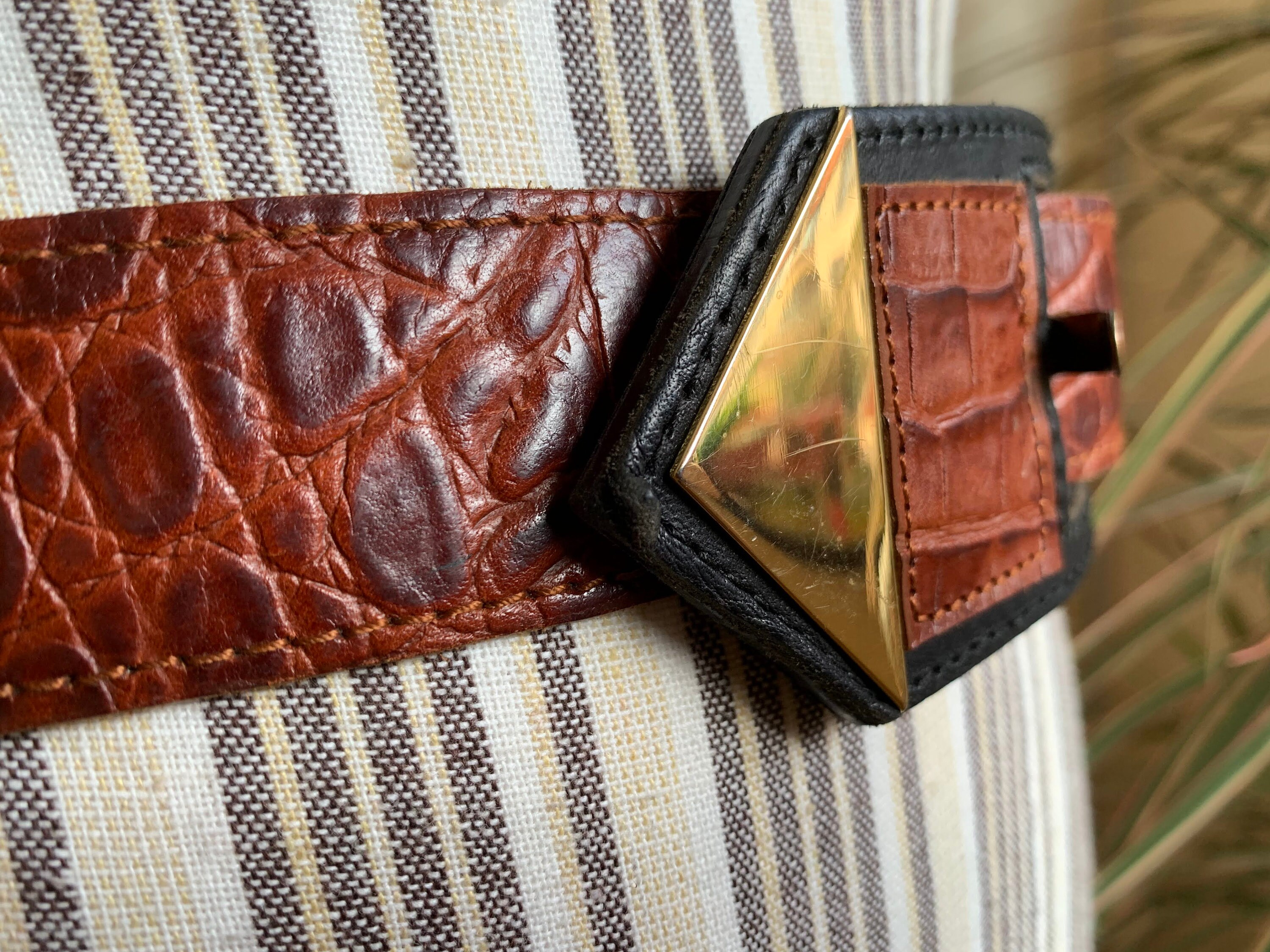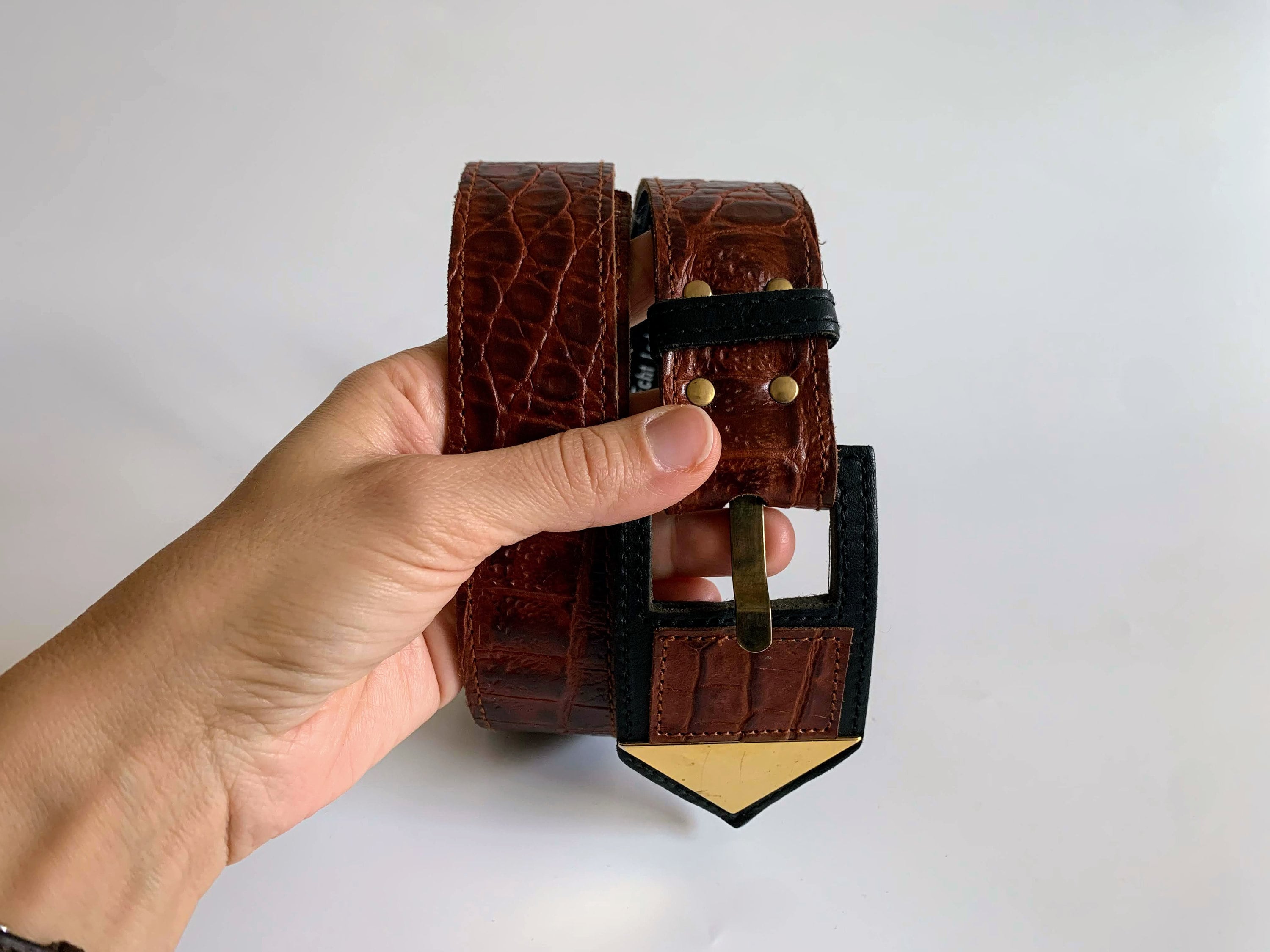 This is a vintage 80s brown leather waist belt for women with gold tone statement buckle. This retro waist belt is made of genuine leather with mock croc design. The real leather has a reptile embossed texture. This wide waist belt can adjust from 29.1" - 33.1" / 74 cm to 84 cm /. It is 1.4" / 3.5 cm wide. This art buckle belt was made in Germany. The size marked is 81 cm (31.9"). Ideal statement belt when you want to get all eyes on you.