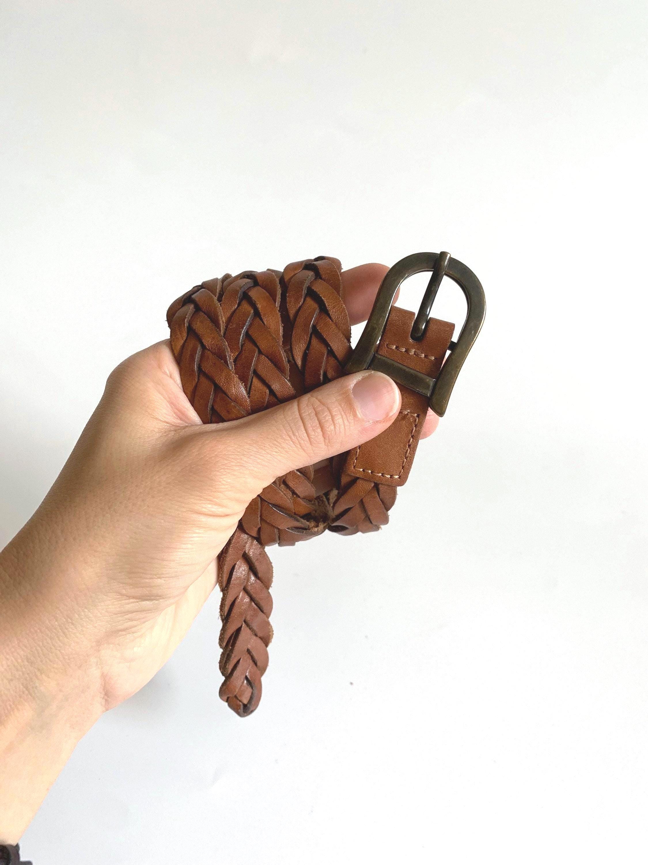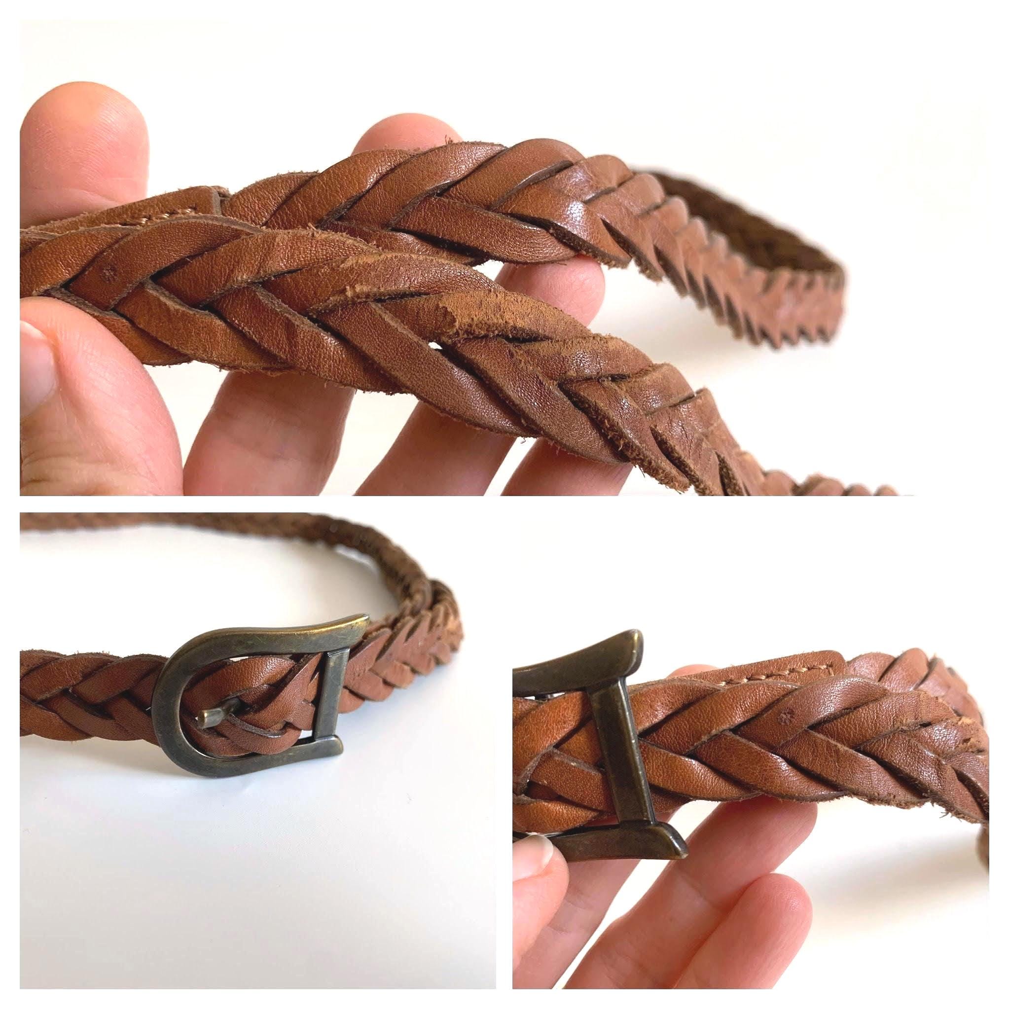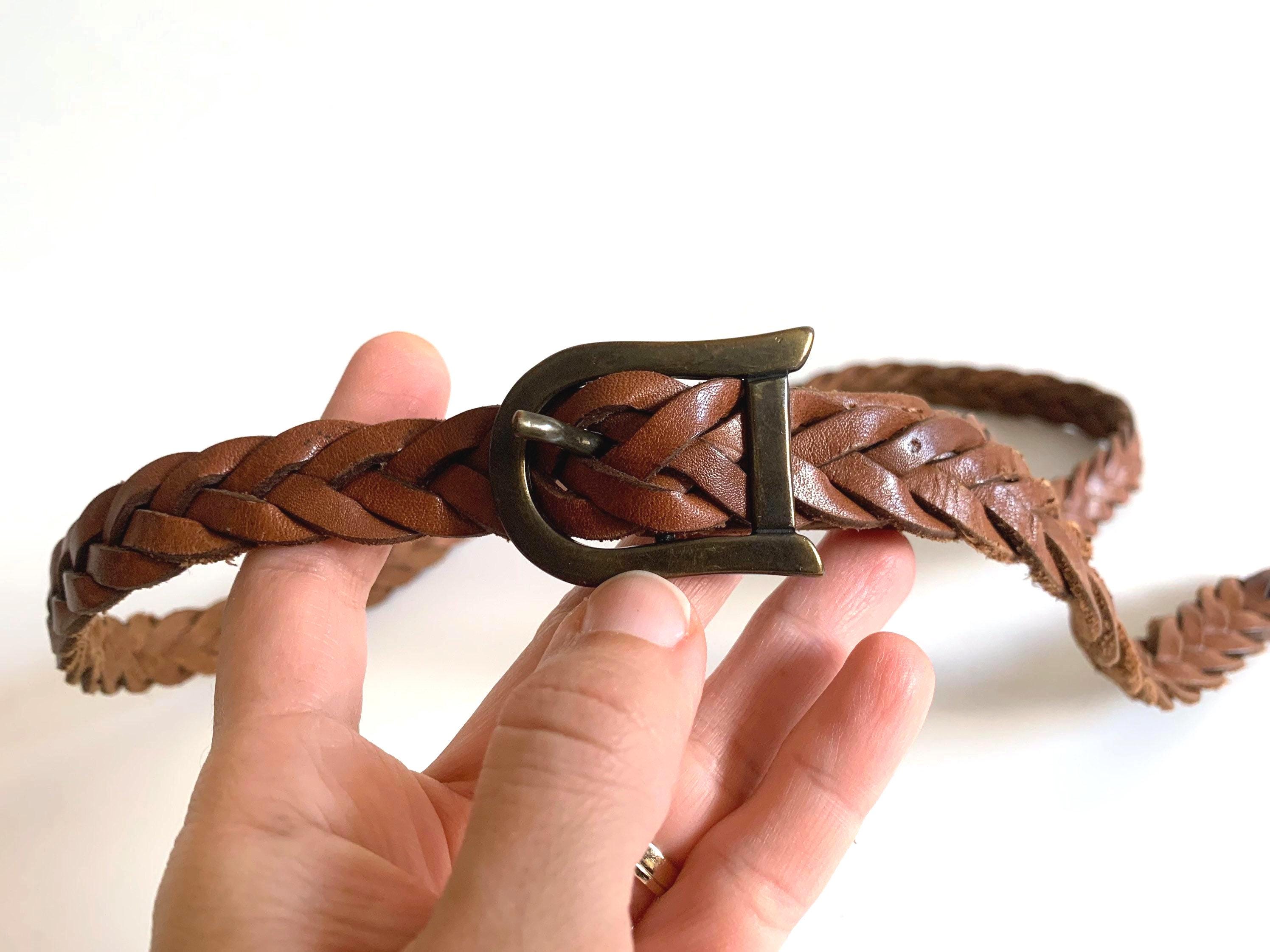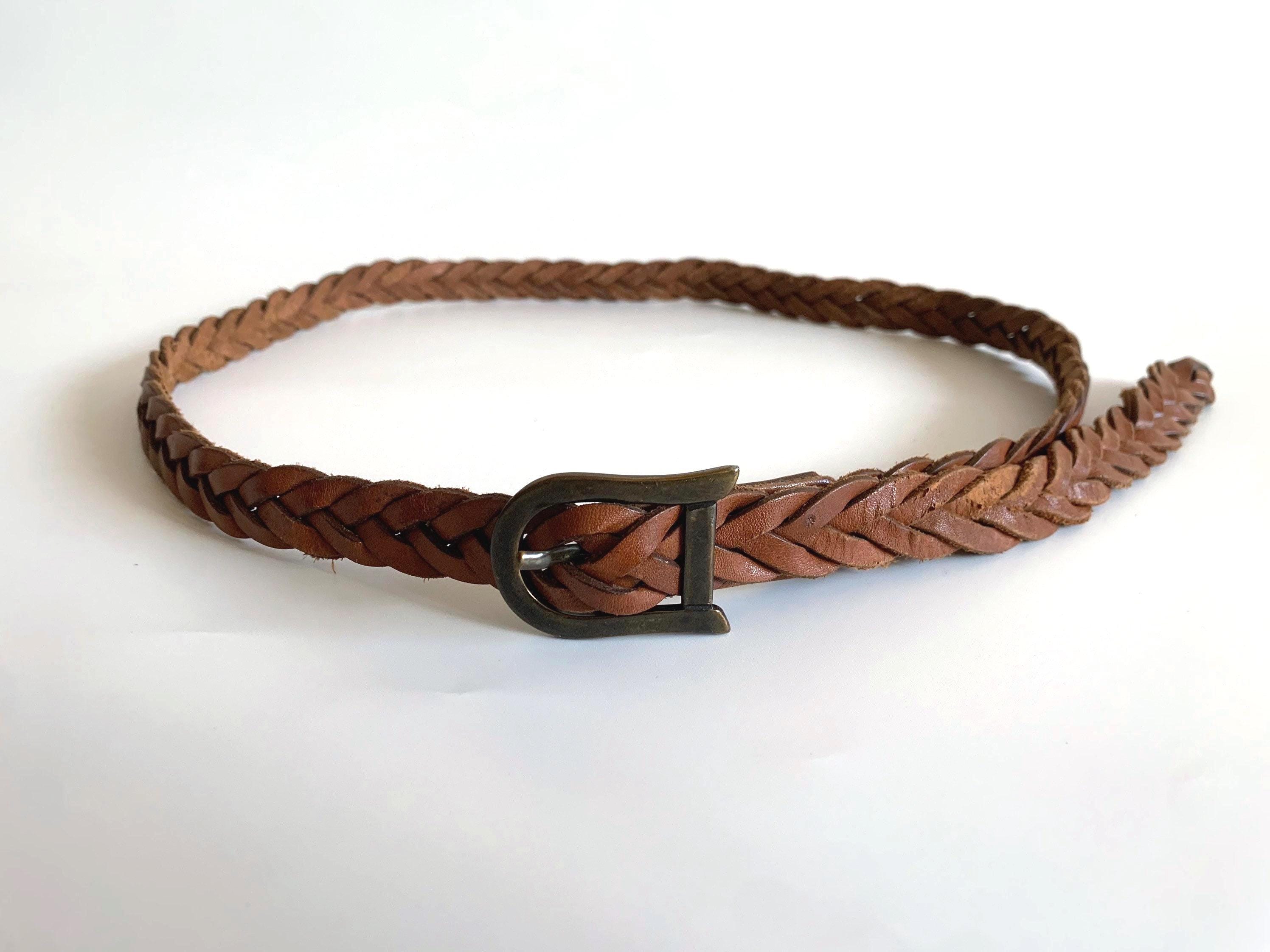 This is a vintage 90s braided skinny leather belt in tan brown color. This slim boho is made of genuine leather which has a distressed look due to the wear. This slim waist belt has a brass tone buckle. This narrow leather belt can adjust to approx 35.4" / 90 cm. The total length of the belt strap is 40.6" / 103 cm. This festival belt is just 0.8" / 2 cm wide.