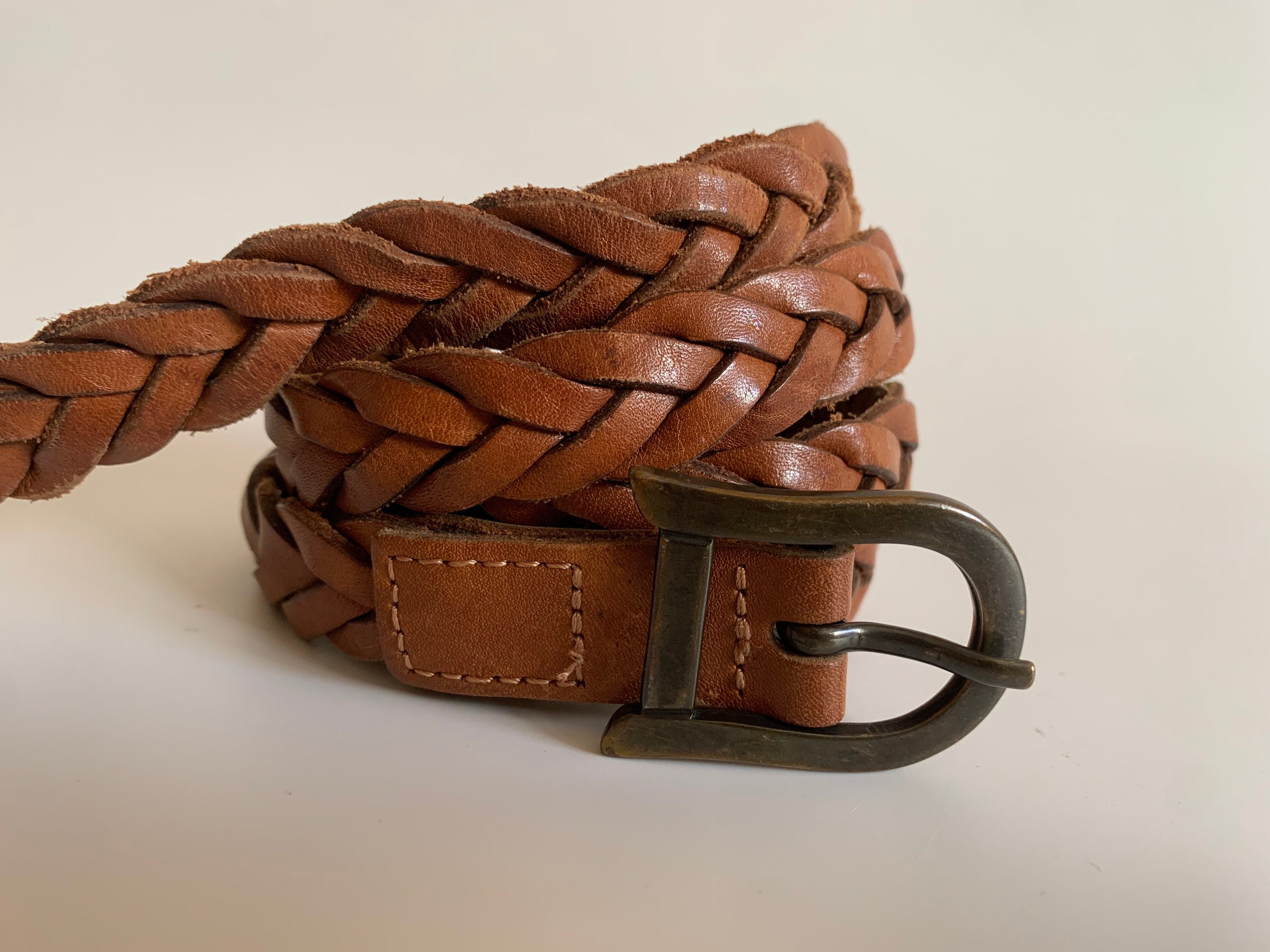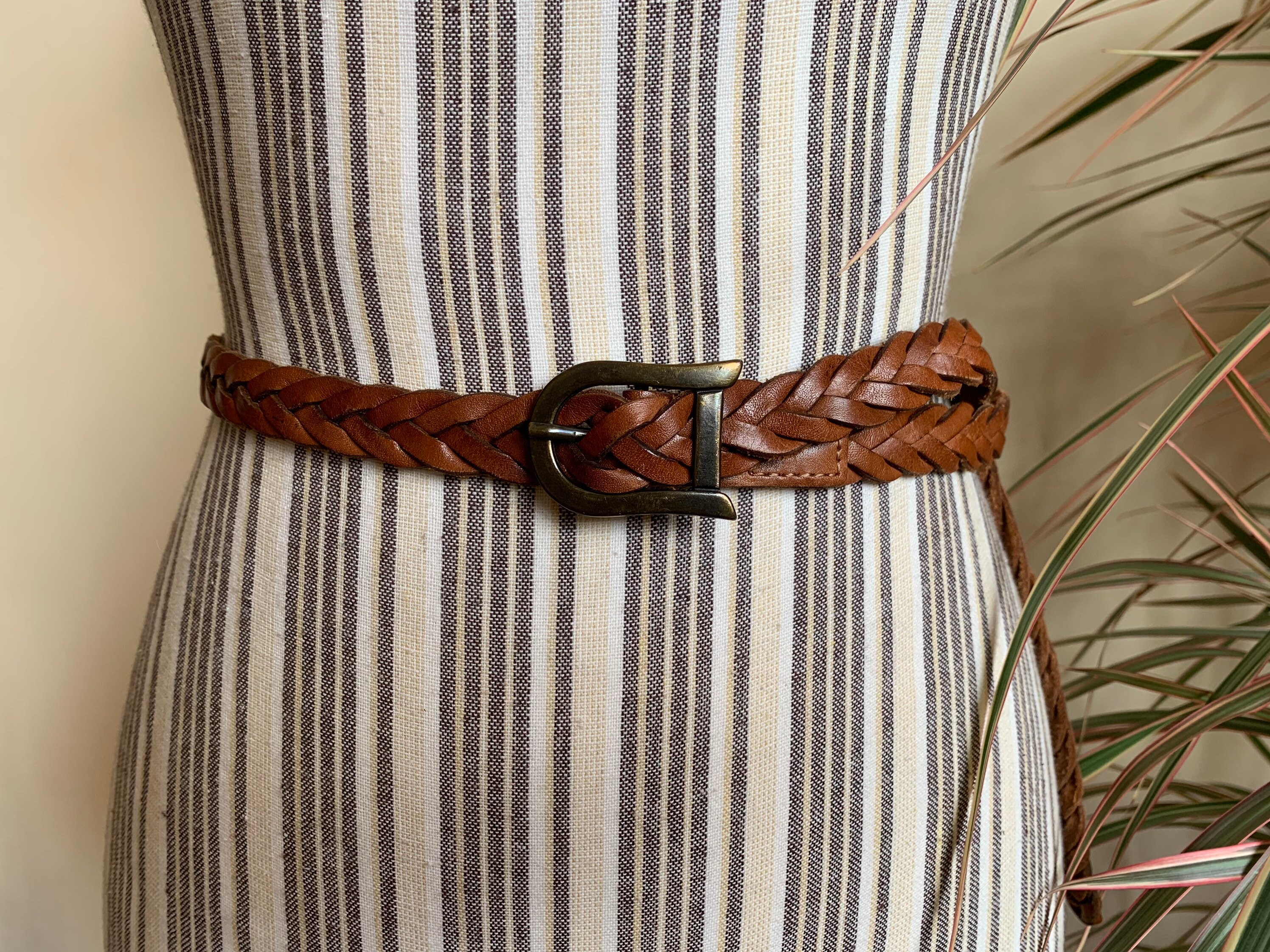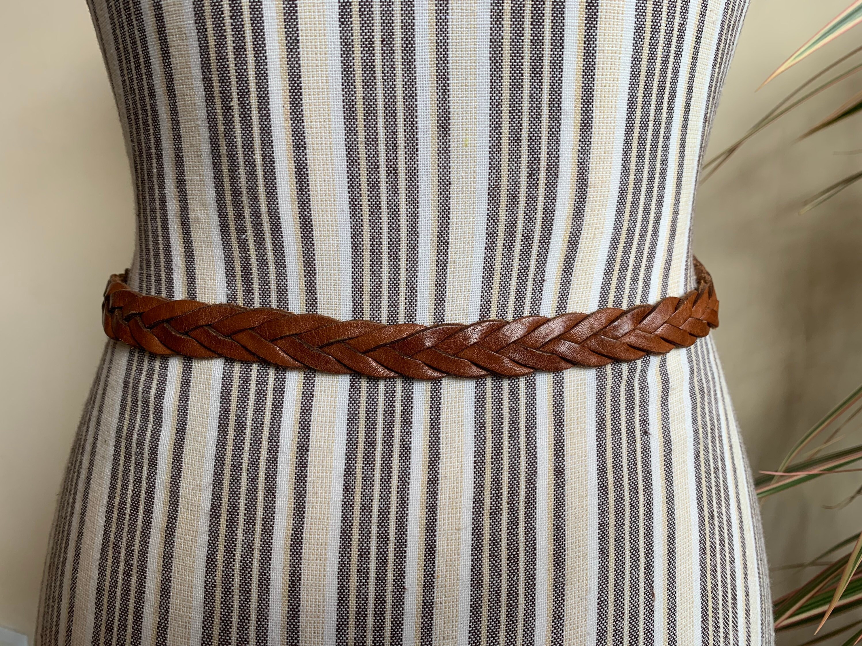 This is a vintage 90s braided skinny leather belt in tan brown color. This slim boho is made of genuine leather which has a distressed look due to the wear. This slim waist belt has a brass tone buckle. This narrow leather belt can adjust to approx 35.4" / 90 cm. The total length of the belt strap is 40.6" / 103 cm. This festival belt is just 0.8" / 2 cm wide.