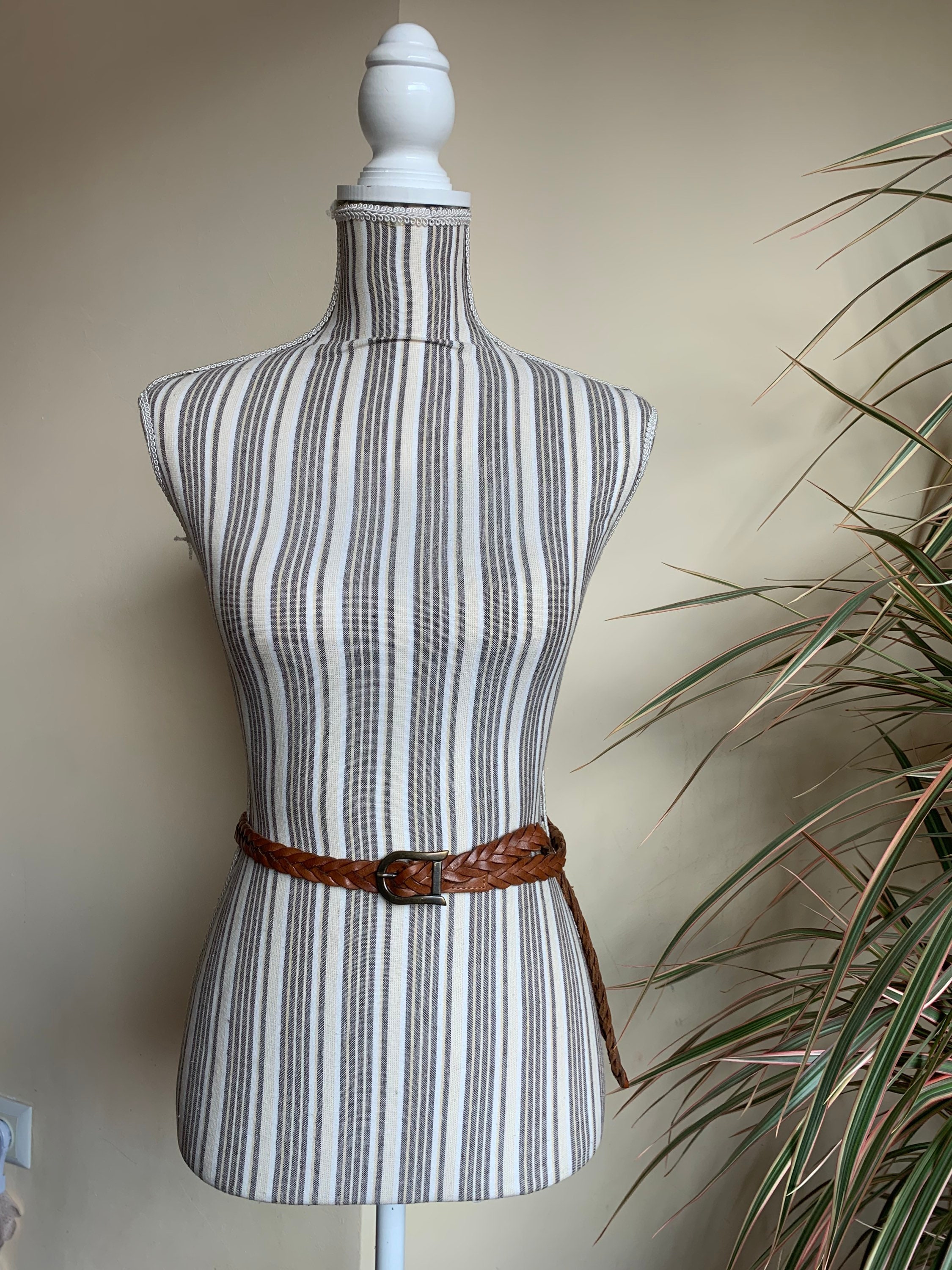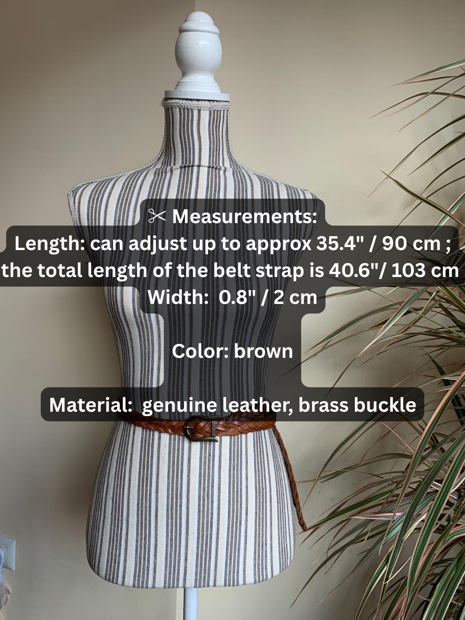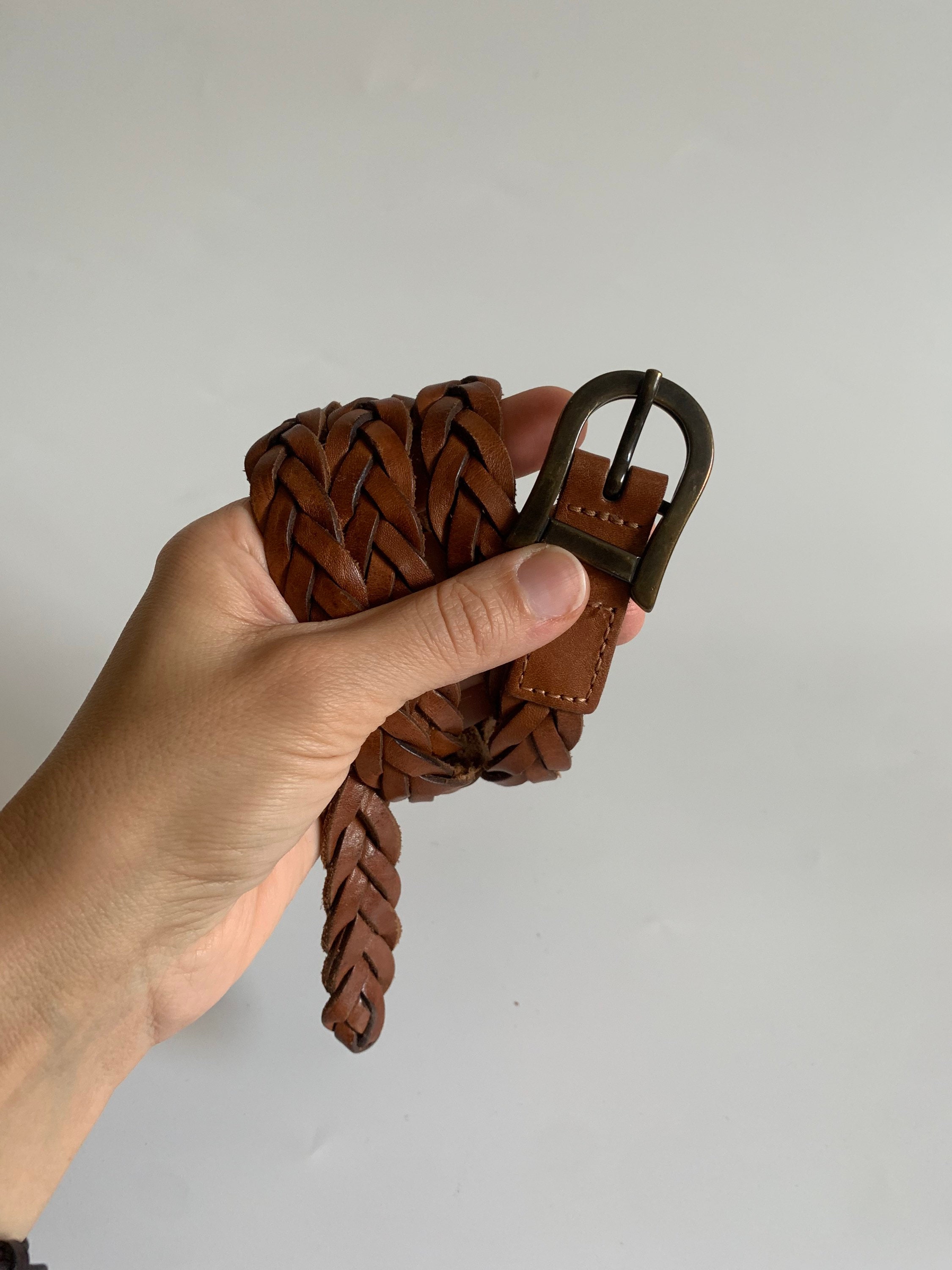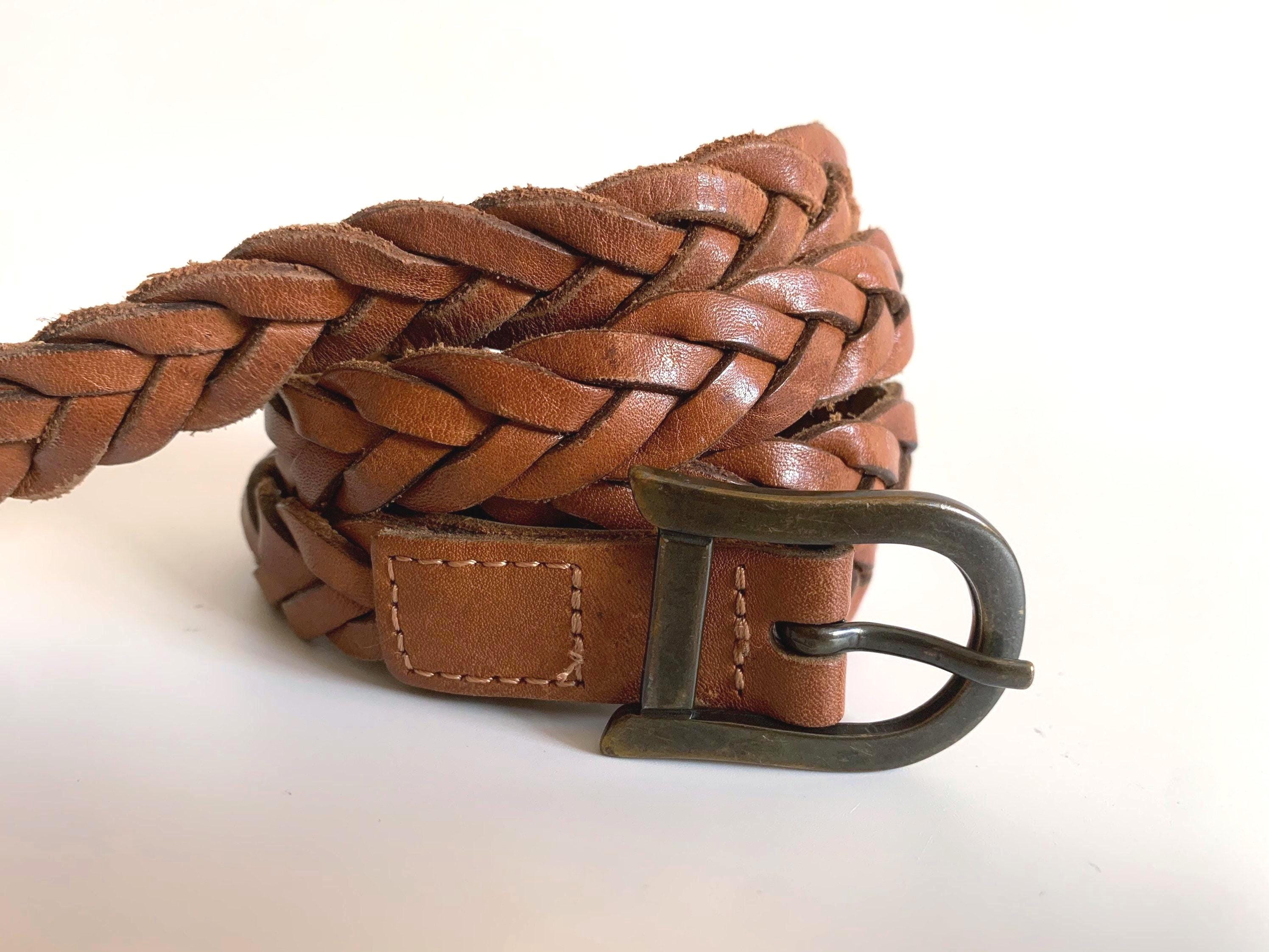This is a vintage 90s braided skinny leather belt in tan brown color. This slim boho is made of genuine leather which has a distressed look due to the wear. This slim waist belt has a brass tone buckle. This narrow leather belt can adjust to approx 35.4" / 90 cm. The total length of the belt strap is 40.6" / 103 cm. This festival belt is just 0.8" / 2 cm wide.