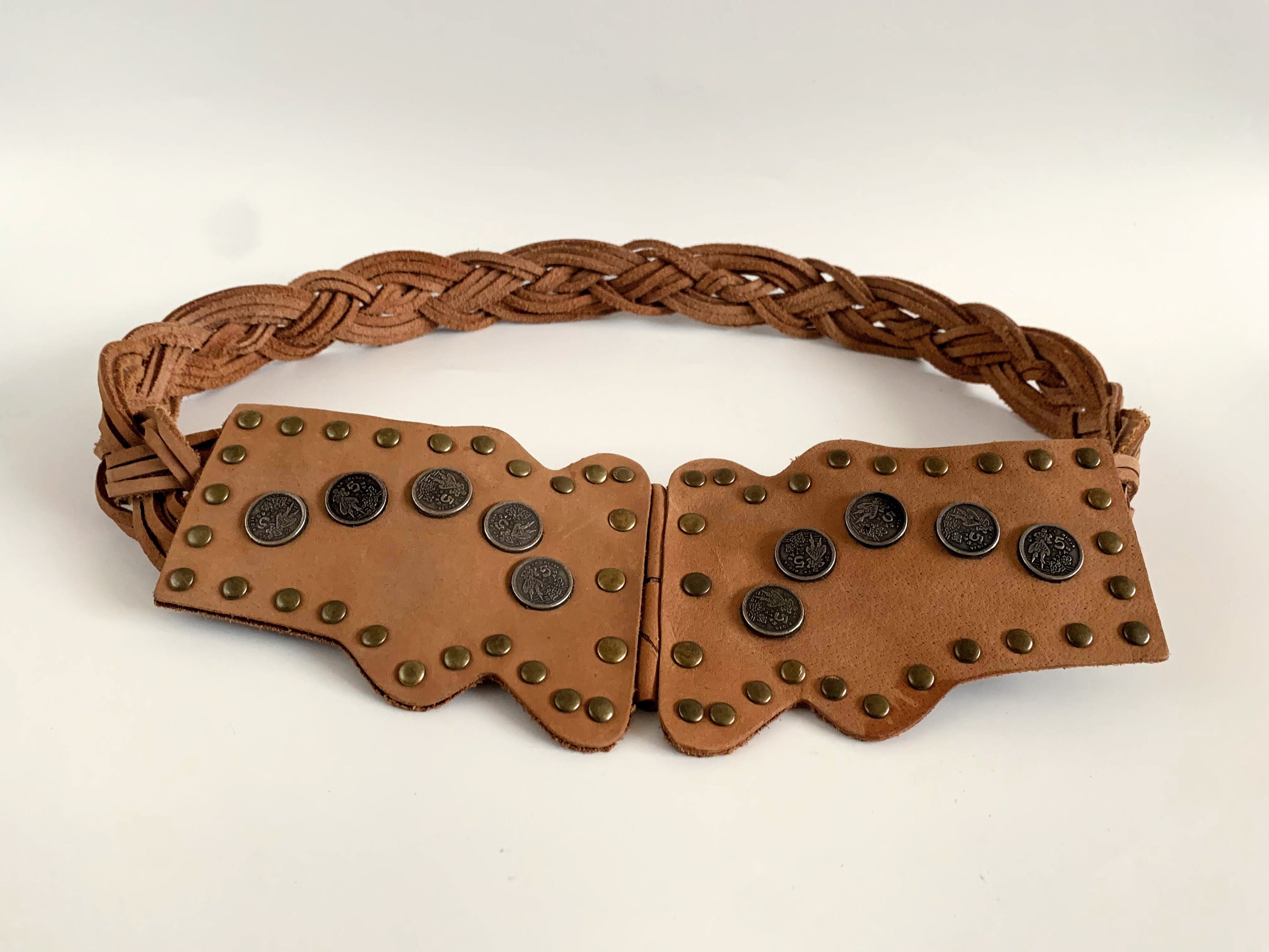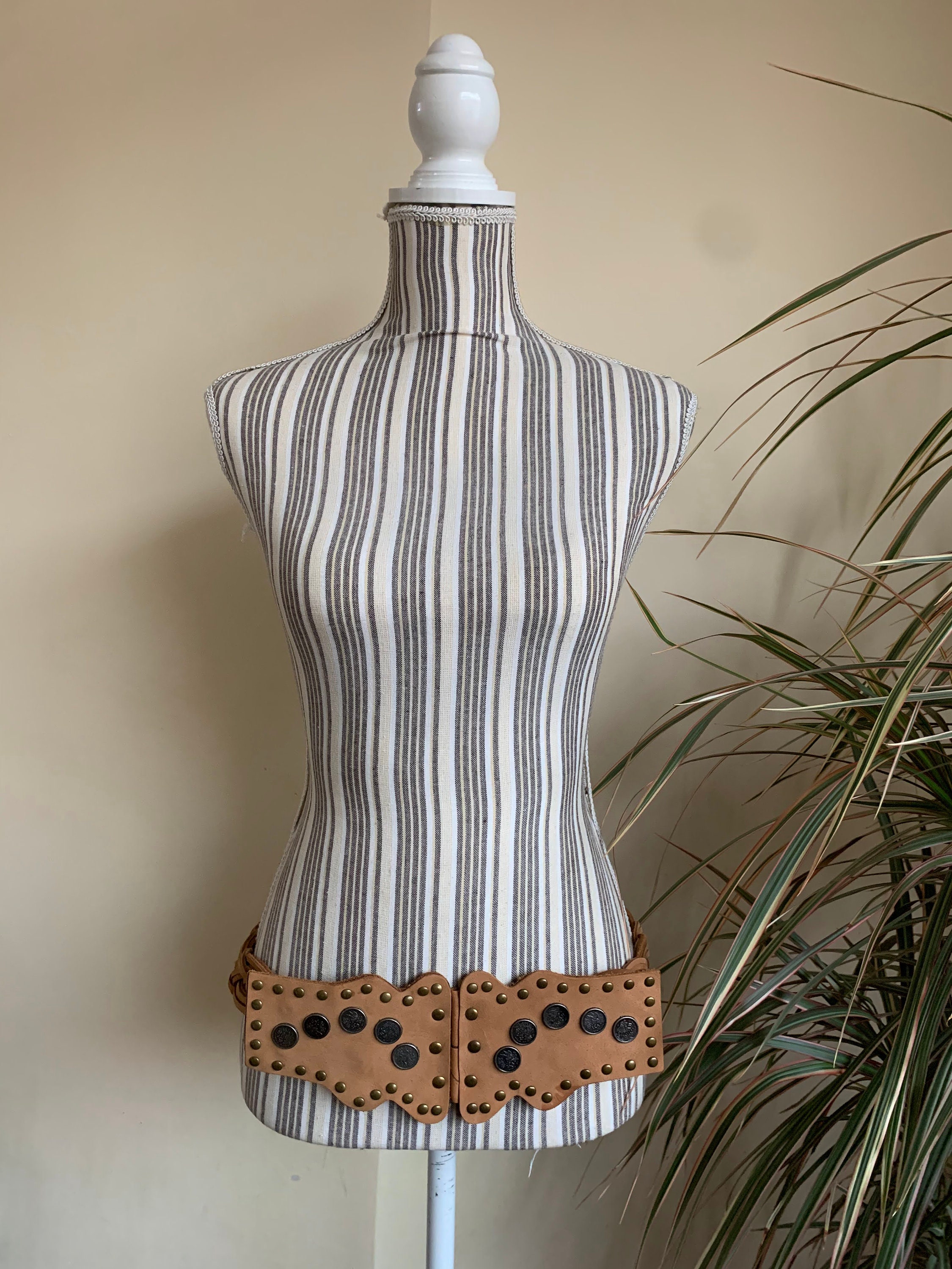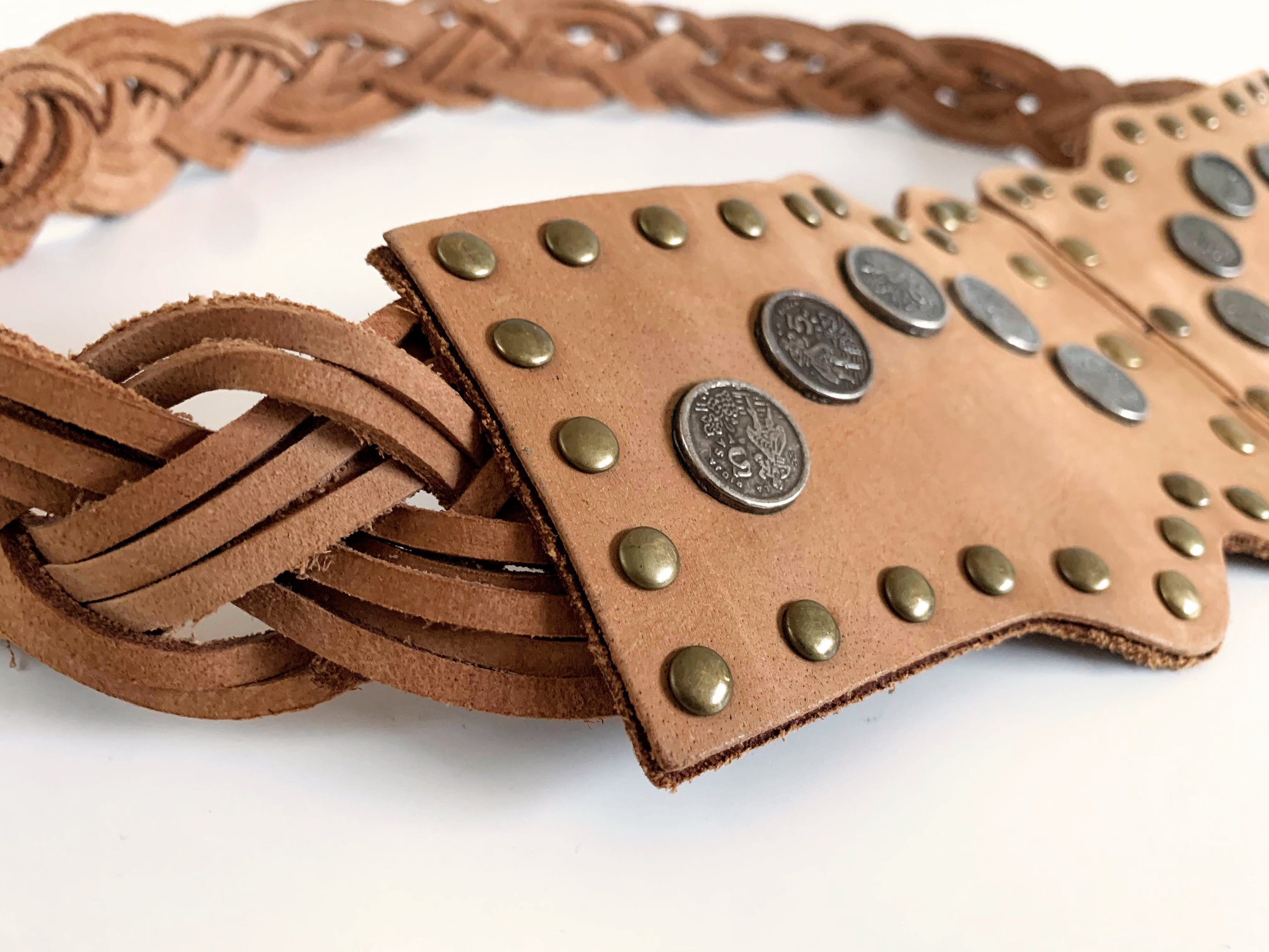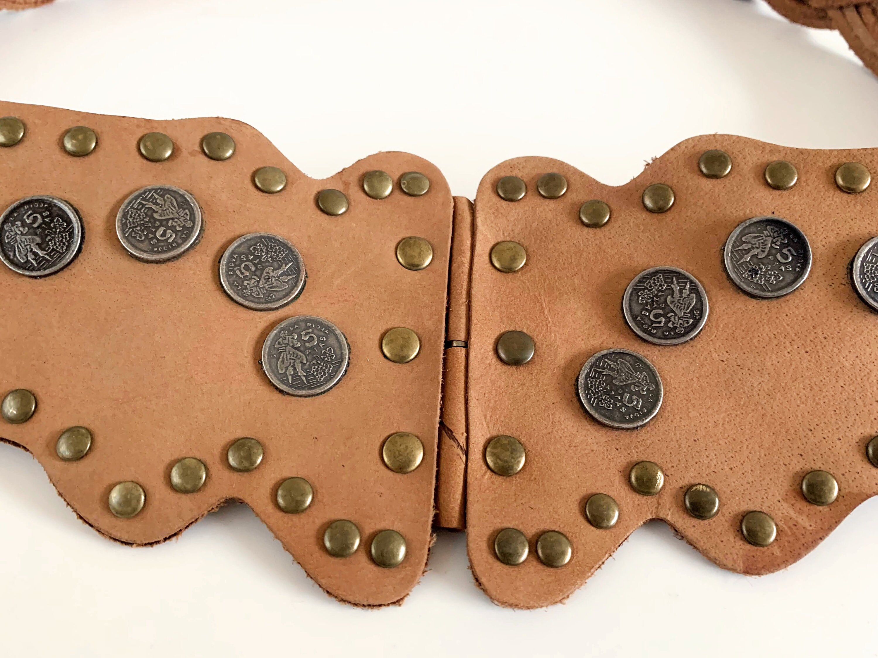 This is a vintage wide corset belt embellished with brass studs and silver coins. This woven belt is made of vegan leather in camel brown color. It adjusts with snap buttons underneath the central part. This woven hip belt can adjust from 35.4" - 39" / 90 cm to 99 cm. It is 3.9"/ 10 cm at the front; 2" / 5 cm at the back.