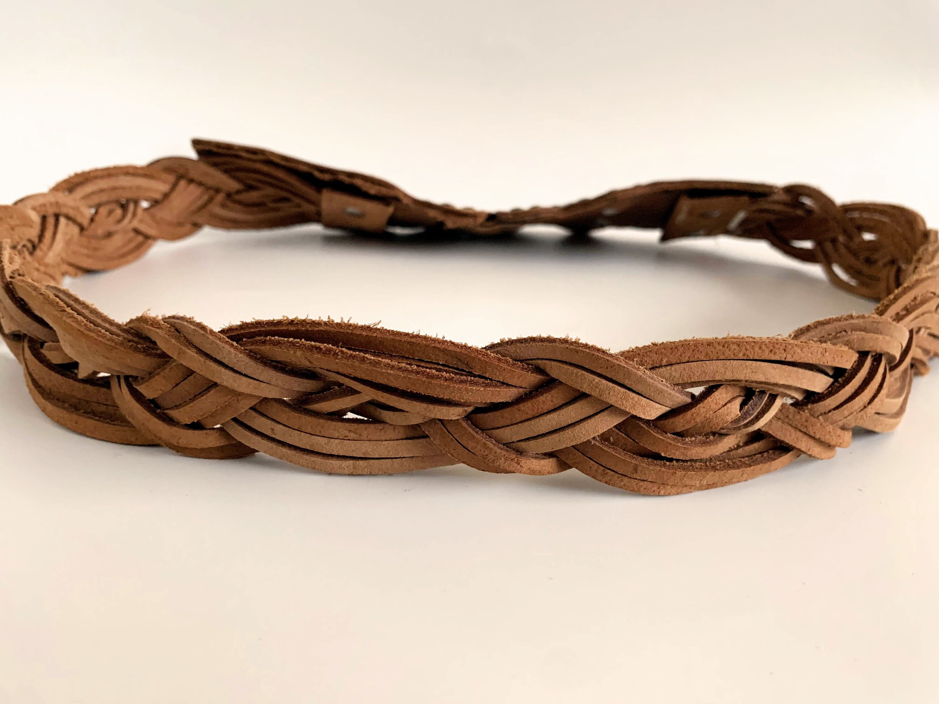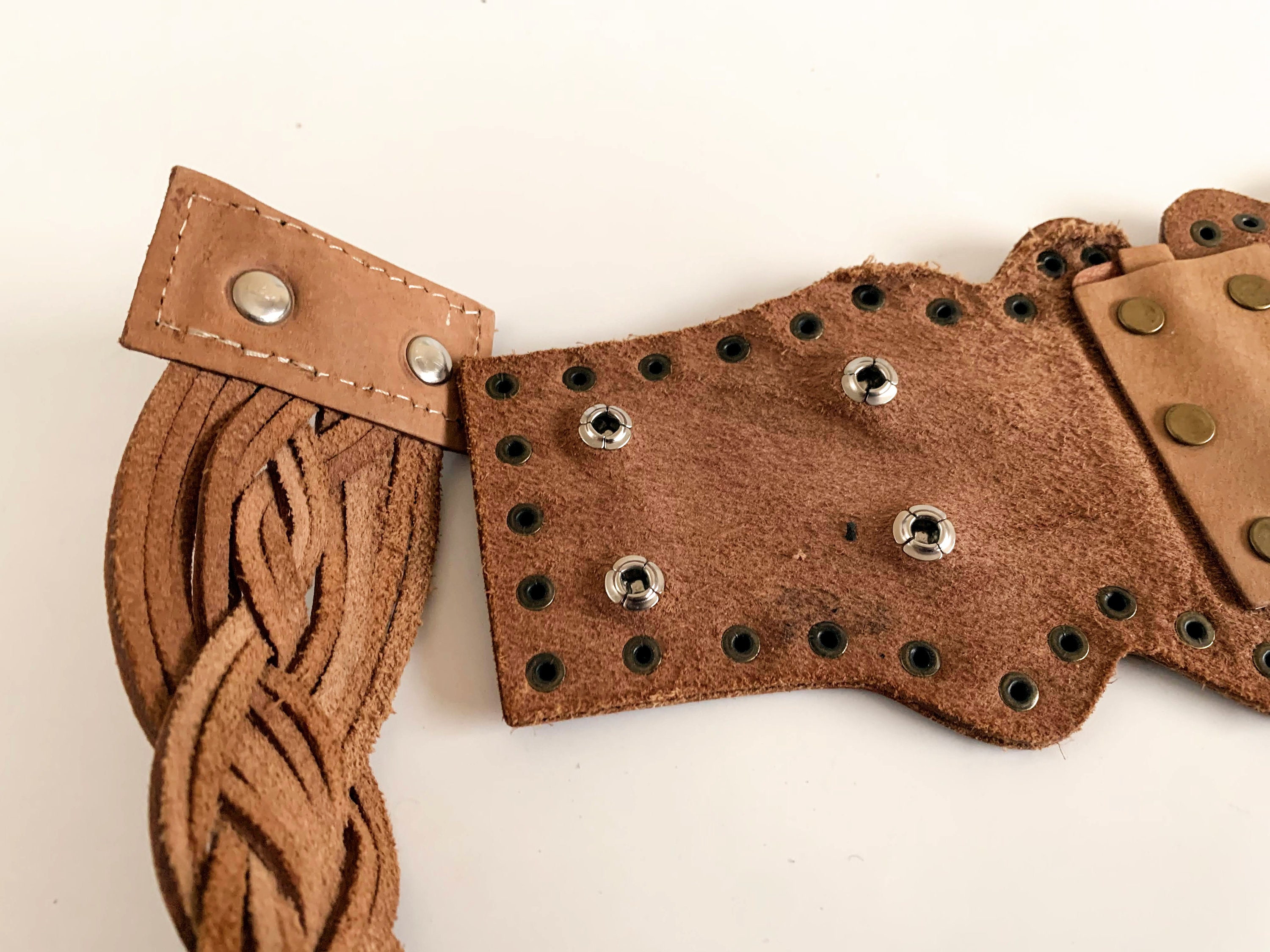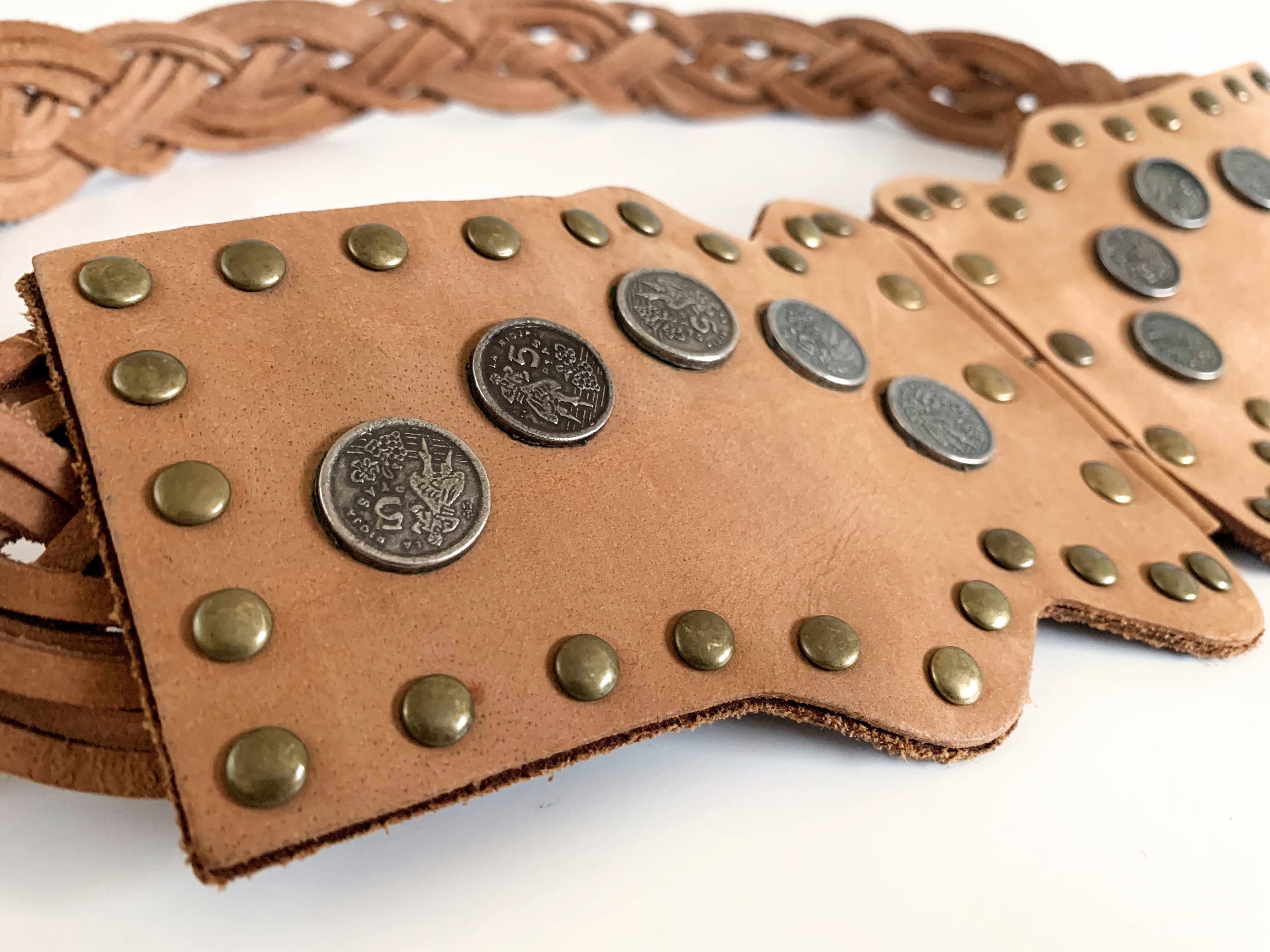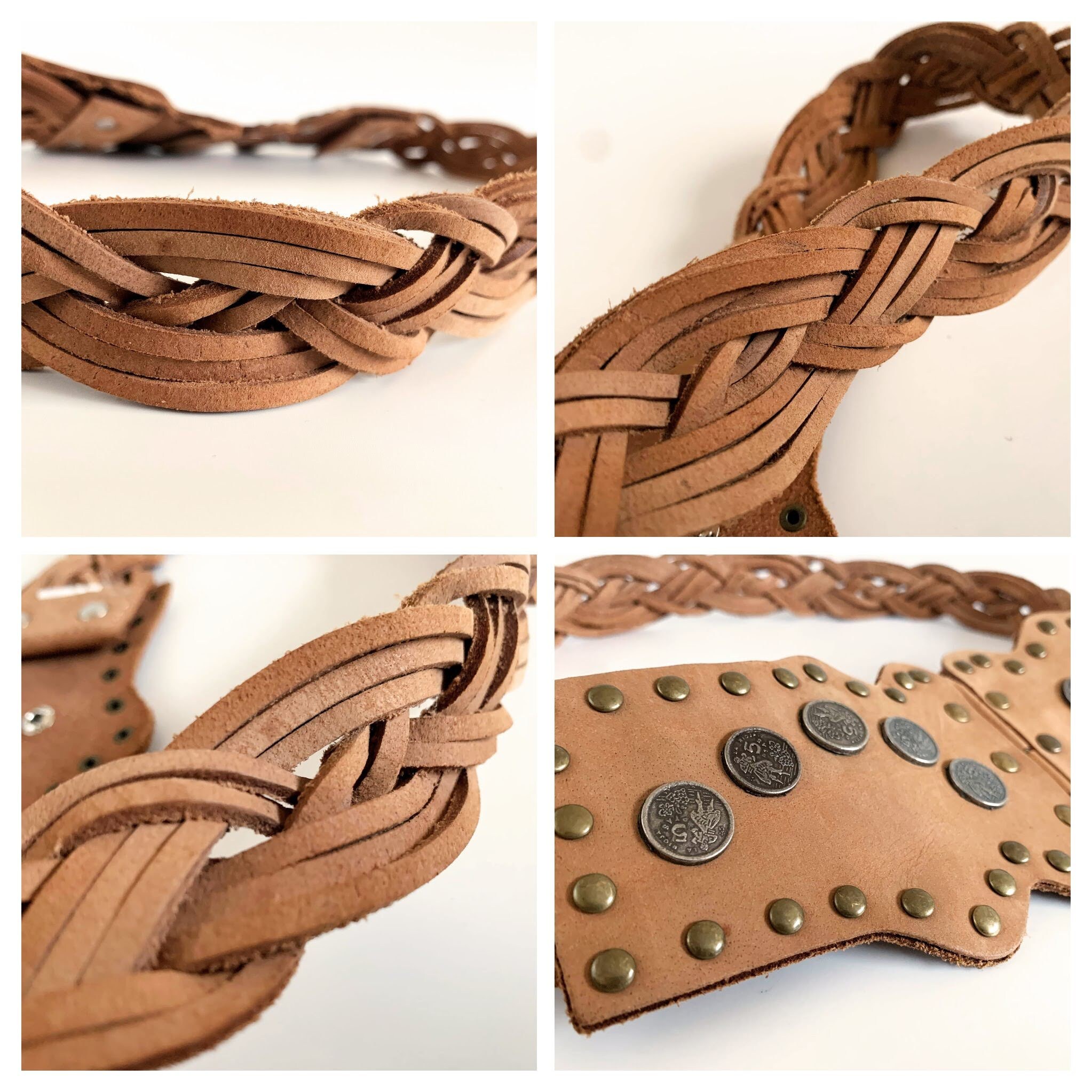 This is a vintage wide corset belt embellished with brass studs and silver coins. This woven belt is made of vegan leather in camel brown color. It adjusts with snap buttons underneath the central part. This woven hip belt can adjust from 35.4" - 39" / 90 cm to 99 cm. It is 3.9"/ 10 cm at the front; 2" / 5 cm at the back.
