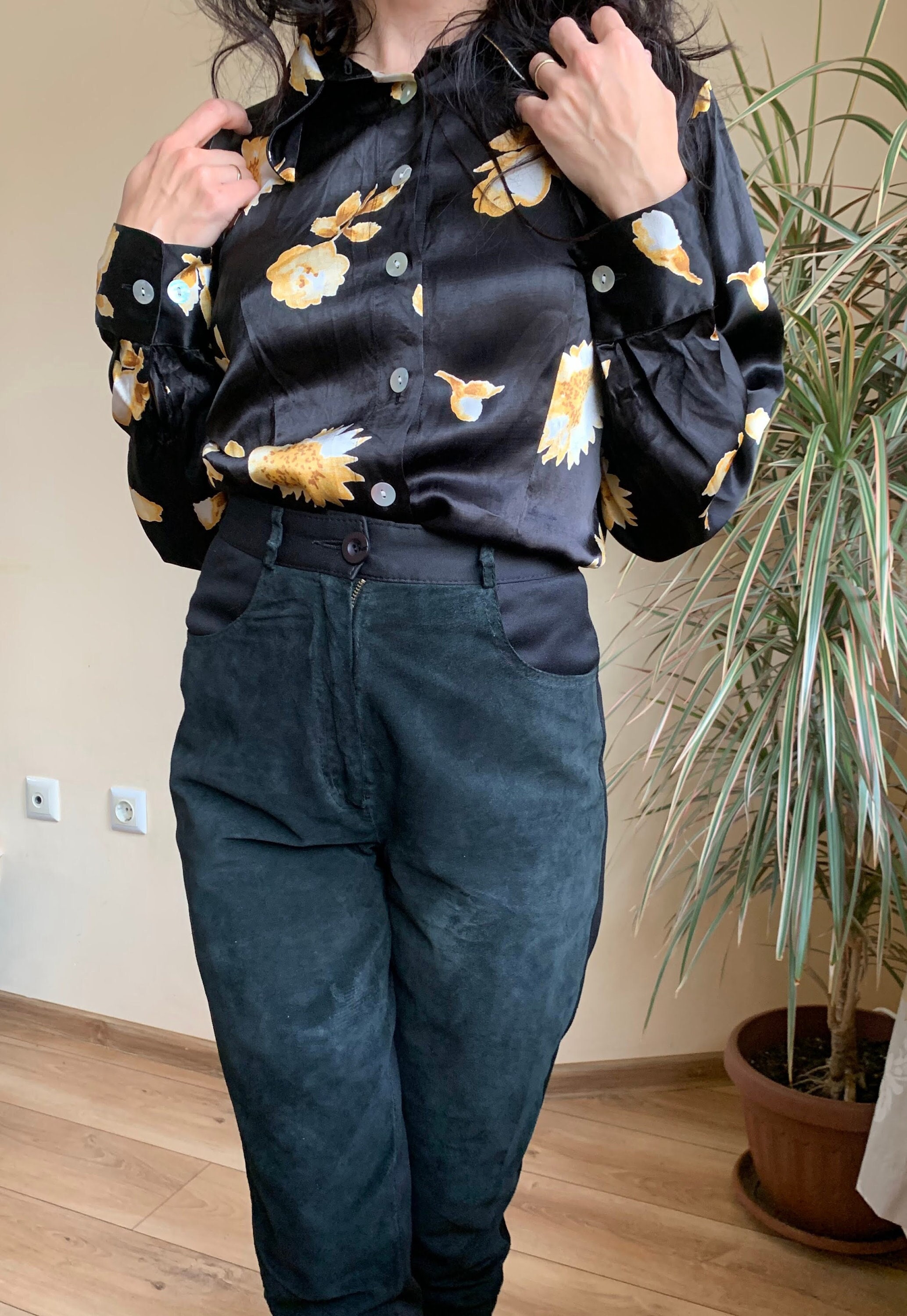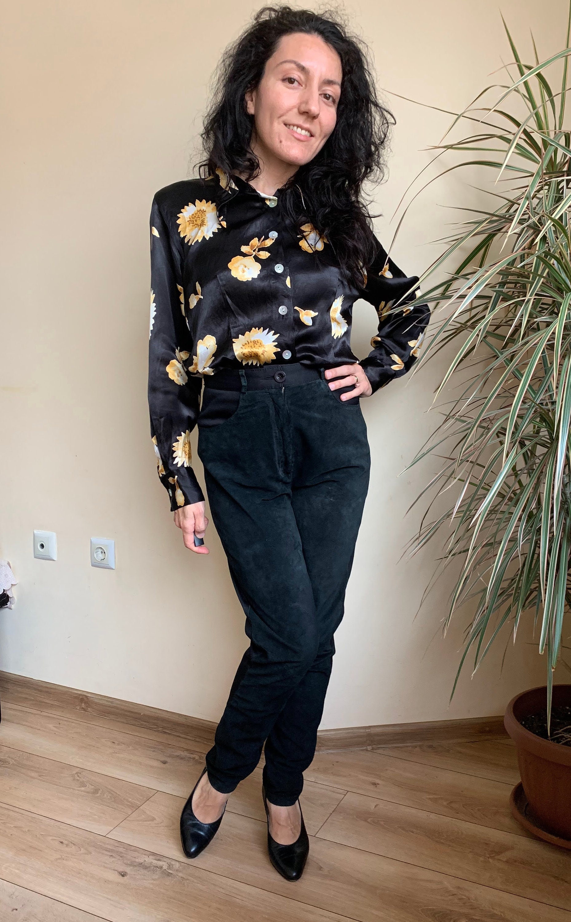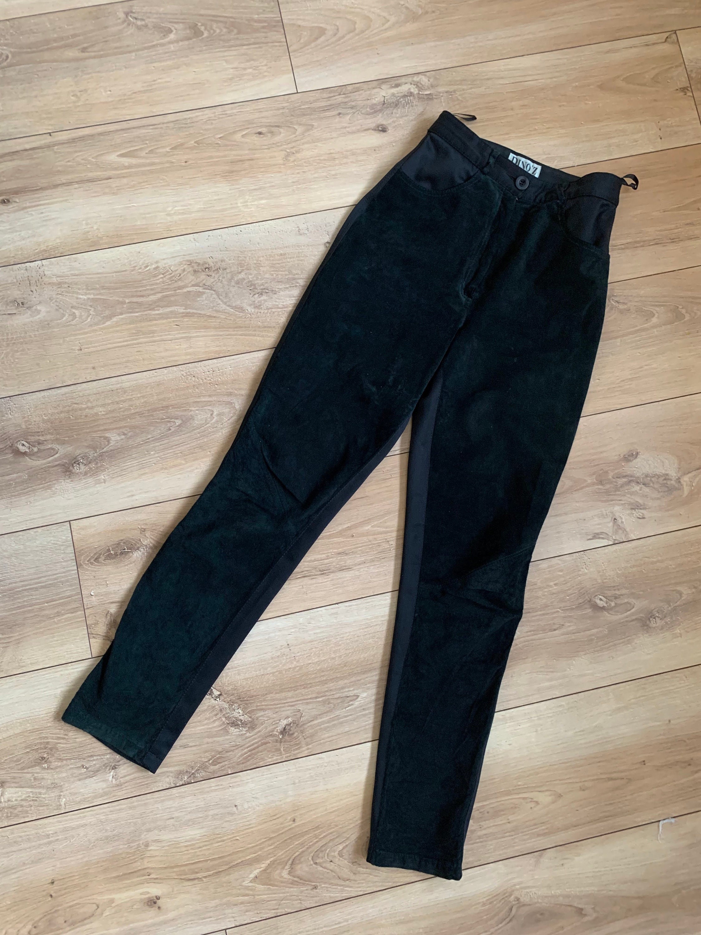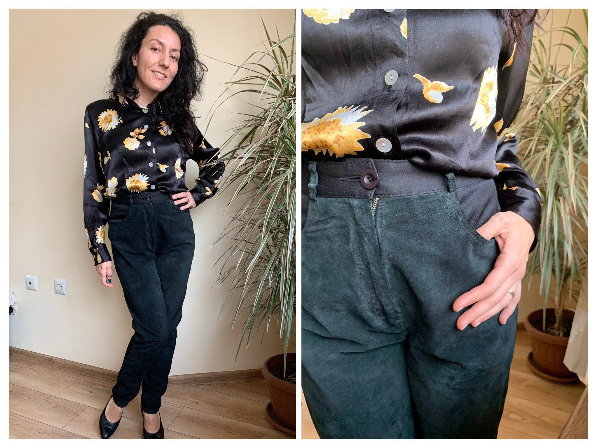 These are vintage 90s black suede leather pants for women. These suede pants are made of two different types of materials. These leather pants have a suede leather front side. The back side of these black trousers is made of stretchy jersey polyester fabric. These black suede pants have a high rise and tapered legs. They have a front zip and button closure. These suede trousers have a loose fit baggy look and yet they are gathered at the waist so they can enhance your silhouette. These high waisted suede leather pants look awesome with dress shirts and blouses. Add some high heels for an elevated look. Or just pair these leather trousers with a pair of combat boots and jump on the ride. The size marked is EU 36, GB 10. They fit like S, US 6. I am modelling these black suede pants and I wear size S, EU 36, UK 10, US 6. I am 5'3" tall / 160 cm. Please check the measurements below.
