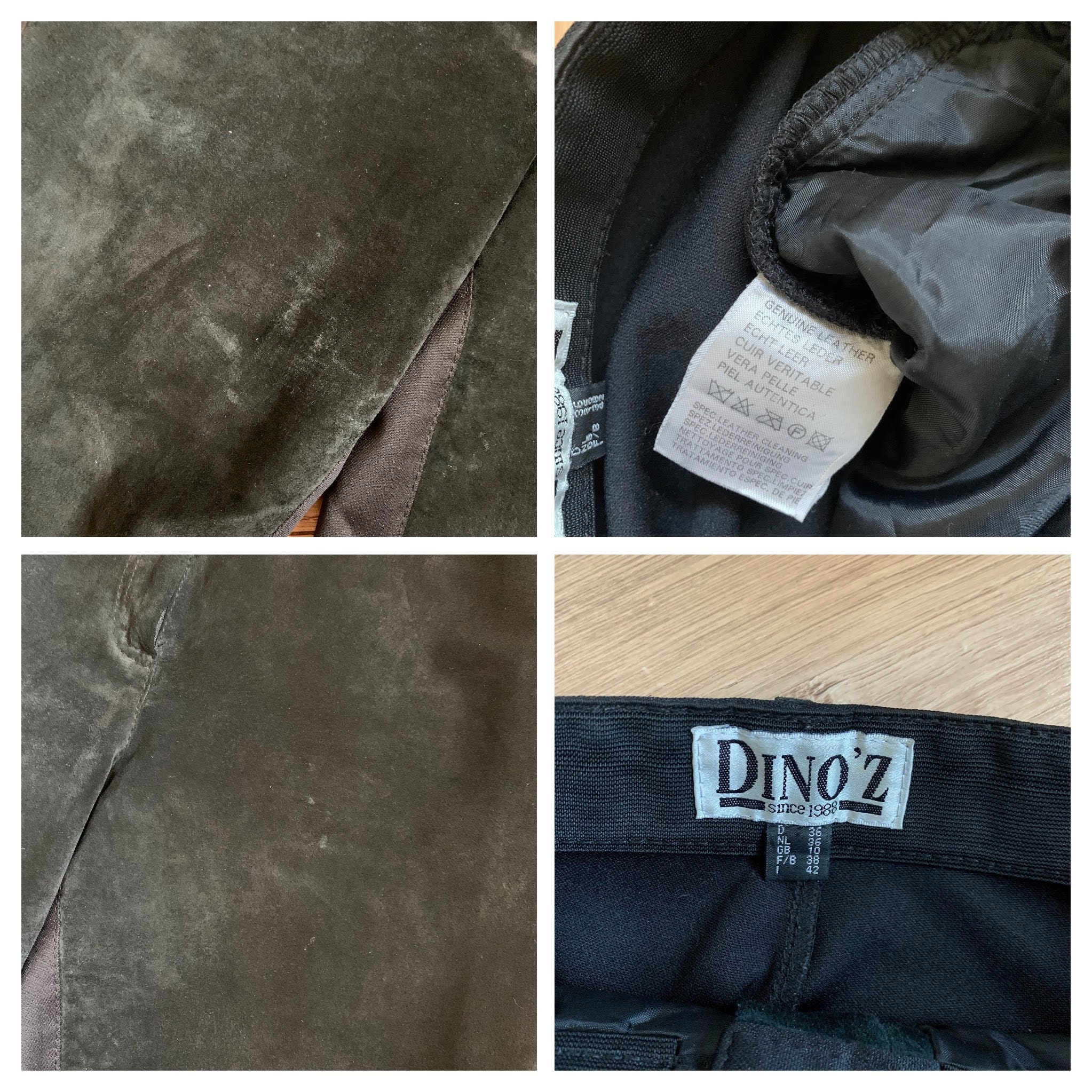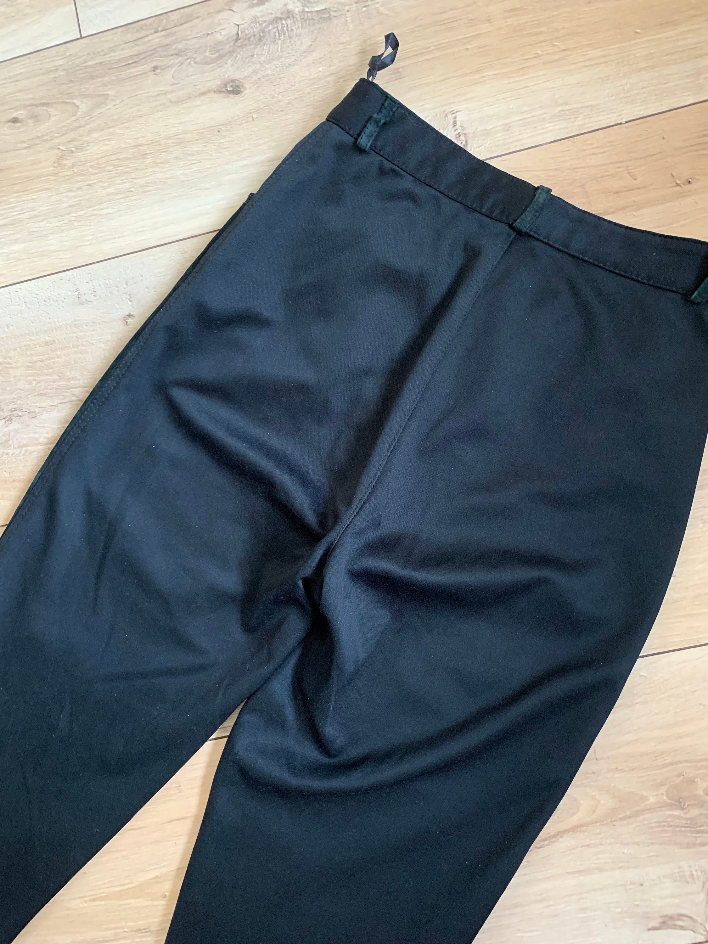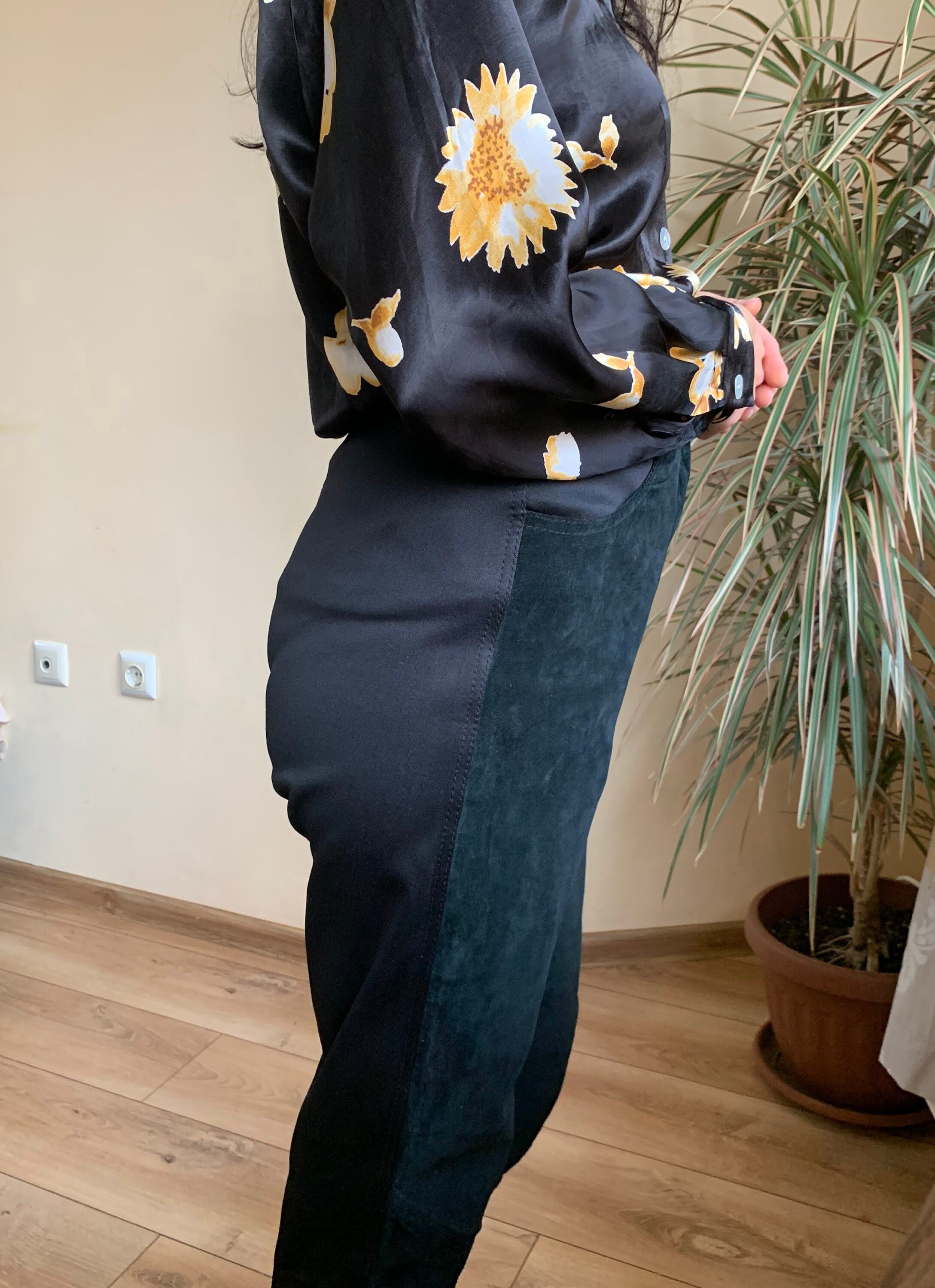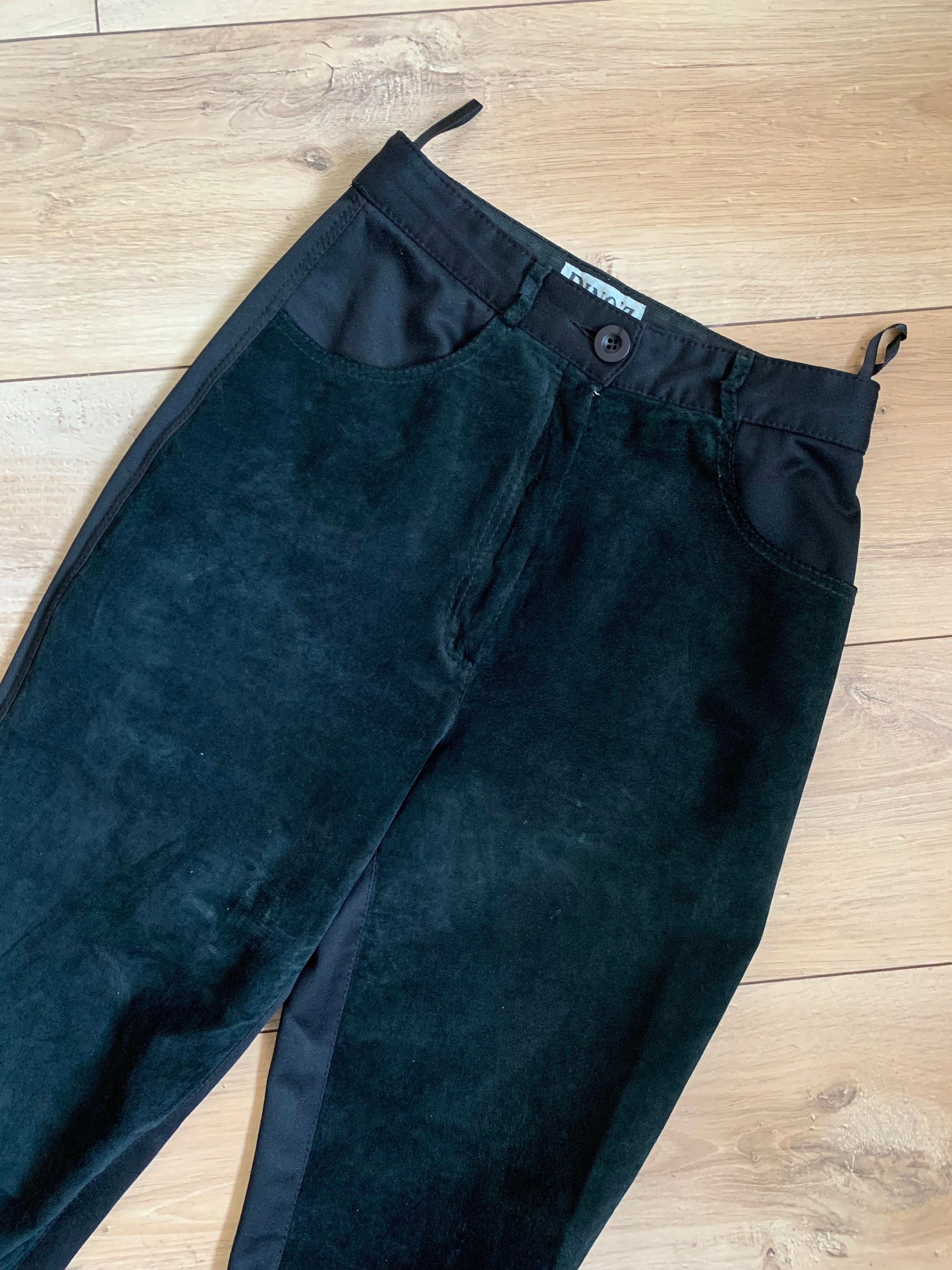 These are vintage 90s black suede leather pants for women. These suede pants are made of two different types of materials. These leather pants have a suede leather front side. The back side of these black trousers is made of stretchy jersey polyester fabric. These black suede pants have a high rise and tapered legs. They have a front zip and button closure. These suede trousers have a loose fit baggy look and yet they are gathered at the waist so they can enhance your silhouette. These high waisted suede leather pants look awesome with dress shirts and blouses. Add some high heels for an elevated look. Or just pair these leather trousers with a pair of combat boots and jump on the ride. The size marked is EU 36, GB 10. They fit like S, US 6. I am modelling these black suede pants and I wear size S, EU 36, UK 10, US 6. I am 5'3" tall / 160 cm. Please check the measurements below.