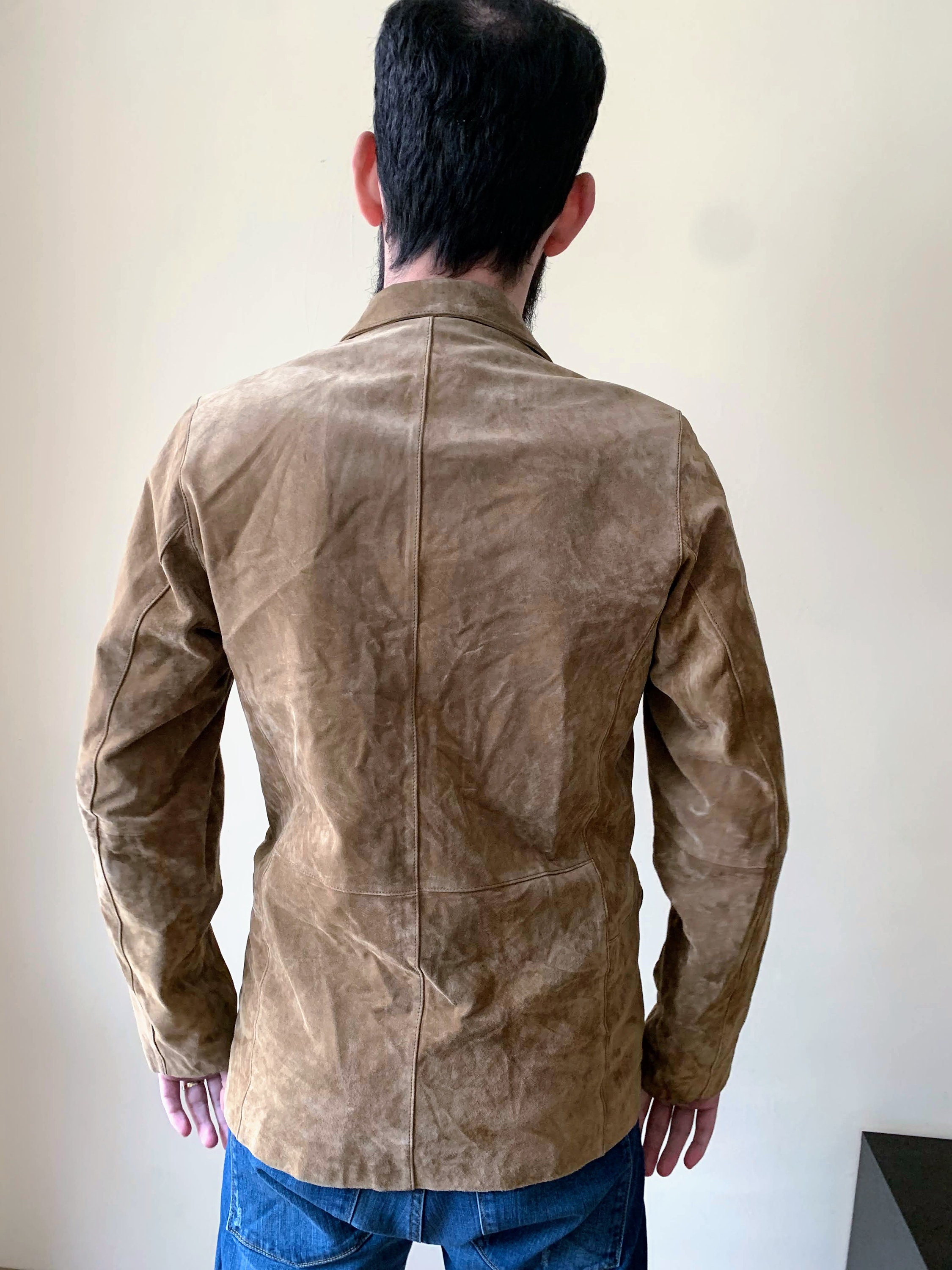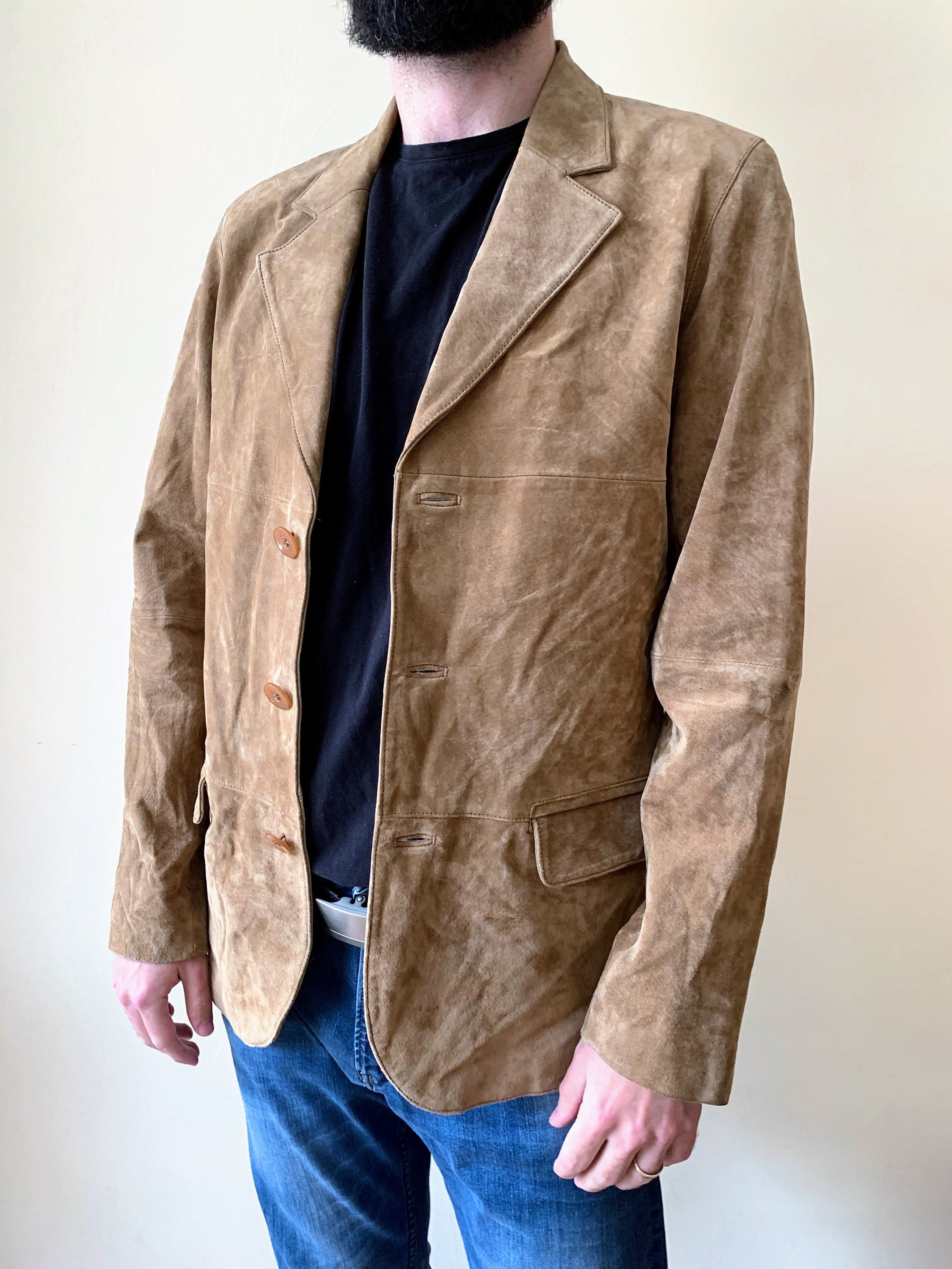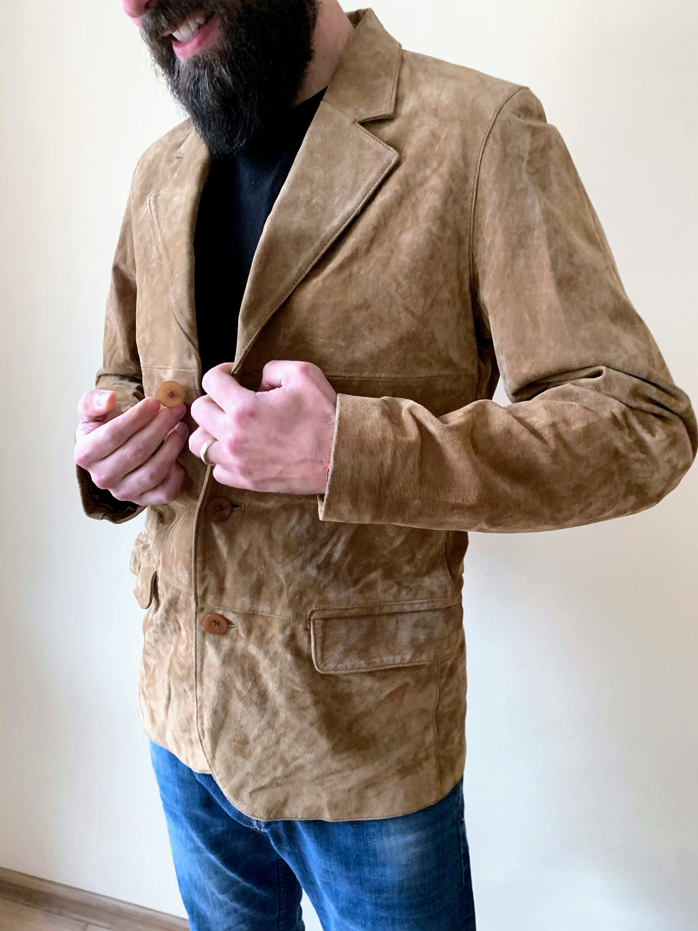 This is a vintage Y2K distressed suede leather blazer jacket for men with three button closure. This camel brown leather blazer is made of genuine suede leather which has an aged look due to the creases, marks and scratches on the leather surface. This slim fit leather blazer for men has two side pockets and three pockets inside. It has polyester lining. This suede leather blazer jacket is by the brand Giovani Natural. The size marked is EUR 50, GB 22, it fits like M. Please check the measurements below.