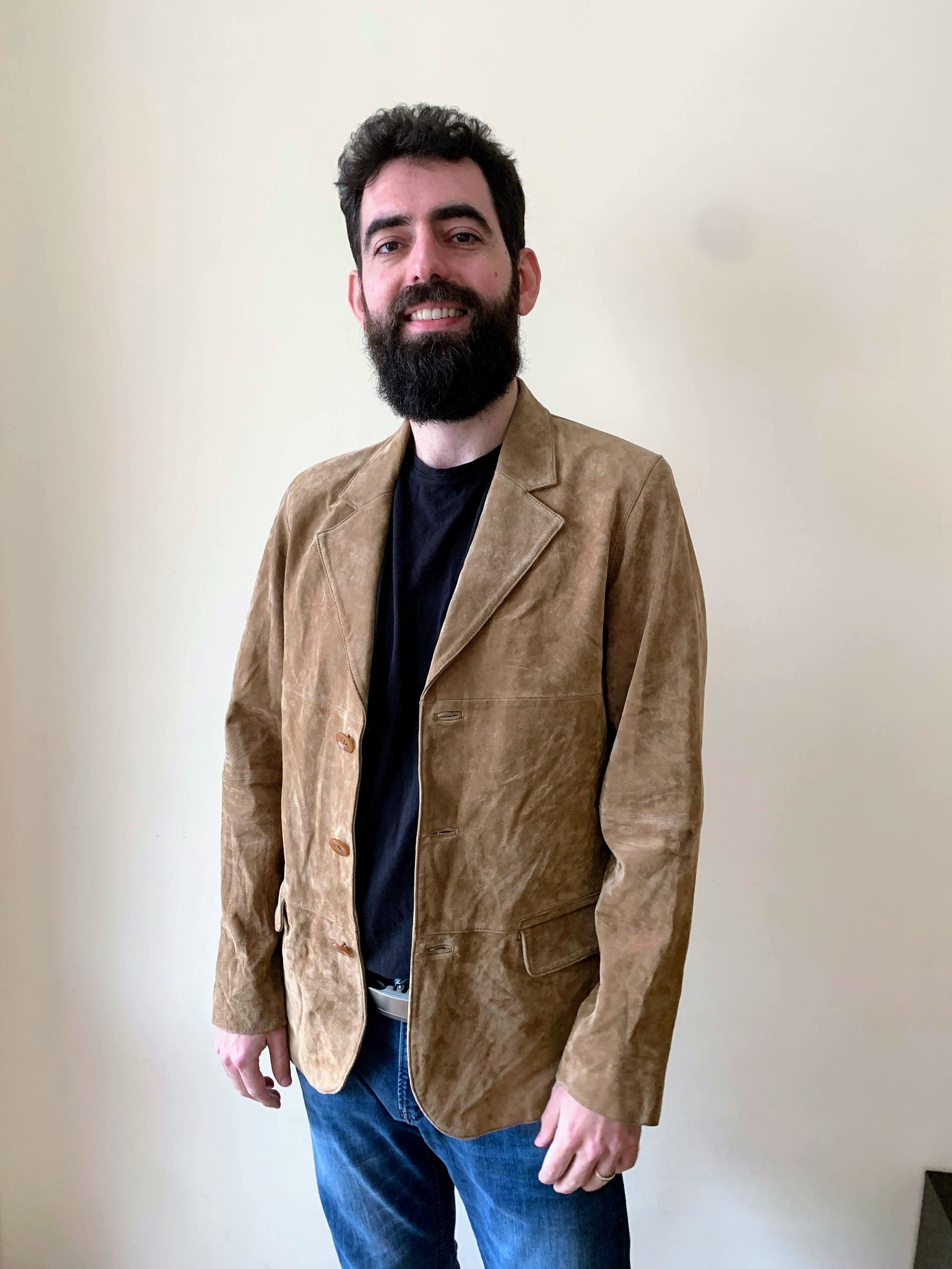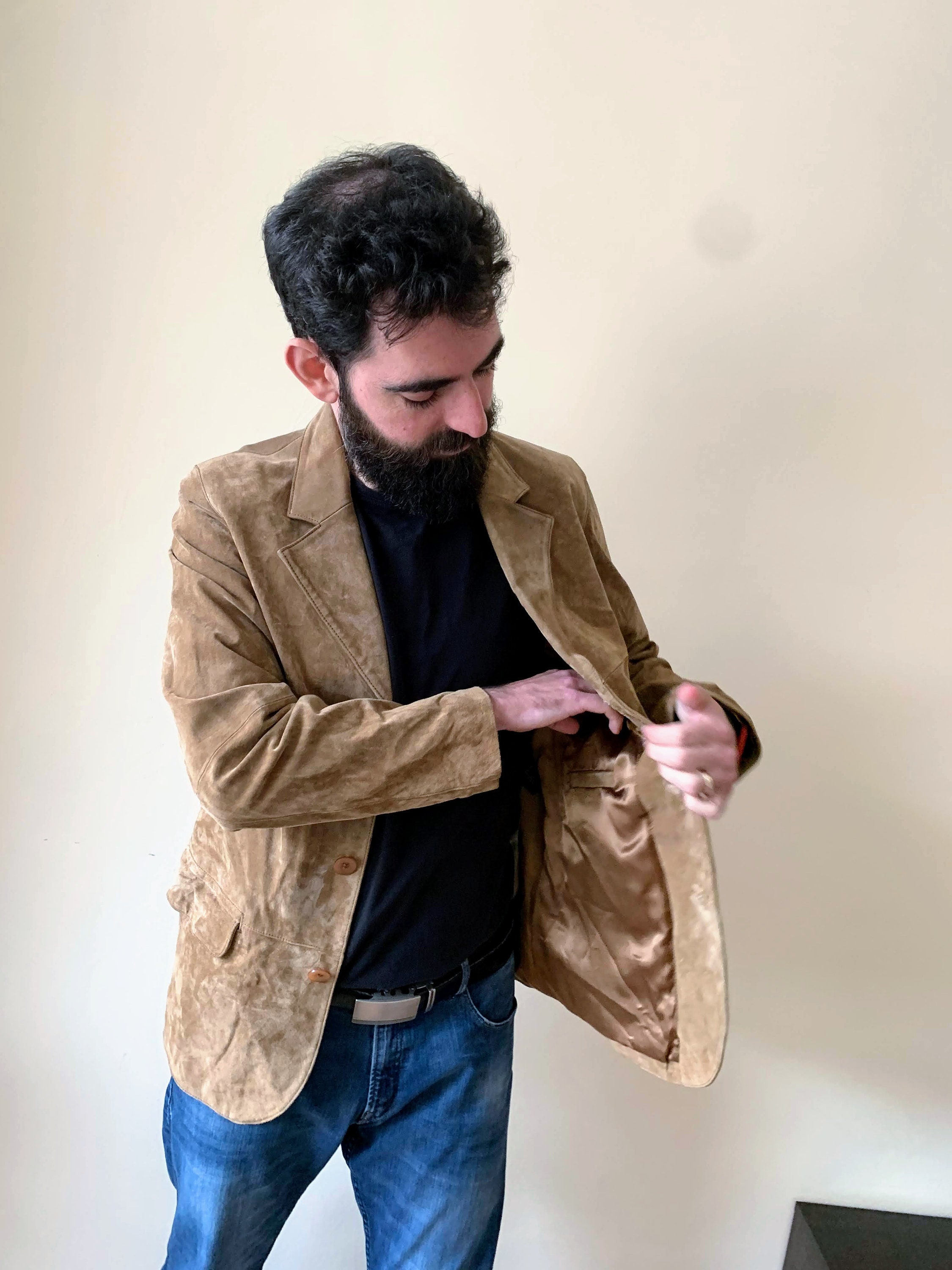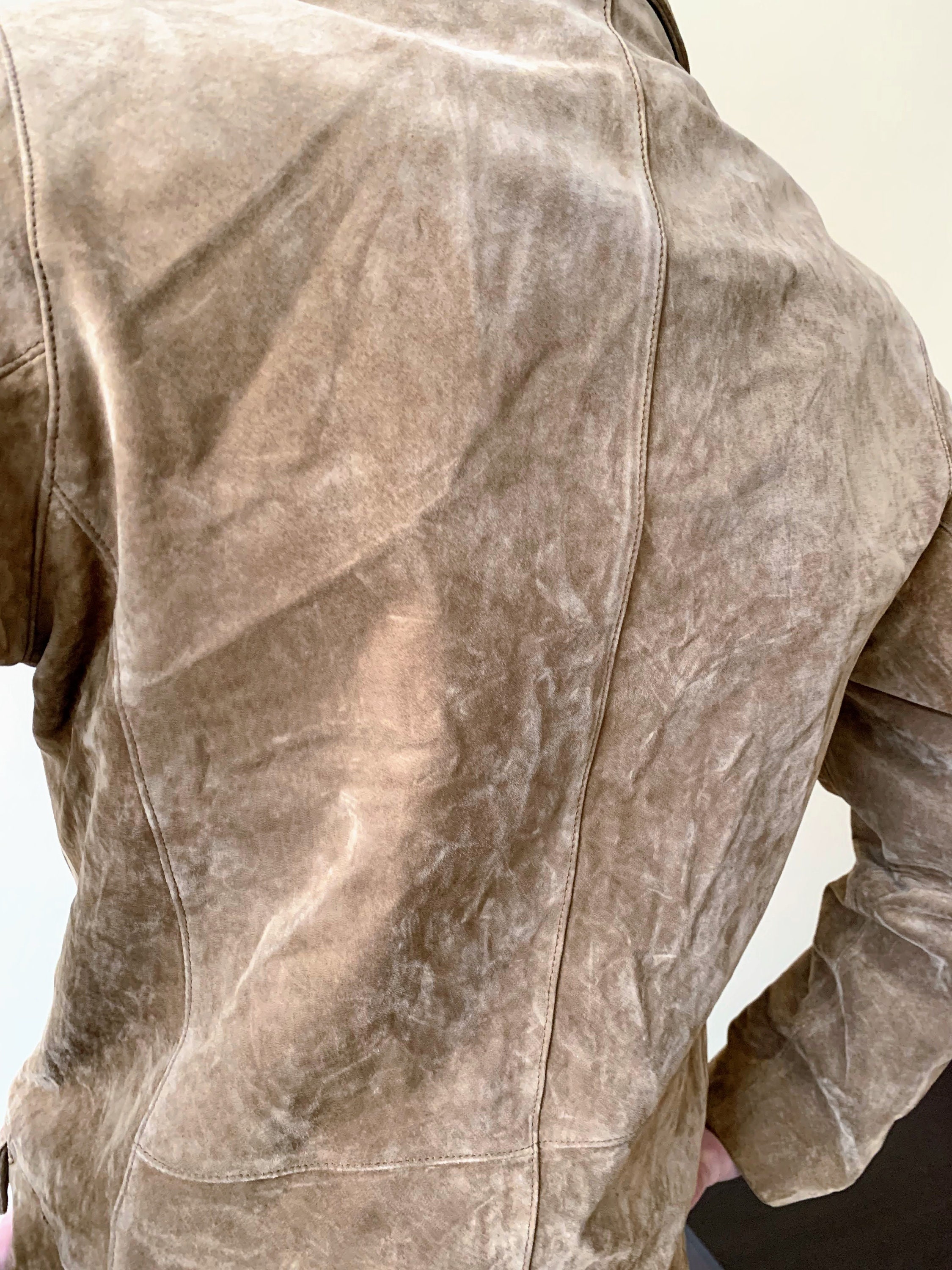 This is a vintage Y2K distressed suede leather blazer jacket for men with three button closure. This camel brown leather blazer is made of genuine suede leather which has an aged look due to the creases, marks and scratches on the leather surface. This slim fit leather blazer for men has two side pockets and three pockets inside. It has polyester lining. This suede leather blazer jacket is by the brand Giovani Natural. The size marked is EUR 50, GB 22, it fits like M. Please check the measurements below.