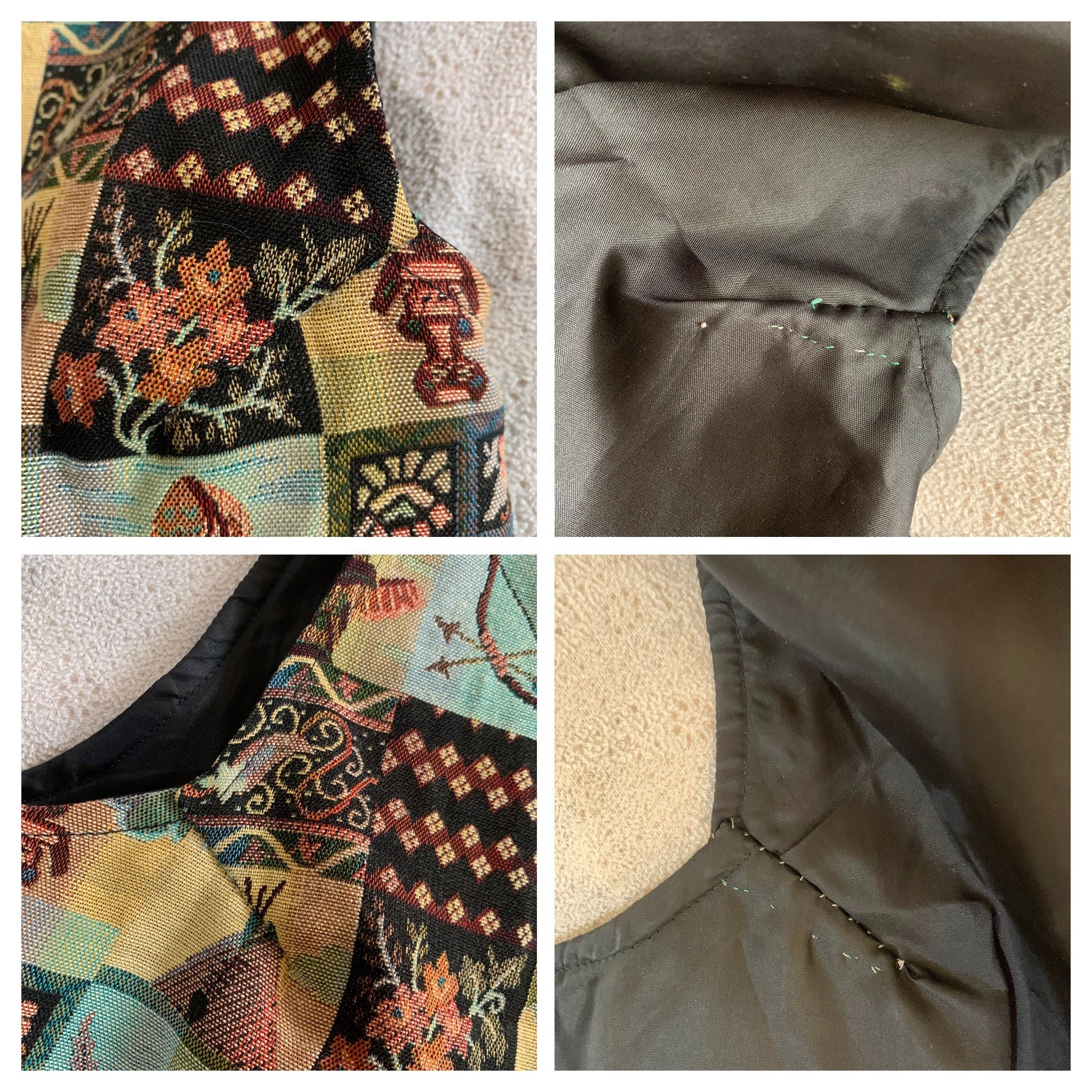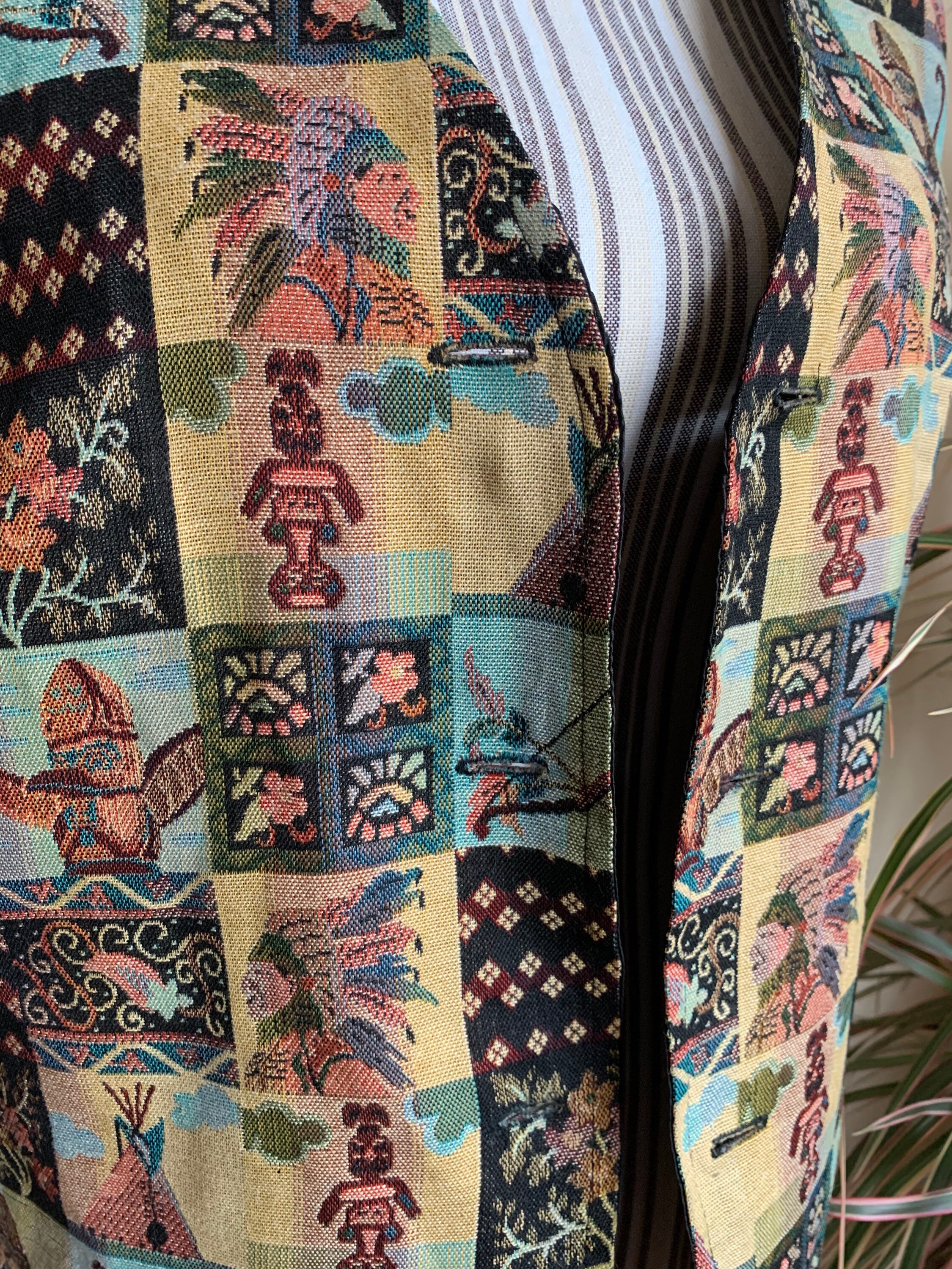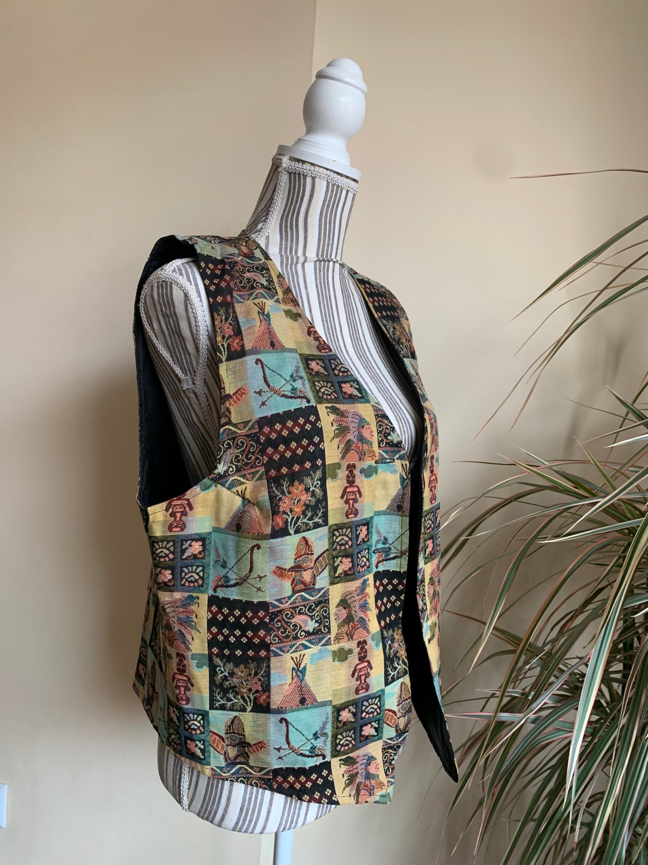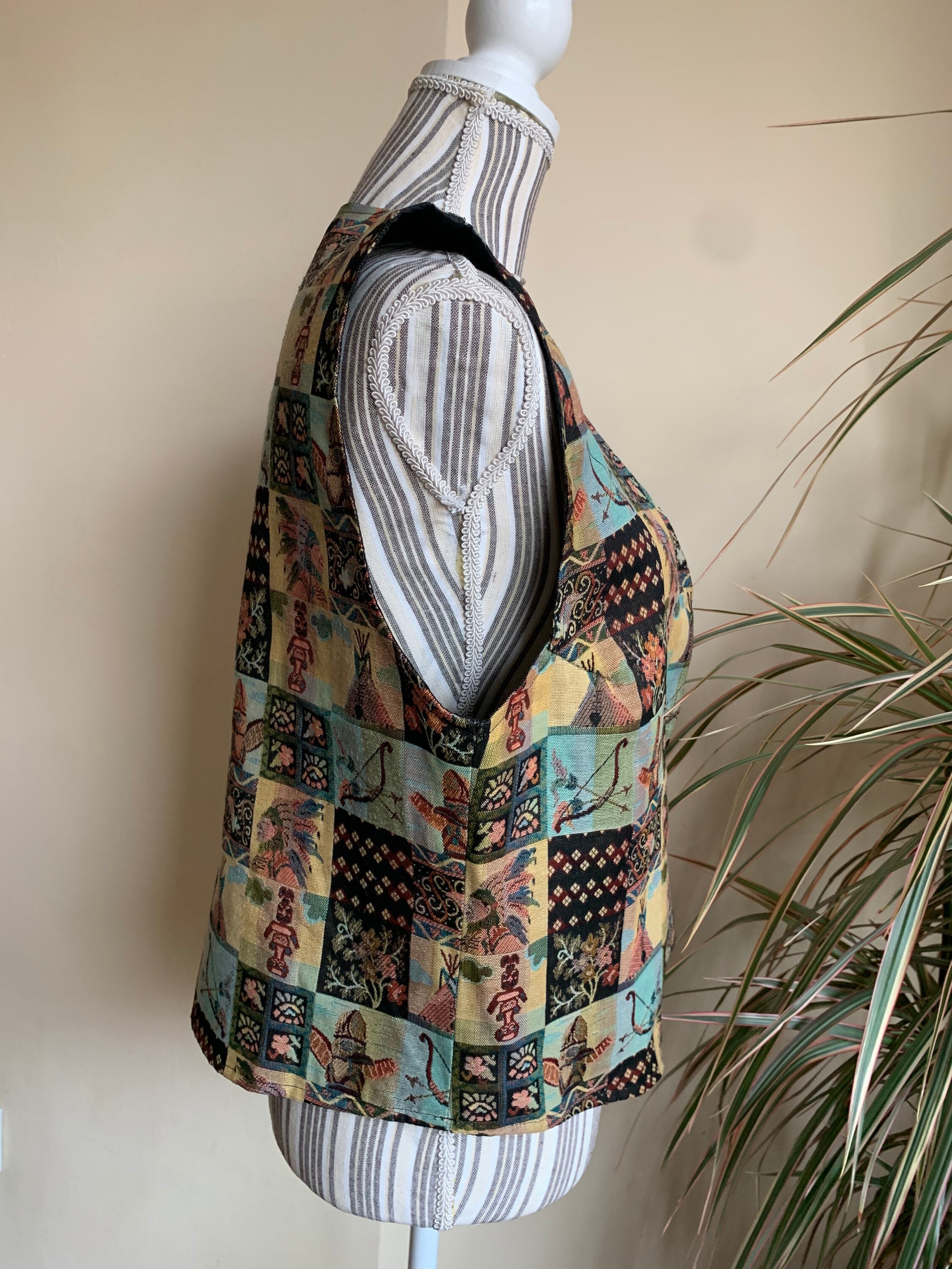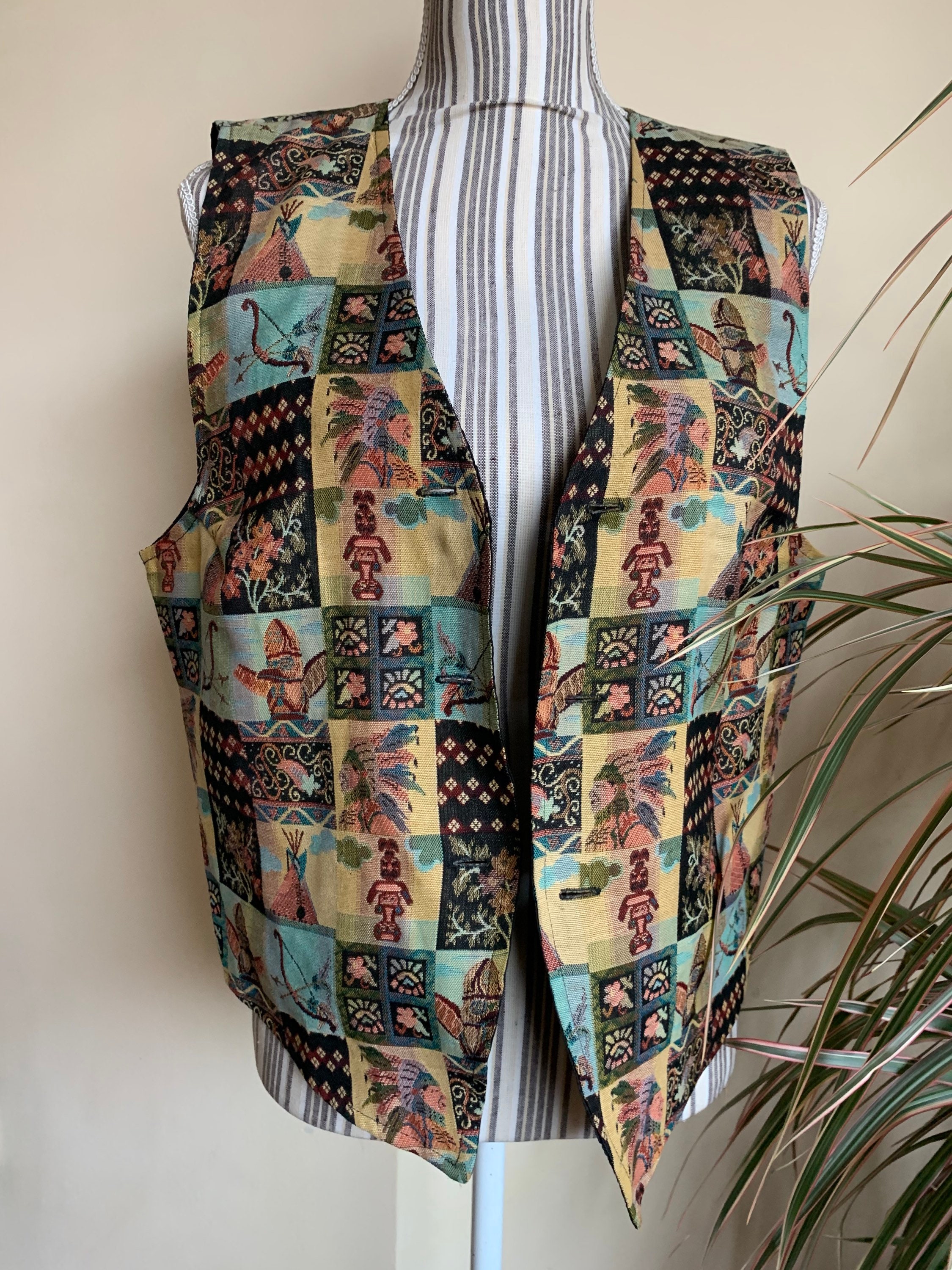 Beautiful southwestern vest from the 90s with tribal mosaic print. This tapestry waistcoat is the perfect boho festival piece of clothing. This cute women's vest is by the brand Miss Joy. The size marked is 40, it fits like size L. As it has a unisex print, and boxy look it would look good on men also. It has a loose boxy fit. Please check the measurements below.