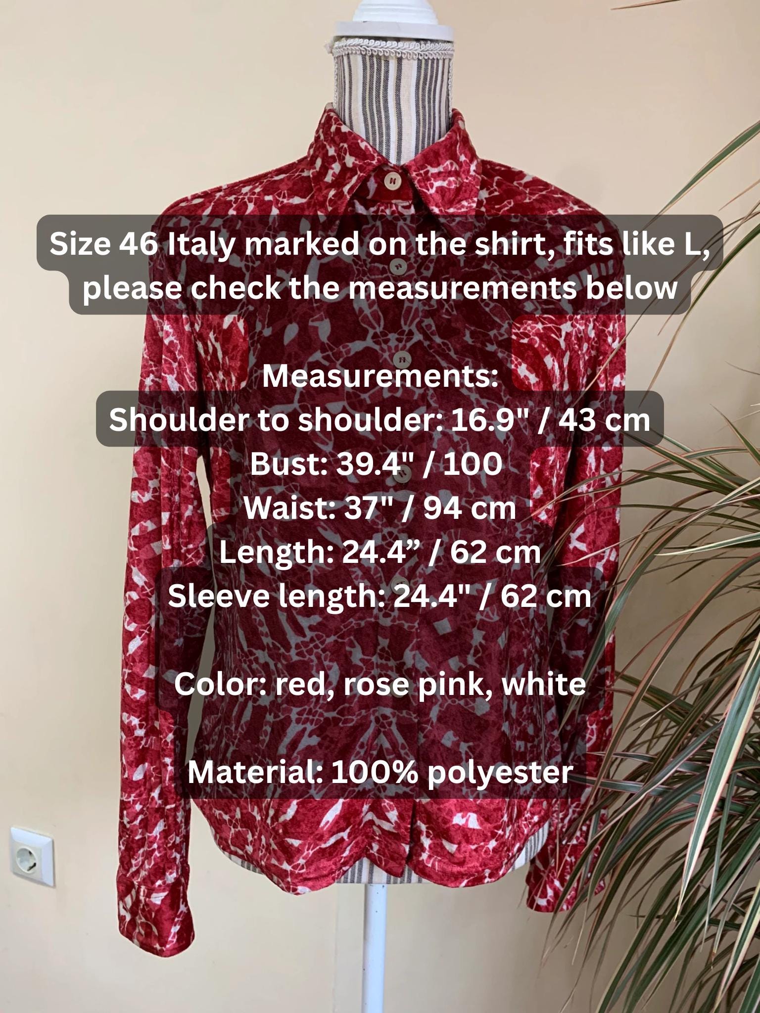 This is vintage 90s collared shirt for women with abstract novelty print in red, pink and white. This red velvet shirt is made of stretchy polyester fabric. It is by the brand United Colors of Benetton. Size 46 is marked on the shirt. It fits like size M/L , please check the measurements below.