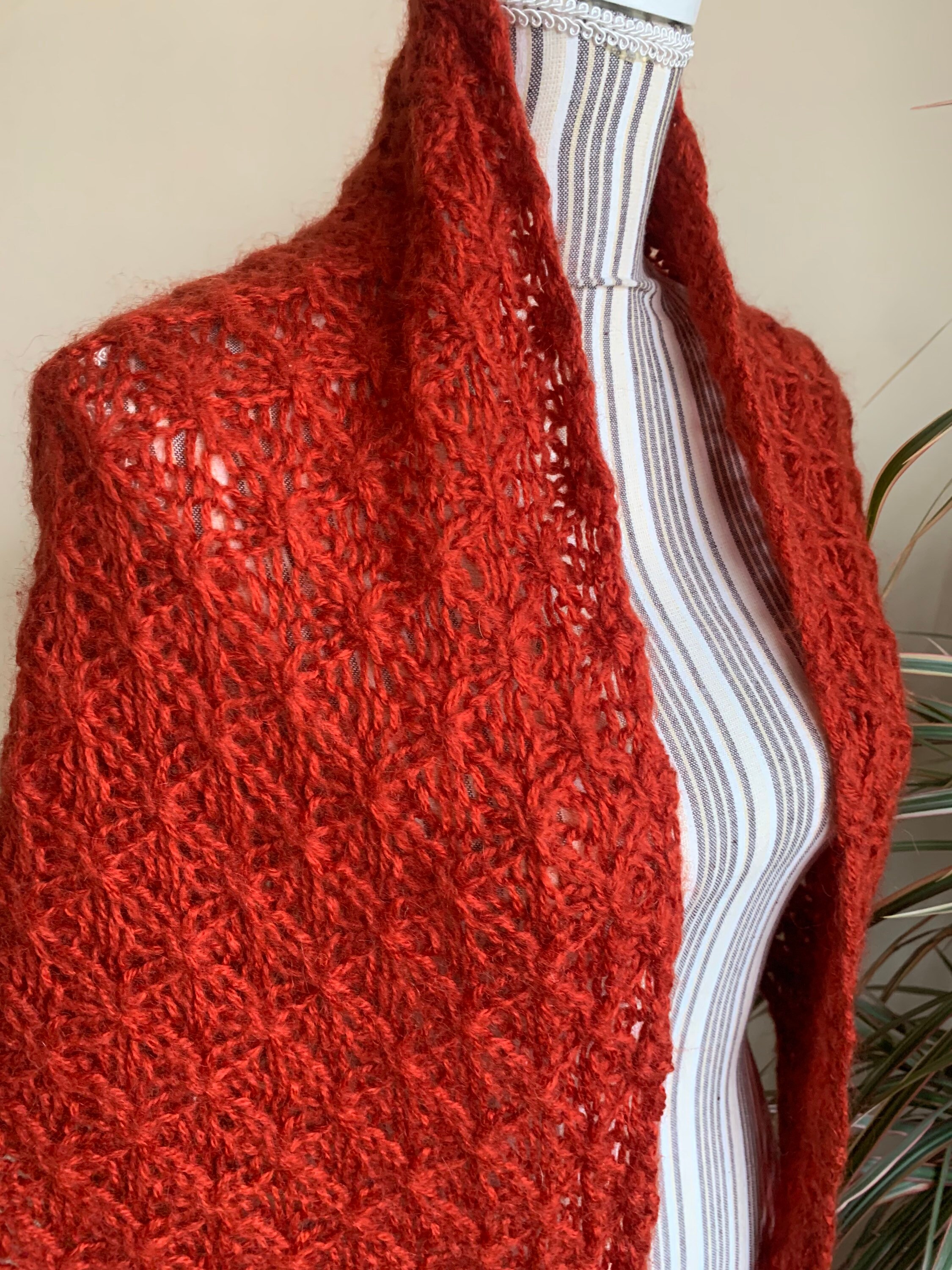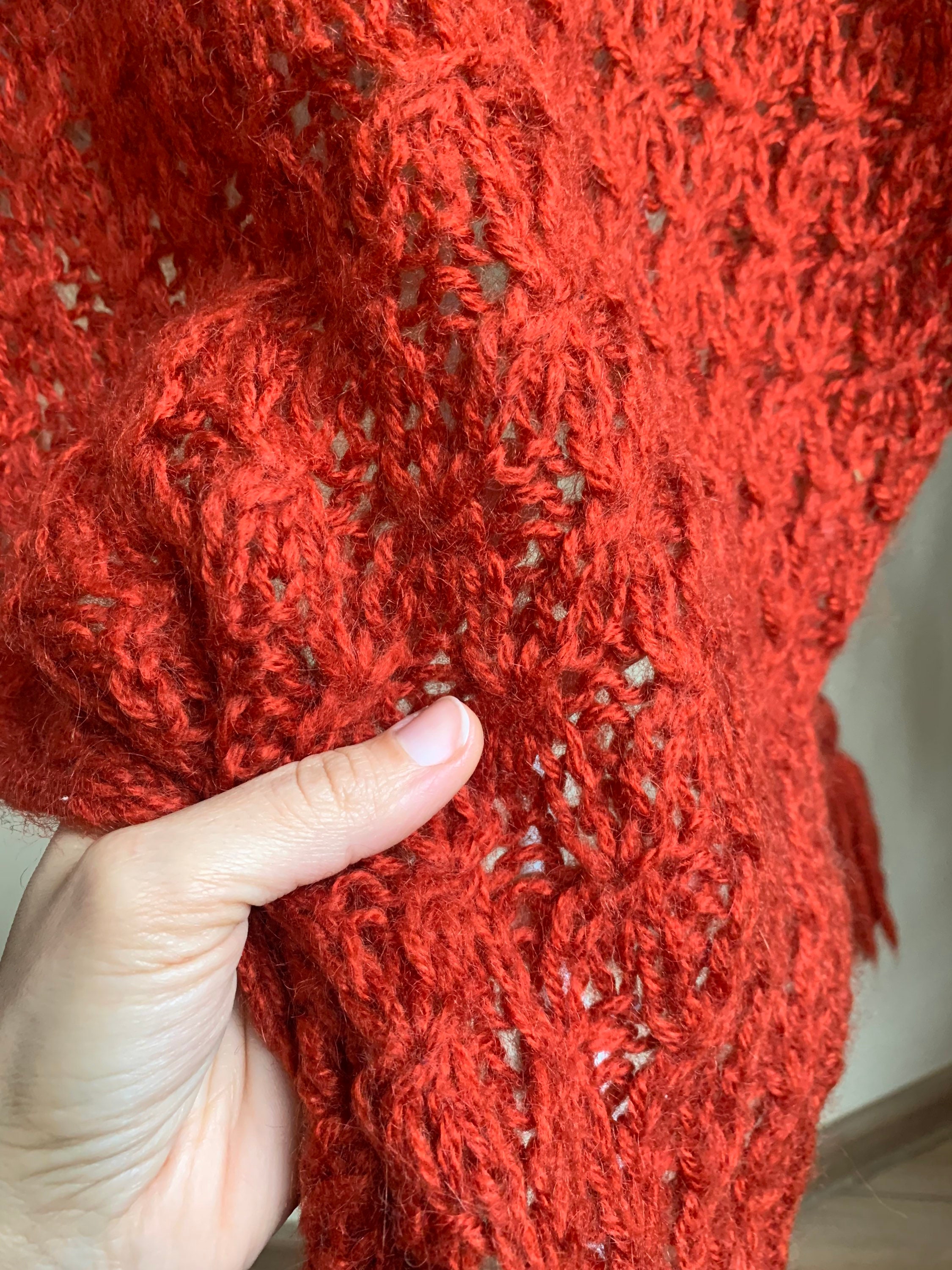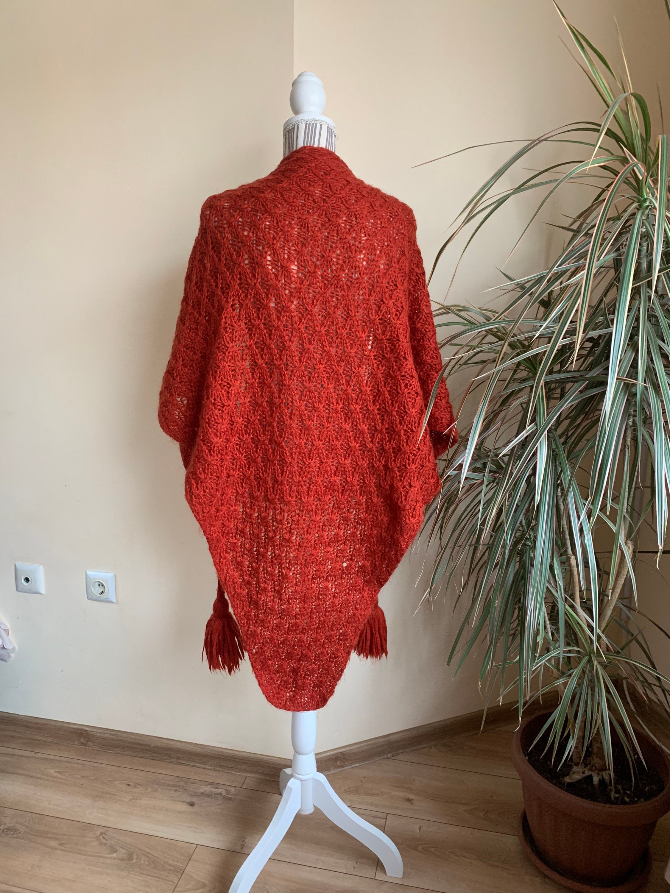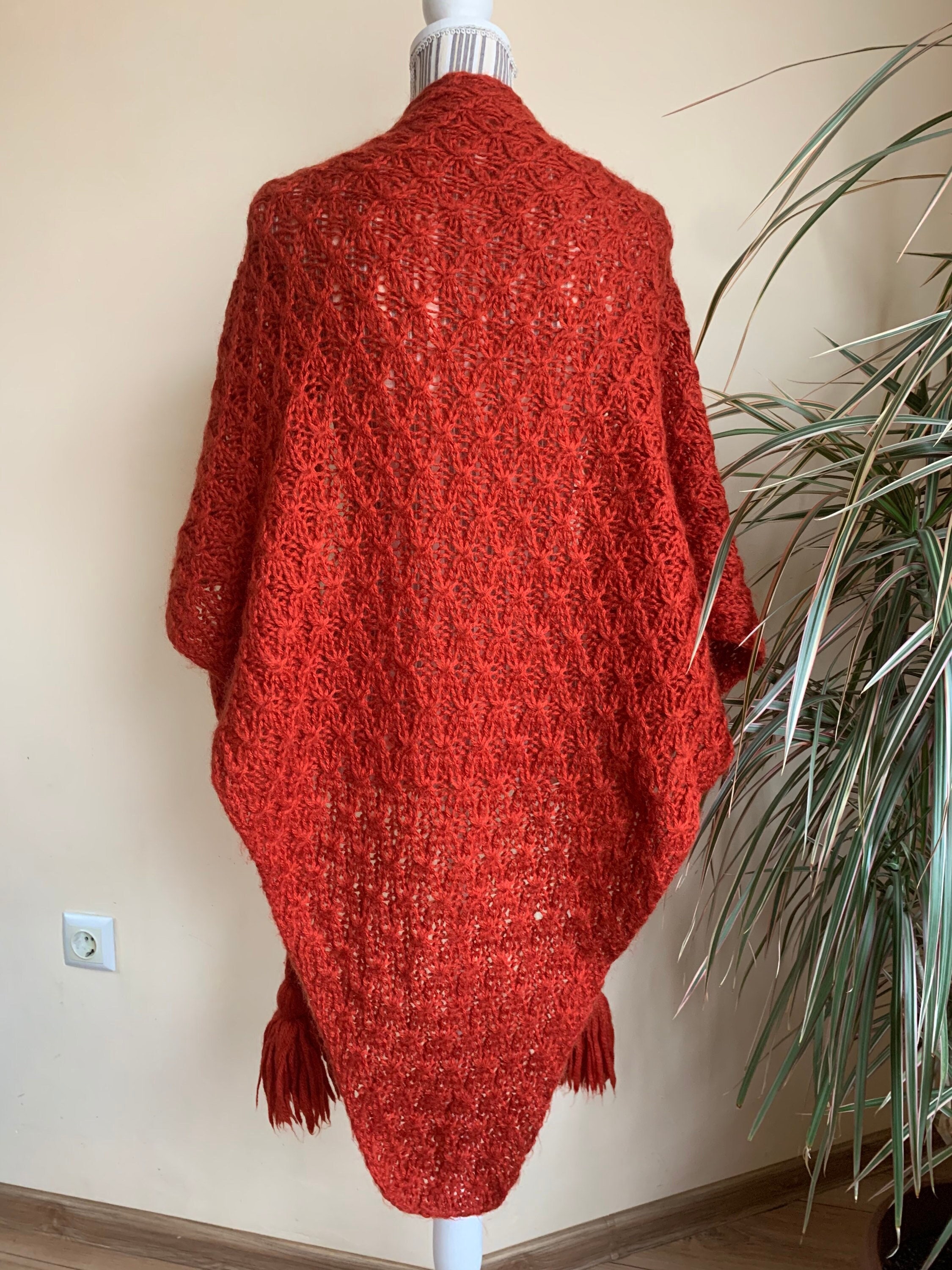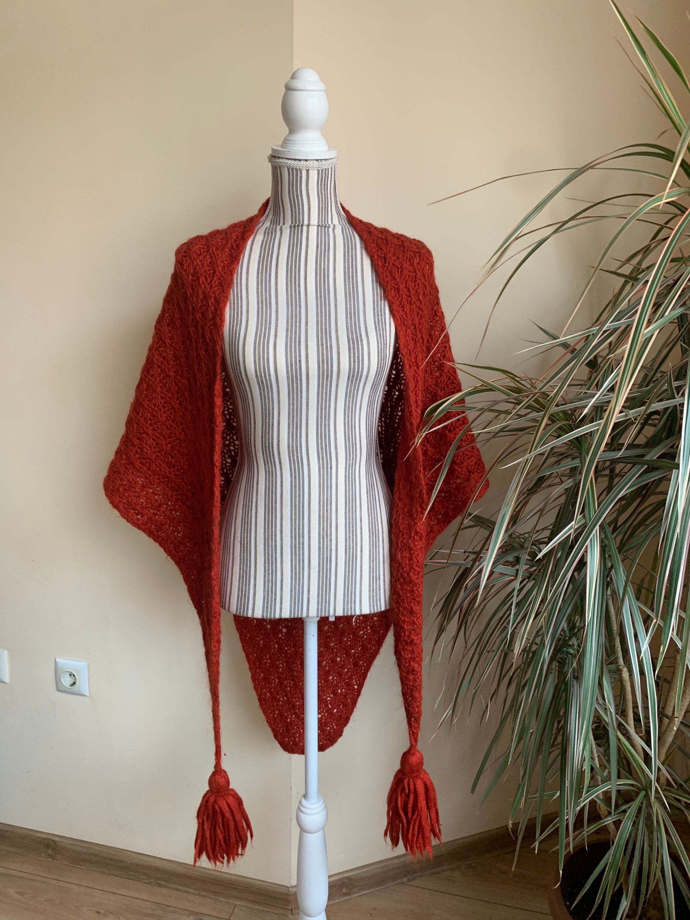 This vintage chunky wool blend hand knit shawl in orange brown color with two large tassels at the ends. This boho triangle shawl is a unique and artistic piece that can add a bohemian touch to any outfit. The oversized design and warm, natural fibers make it perfect for staying cozy during the colder months. The boho and hippie vibes can add a touch of free-spirited style to any look. This large triangle shawl can be worn in a variety of ways, such as draped over the shoulders or wrapped around the neck, and can be a great addition to any outfit, whether you're going for a casual or more elevated look. This vintage large knit scarf is a perfect gift for your sister, mother or grandmother.