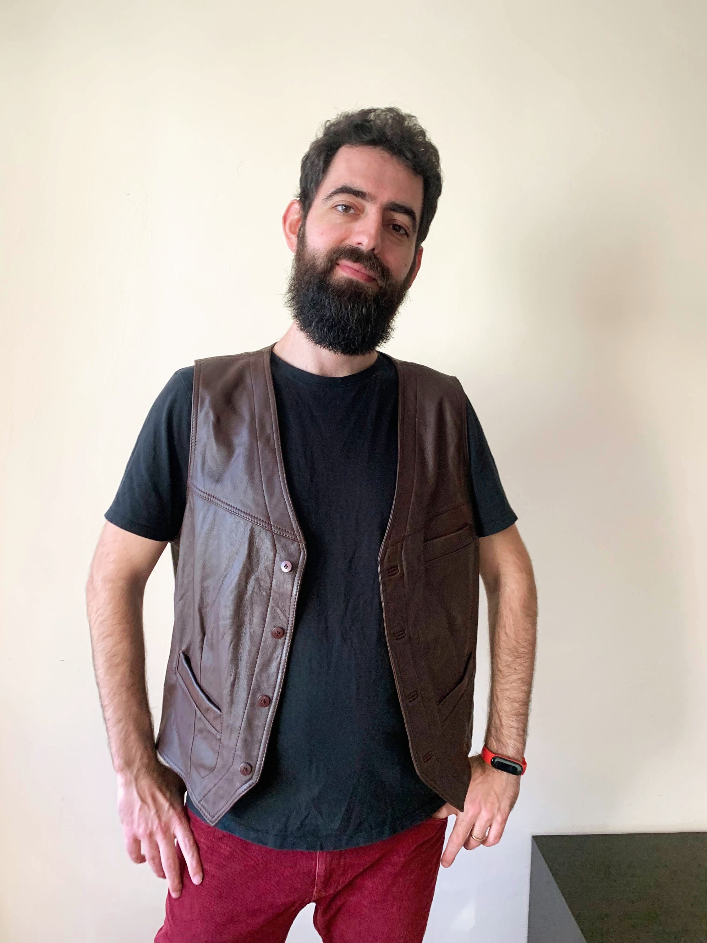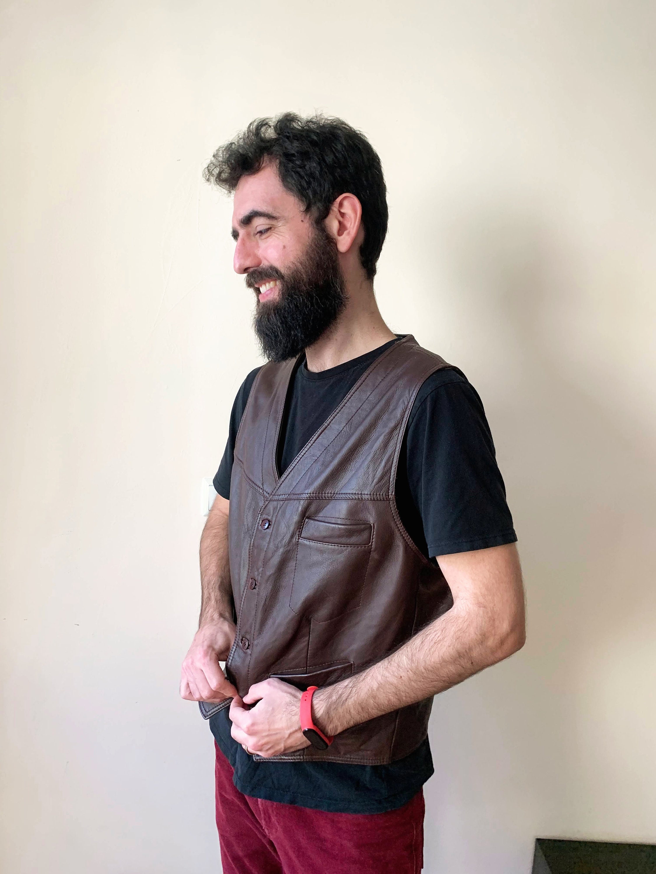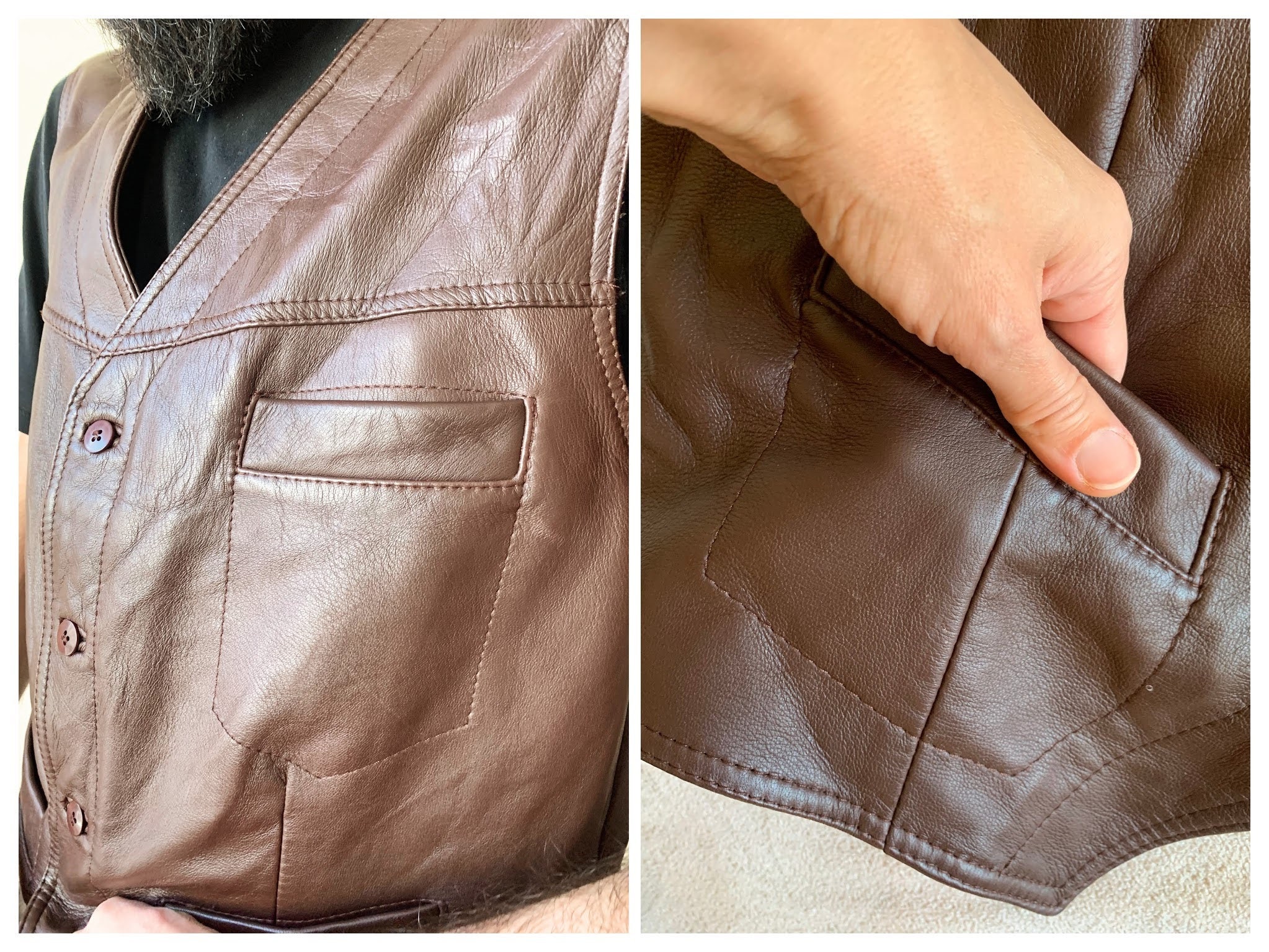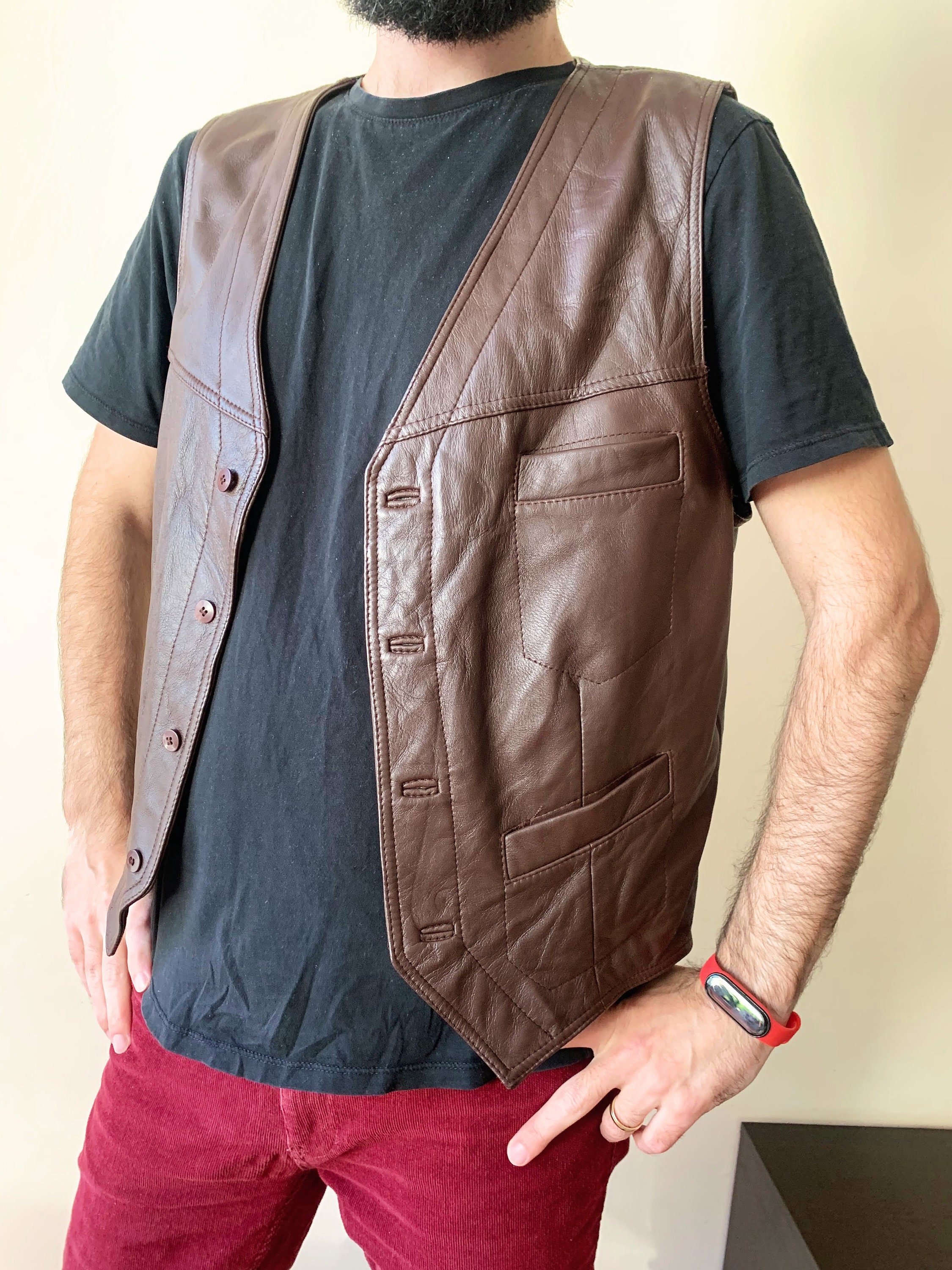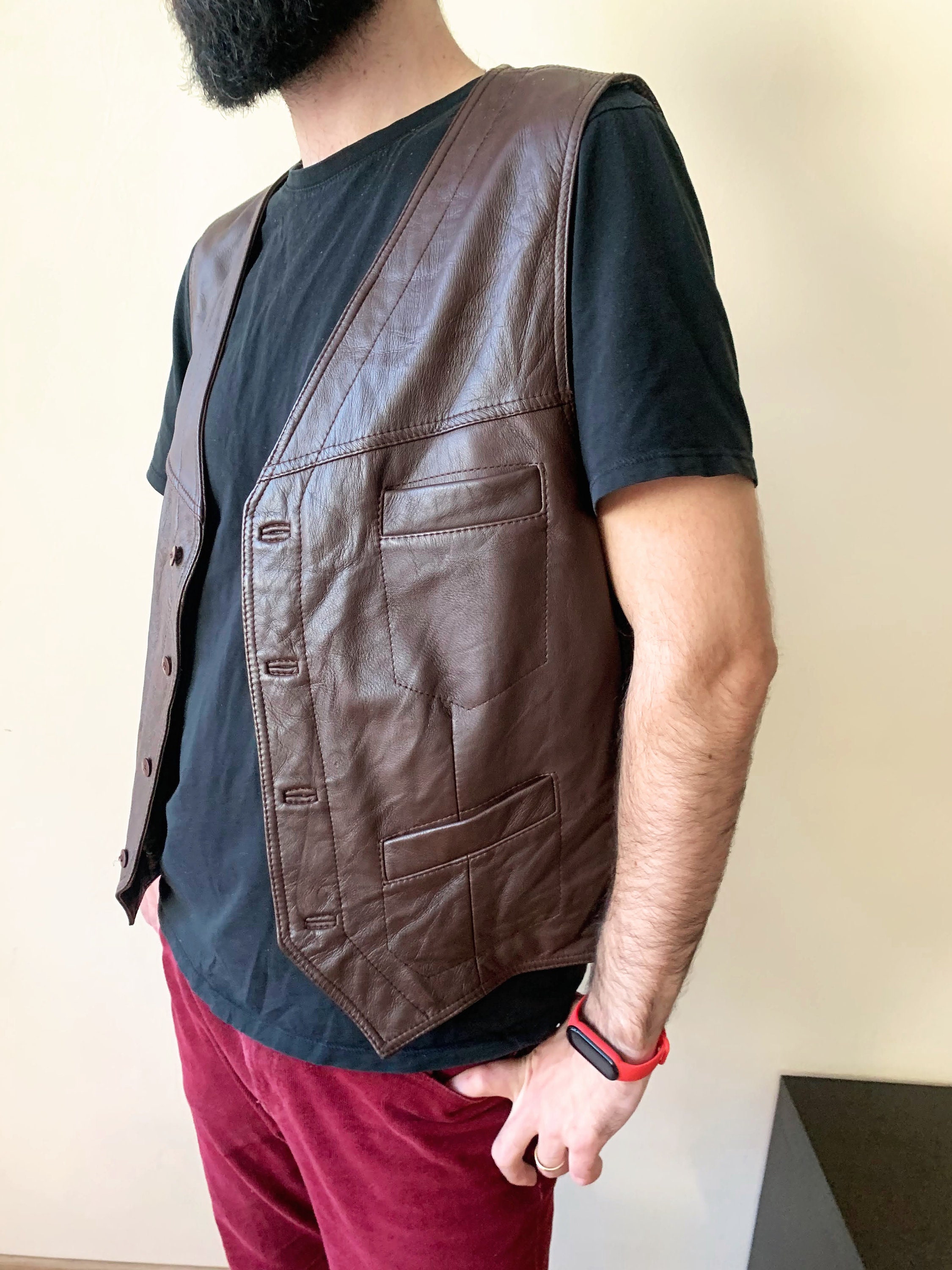 This is a vintage 80s brown leather vest for men with button front closure and pockets. This biker vest is made of soft and durable genuine leather. It has a button-up front closure for a secure fit. Perfect leather waistcoat for wearing on the road or at a motorcycle event. This vest will add a stylish touch to any outfit. This rocker leather vest is so versatile, you can wear it in so many different ways. Wear it over a basic tshirt for a more casual look or pair with a collared button up shirt for a western cowboy look. This brown leather vest is size 54. My husband is modelling the garment. He wears size 52 or M/L, he is 5' 11" / 180 cm tall . Please check the measurements below.
