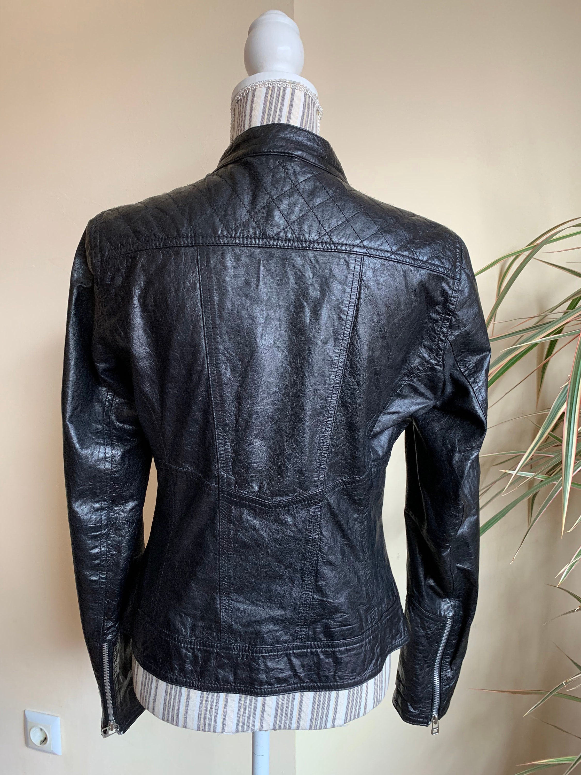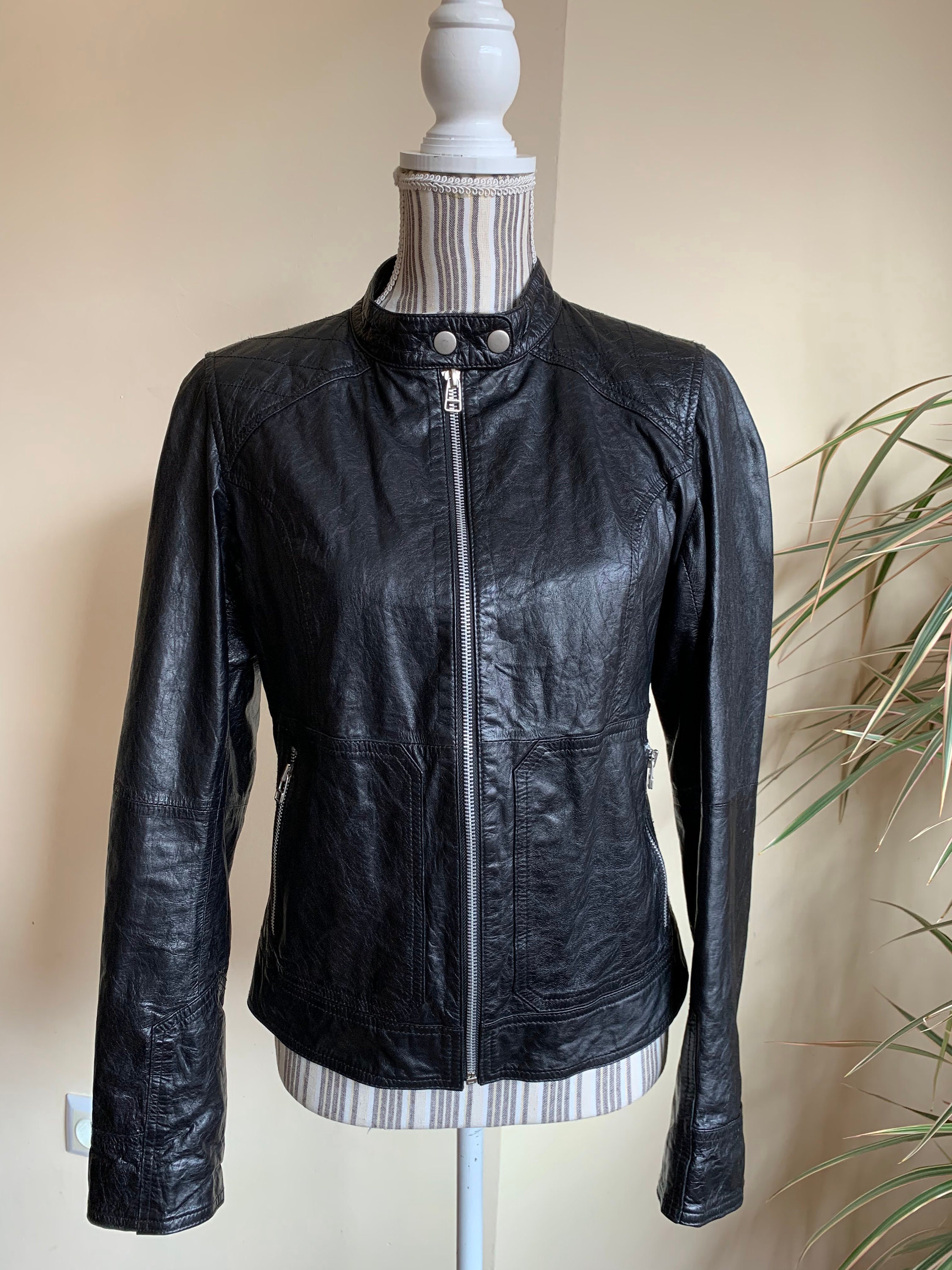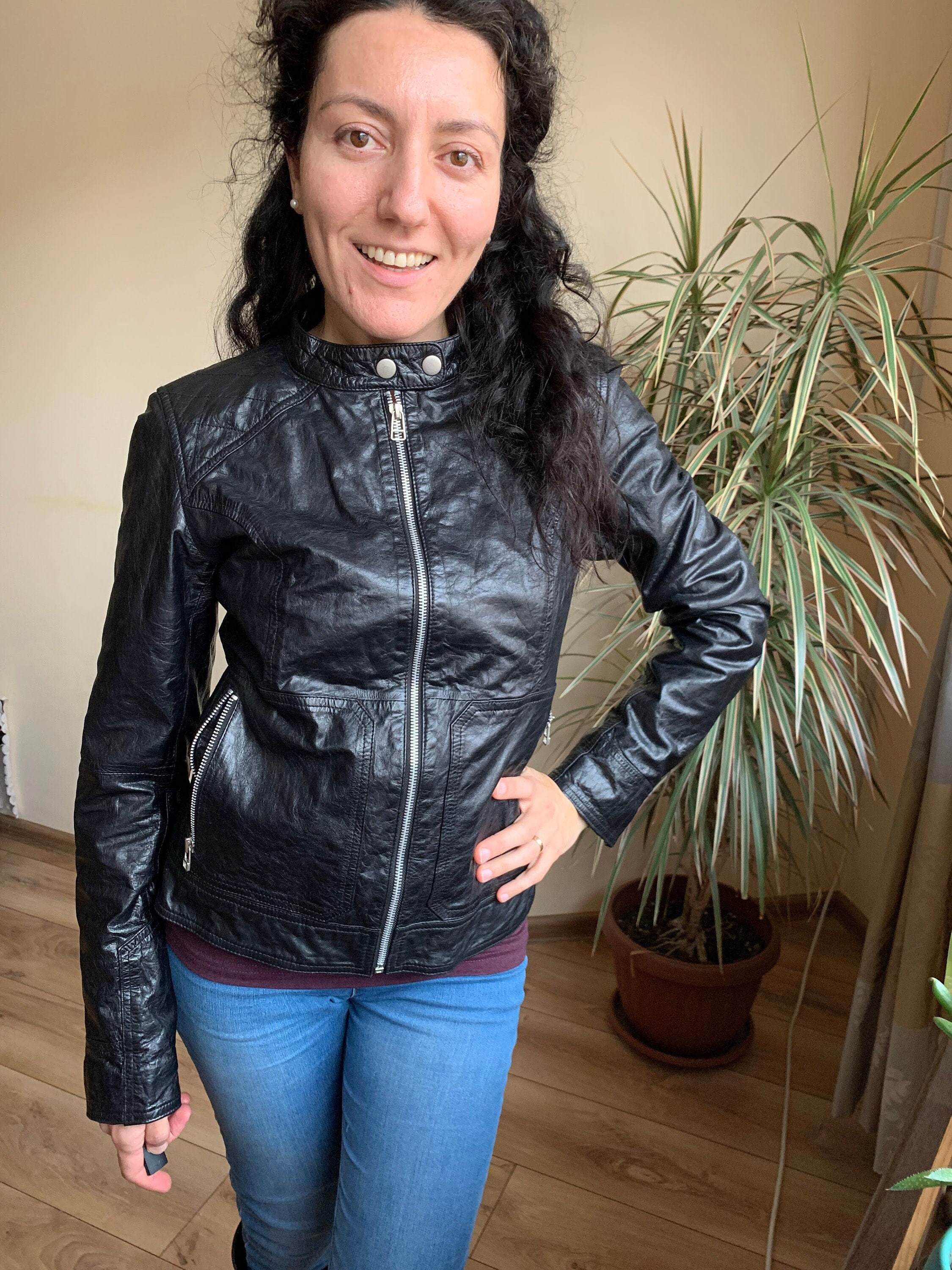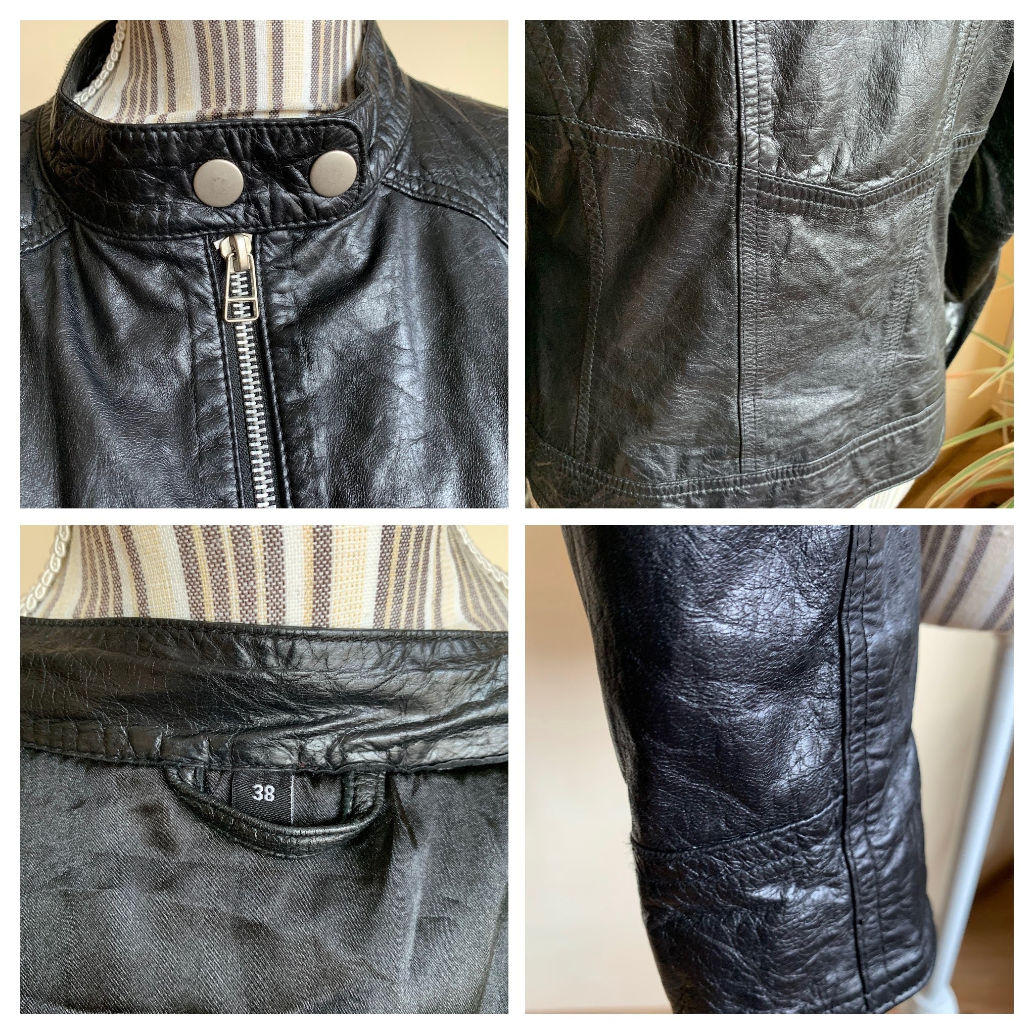This is a vintage 90s super soft genuine leather jacket for women with zip up closure and band collar. This leather biker jacket is made of super thin, super soft real leather which has a distressed look due to the creases and wrinkles that it has formed with the wear. This moto jacket for women has two zip up pockets. The intetior is lined in black polyester fabric. The size marked on this motorcycle jacket is 38, which fits like S or M. I am modelling this black leather jacket. I wear size S, EUR 36, US 6, UK 10. I am 5'3" / 160 cm tall. Please check the measurements below.