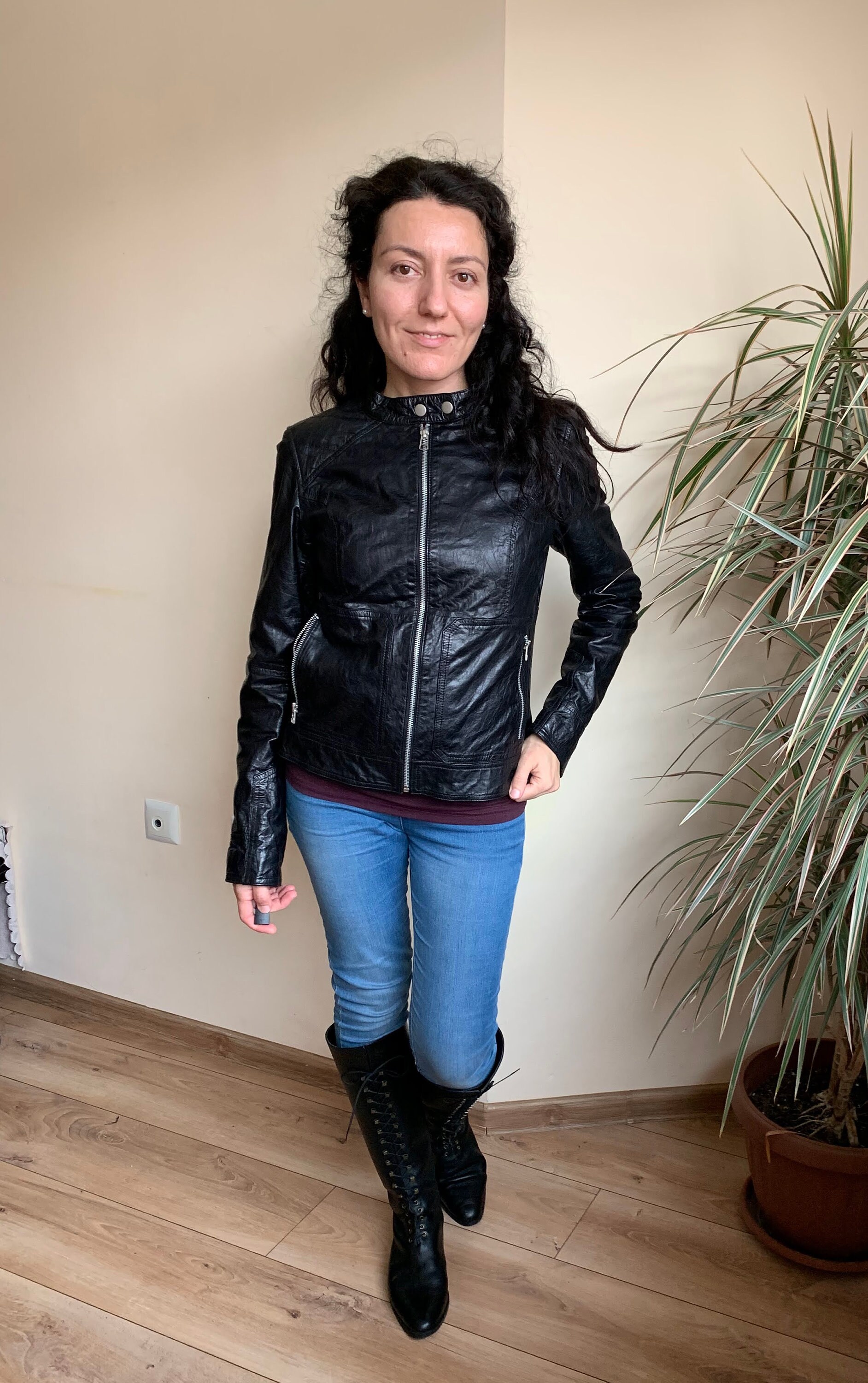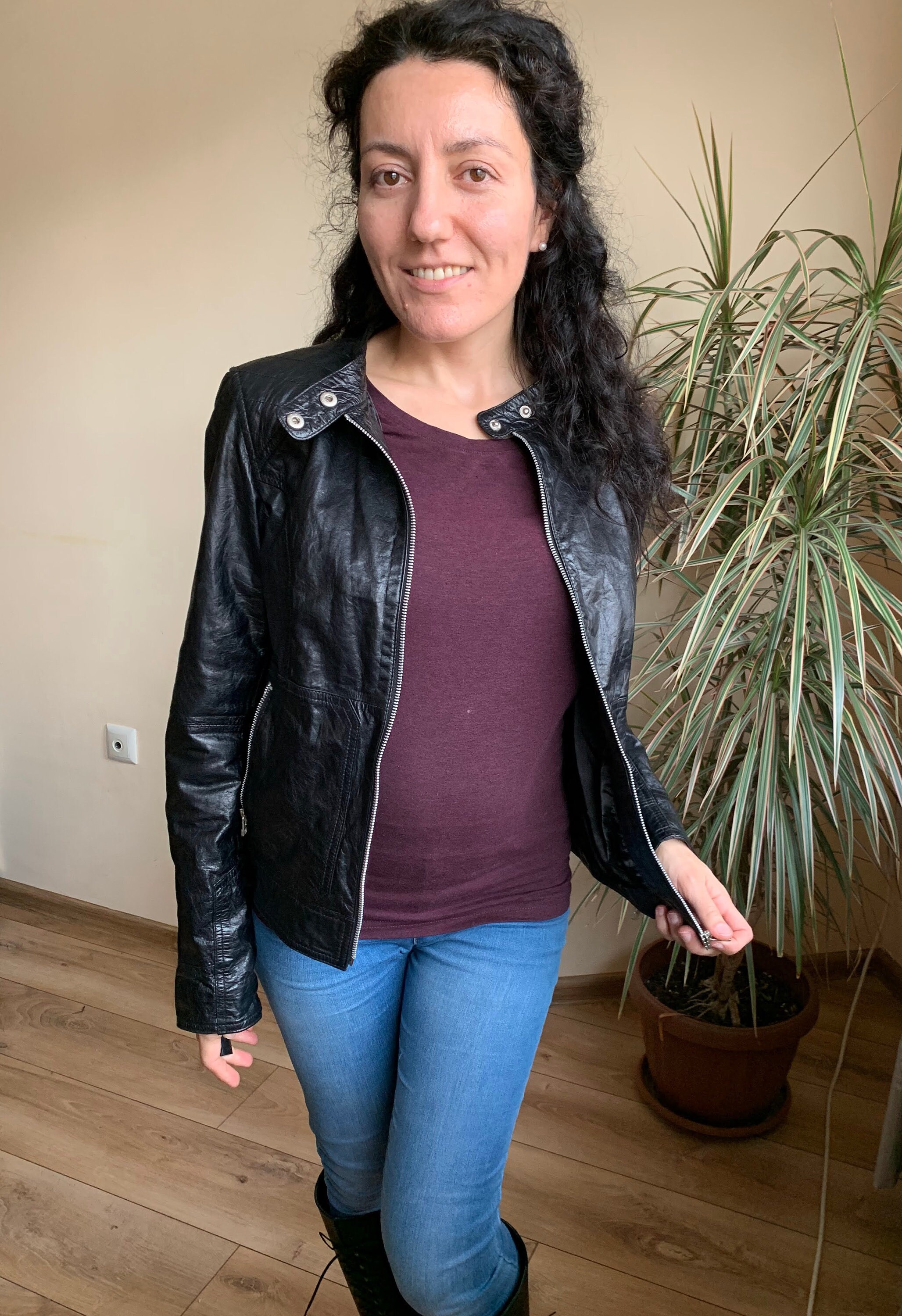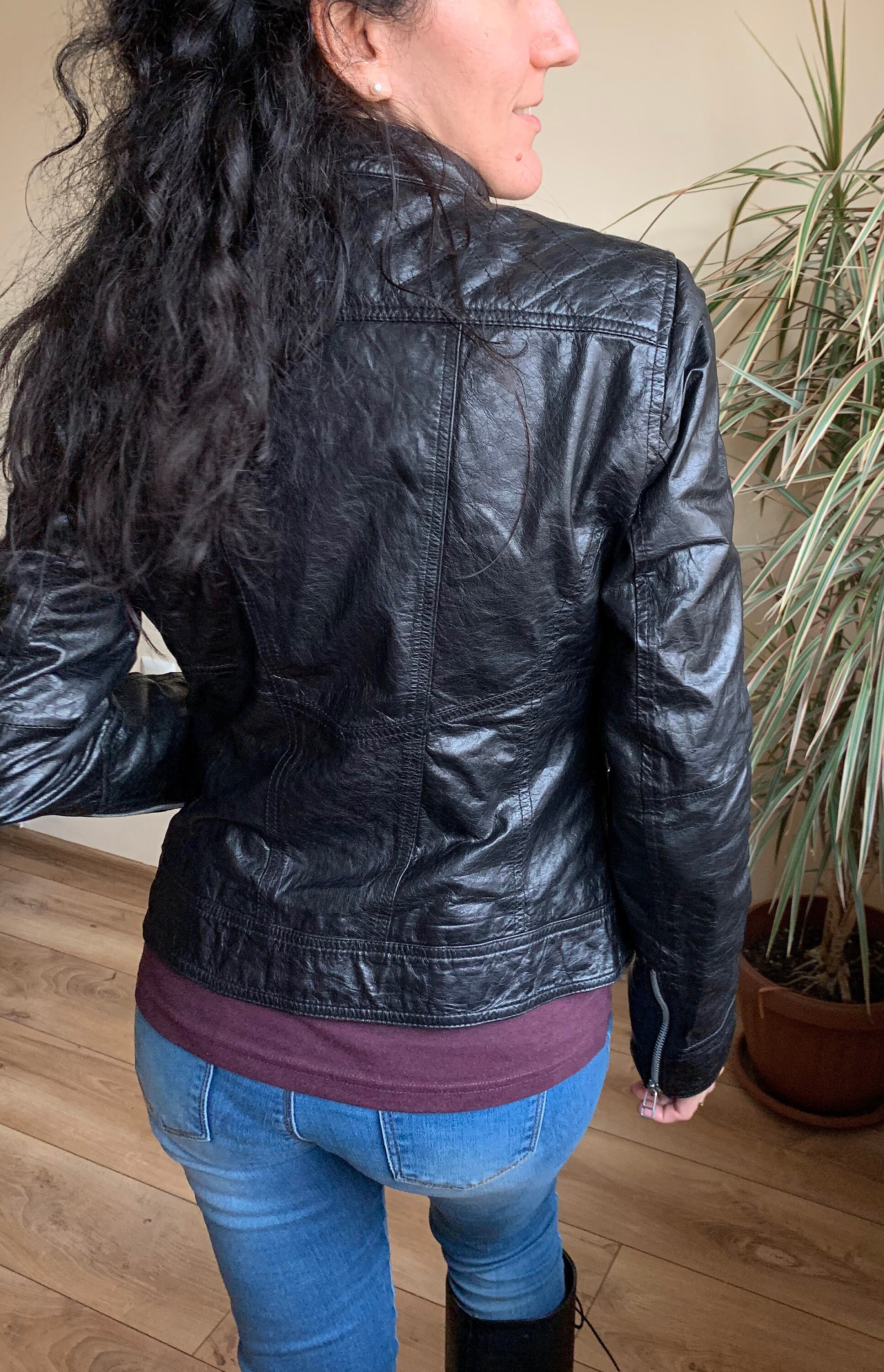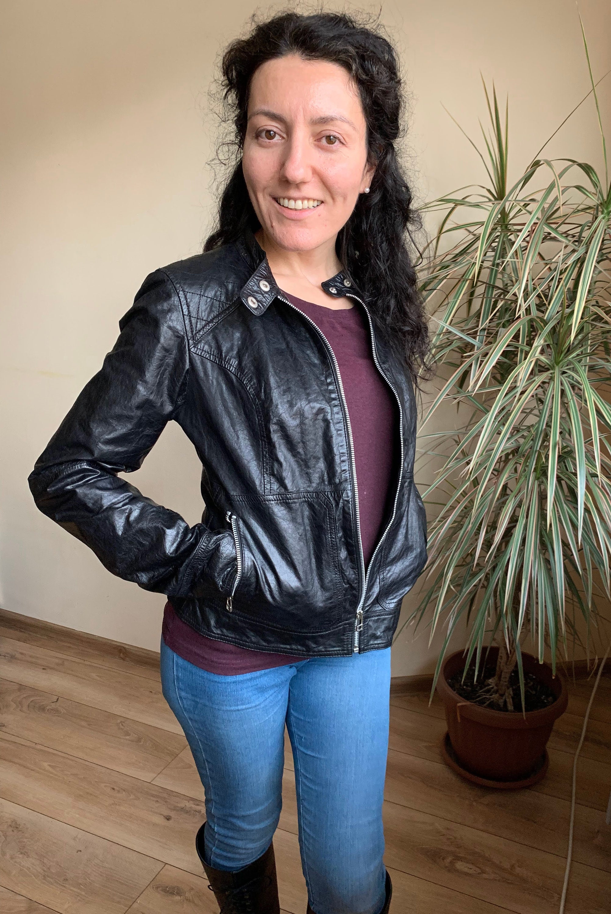 This is a vintage 90s super soft genuine leather jacket for women with zip up closure and band collar. This leather biker jacket is made of super thin, super soft real leather which has a distressed look due to the creases and wrinkles that it has formed with the wear. This moto jacket for women has two zip up pockets. The intetior is lined in black polyester fabric. The size marked on this motorcycle jacket is 38, which fits like S or M. I am modelling this black leather jacket. I wear size S, EUR 36, US 6, UK 10. I am 5'3" / 160 cm tall. Please check the measurements below.