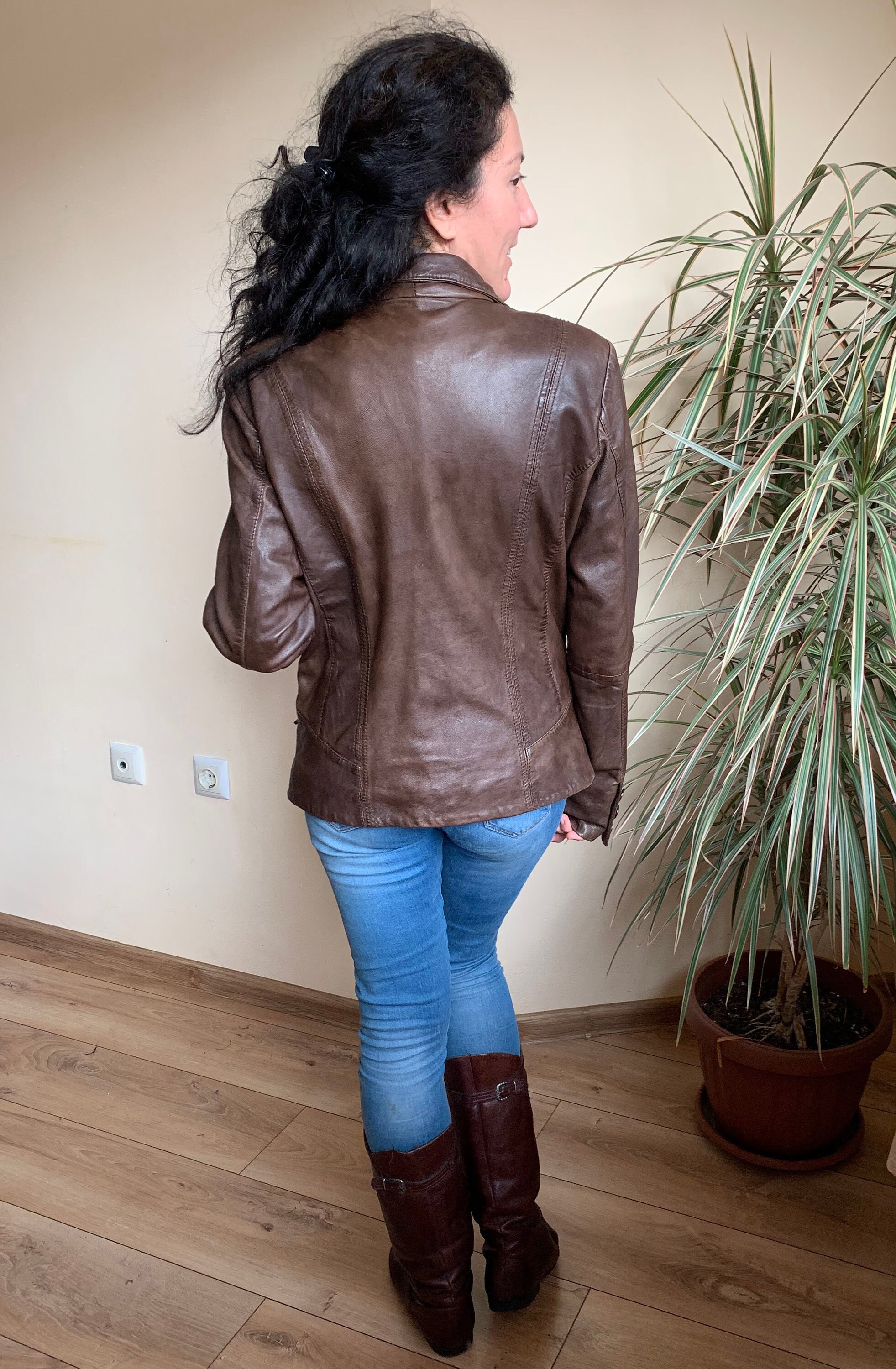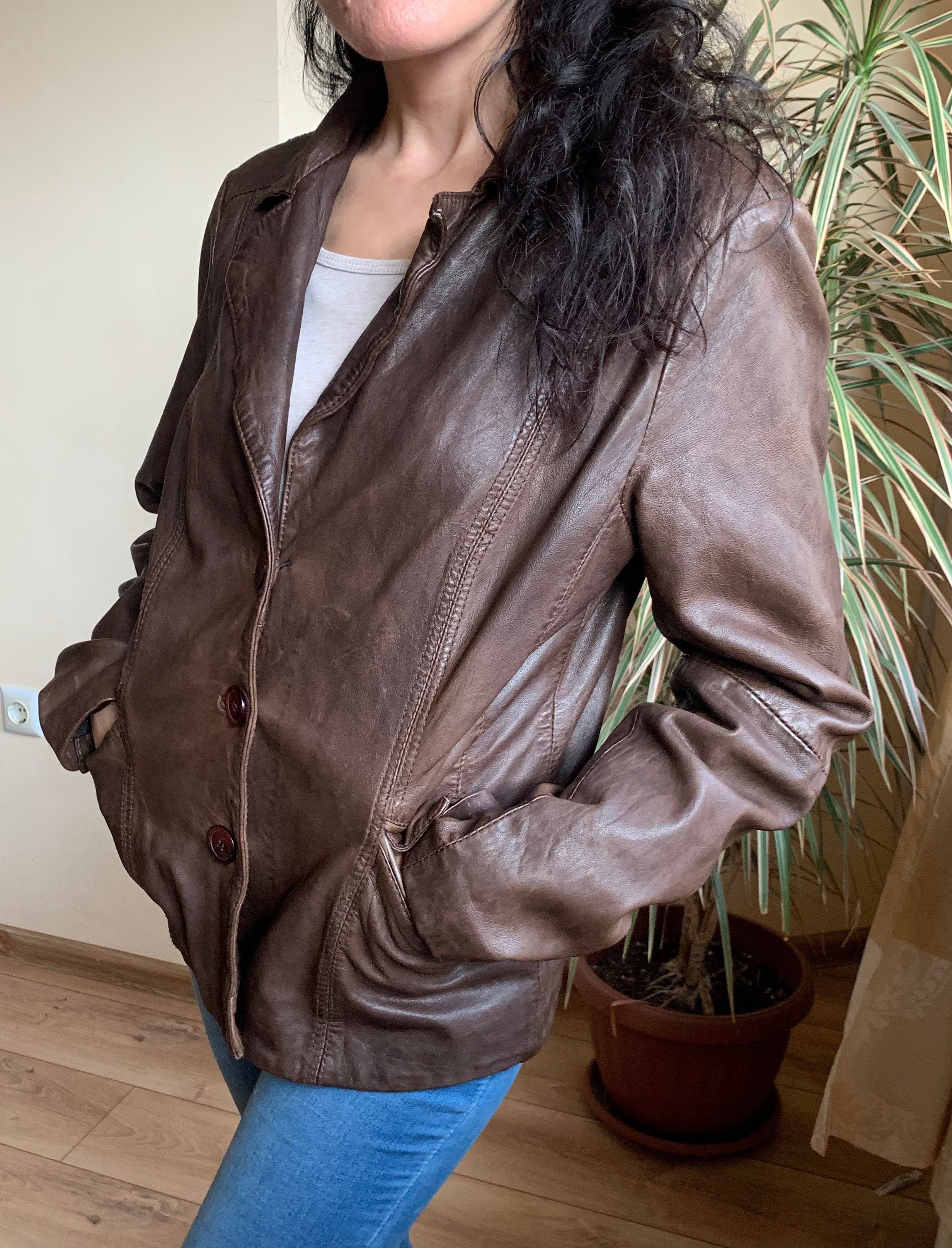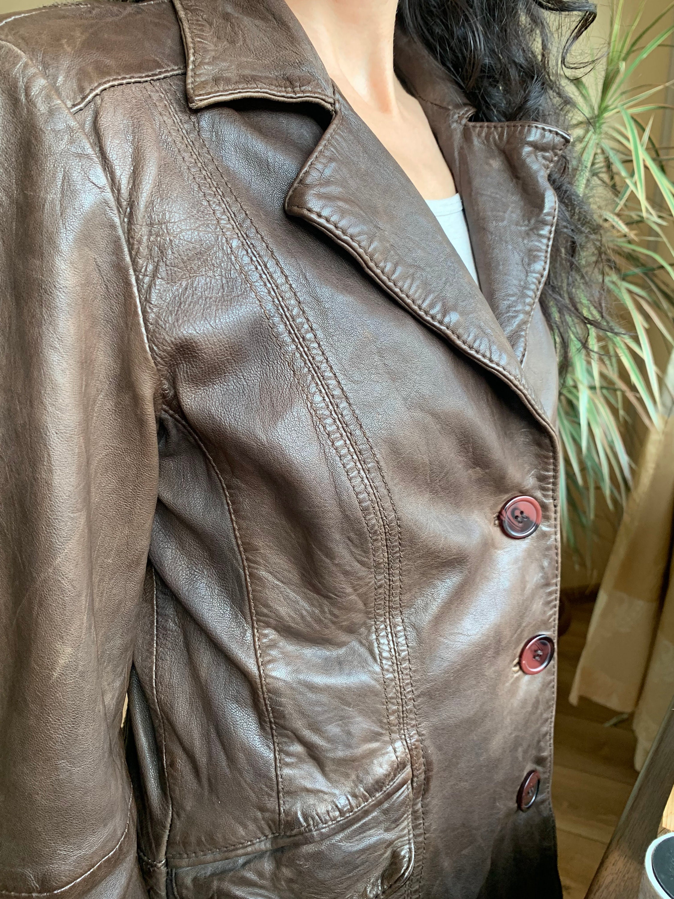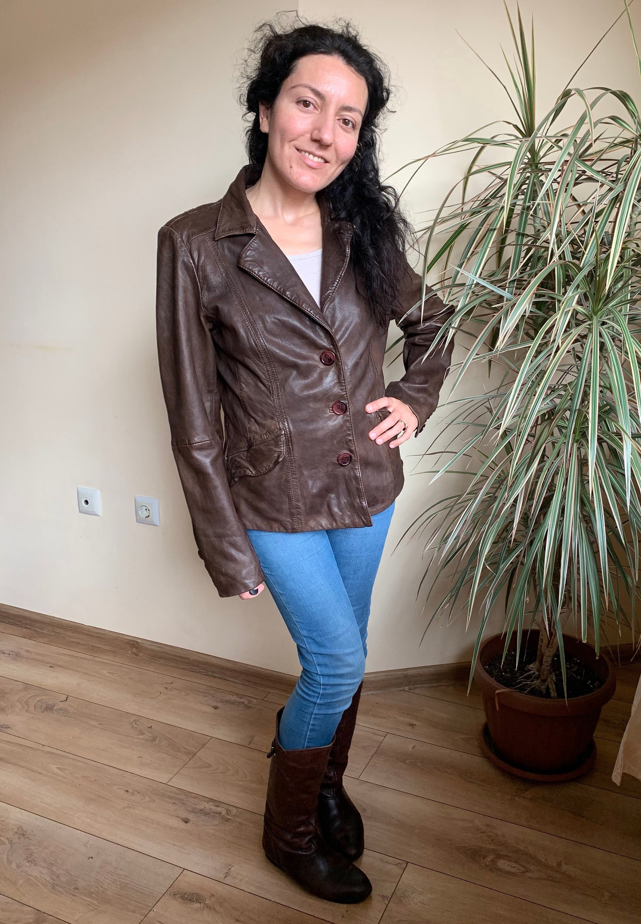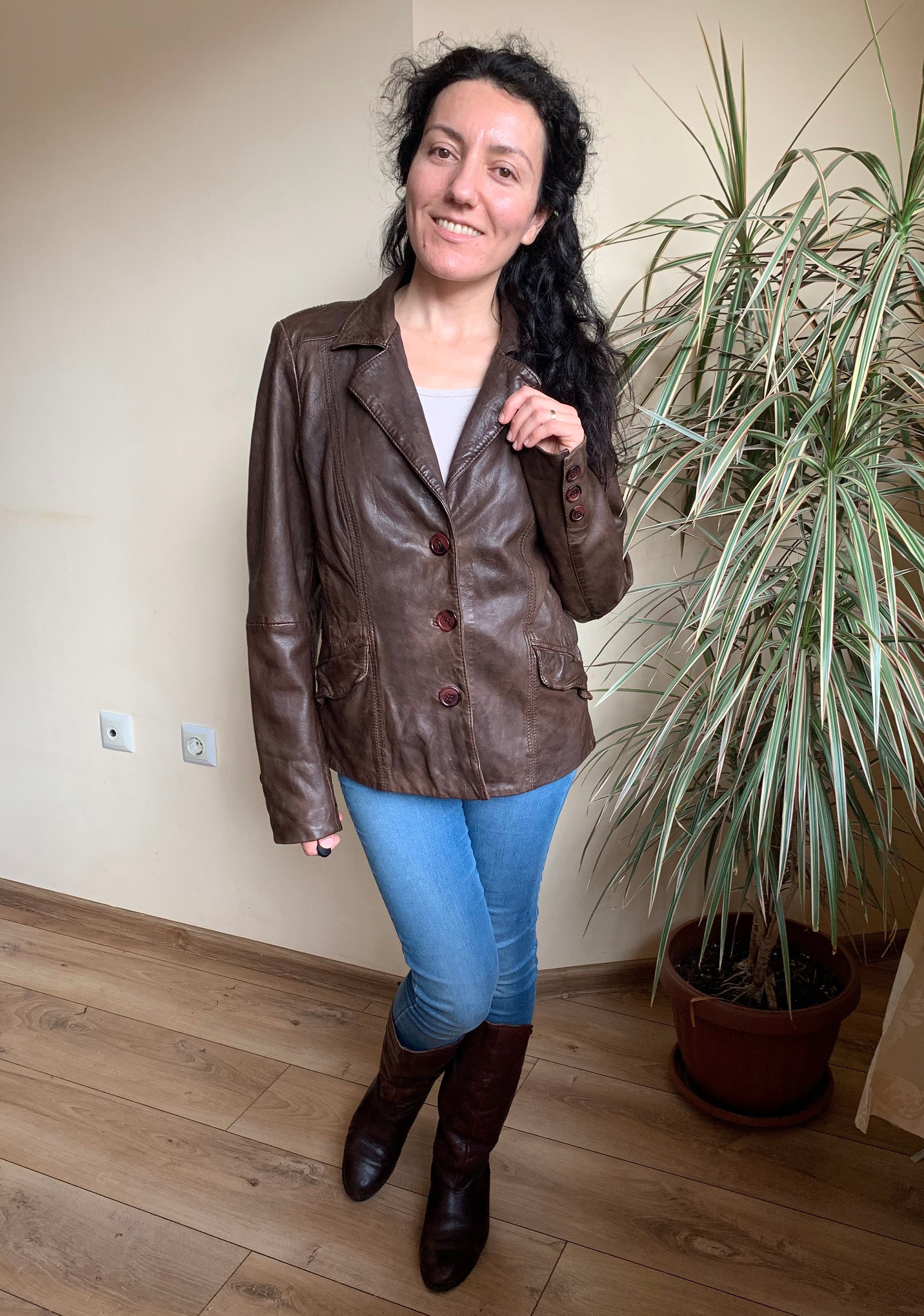 This is a beautiful vintage 90s brown leather blazer for women with button up closure. This vintage leather blazer is made of soft genuine leather in chocolate brown color. The leather was much loved and well worn, it has an aged leather look. The size marked is M 38. I am modelling this brown leather jacket and I wear size S, EU 36, US 6, UK 10. I am 5'3" /160 cm tall. It looks a bit too big on me, slightly oversized. Please check the measurements below.