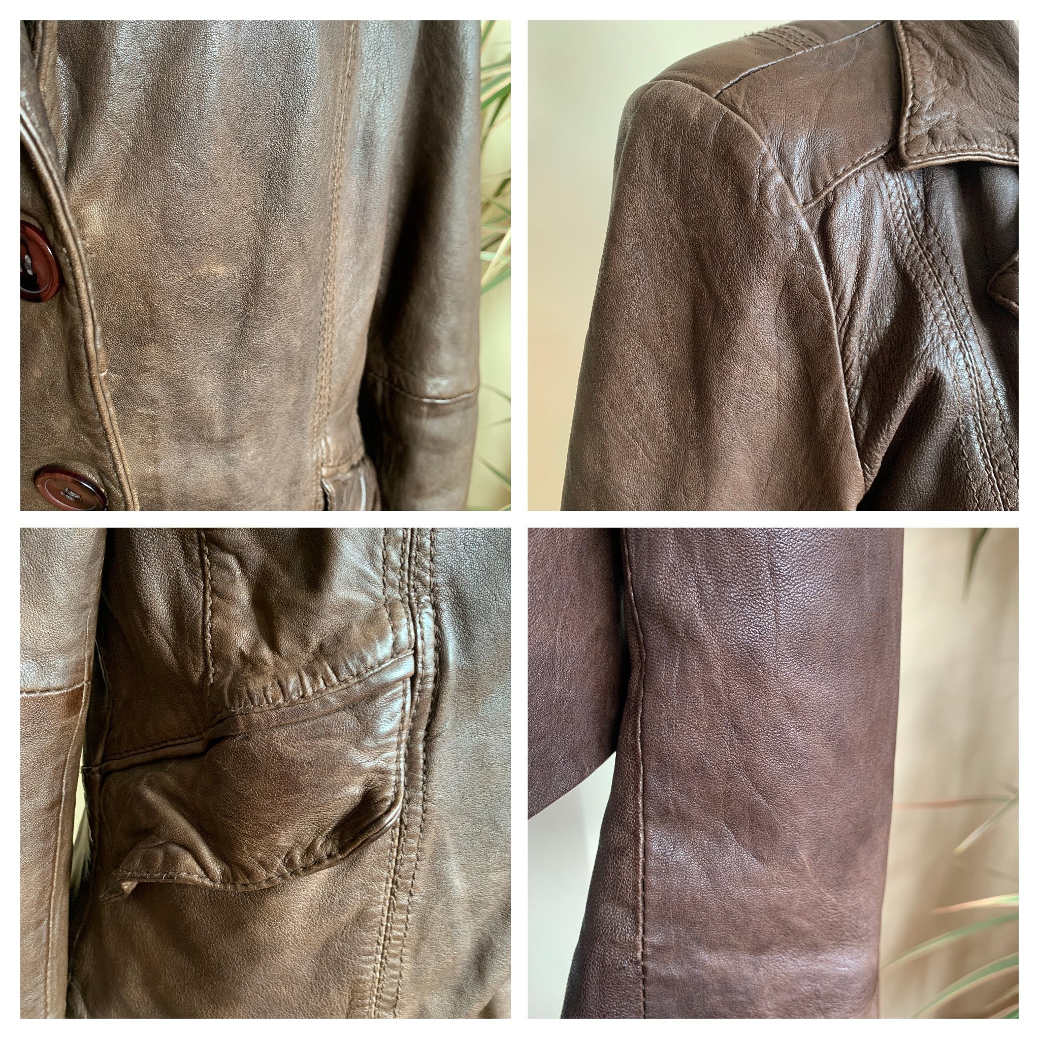 Condition: This bown leather blazer was much loved, the leather is well worn and has a distressed look. There are creases on the collar and the lids of the pockets. The leather has become softer with the wear, especially around the shoulders and the sleeves. It has become a shade lighter around the edges of the sleeves and shows some scratches too. Beautifully aged look.