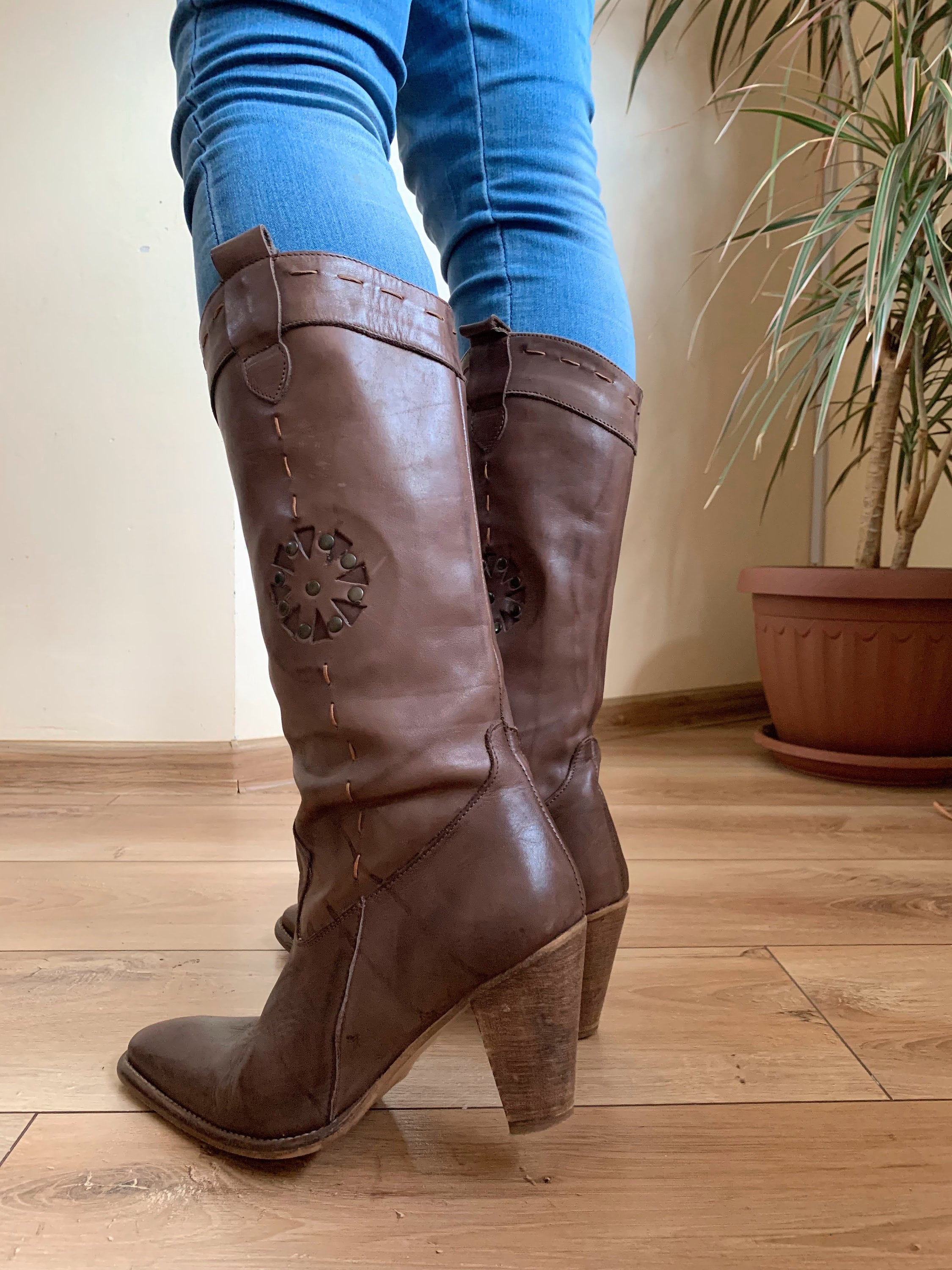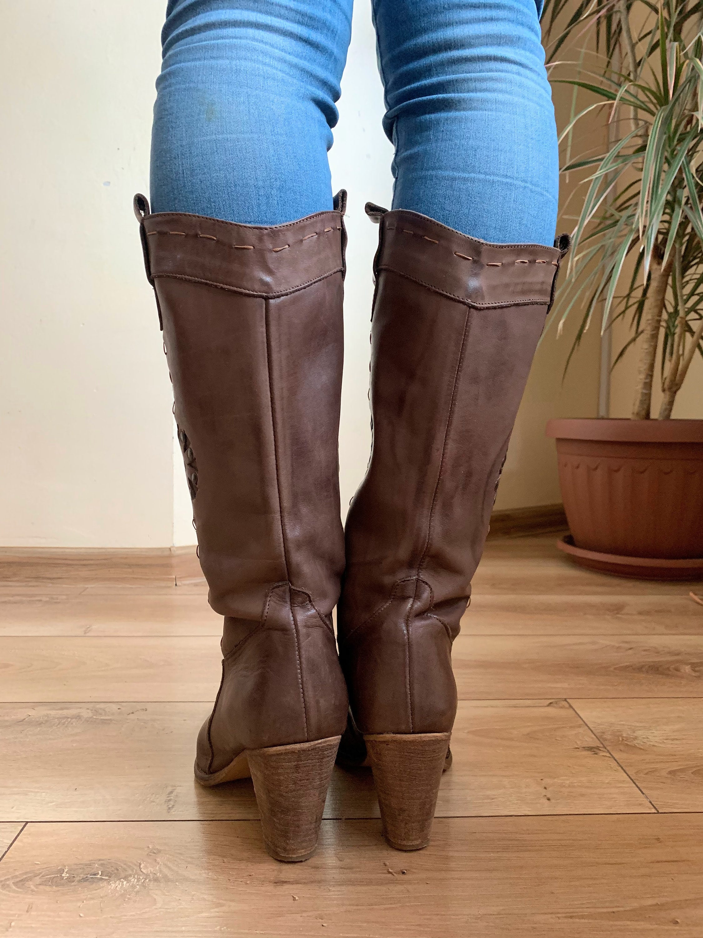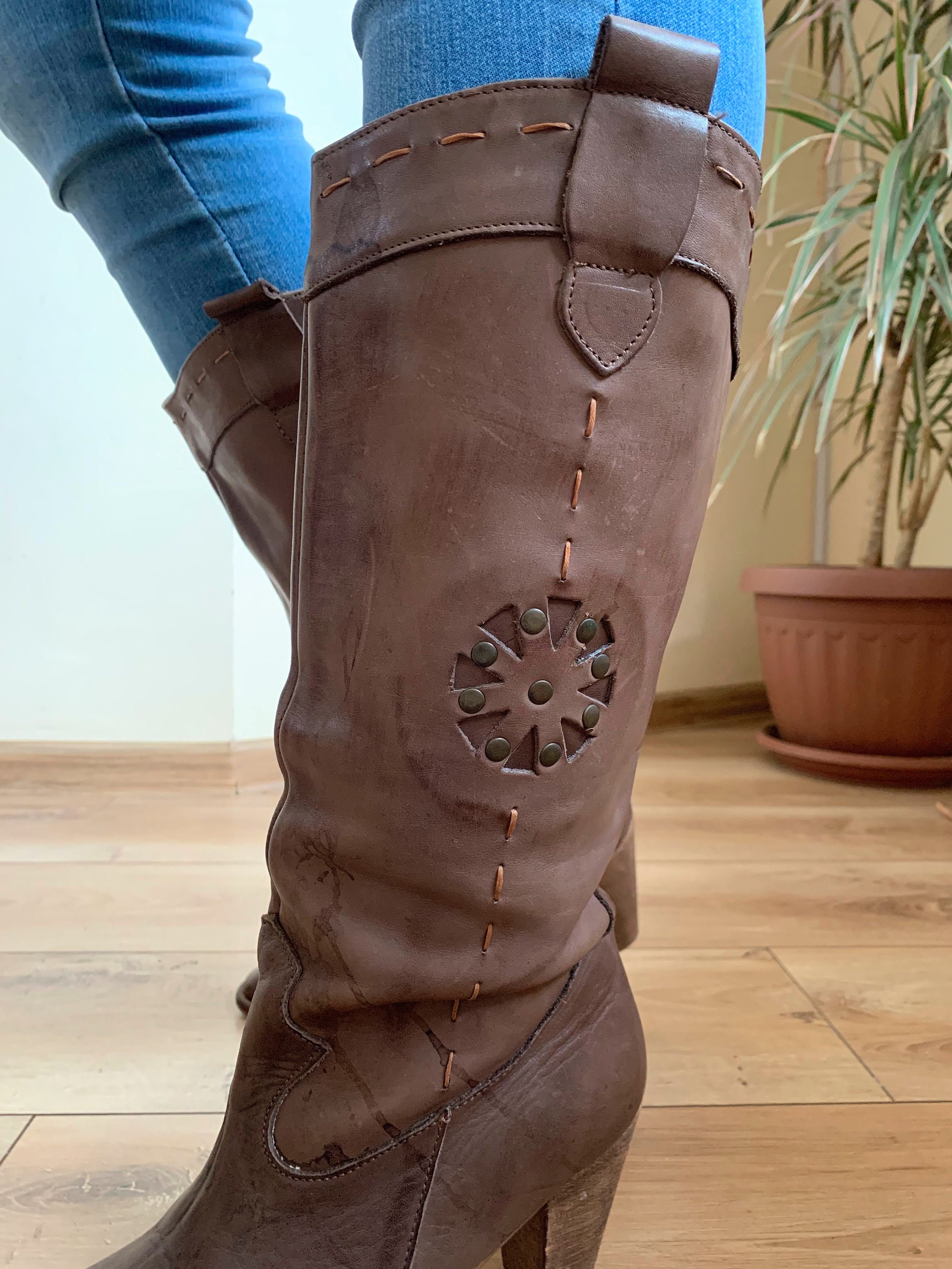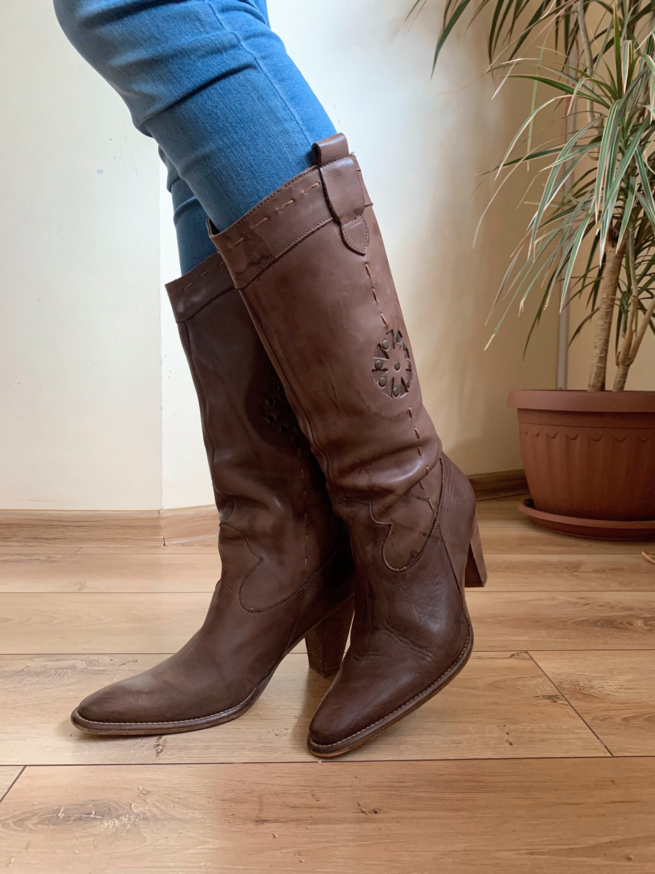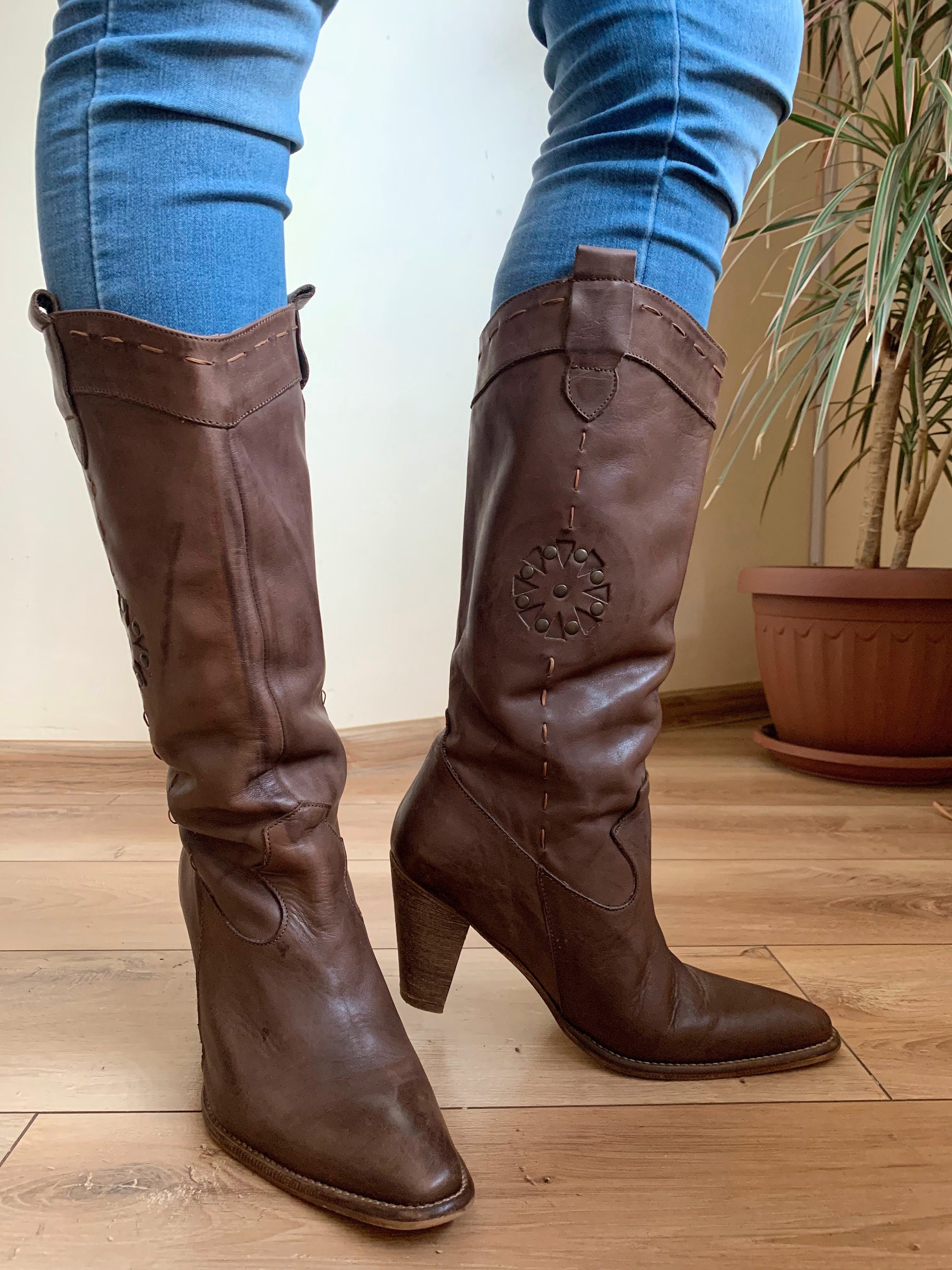 These are vintage 90s brown cowgirl boots with stacked heels and pointy toes. These western style slip on boots are made of genuine leather with genuine leather lining and leather soles. These cowboy boots for women are size 39. They fit like UK 6 US 8. Please check the measurements below. These mid calf leather boots are perfect for the fall or spring. Amazing addition to your western or boho outfit. These tall booties look awesome with jeans.