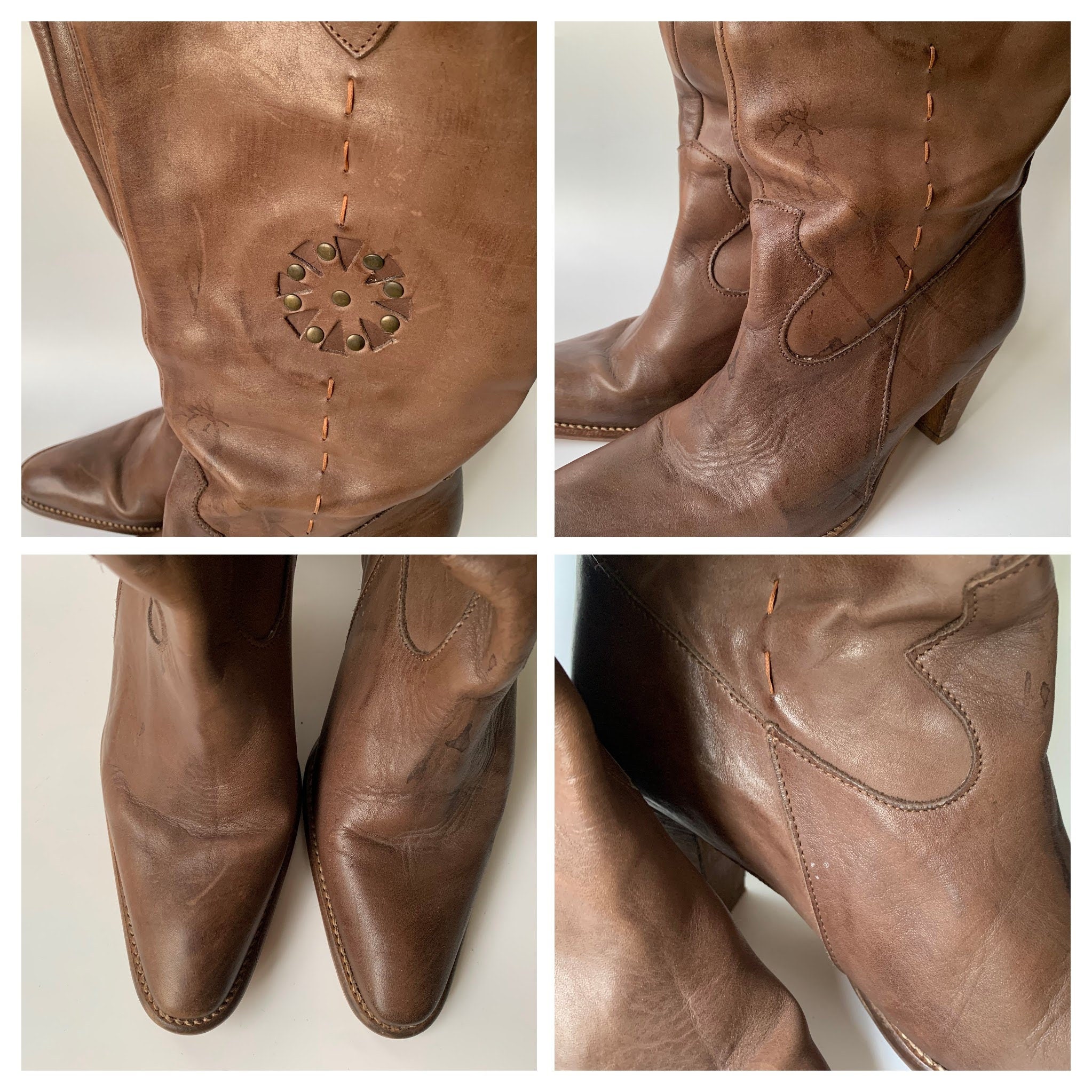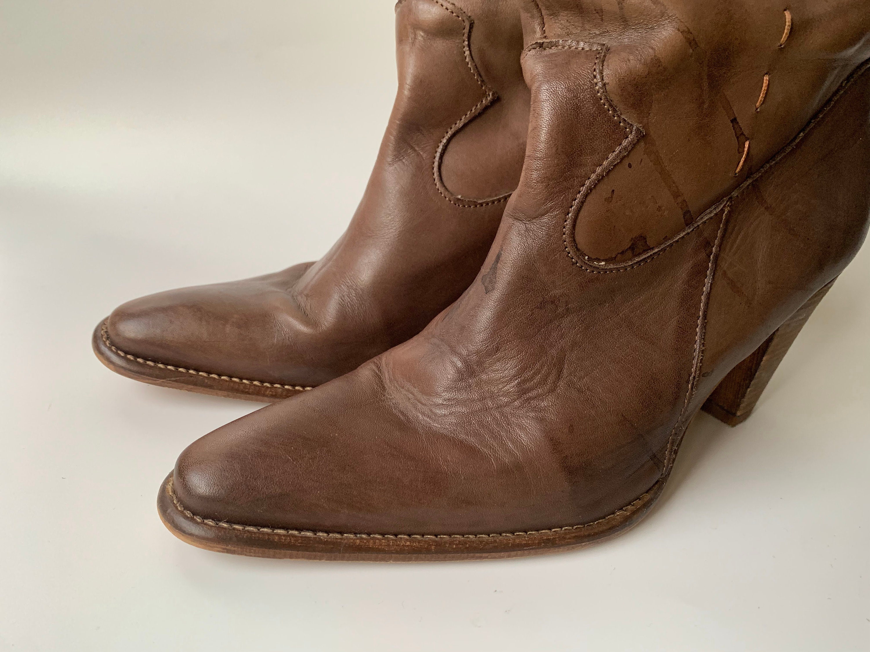 Condition: These stacked heel boots are beautifully worn. The leather has a distressed look due to the scratches and marks on the leather surface. There are some rain spots too. The soles look great.