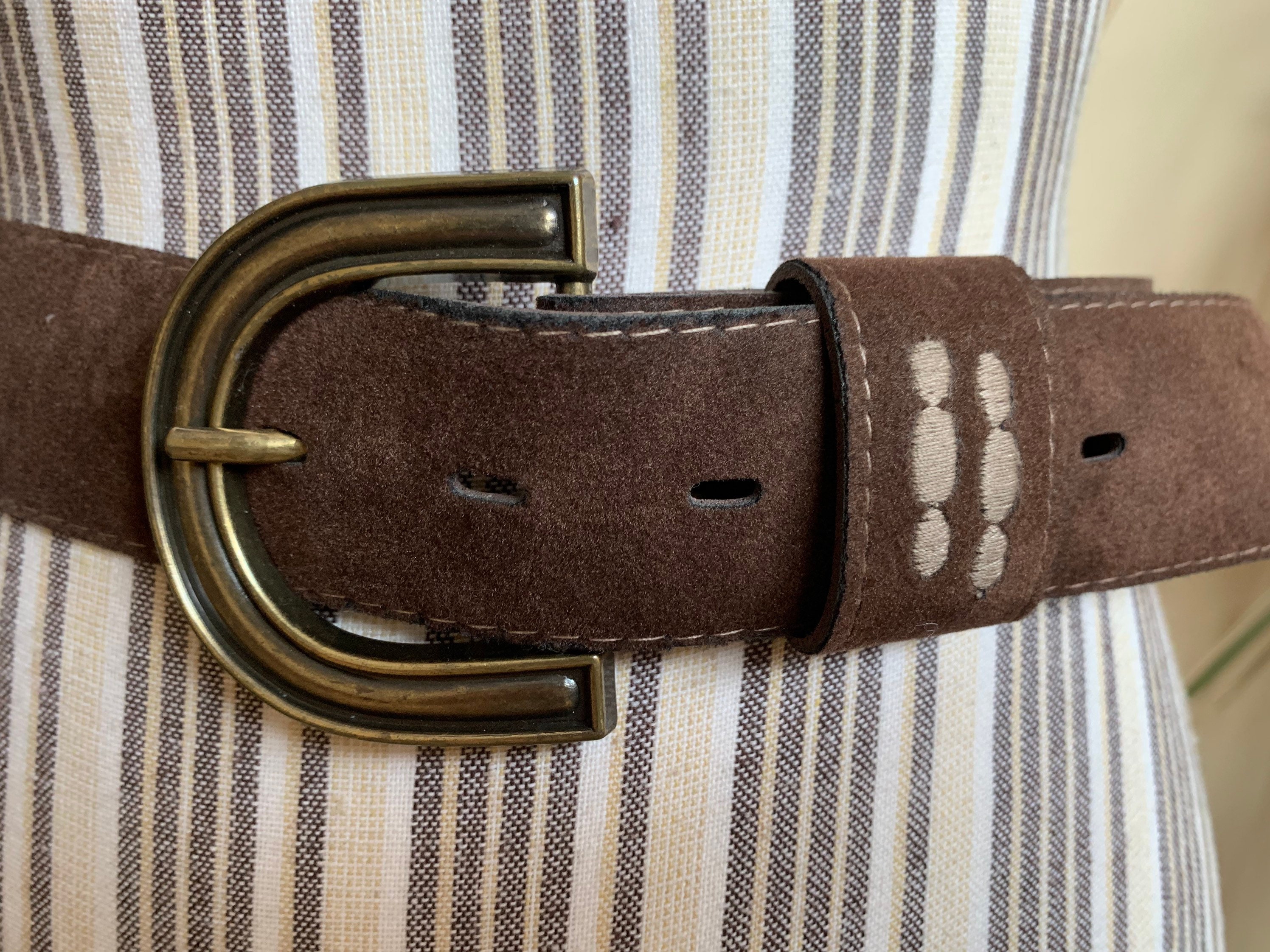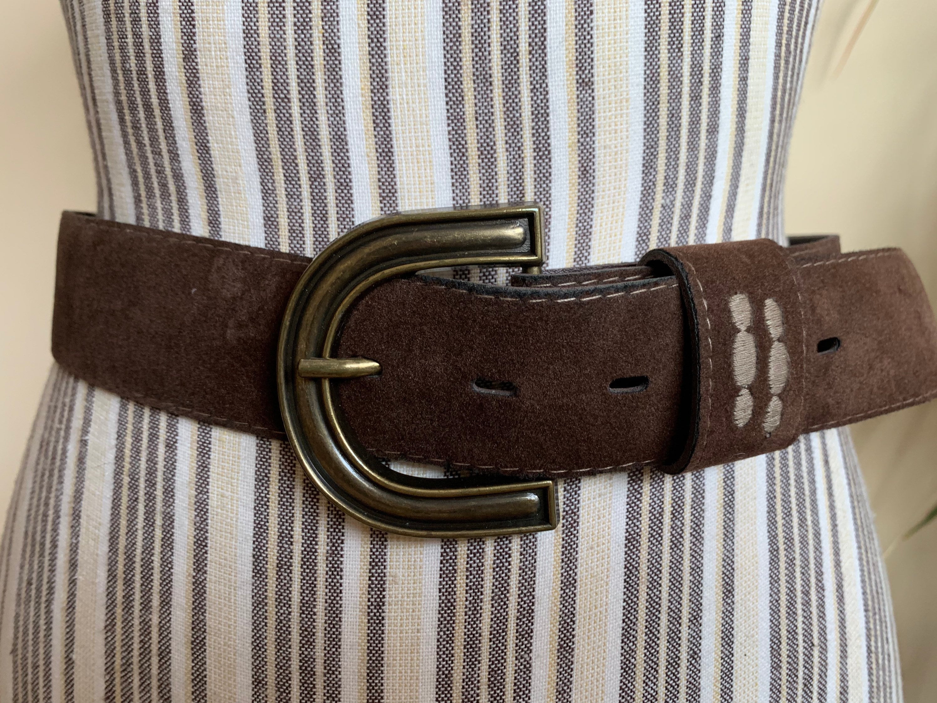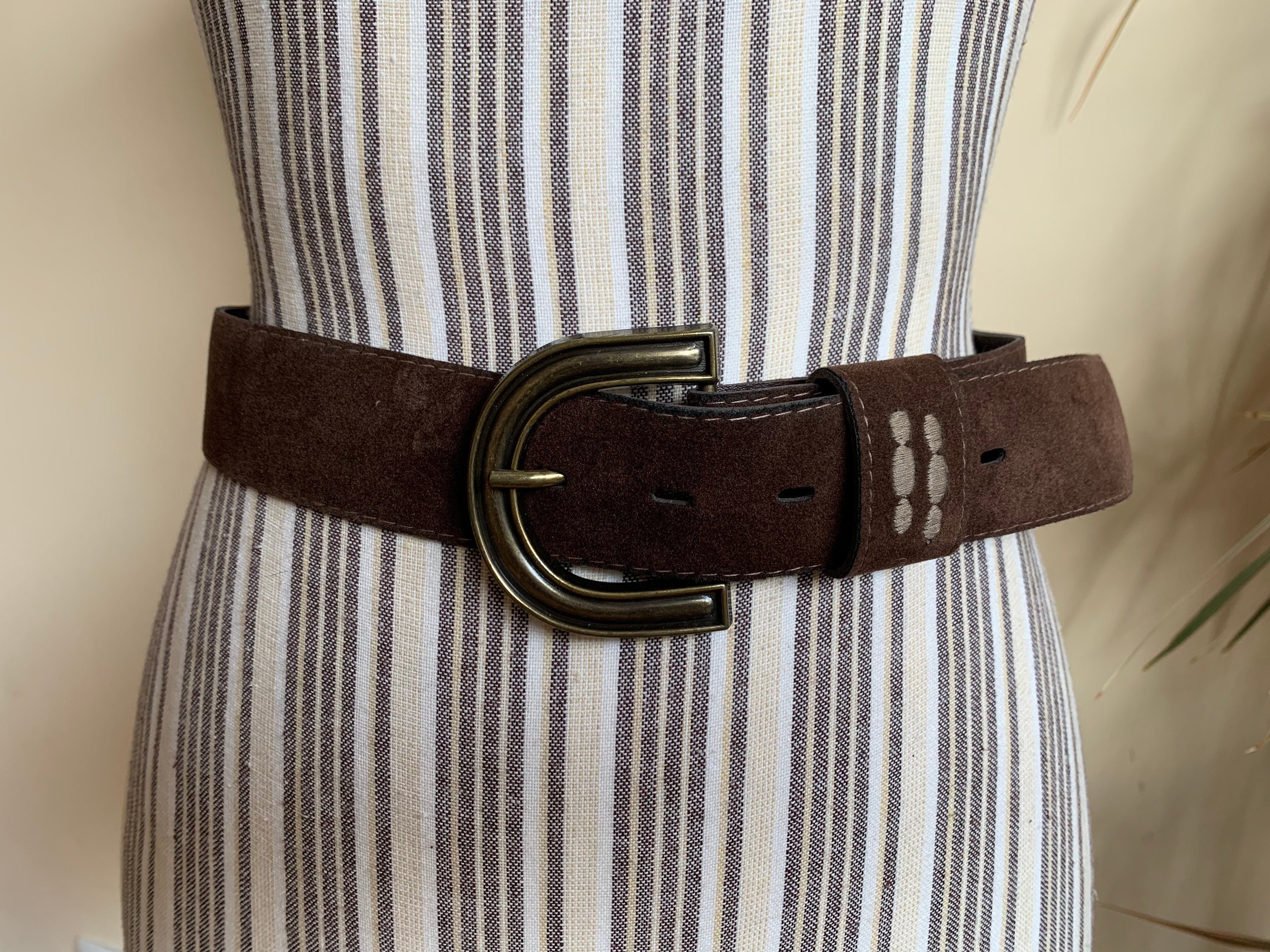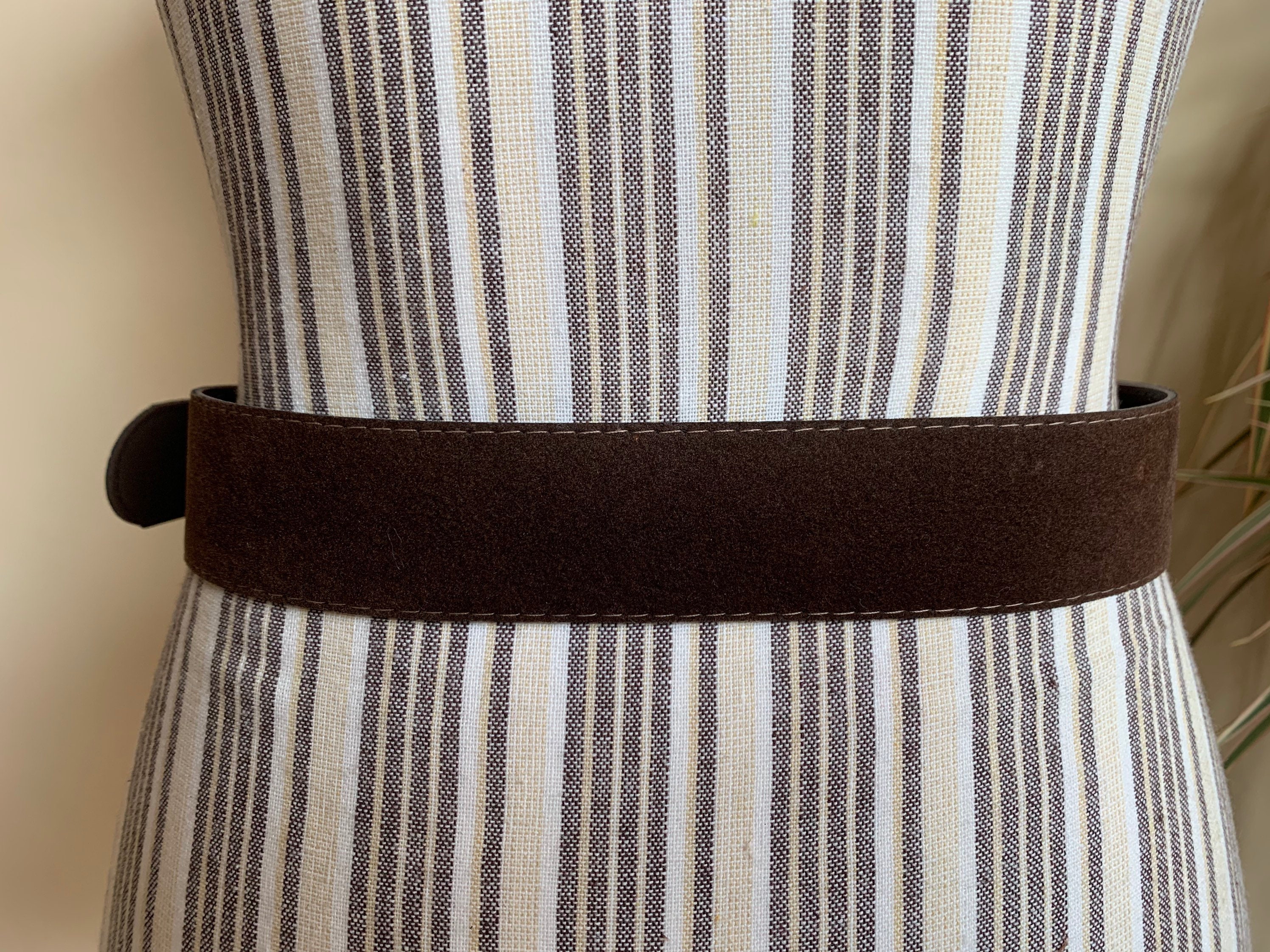 This is vintage 80s dark brown faux suede belt for women with D ring buckle. This wide leather belt is in dark brown color. This velour bohemian belt is ideal for your boho chic outfits. It is made of faux suede with fax leather lining and brass buckle. This vintage waist belt can adjust from 27.6" - 31.9" / 70 cm to 81 cm /. It is 1.6" / 4 cm wide.