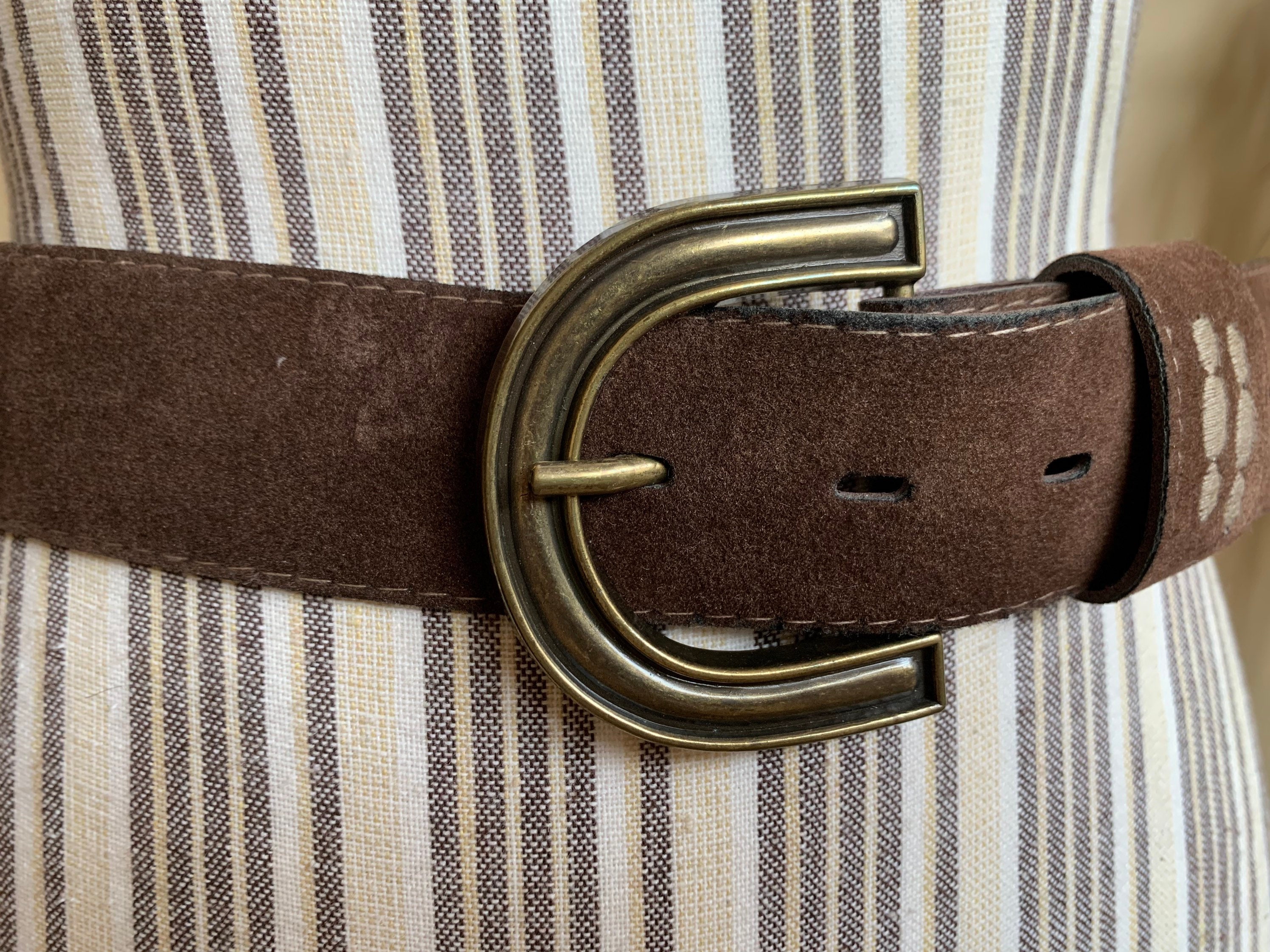 Condition: there are some scratches on the brass buckle and some marks on the faux suede surface but overall beautiful condition