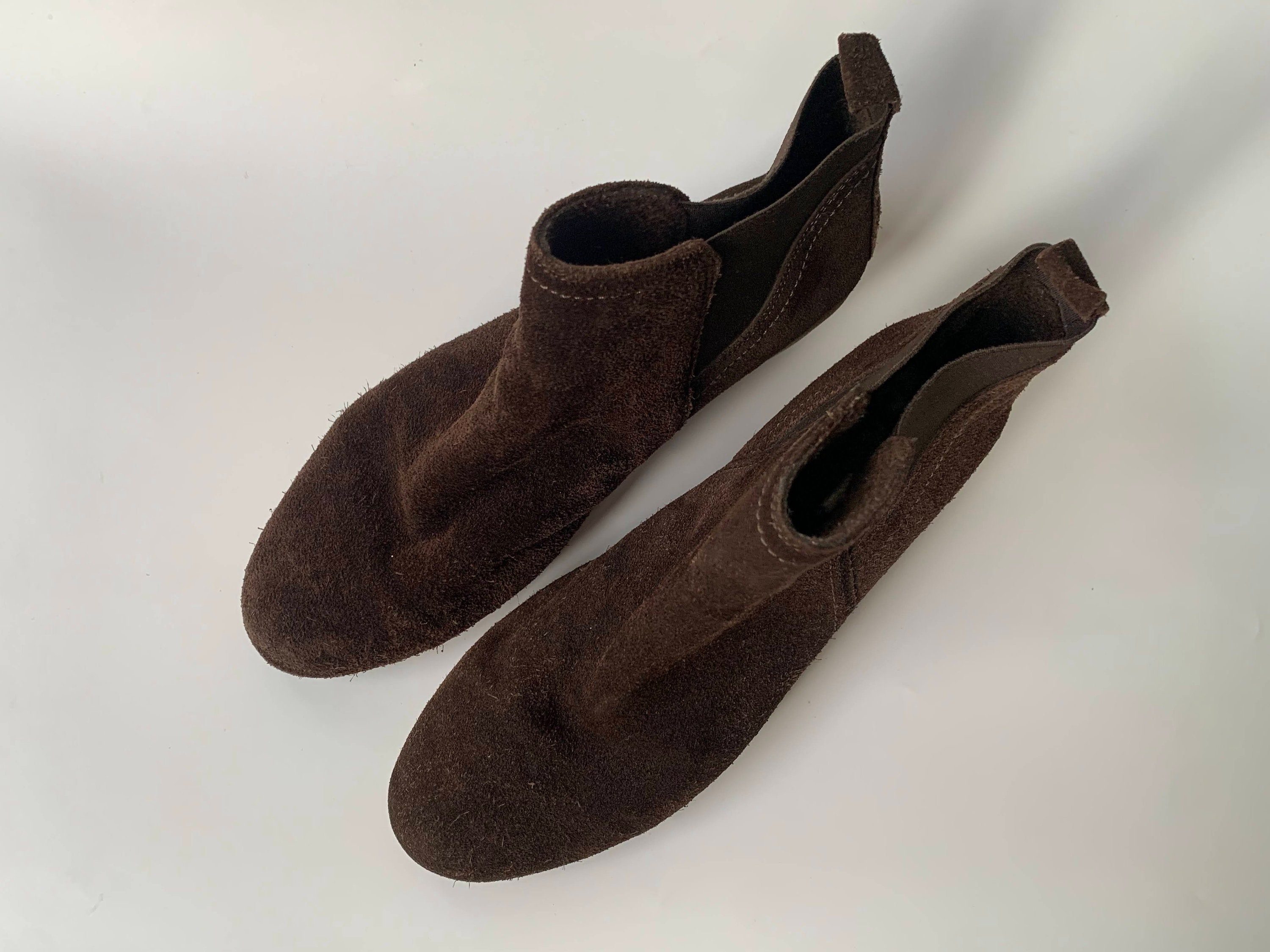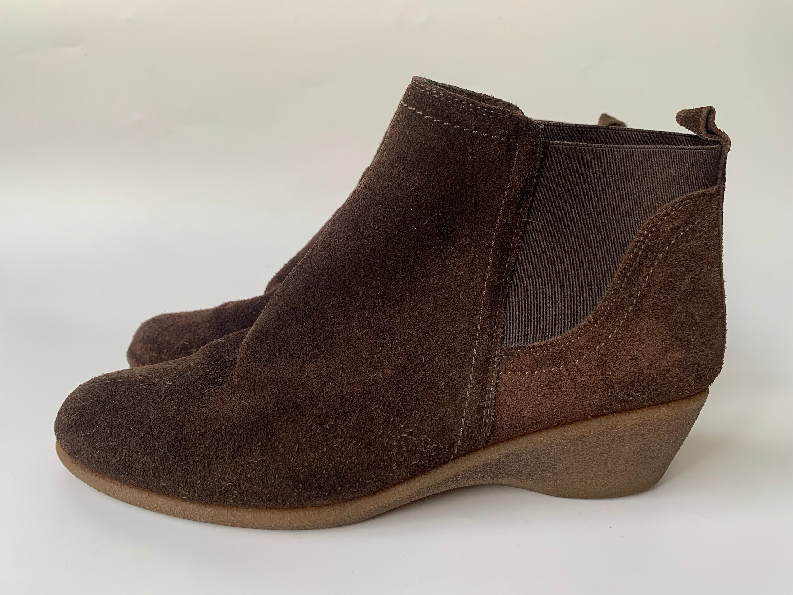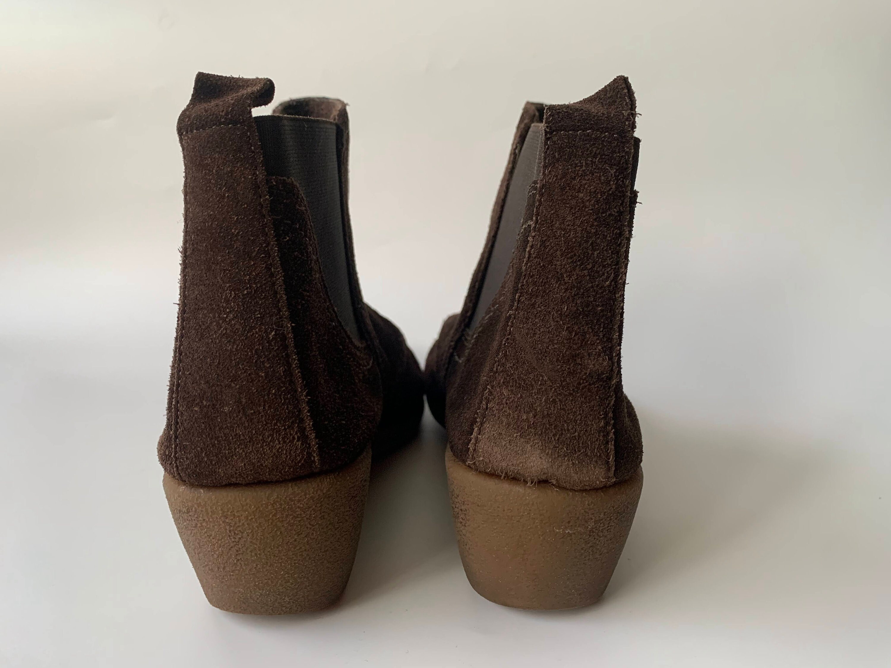 These are beautiful dark brown suede leather ankle boots with non slip rubber sole. These suede chelsea boots are make of soft suede leather and comfortable platform rubber sole with wedge heel. These suede leather boots have two elastic panels on each side, so you can easily put them on and take them off. Great walking booties for the spring / fall season. These brown suede ankle boots are size EUR 39, UK 6, US 8. Please check the measurements below.