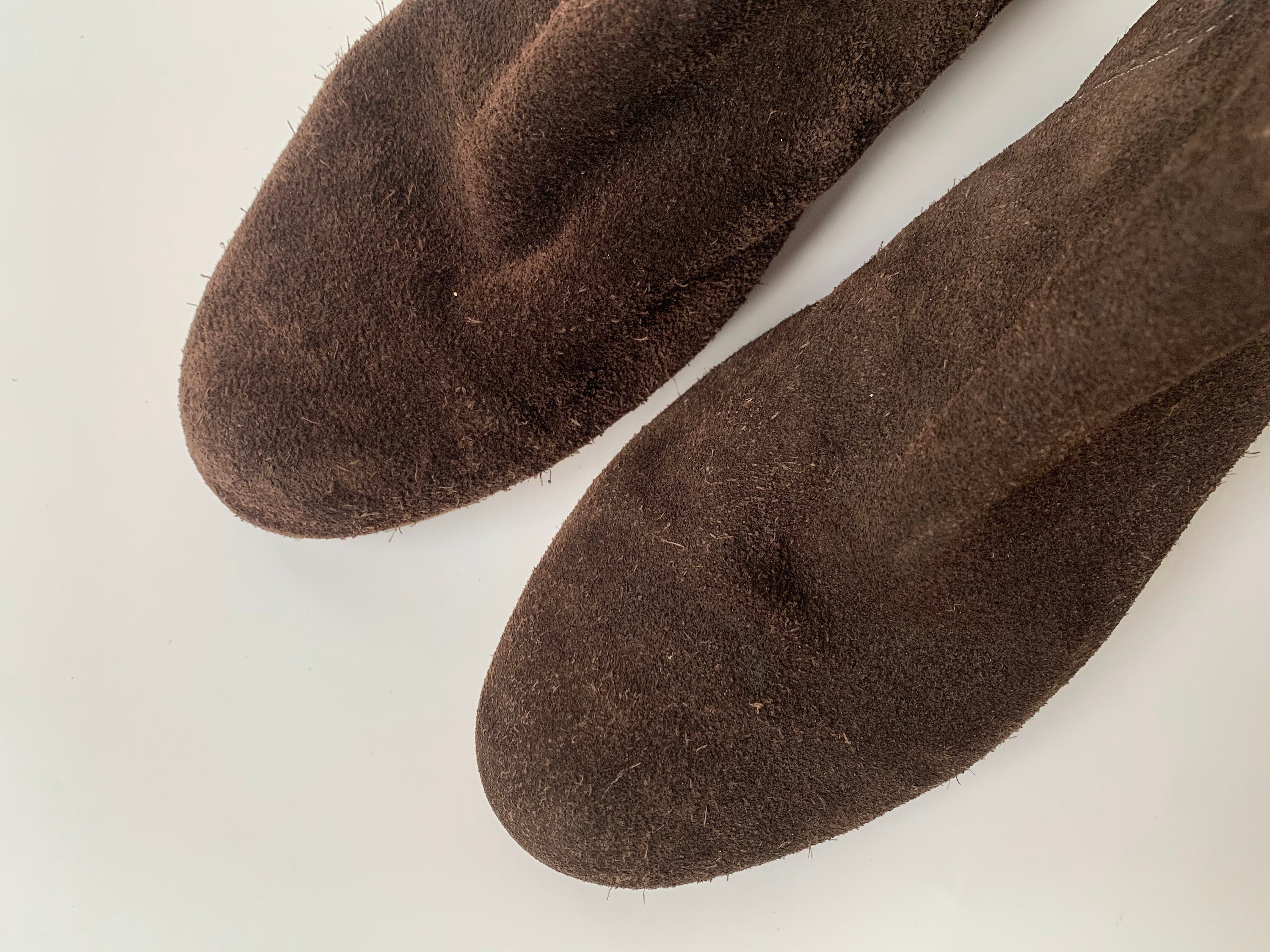 Condition: These suede leather boots are in beautiful vintage condition with some signs of wear. There are marks on the suede leather surface, typical for suede leather items. There is some wear around the heels and the toes where the suede leather has become a shade lighter.