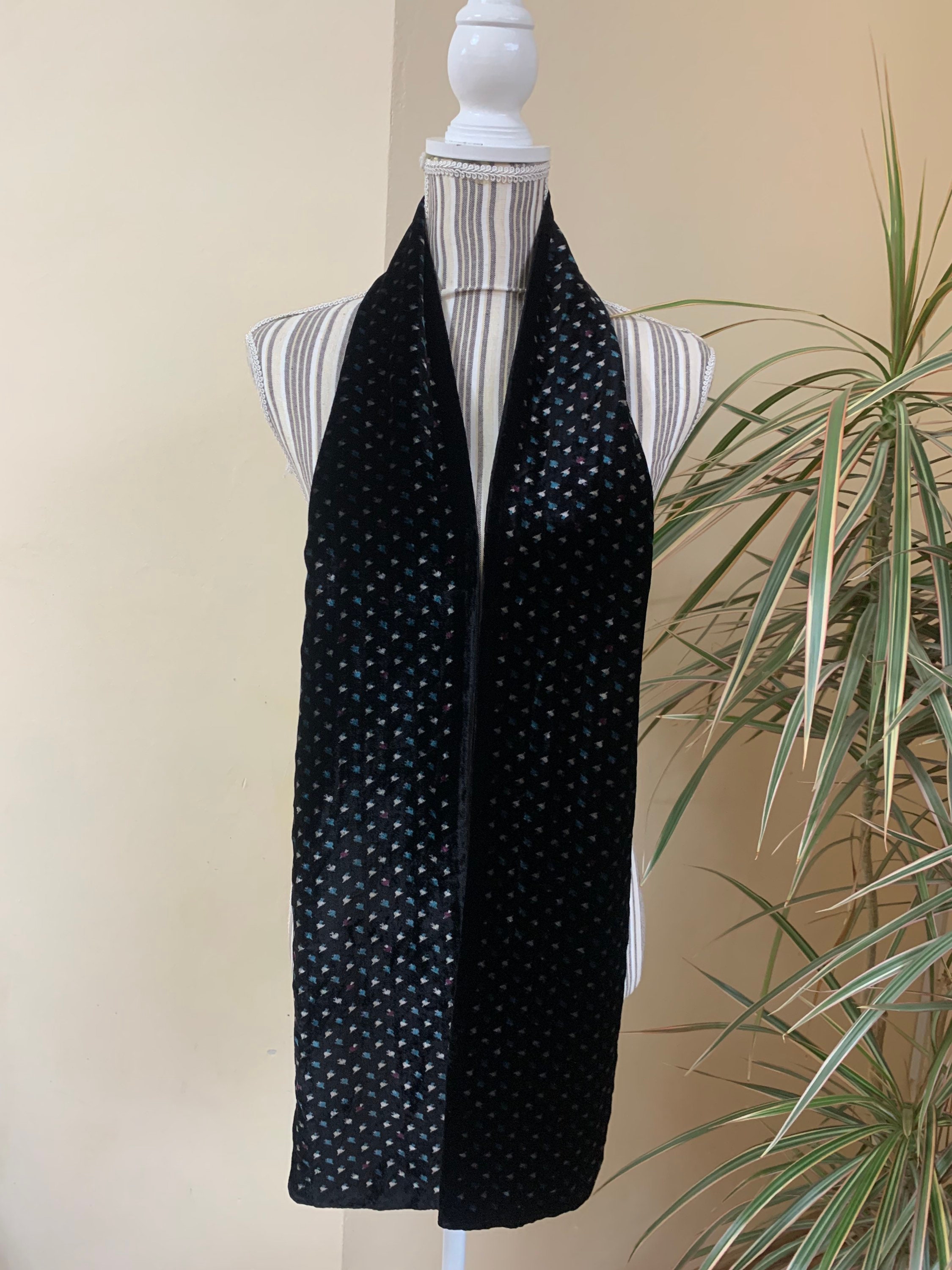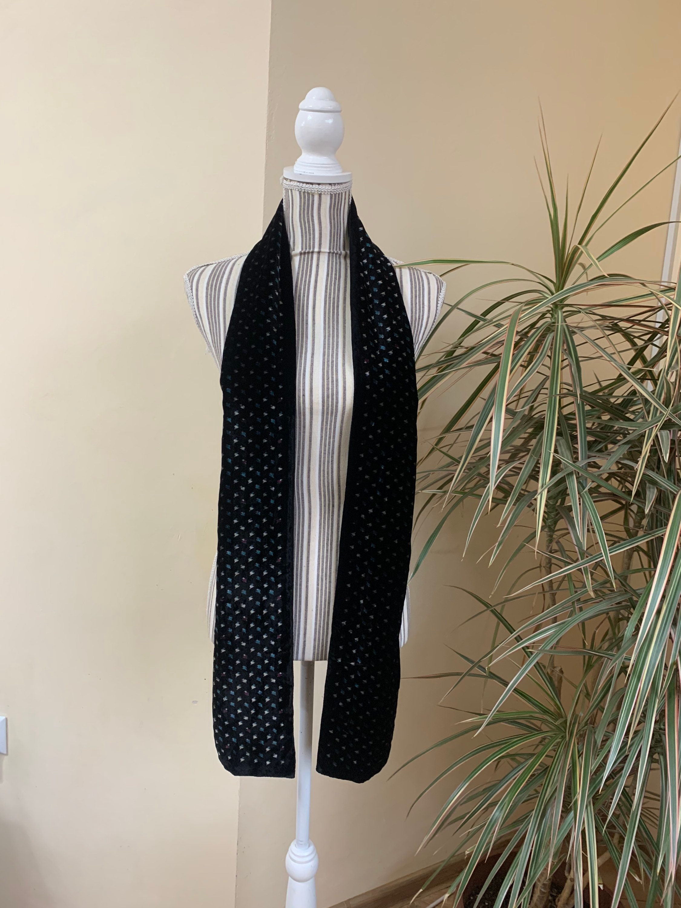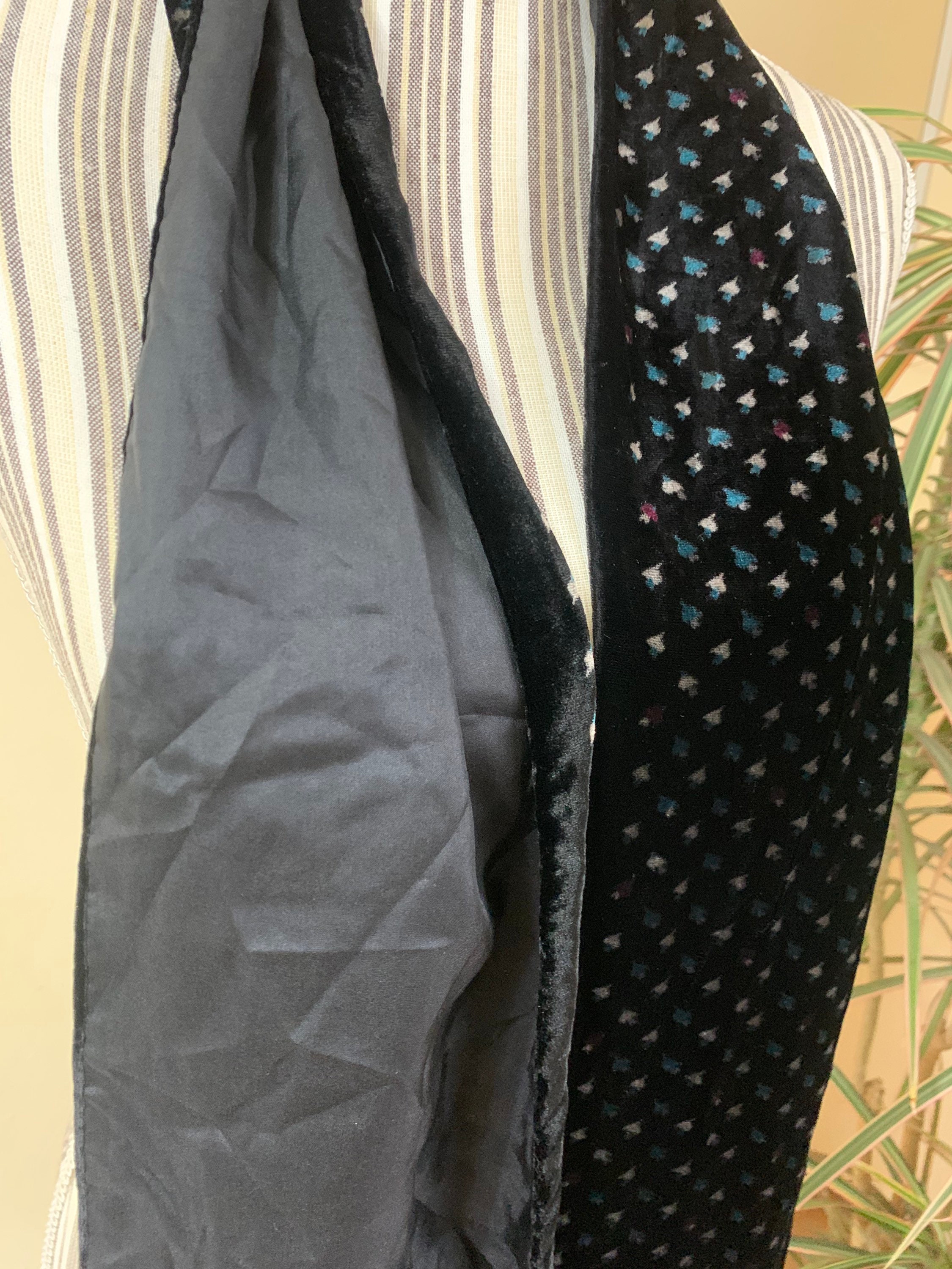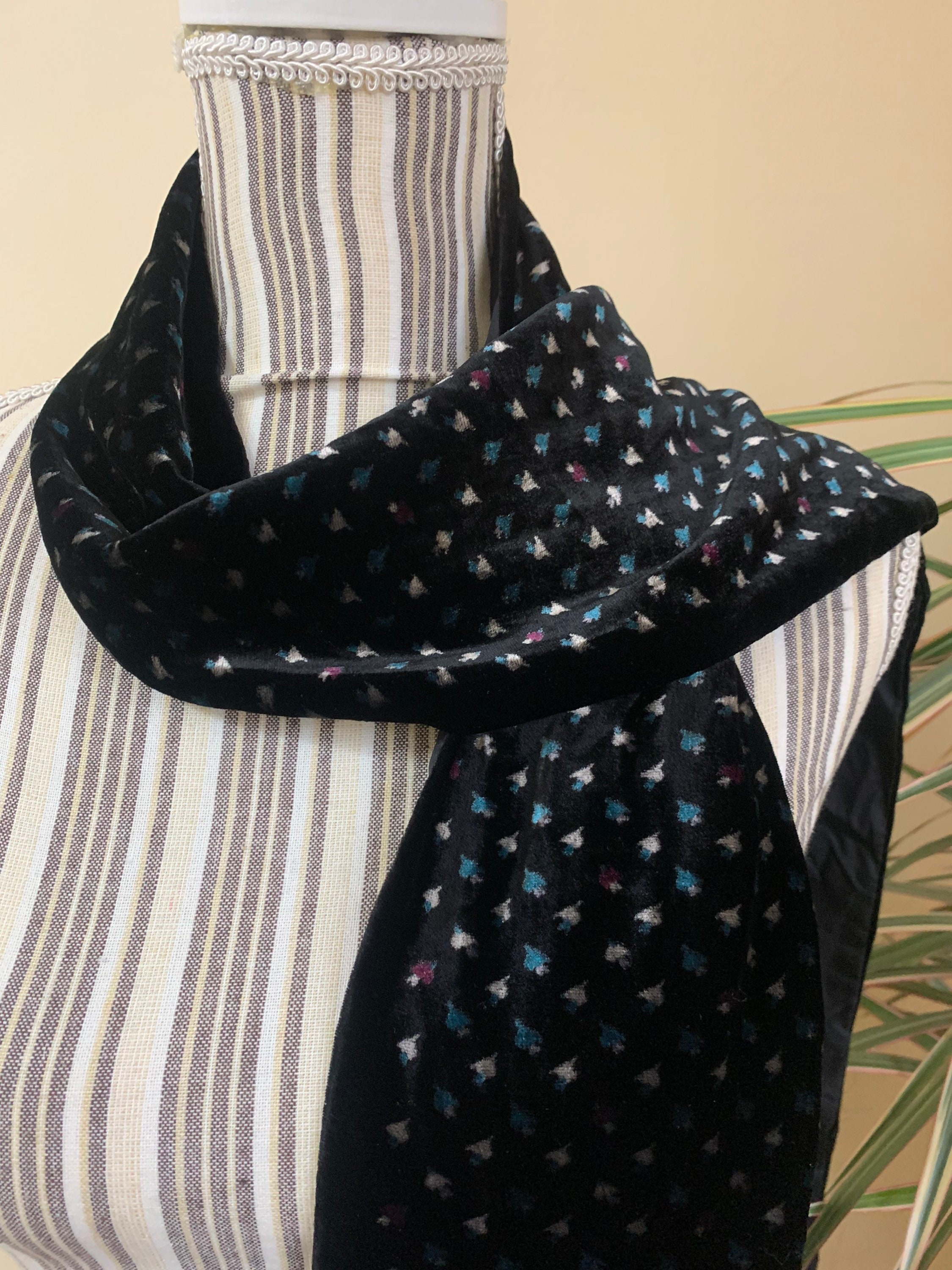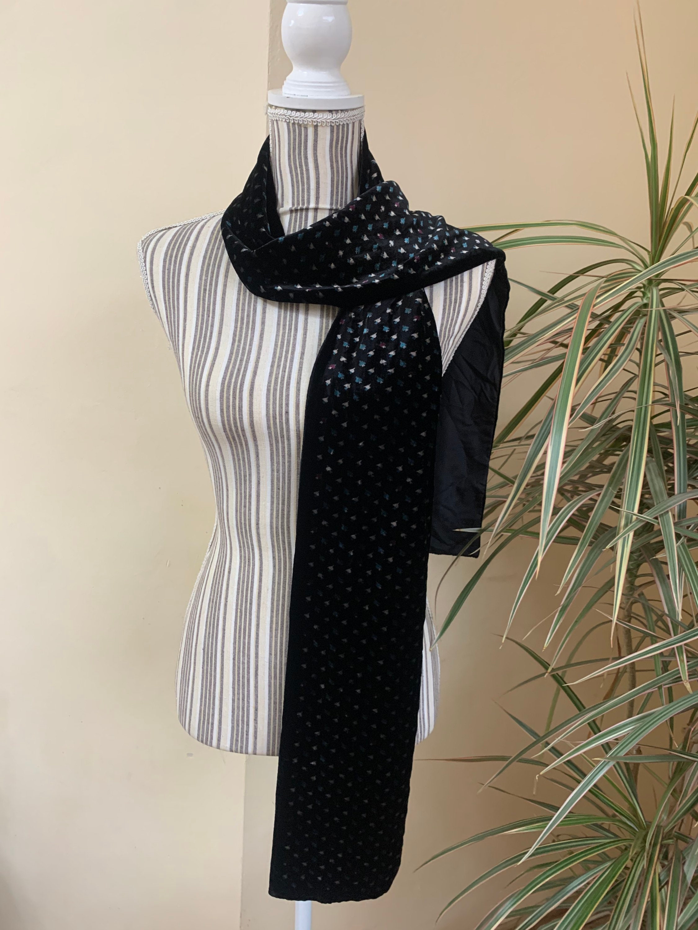 This is a beautiful vintage 90s long black velvet scarf with beautiful tiny floral geometric print with tiny flowers in shades of grey, blue and purple. This slim velvet scarf has black polyester lining. You can wear this velvet accessory as a neck scarf or as a chocker scarf. This evening black velvet scarf shines beautifully when exposed to light. This elegant evening scarf is the perfect accessory for any cocktail party.